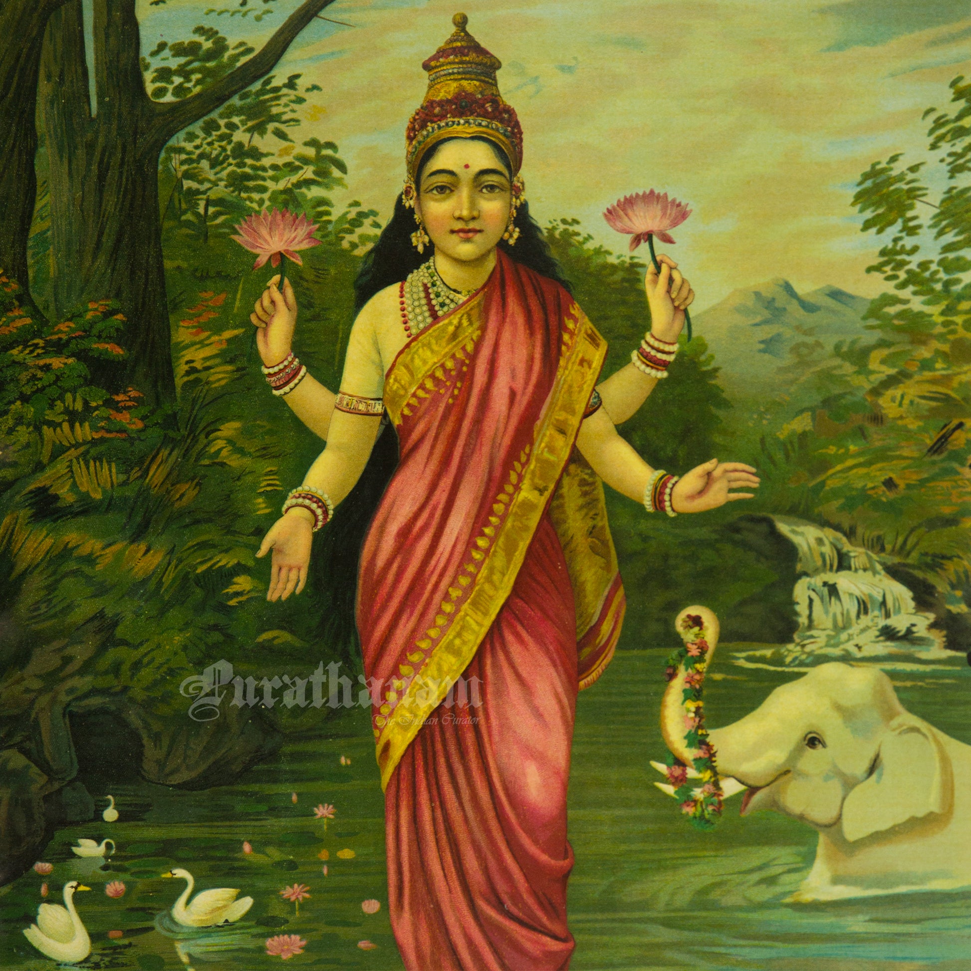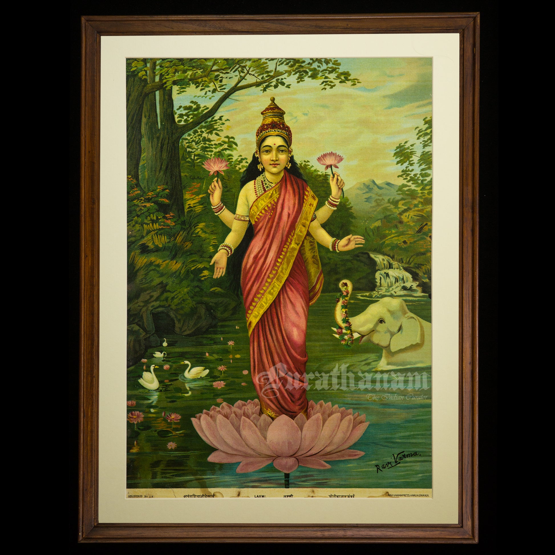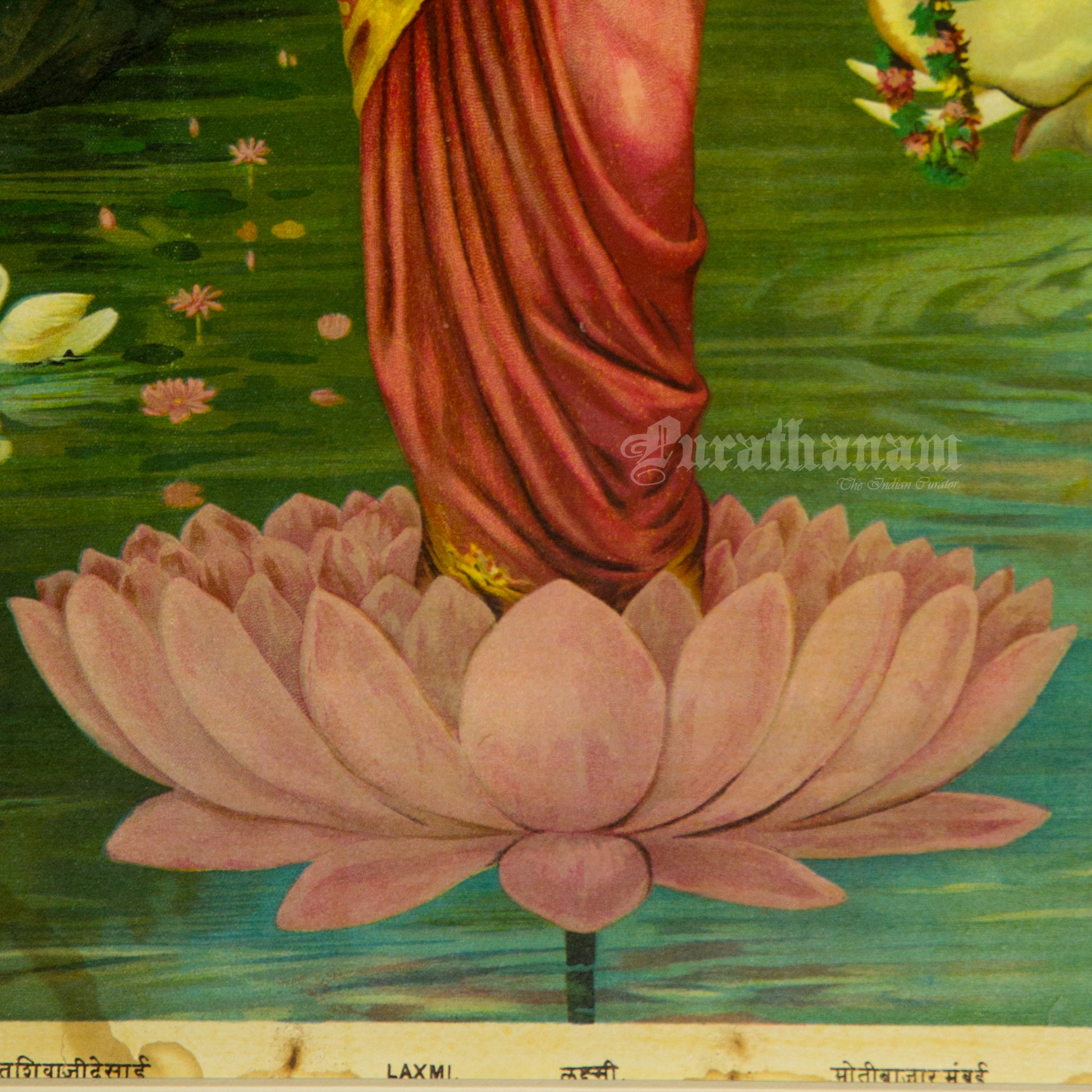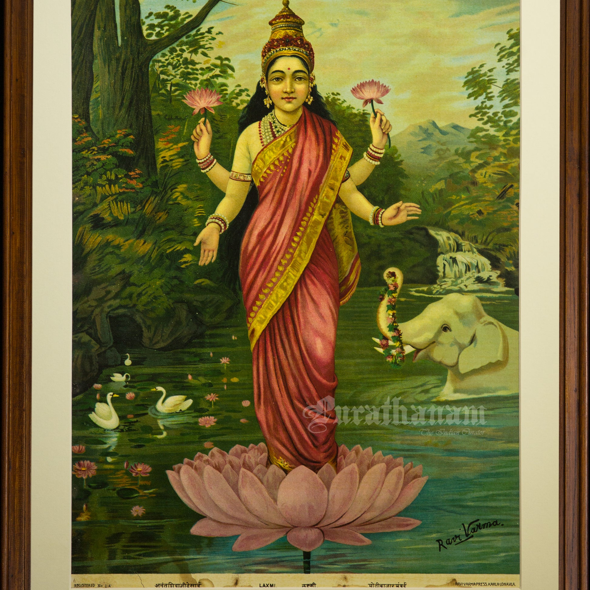 This is an oleograph print from 1920s of Lakshmi by Ravi Varma an Indian who achieved recognition for his depiction of scenes from the epics of the Mahabharata and Ramayana.