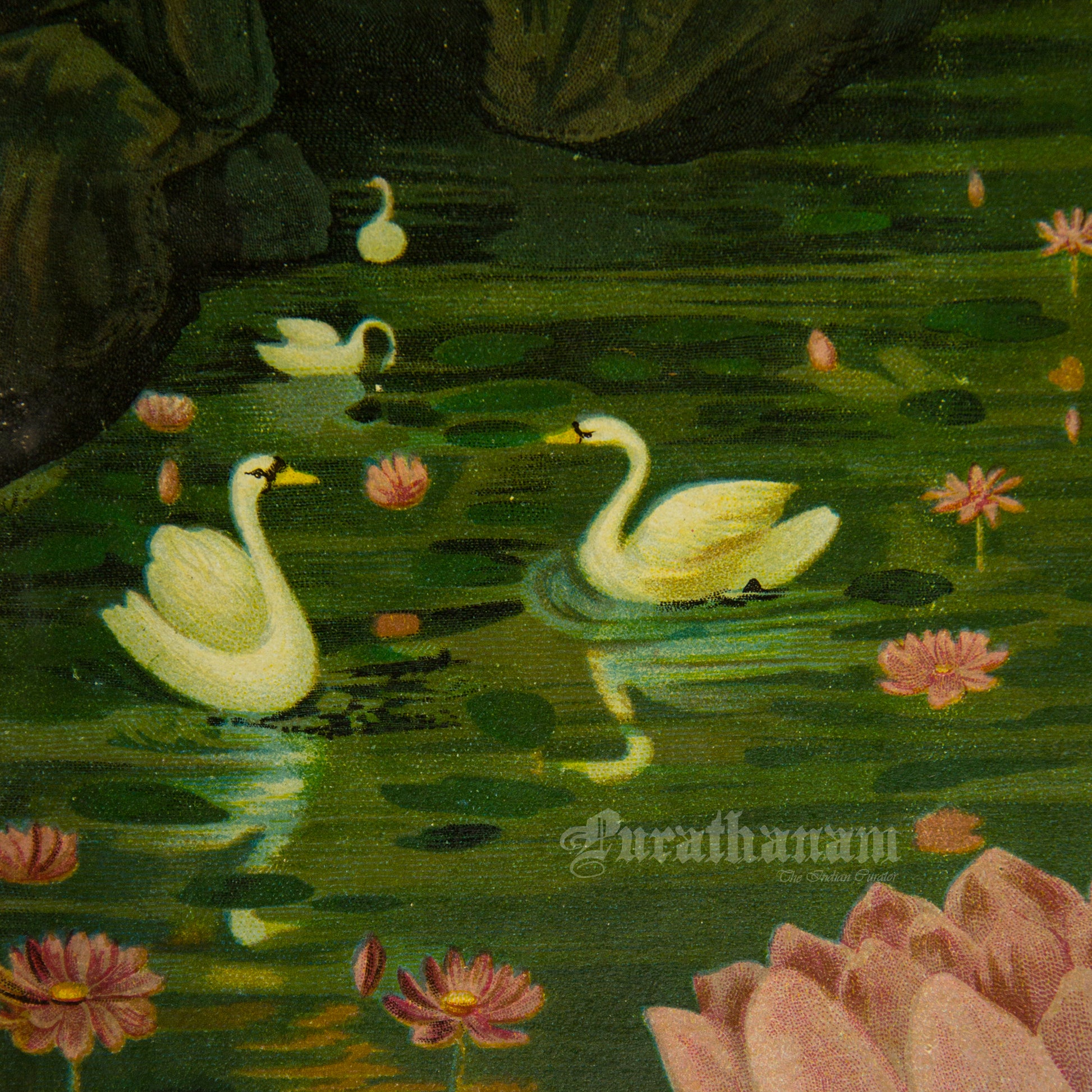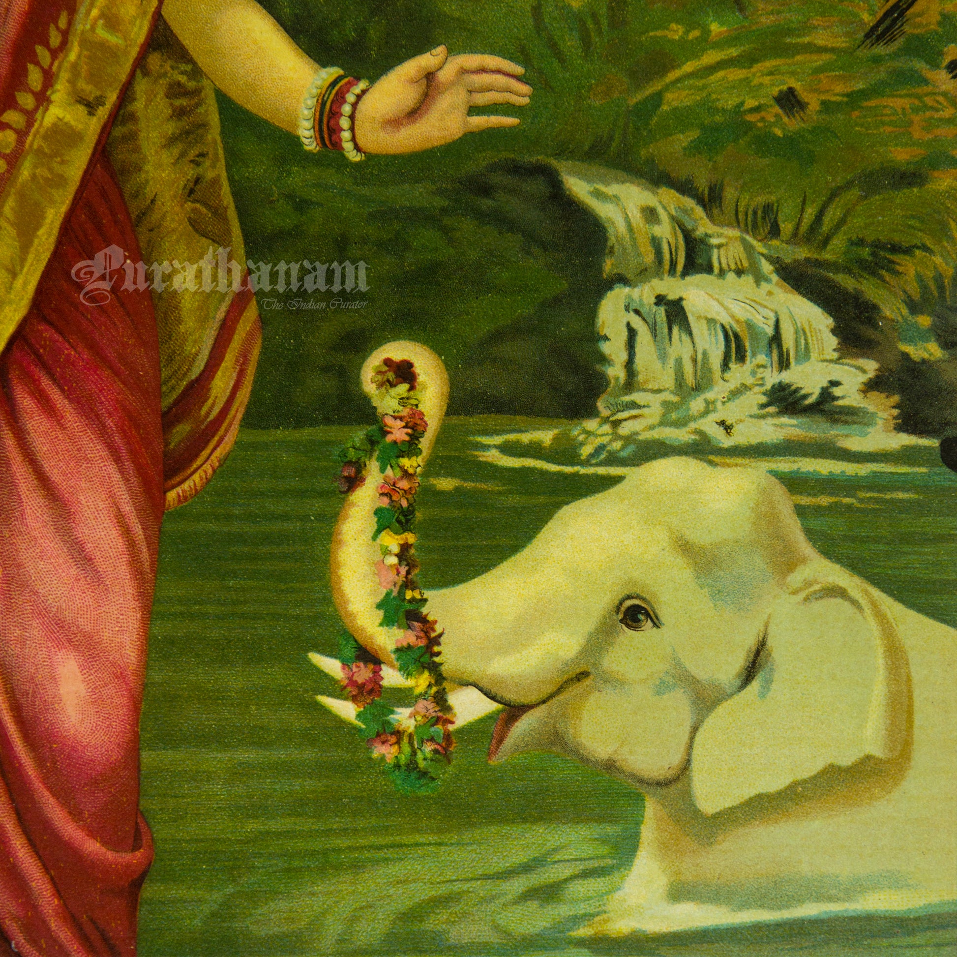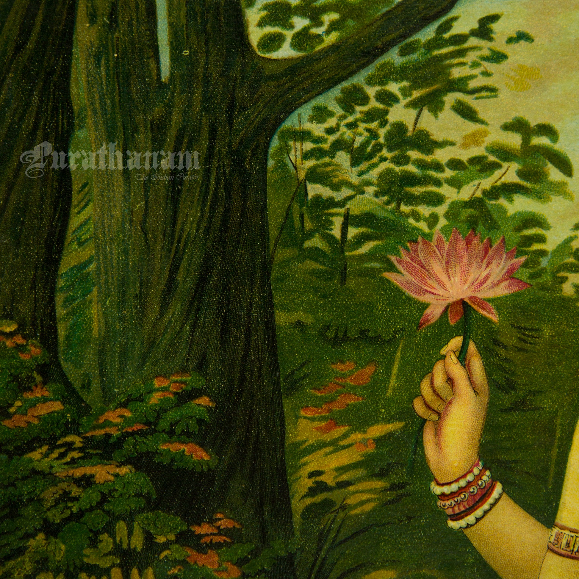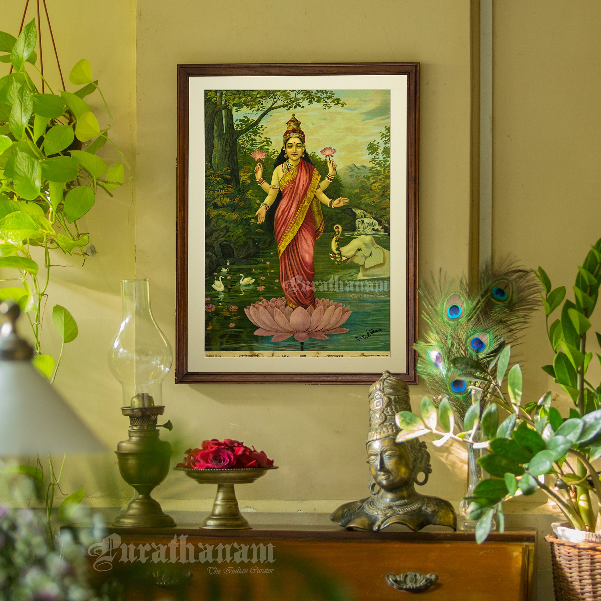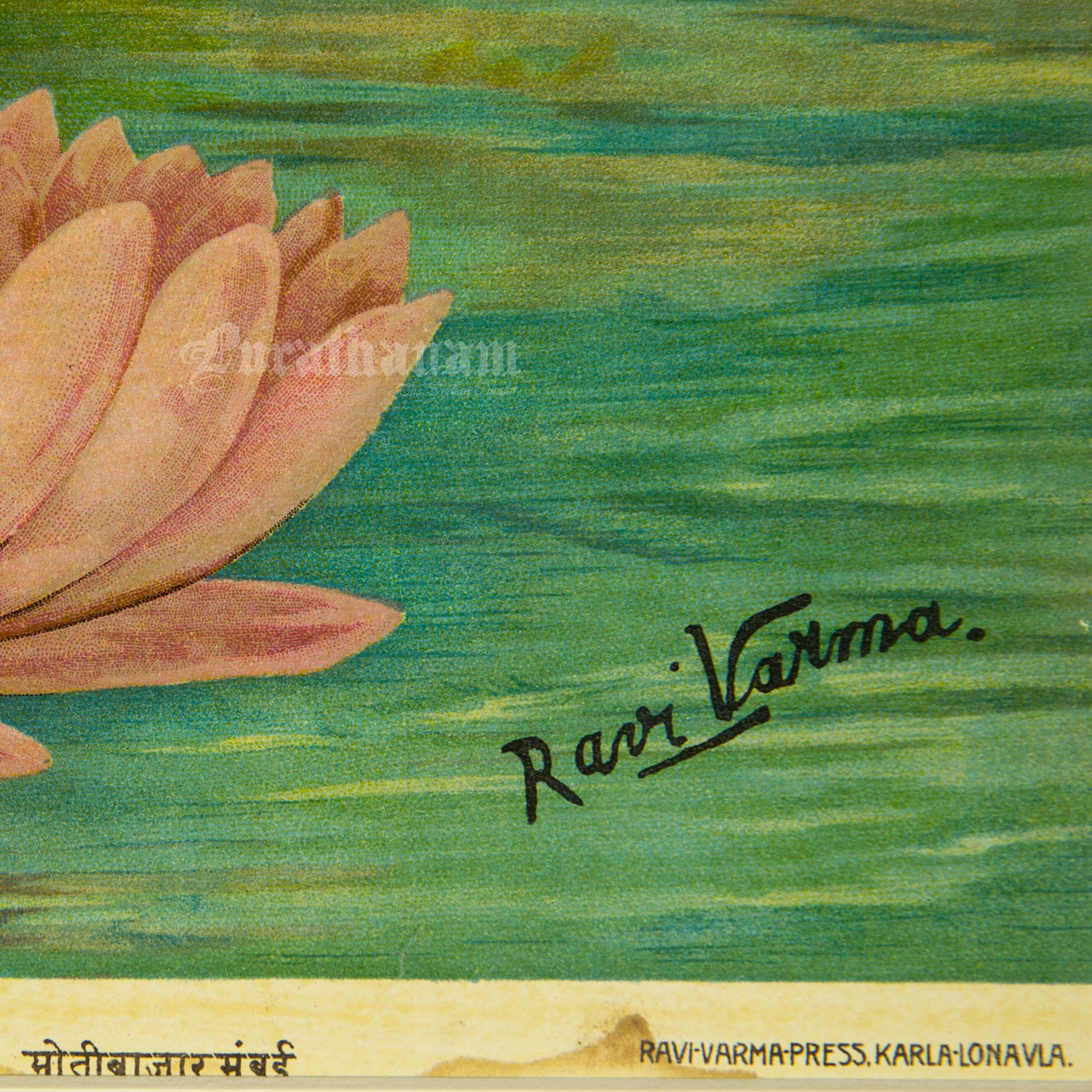 This is an oleograph print from 1920s of Lakshmi by Ravi Varma an Indian who achieved recognition for his depiction of scenes from the epics of the Mahabharata and Ramayana.