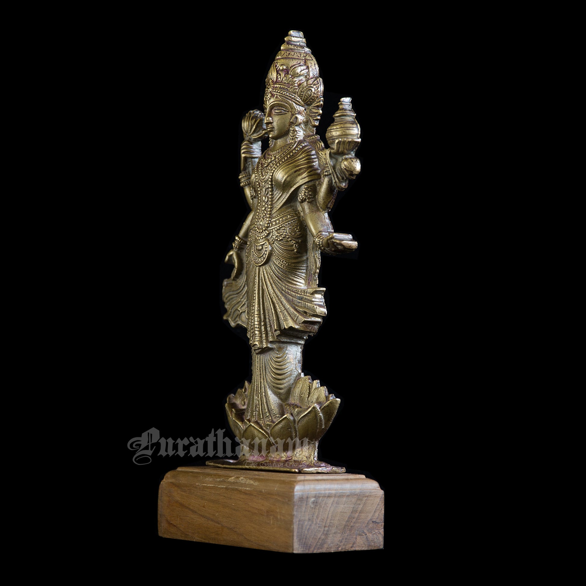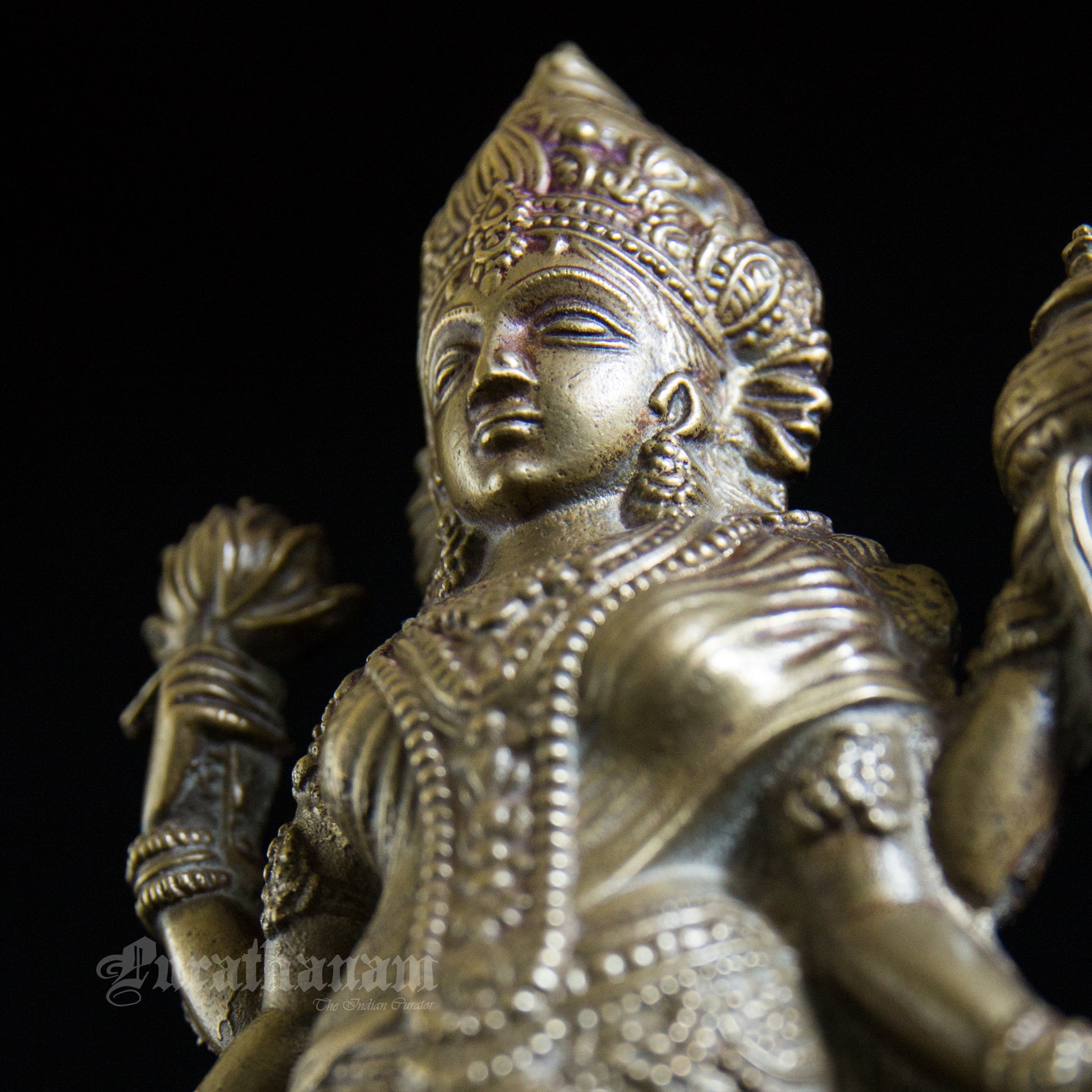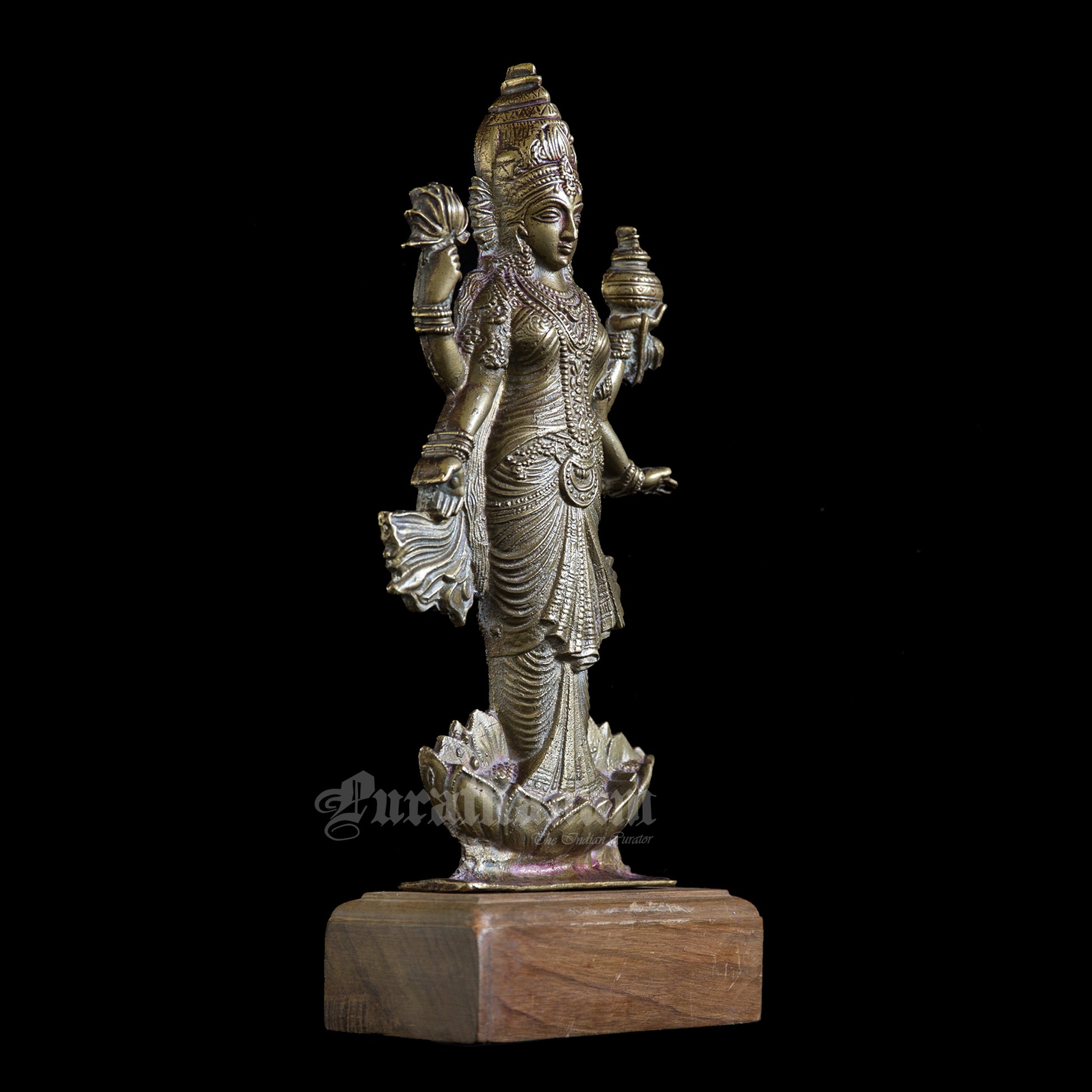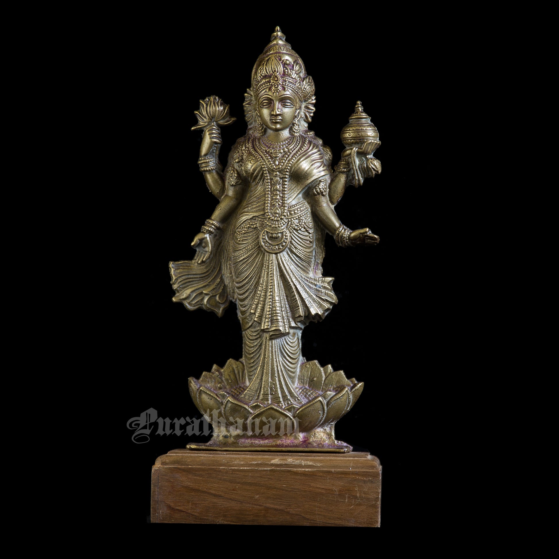Here is a beautiful 50 year old Lakshmi made of Brass with intricate artwork and a wood pedestal.