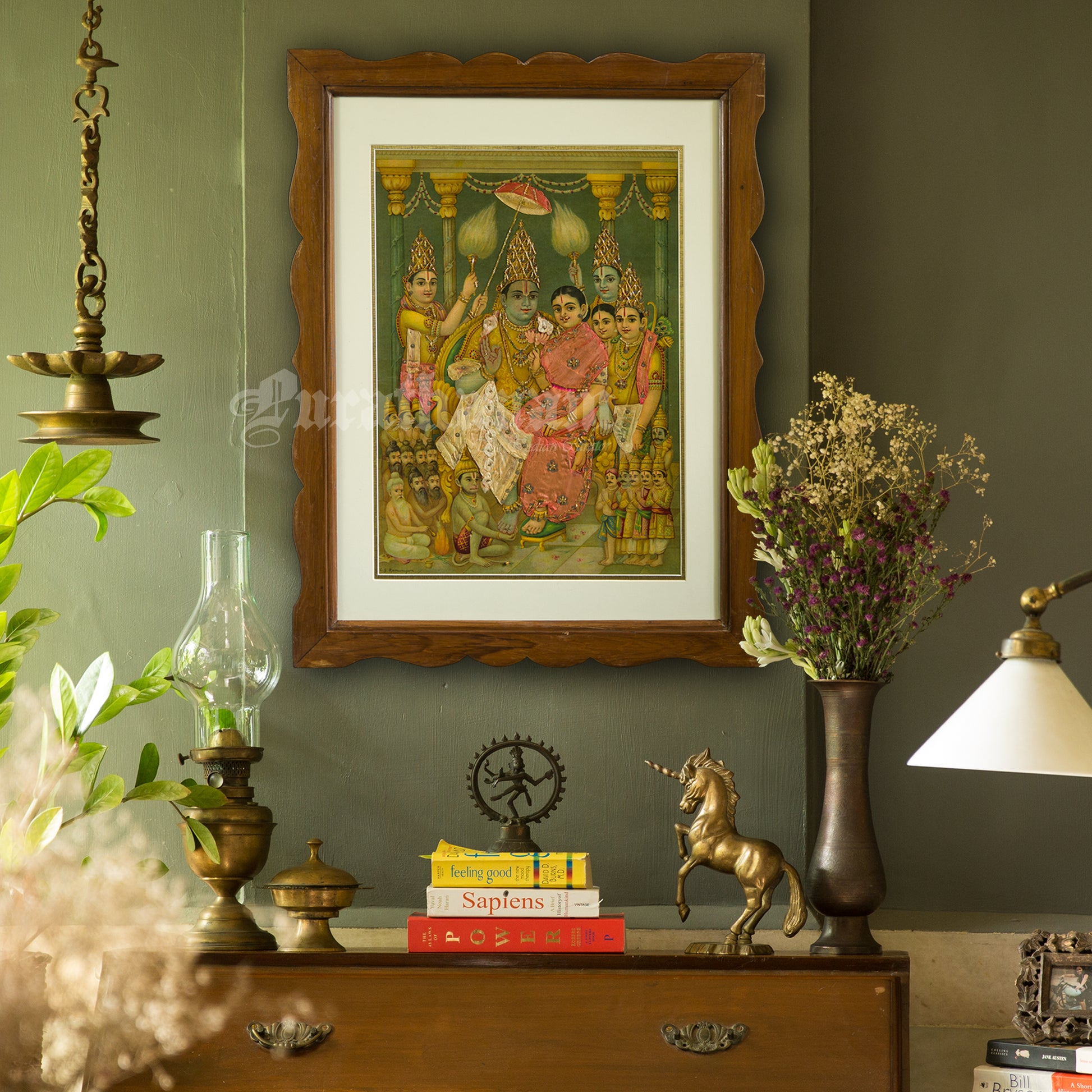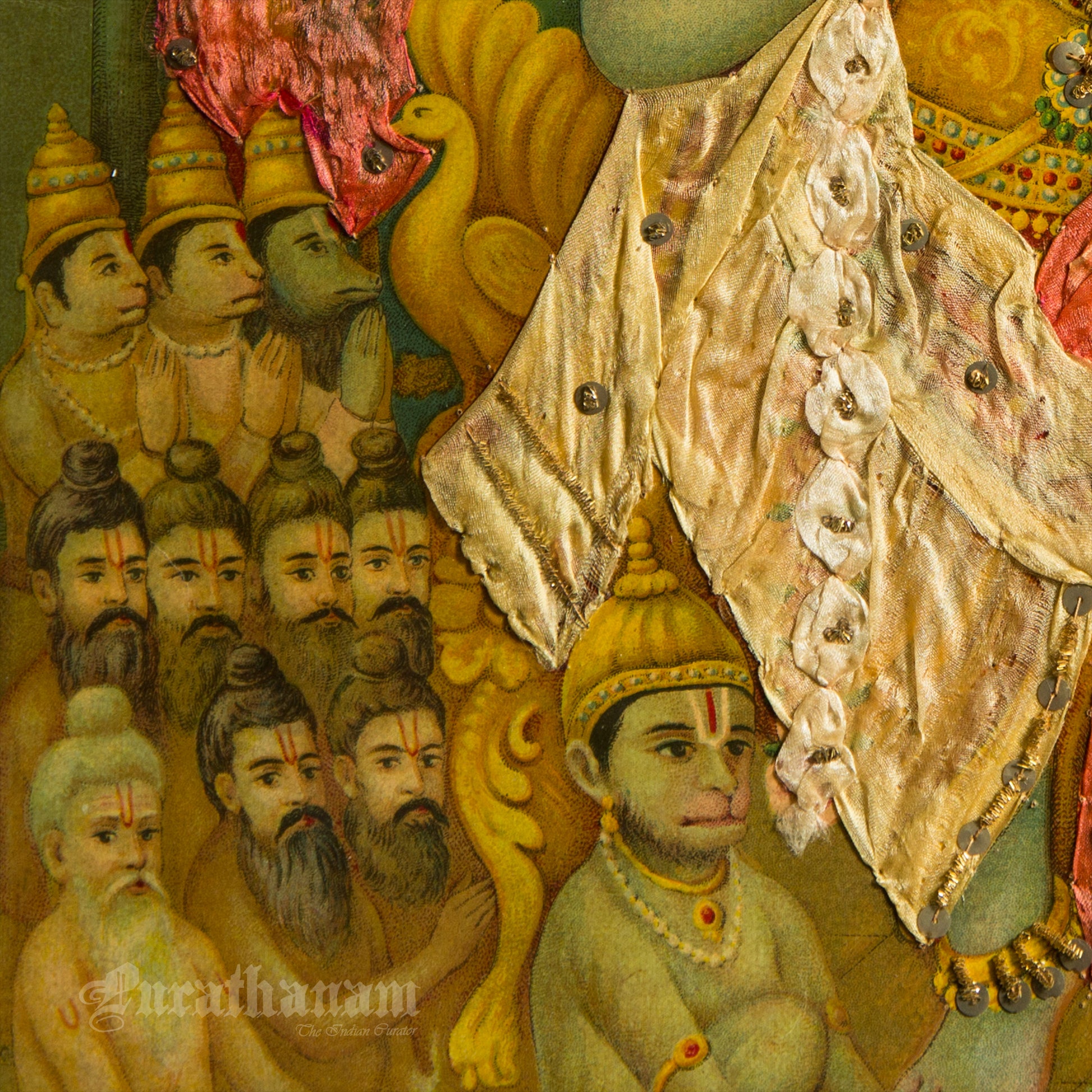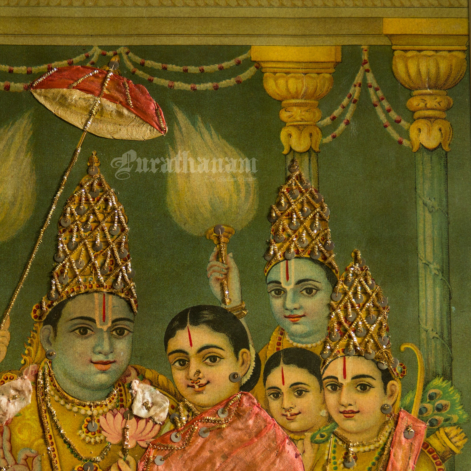 Here we have here beautiful chromolithograph print of Rama Pattabhishekam (Coronation of Rama) by C.G. Ramanujam printed in Ravi Varma Press.