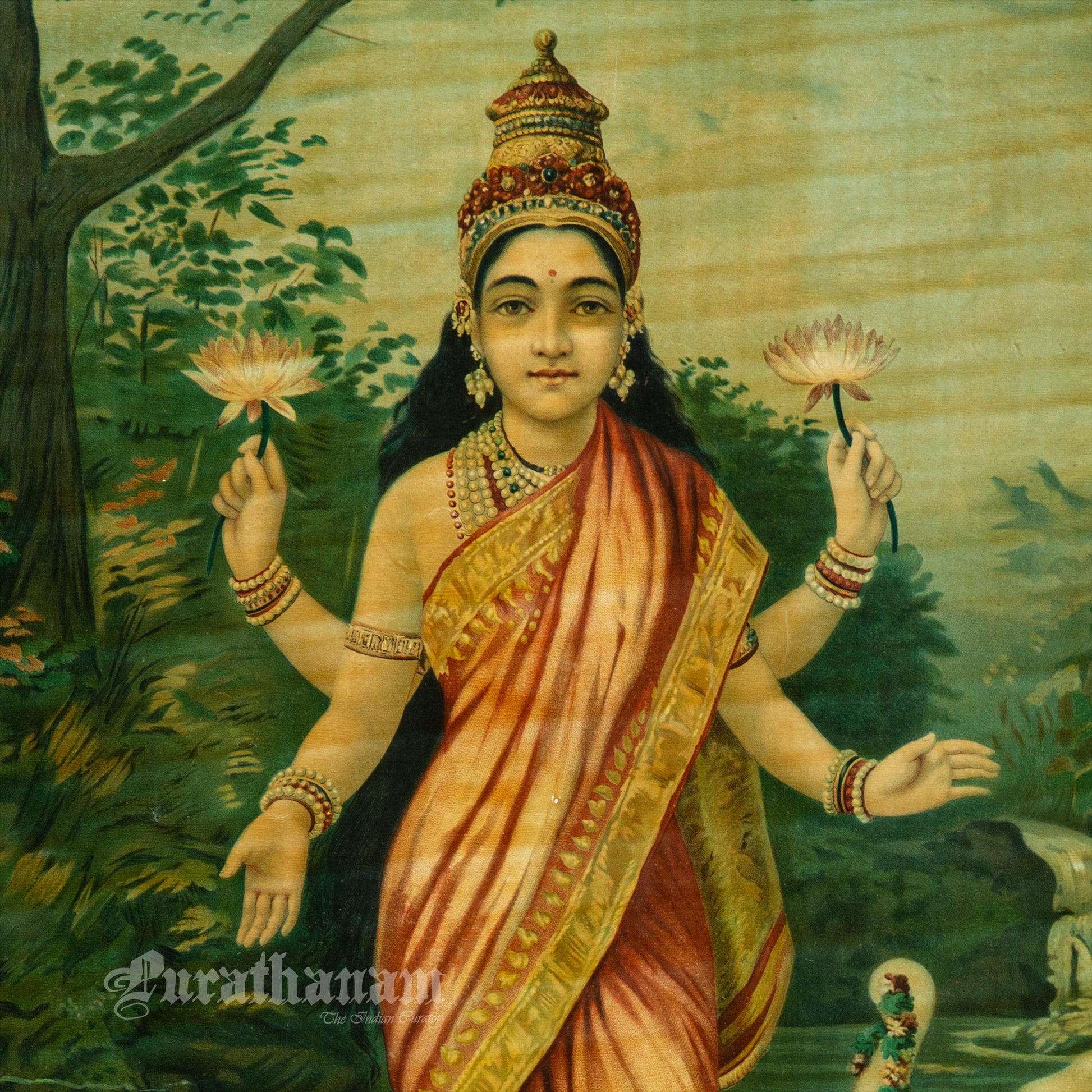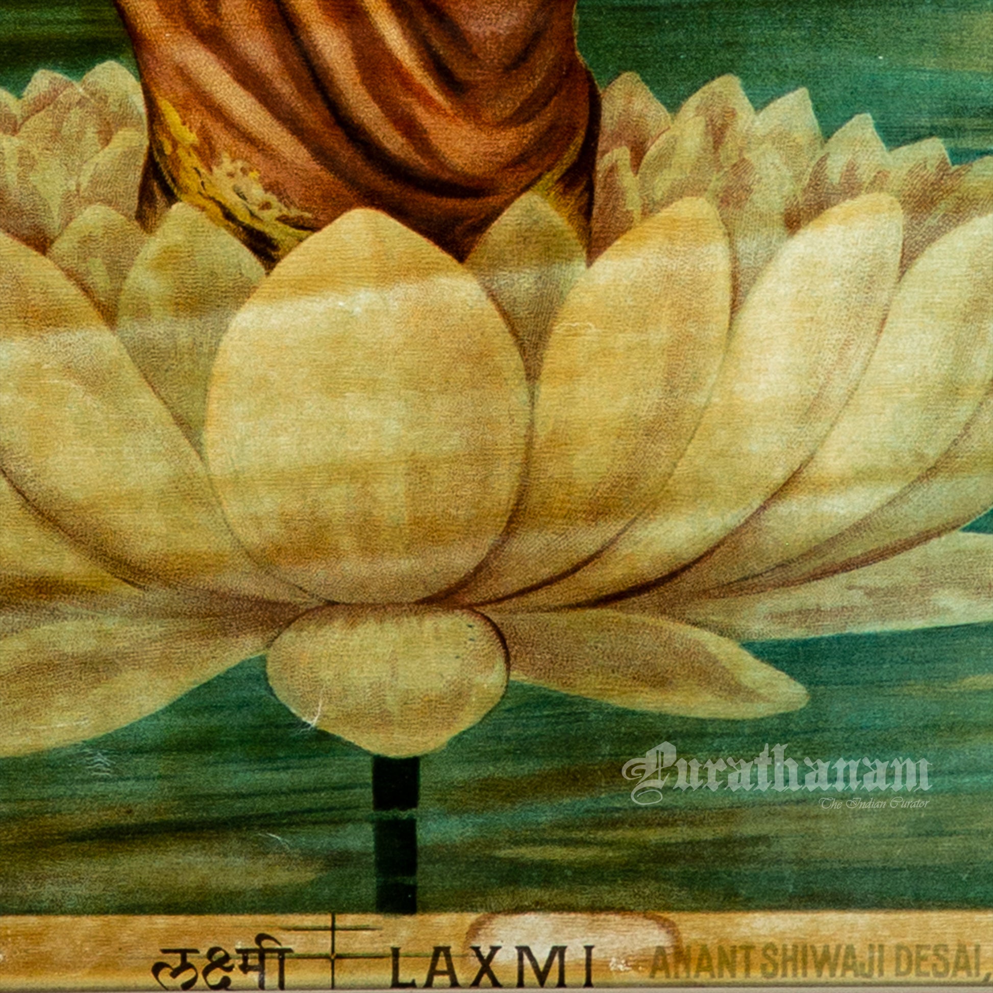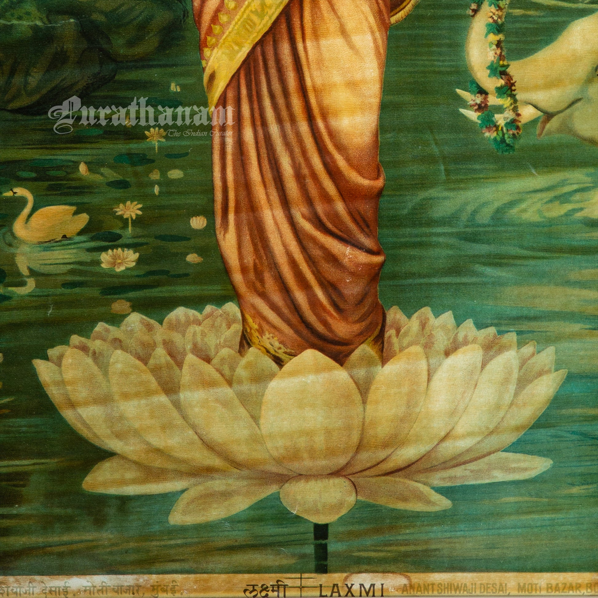 This is an oleograph print from 1920s of Lakshmi by Ravi Varma an Indian who achieved recognition for his depiction of scenes from the epics of the Mahabharata and Ramayana.