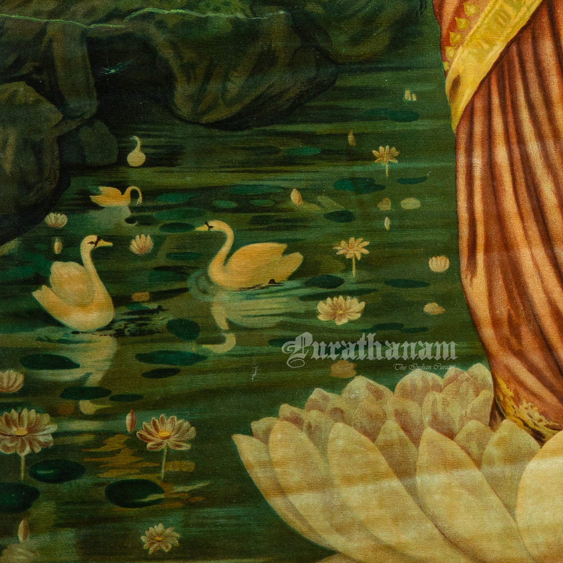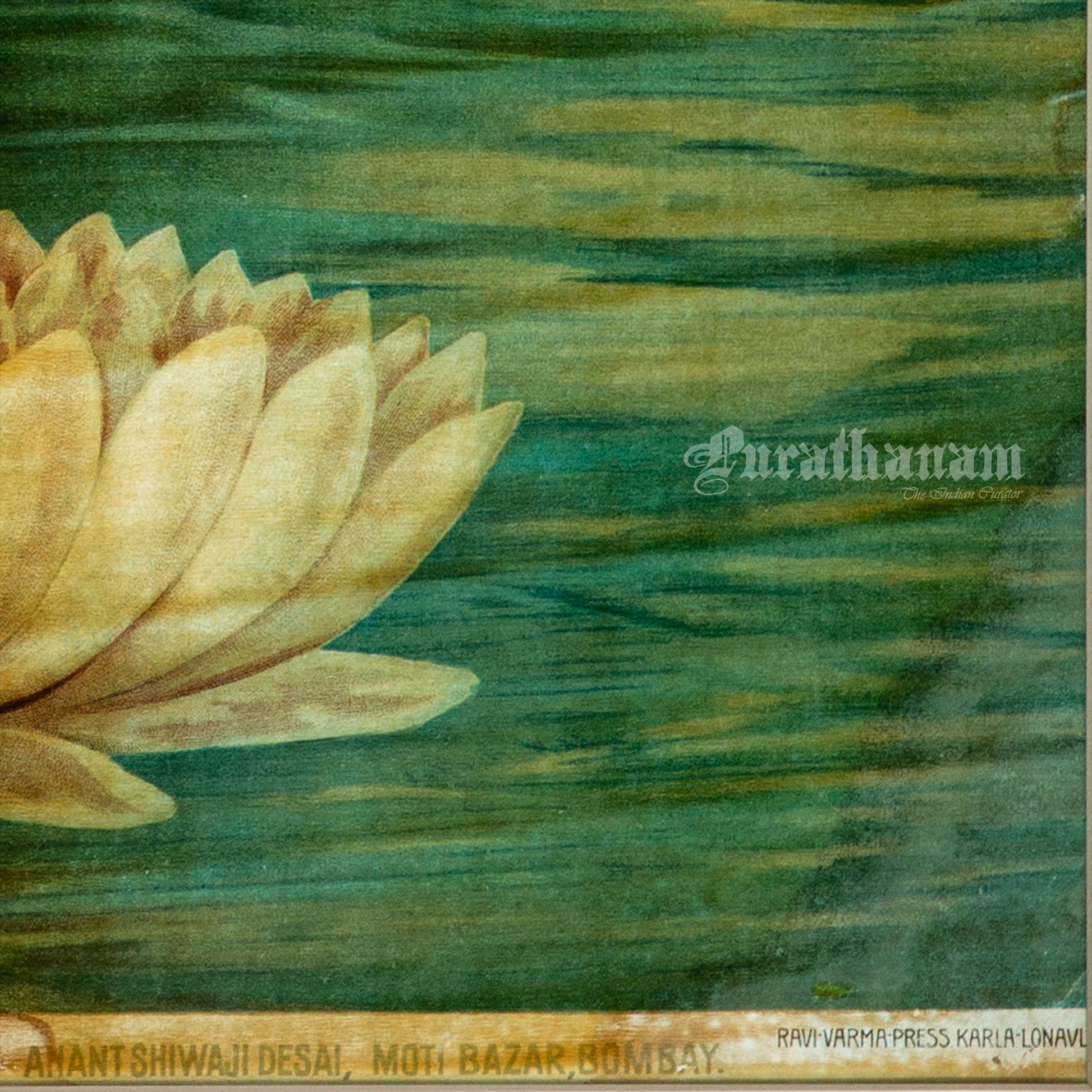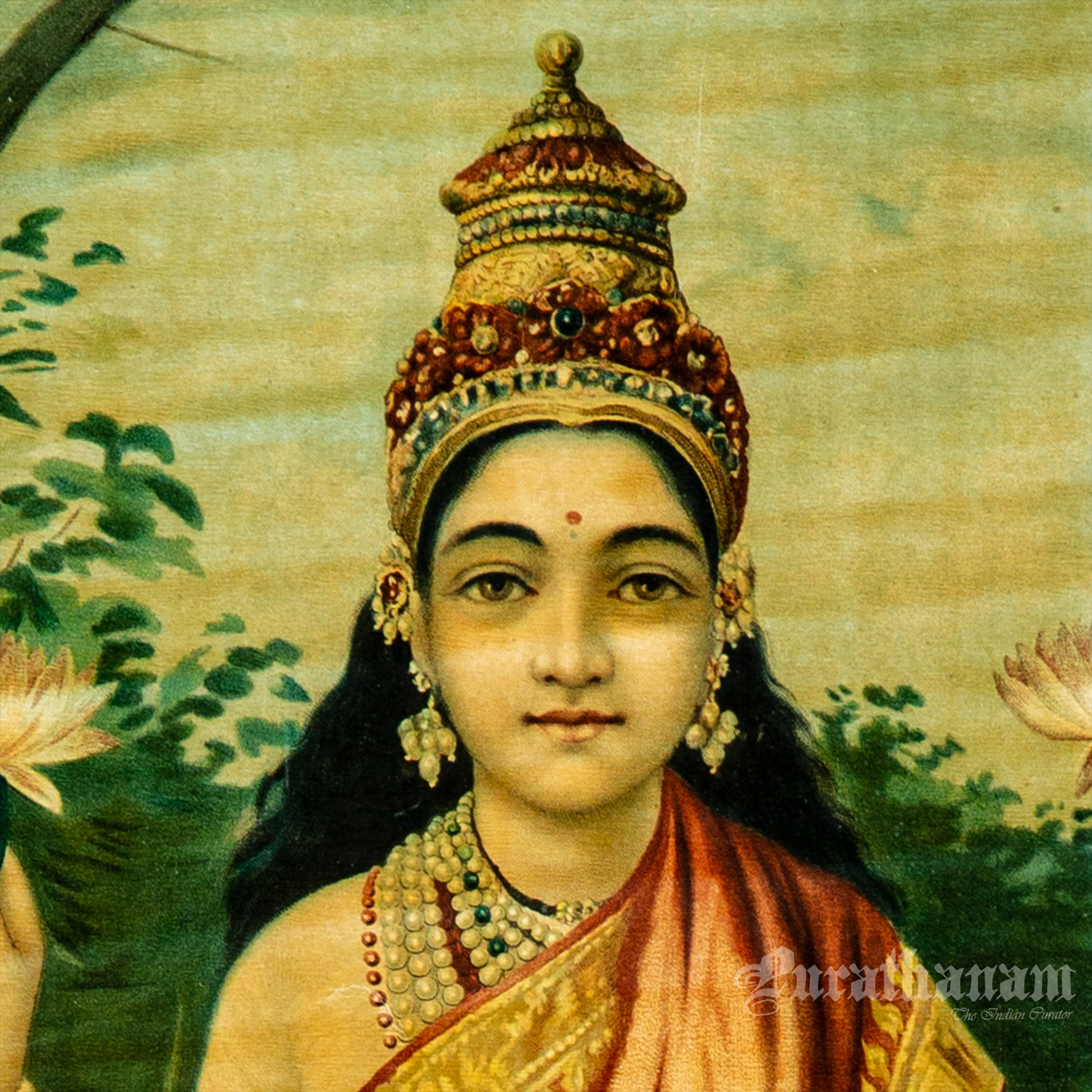 This is an oleograph print from 1920s of Lakshmi by Ravi Varma an Indian who achieved recognition for his depiction of scenes from the epics of the Mahabharata and Ramayana.