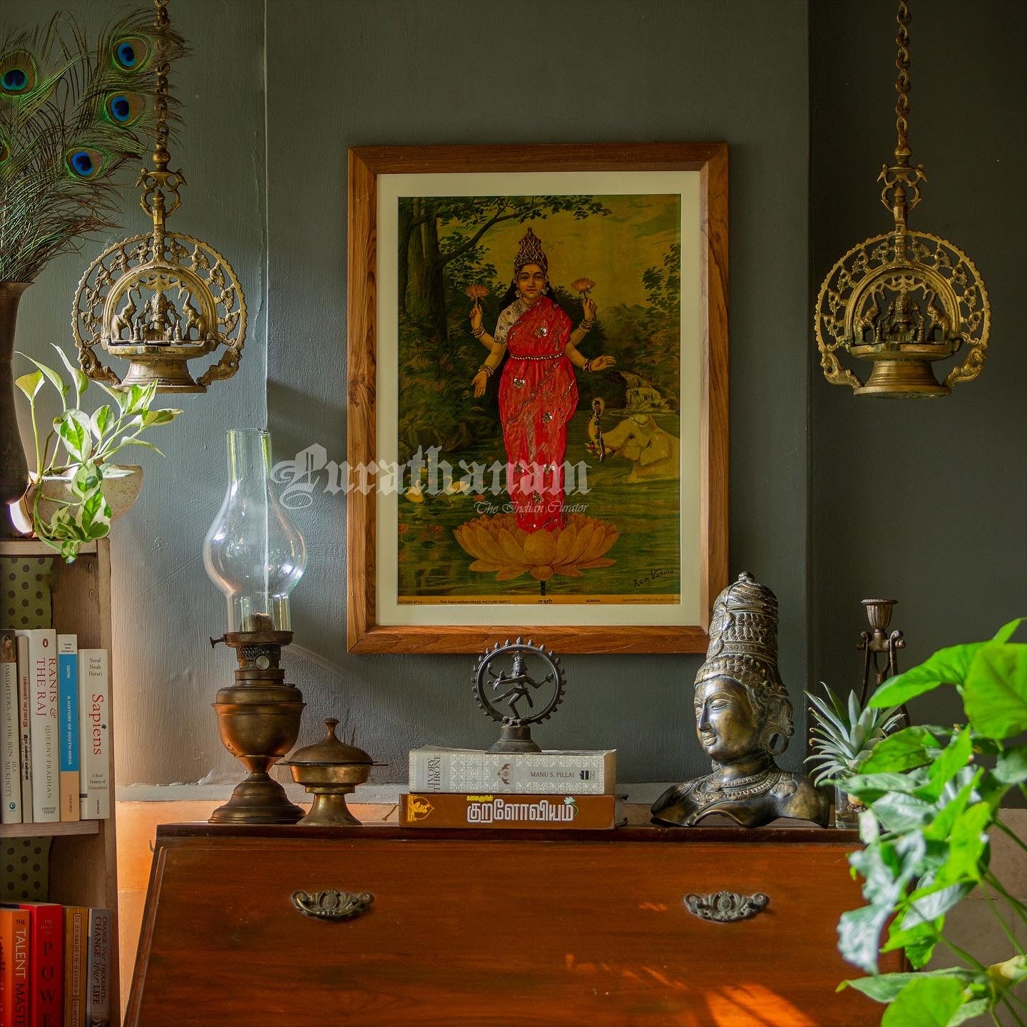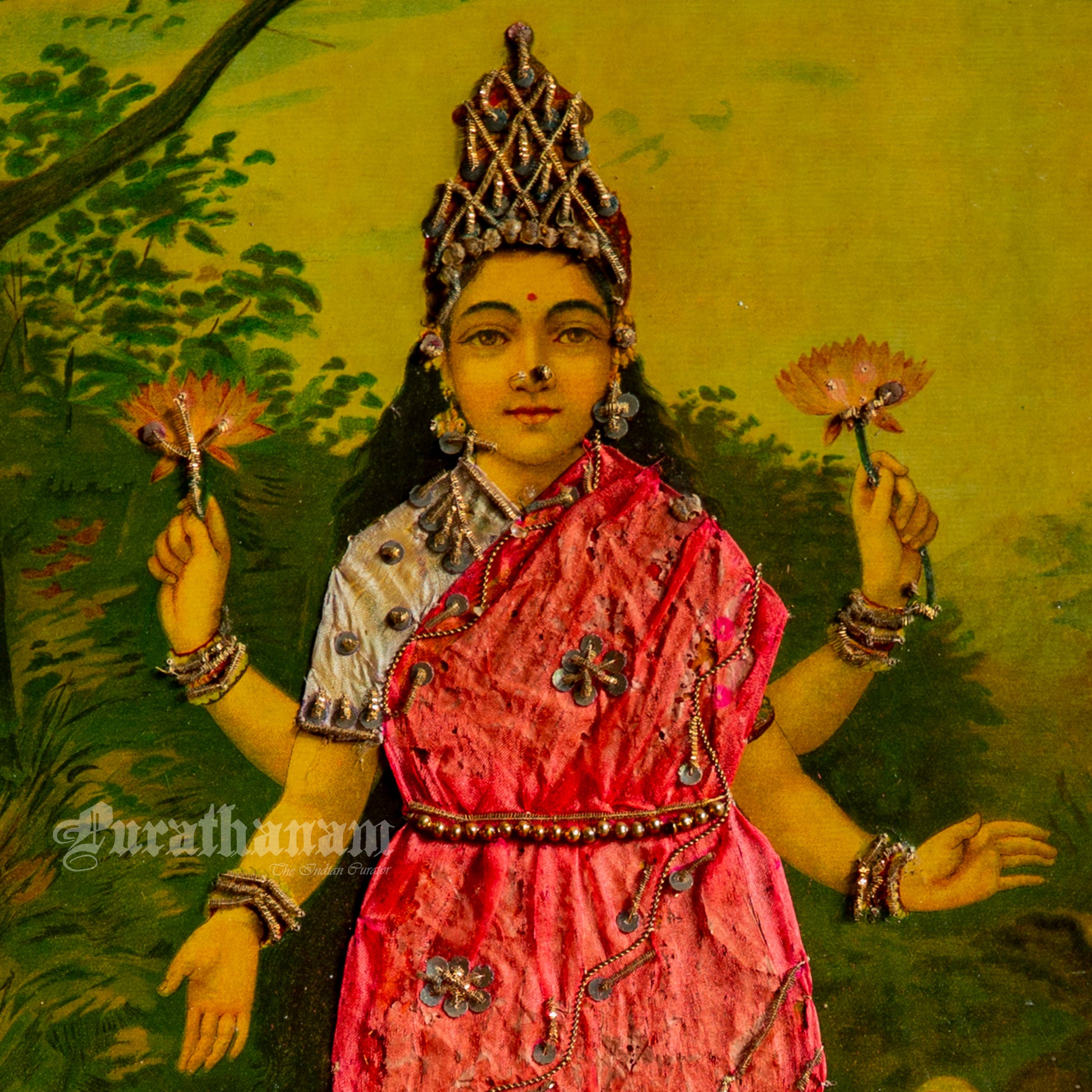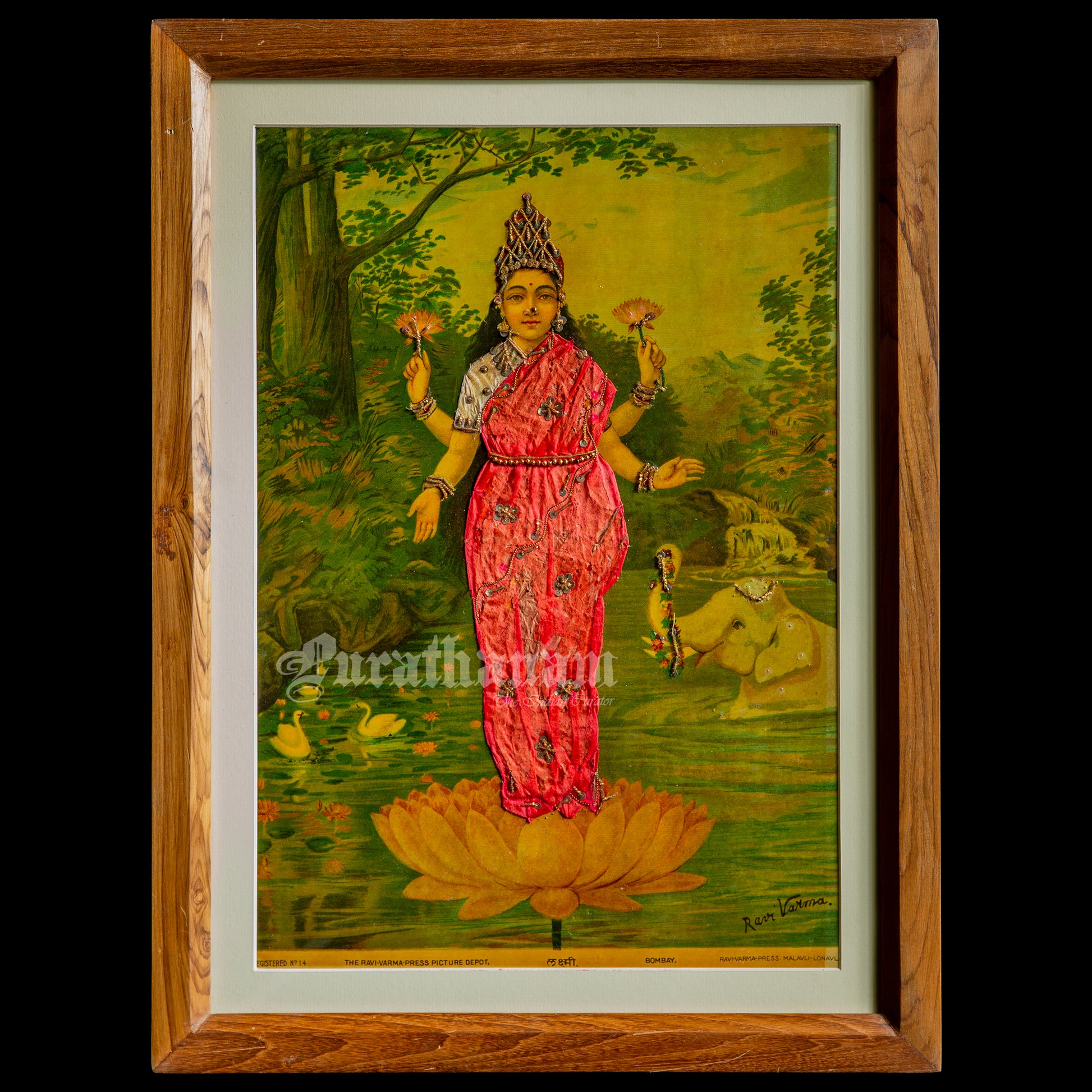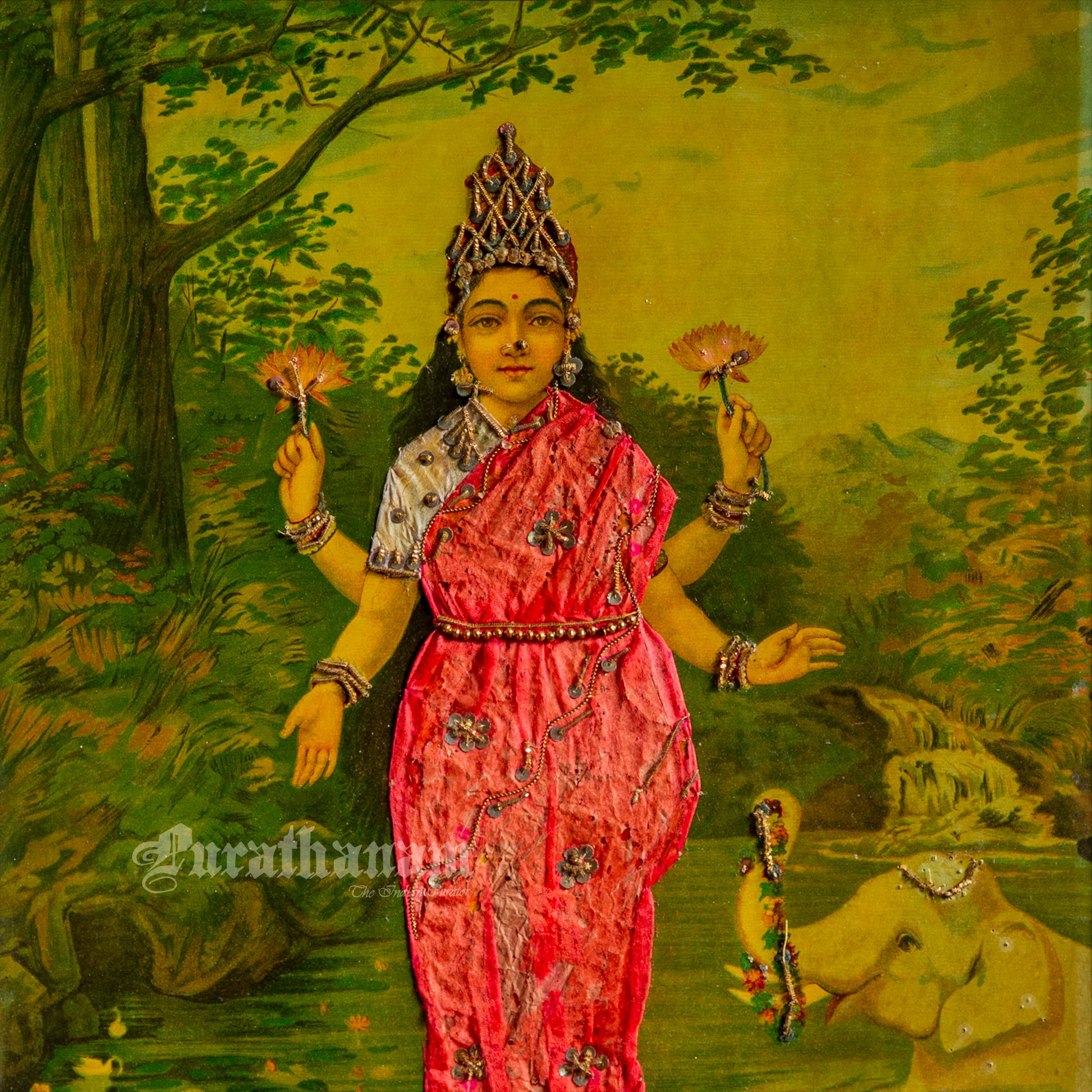This is an oleograph print from 1920s of Lakshmi by Ravi Varma an Indian who achieved recognition for his depiction of scenes from the epics of the Mahabharata and Ramayana.
