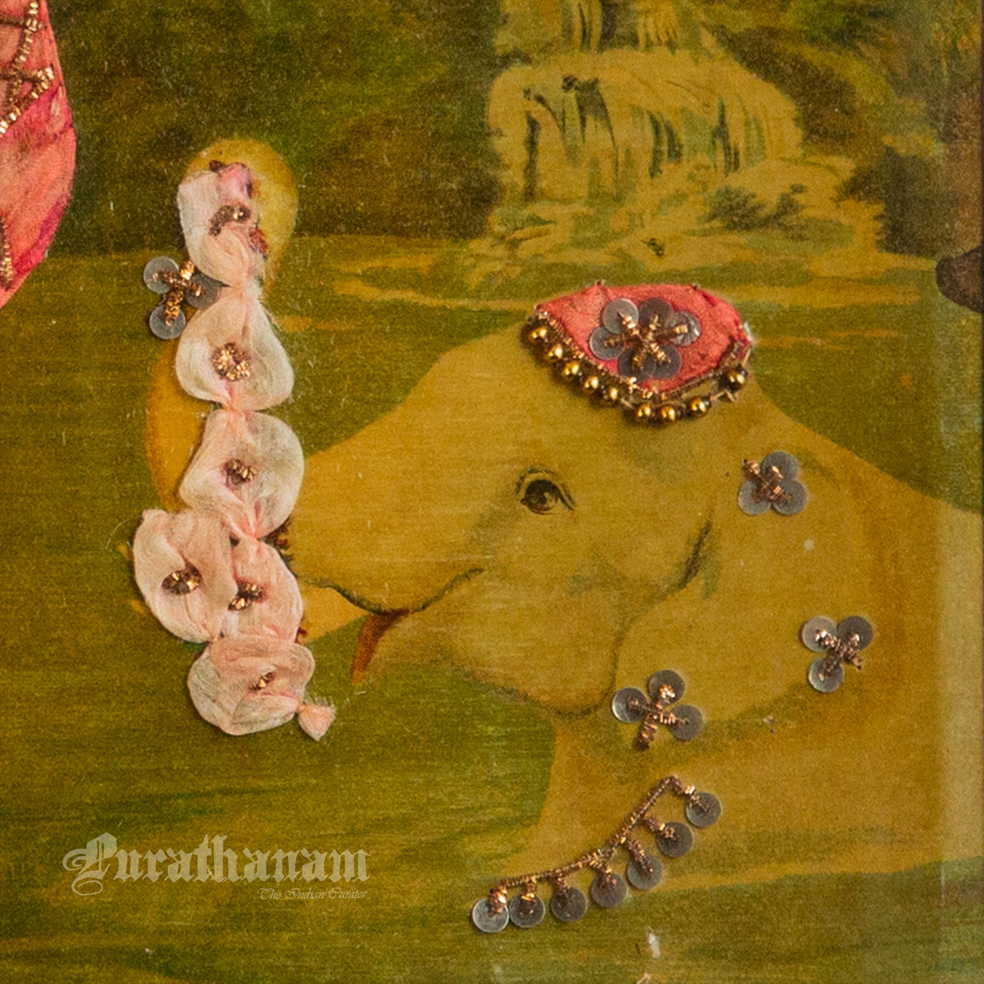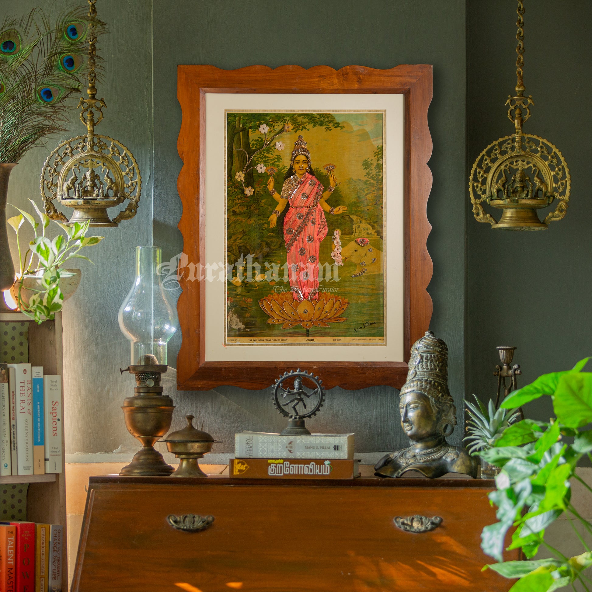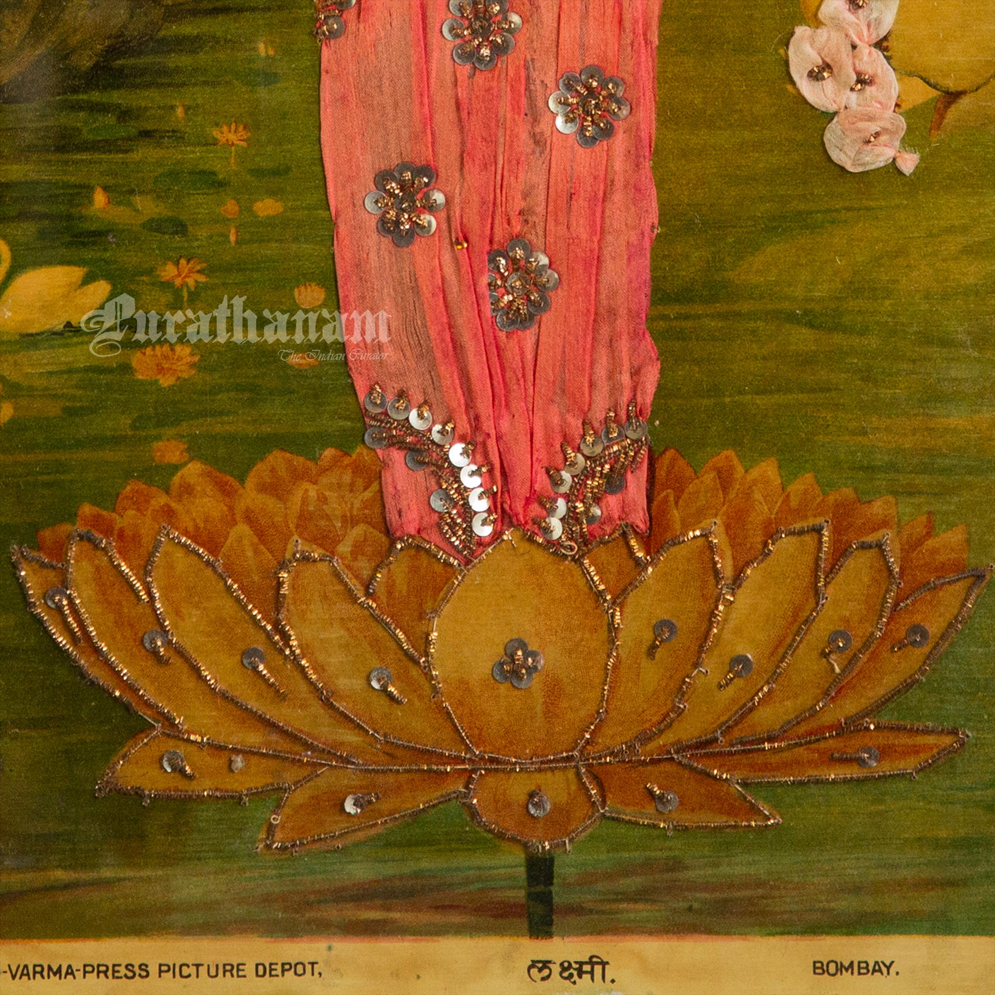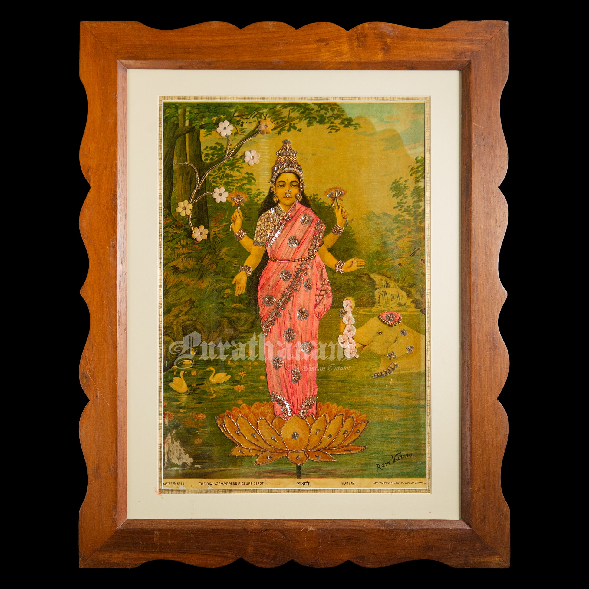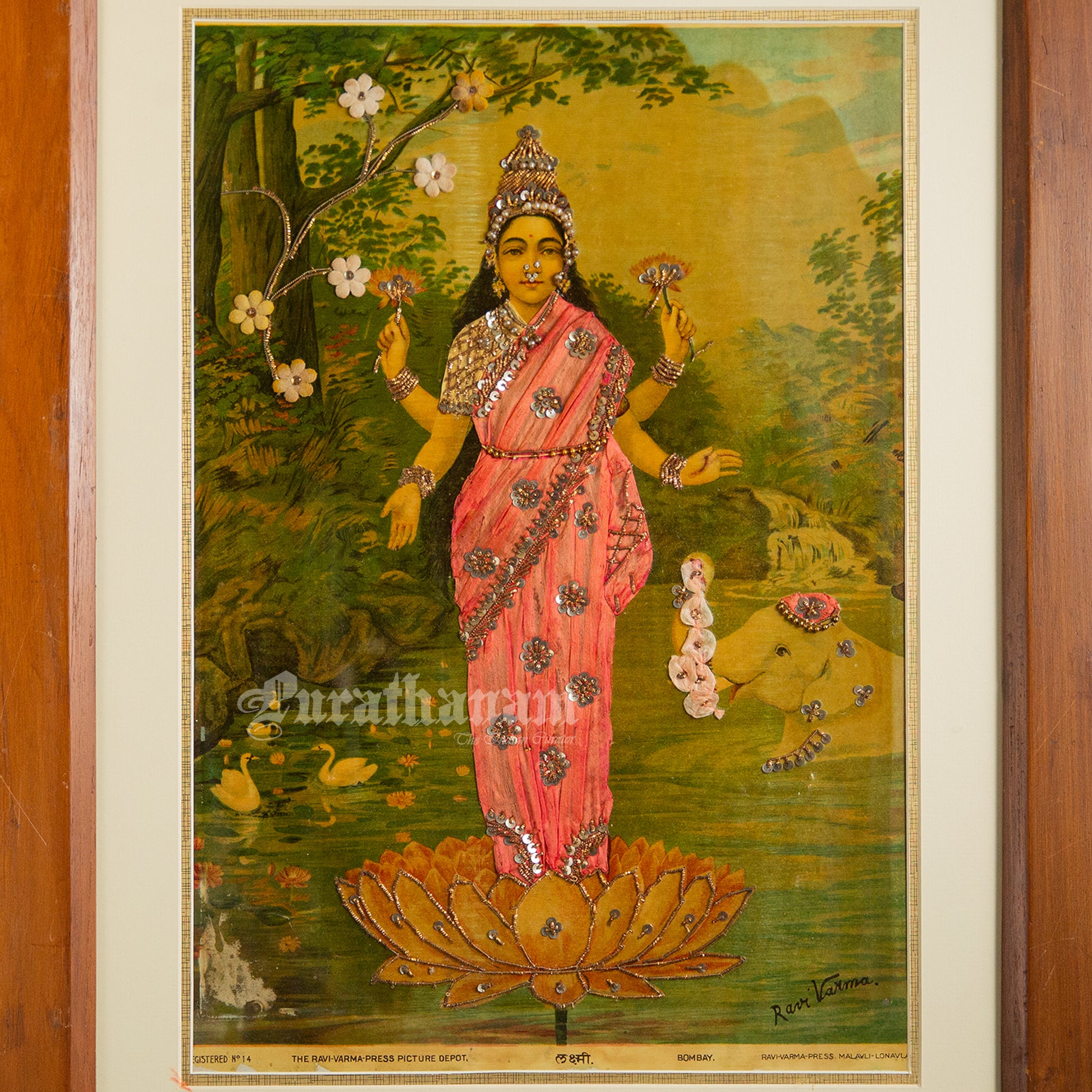 This is an oleograph print from 1920s of Lakshmi by Ravi Varma an Indian who achieved recognition for his depiction of scenes from the epics of the Mahabharata and Ramayana.