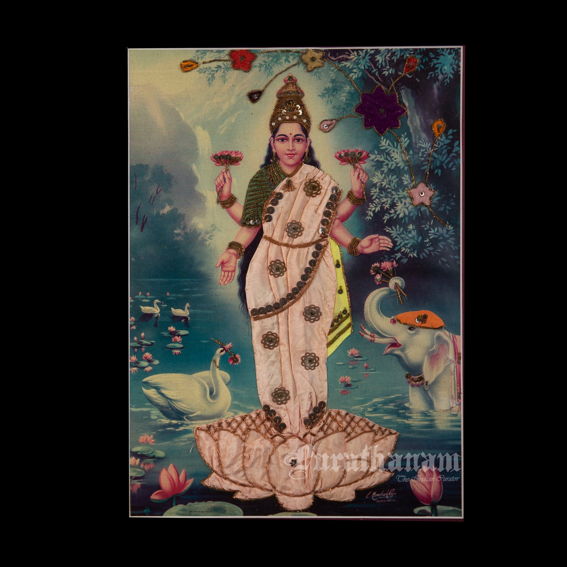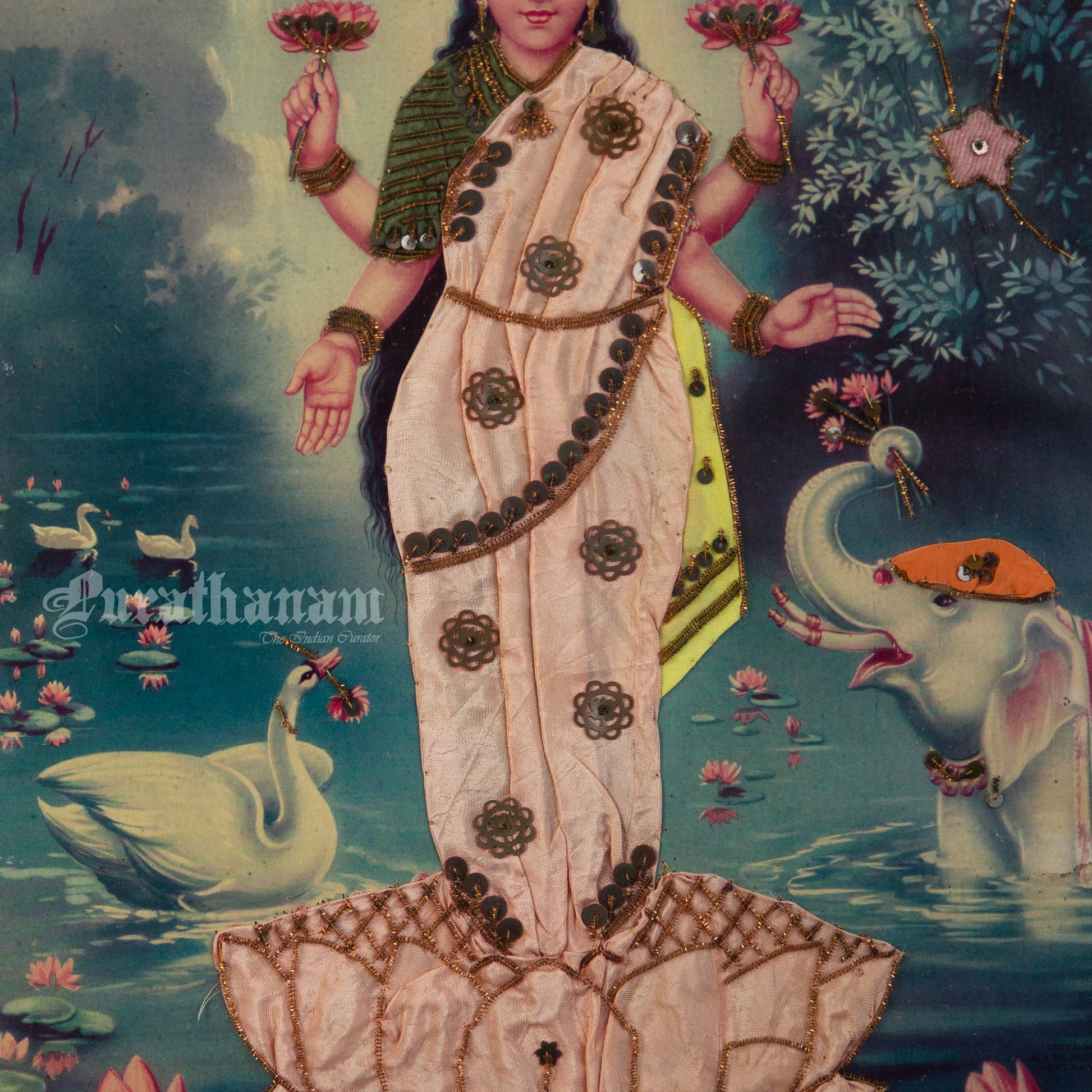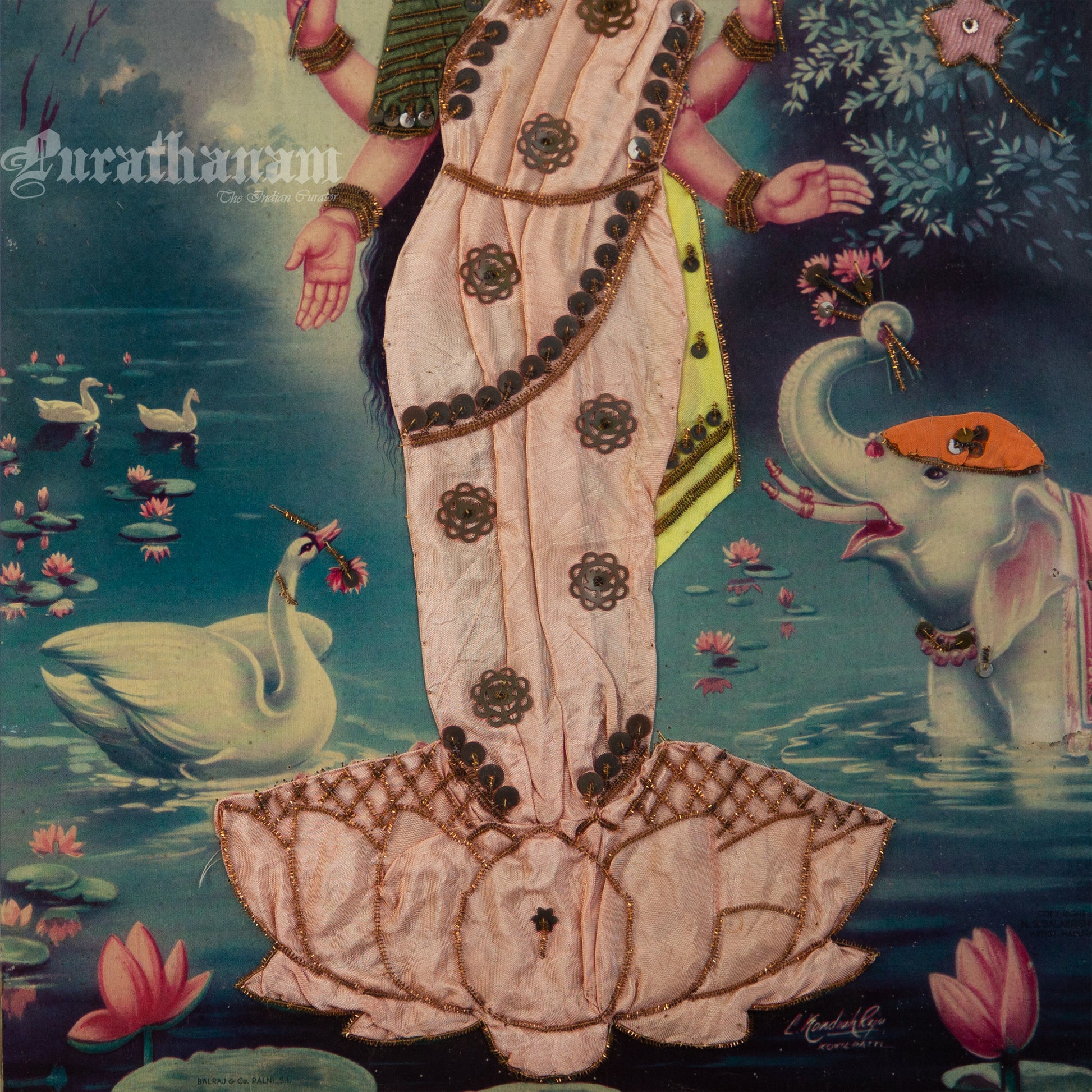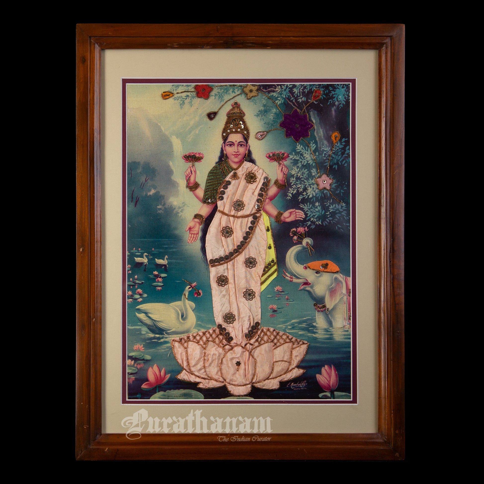 Here we have an off-set print of Lakshmi by the famous South indian artist Kovilpatti Kondiah Raju.. The print has been beautifully embellished by its owner using different fabrics, Zardosi and sequins to enhance the beauty of Lakshmi. It may have some signs of fading due to its age which adds to it's beauty.