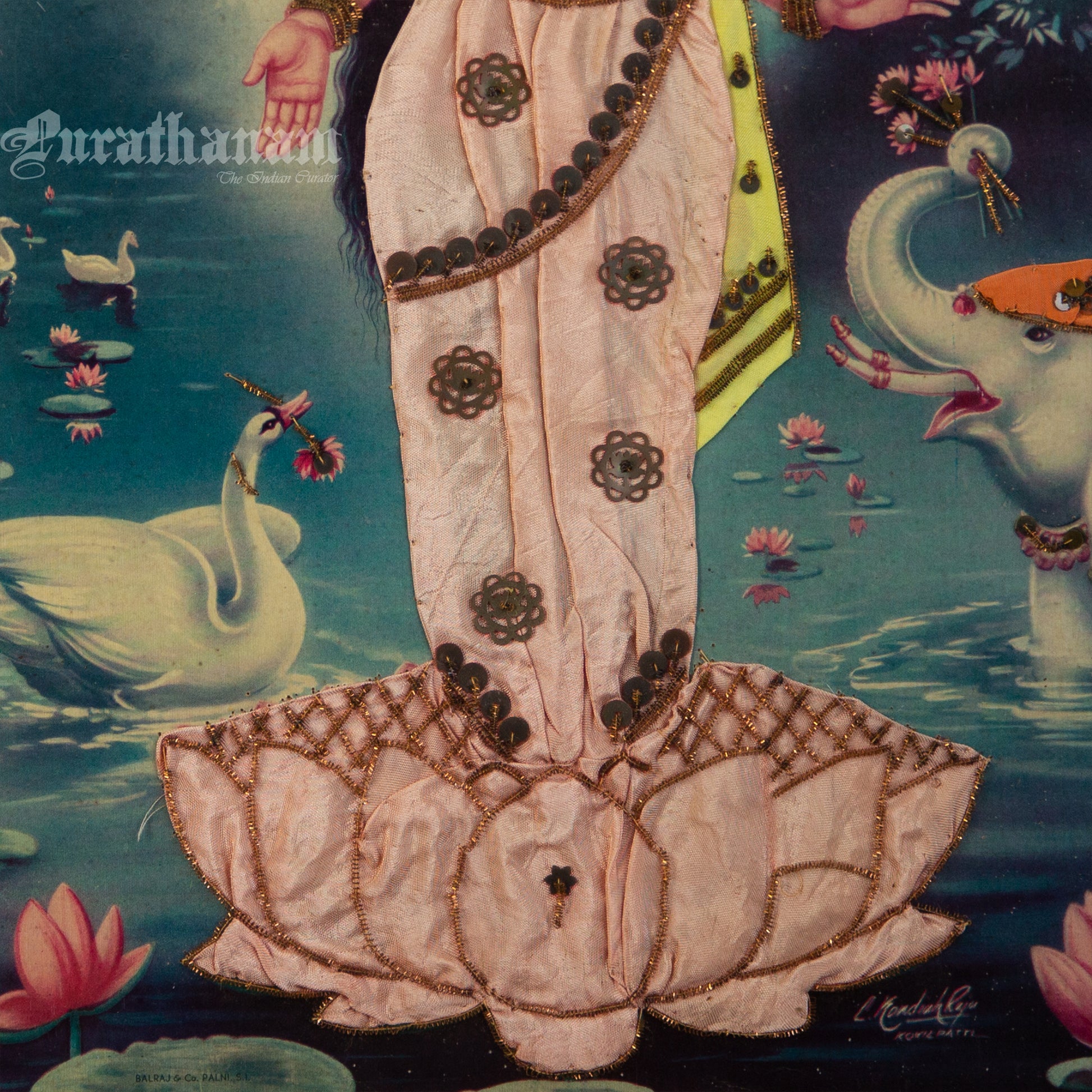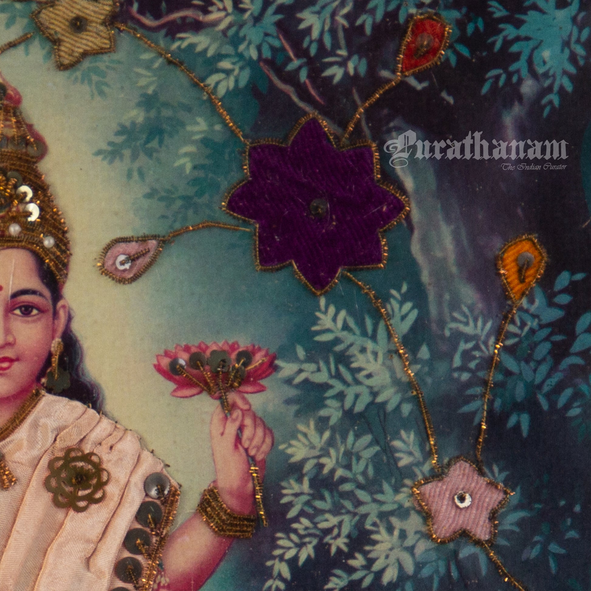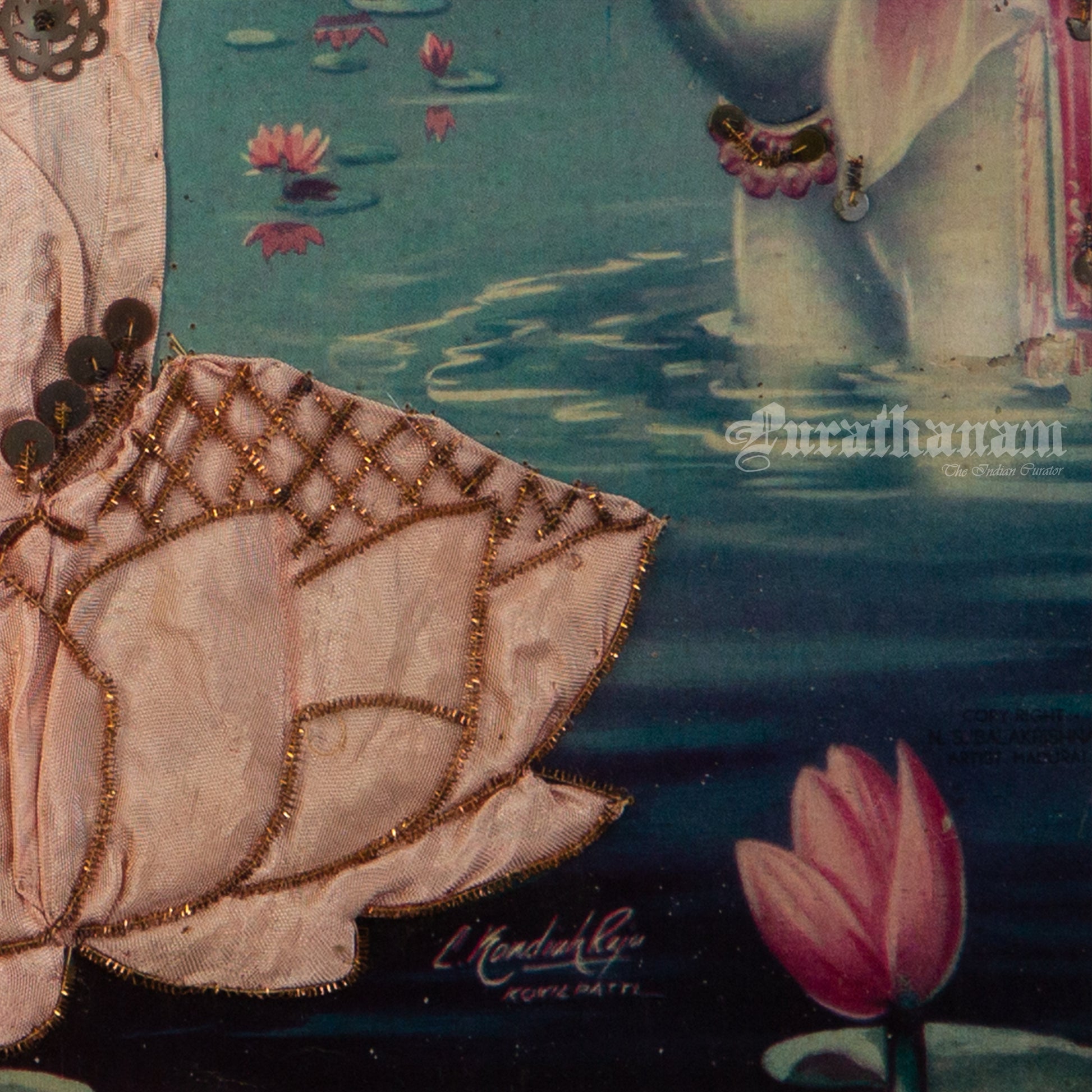 Here we have an off-set print of Lakshmi by the famous South indian artist Kovilpatti Kondiah Raju.. The print has been beautifully embellished by its owner using different fabrics, Zardosi and sequins to enhance the beauty of Lakshmi. It may have some signs of fading due to its age which adds to it's beauty.