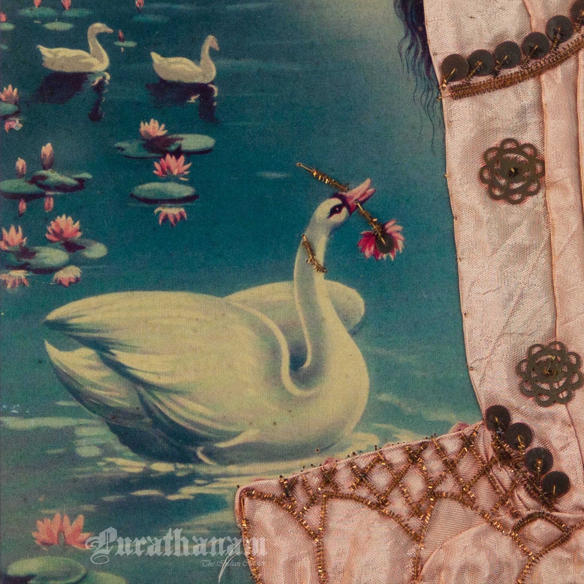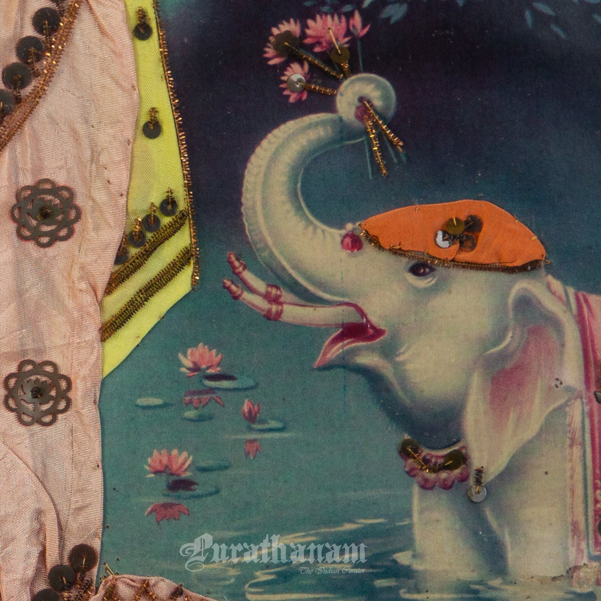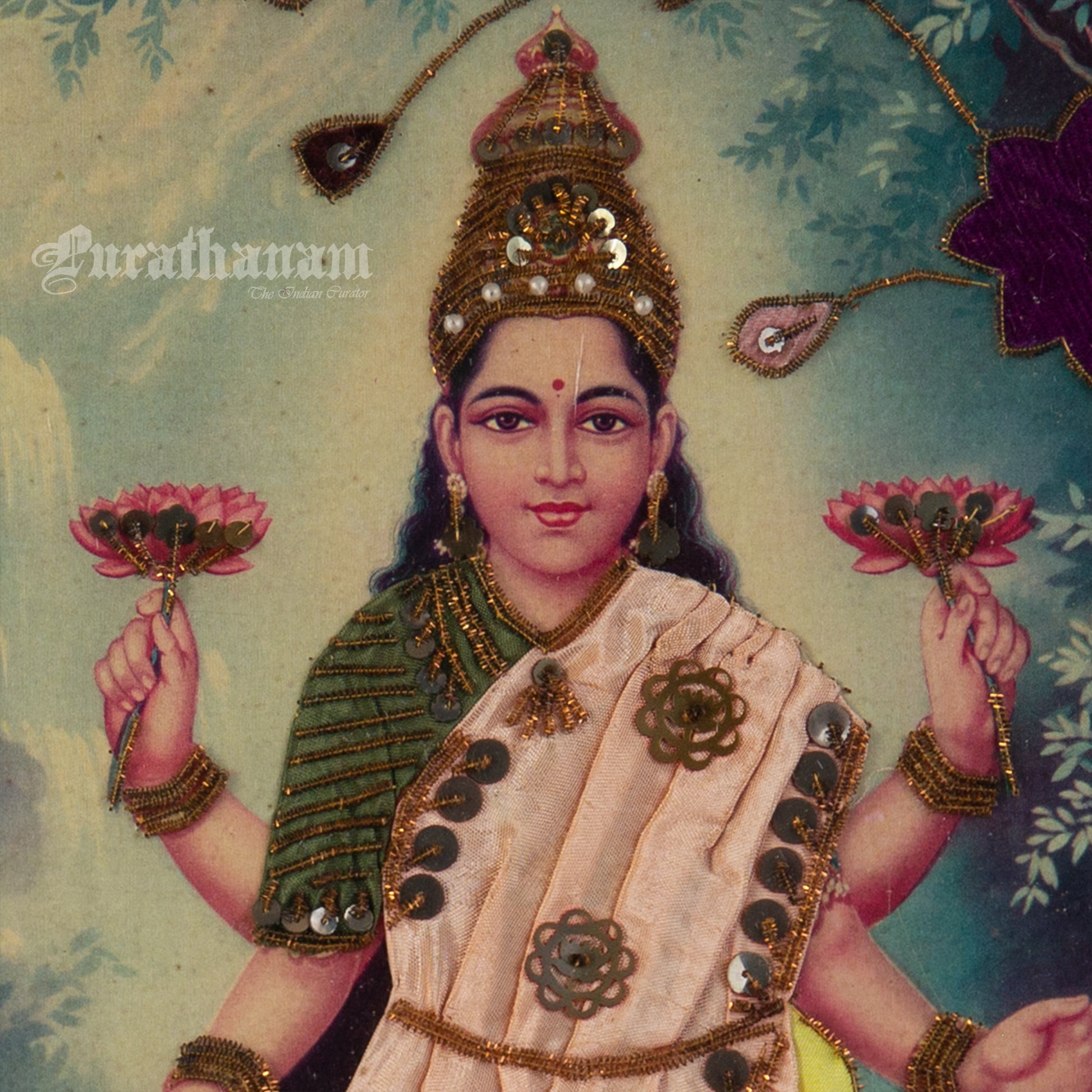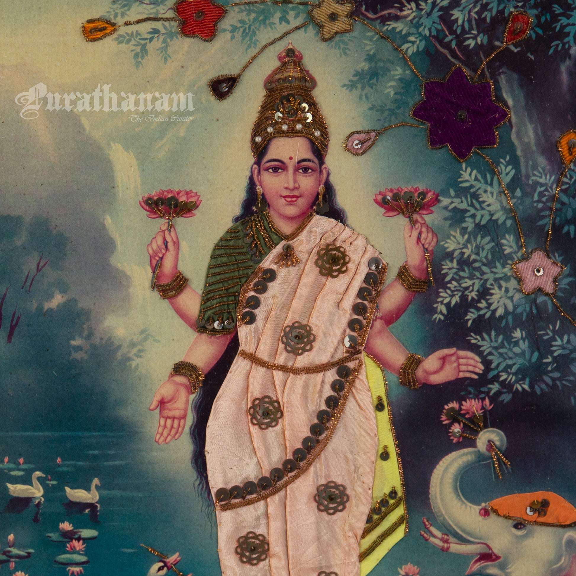 Here we have an off-set print of Lakshmi by the famous South indian artist Kovilpatti Kondiah Raju.. The print has been beautifully embellished by its owner using different fabrics, Zardosi and sequins to enhance the beauty of Lakshmi. It may have some signs of fading due to its age which adds to it's beauty.