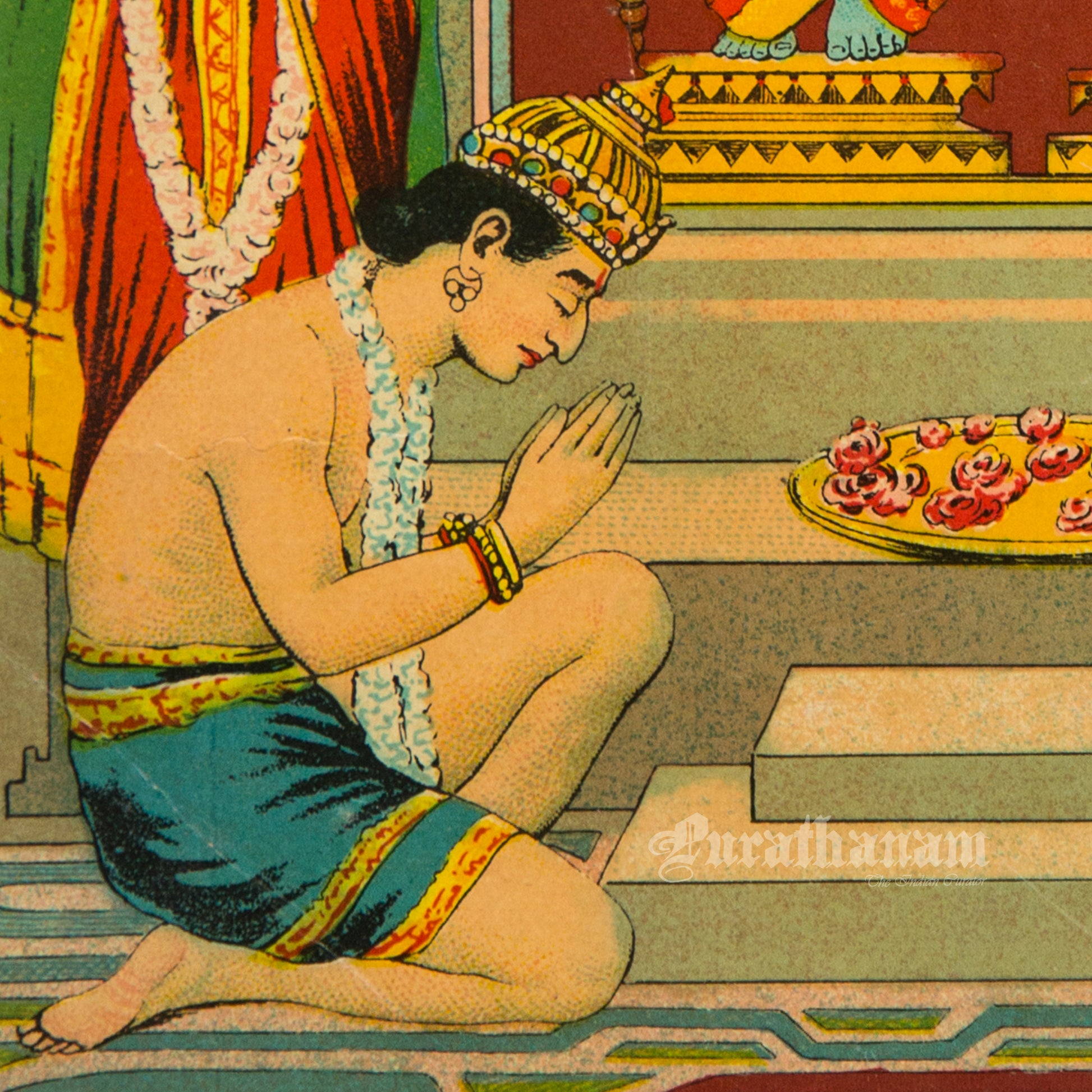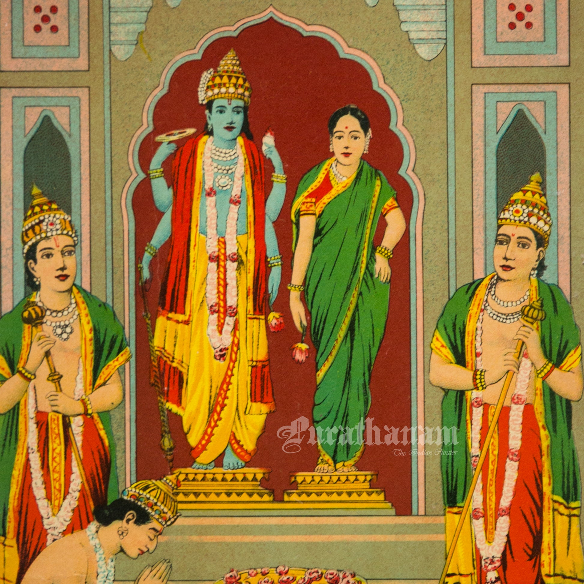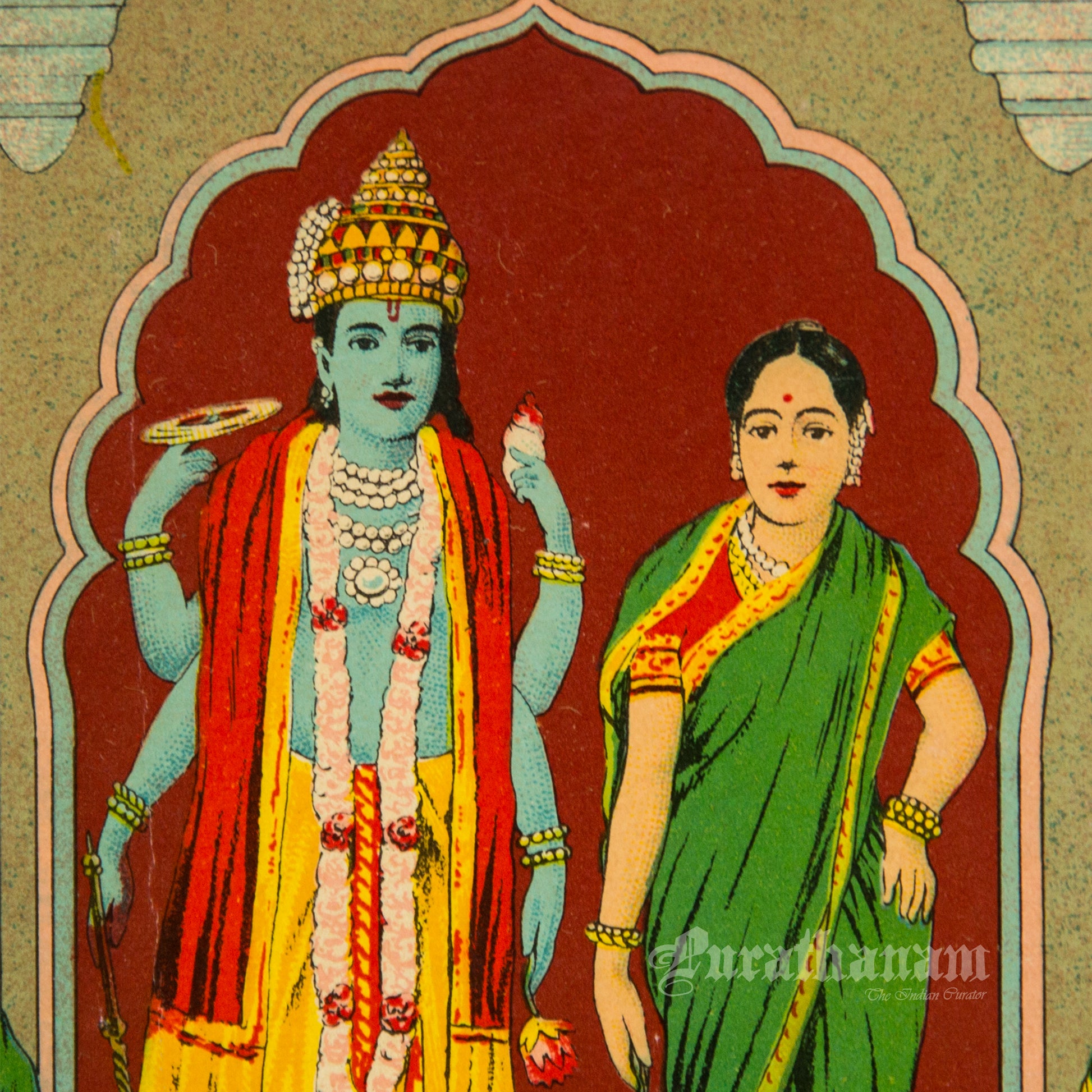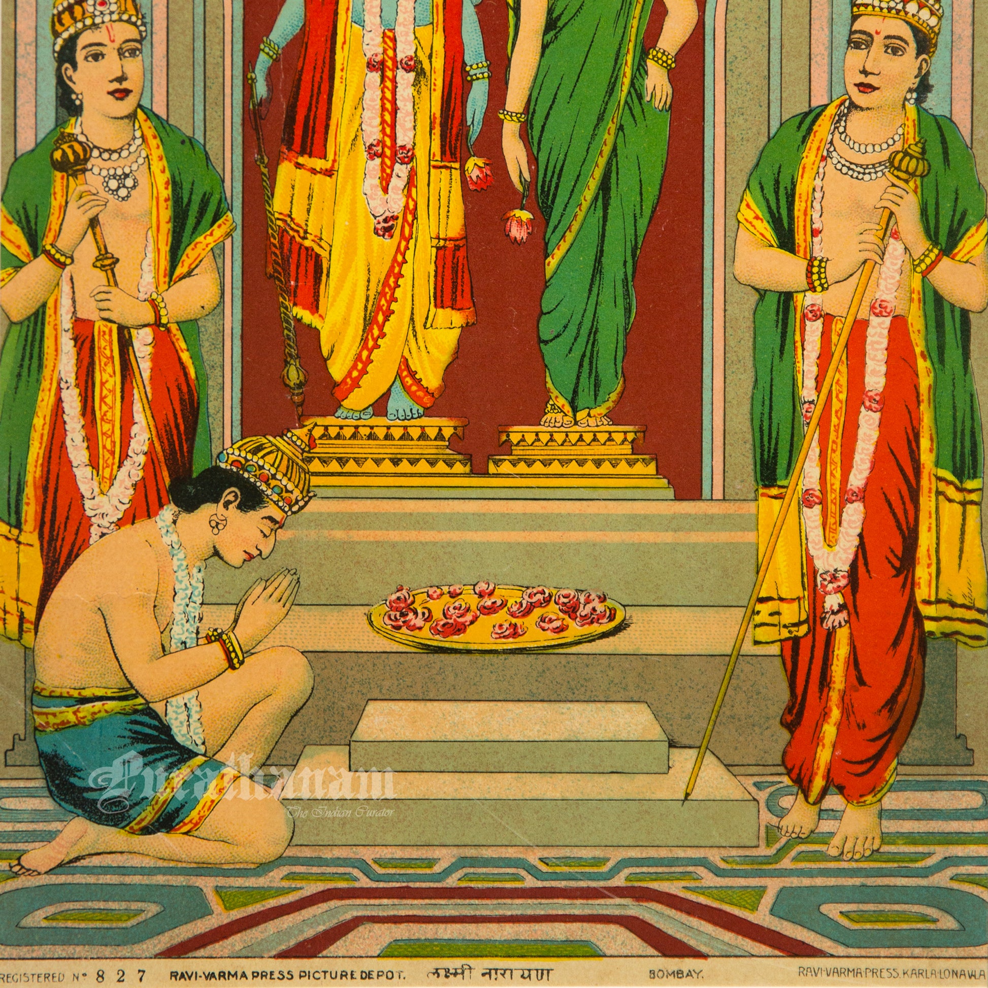 Introducing mini lithograph prints of size 10”x7” from 1920s - 1930s of Lakshmi Narayan by Ravi Varma an Indian who achieved recognition for his depiction of scenes from the epics of the Mahabharata and Ramayana.