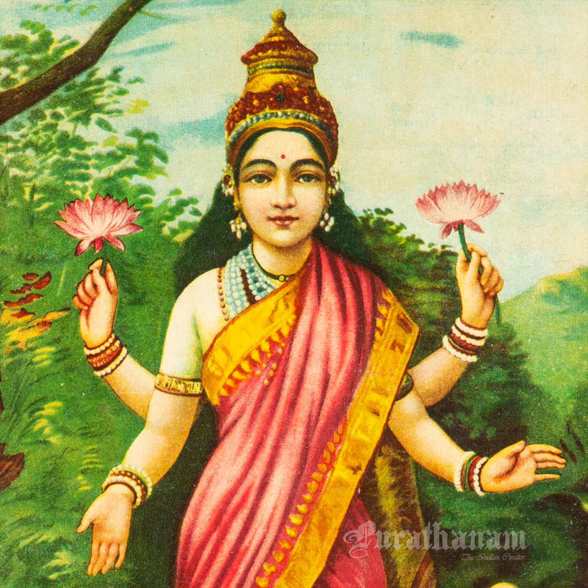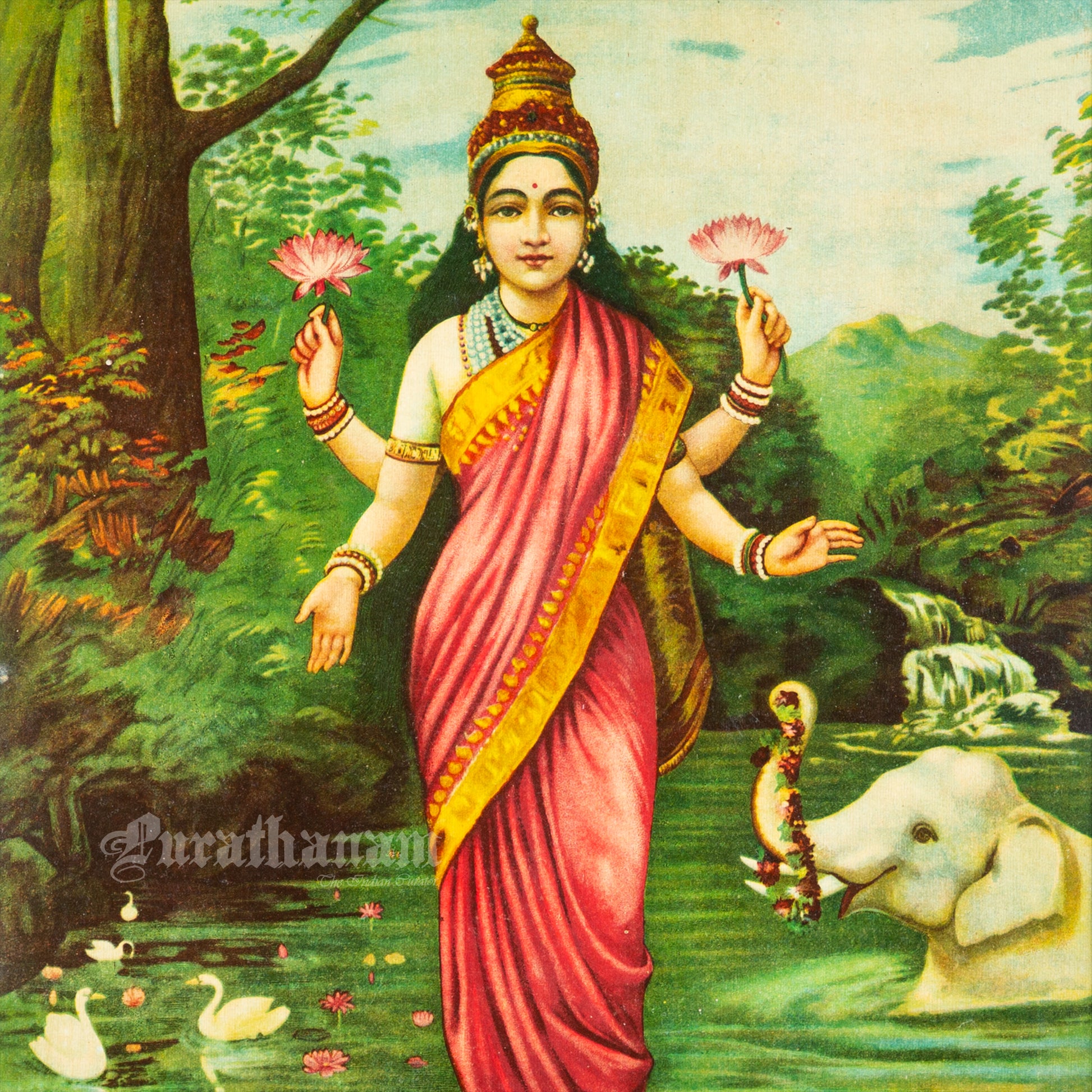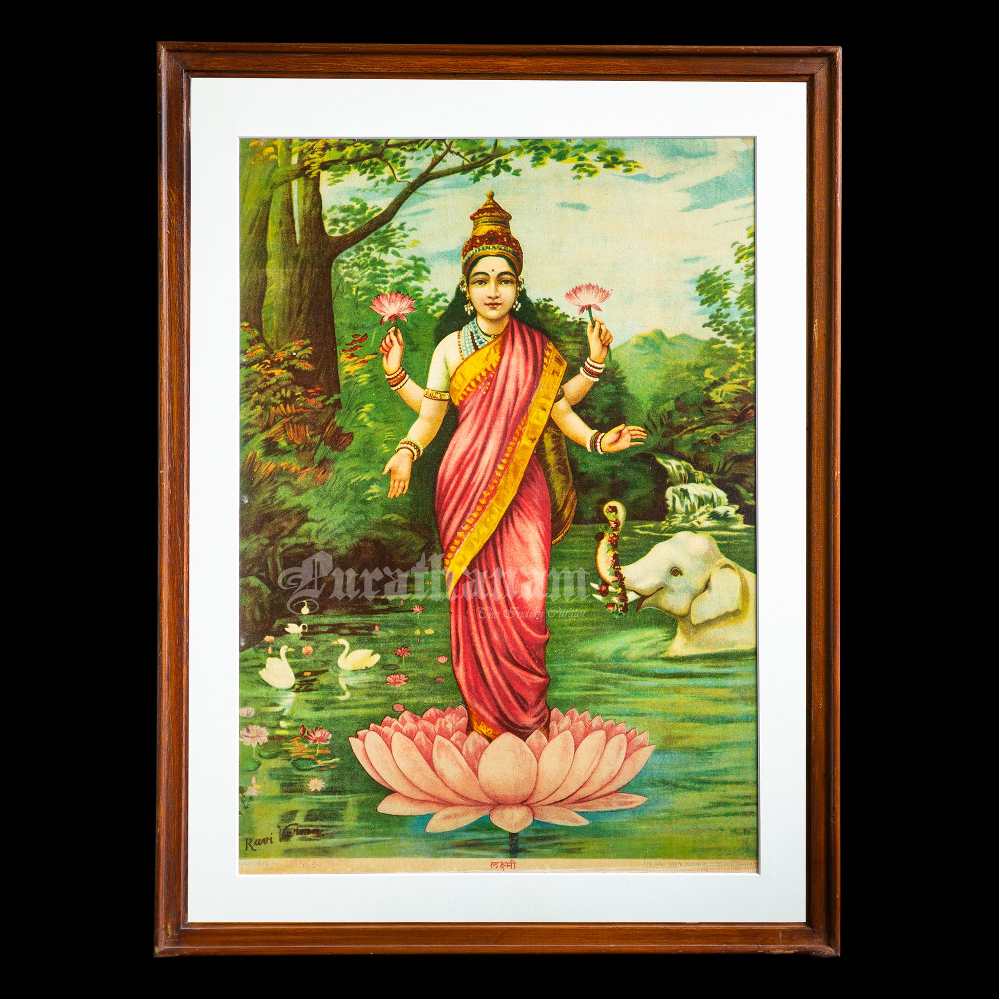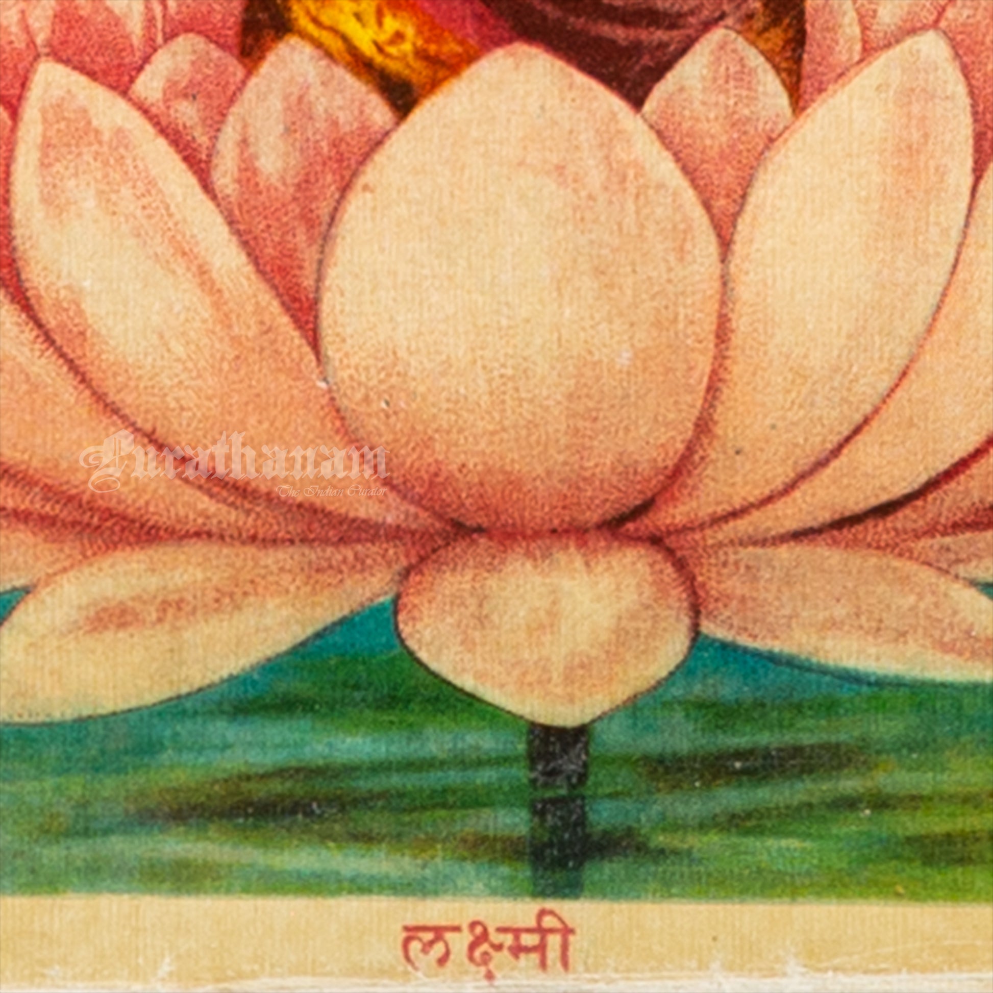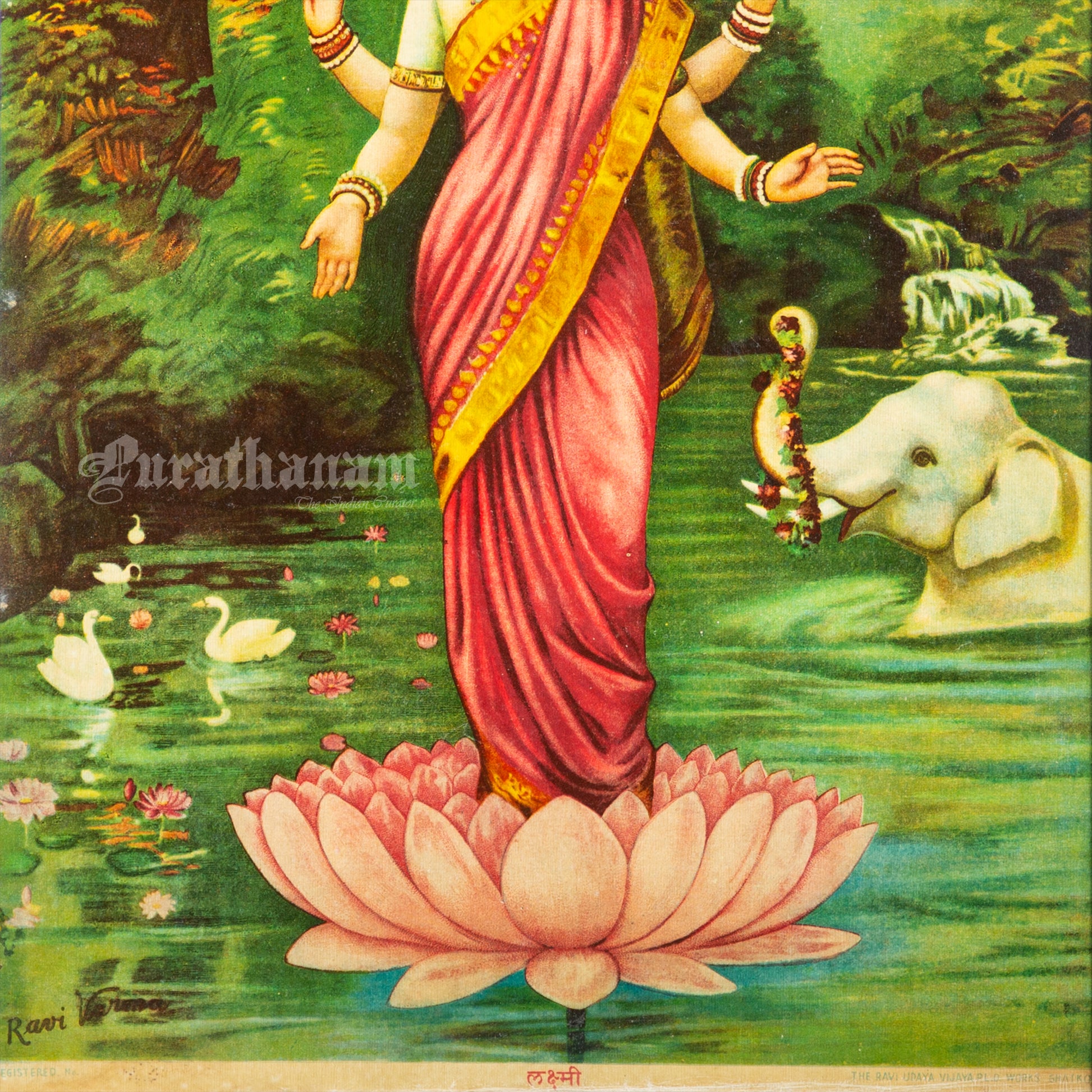 This is an oleograph print from 1920s of Lakshmi by Ravi Varma an Indian who achieved recognition for his depiction of scenes from the epics of the Mahabharata and Ramayana.