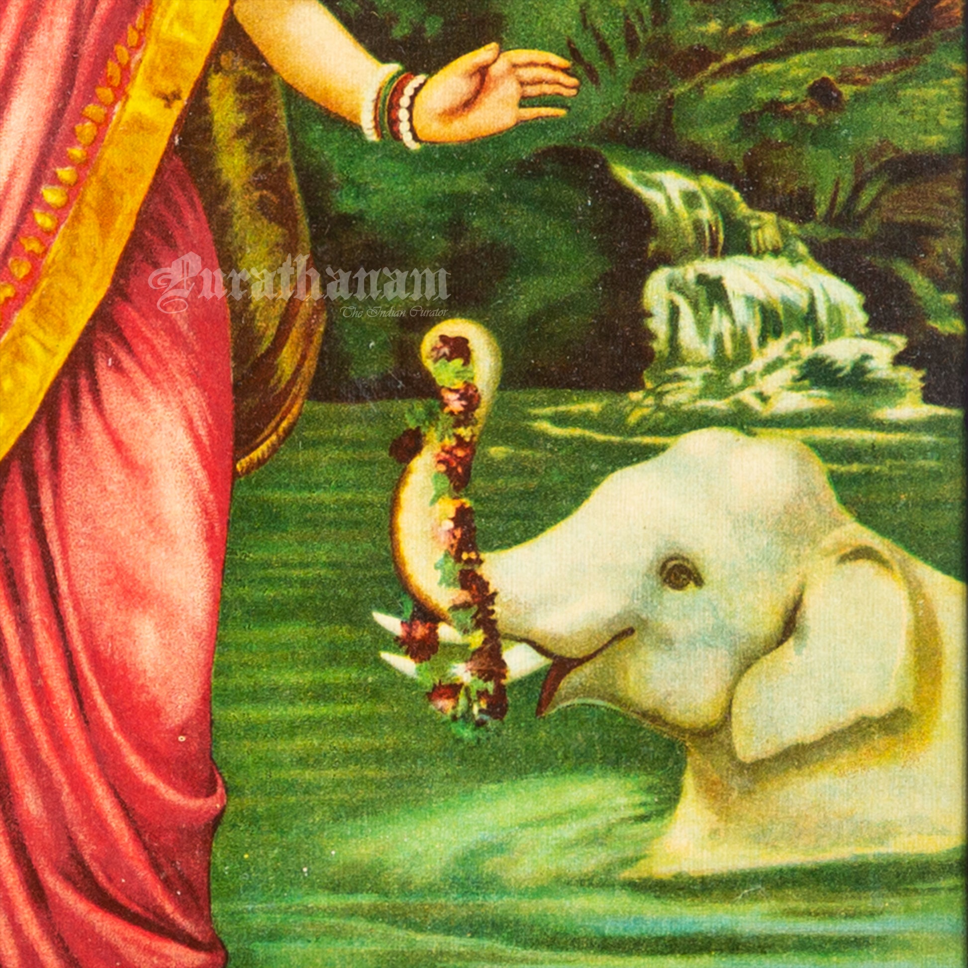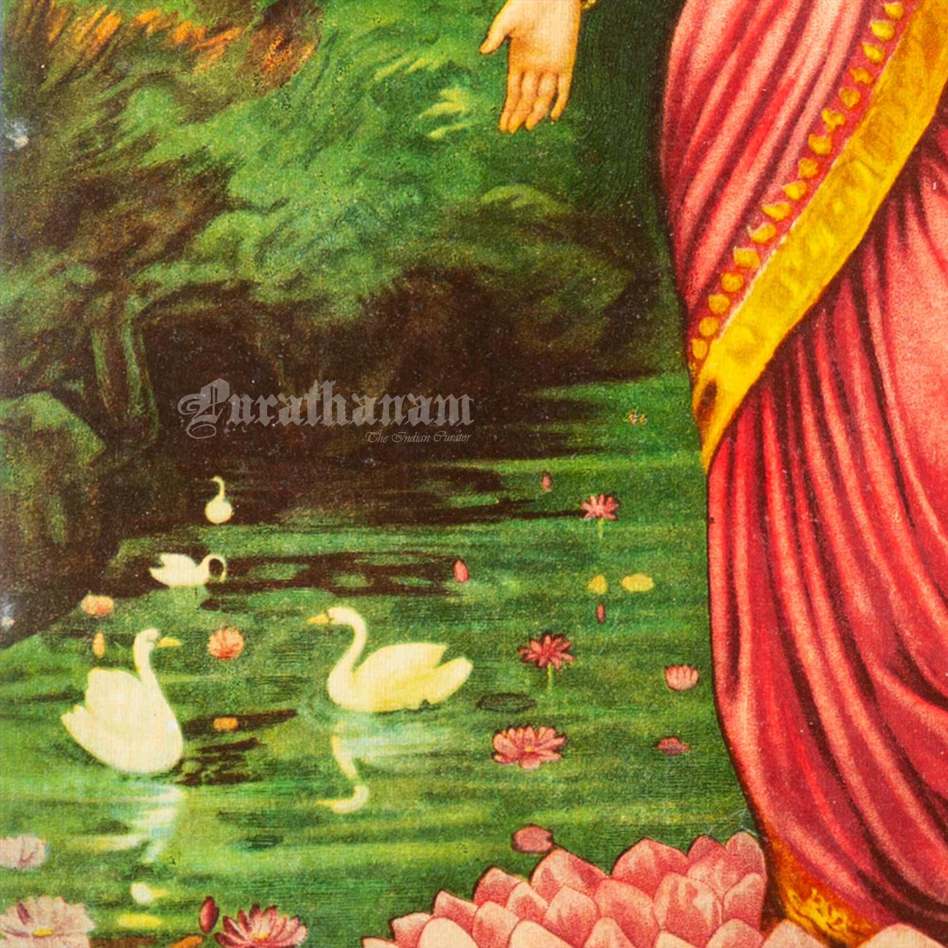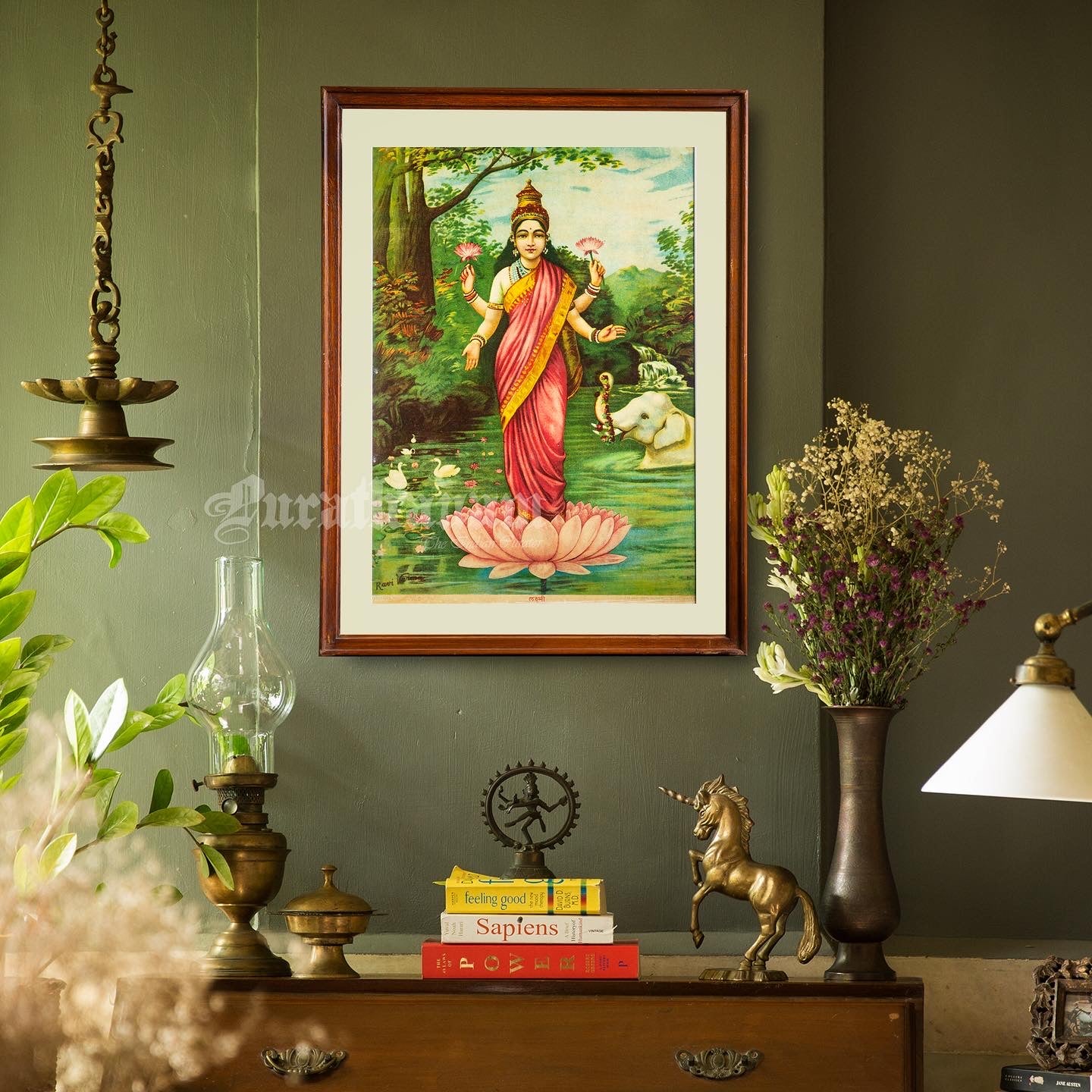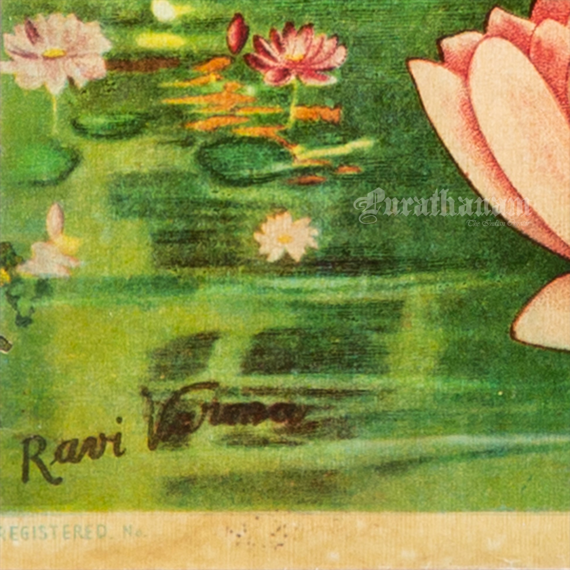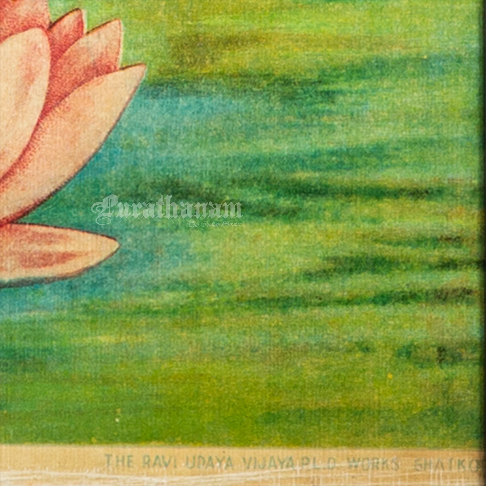 This is an oleograph print from 1920s of Lakshmi by Ravi Varma an Indian who achieved recognition for his depiction of scenes from the epics of the Mahabharata and Ramayana.