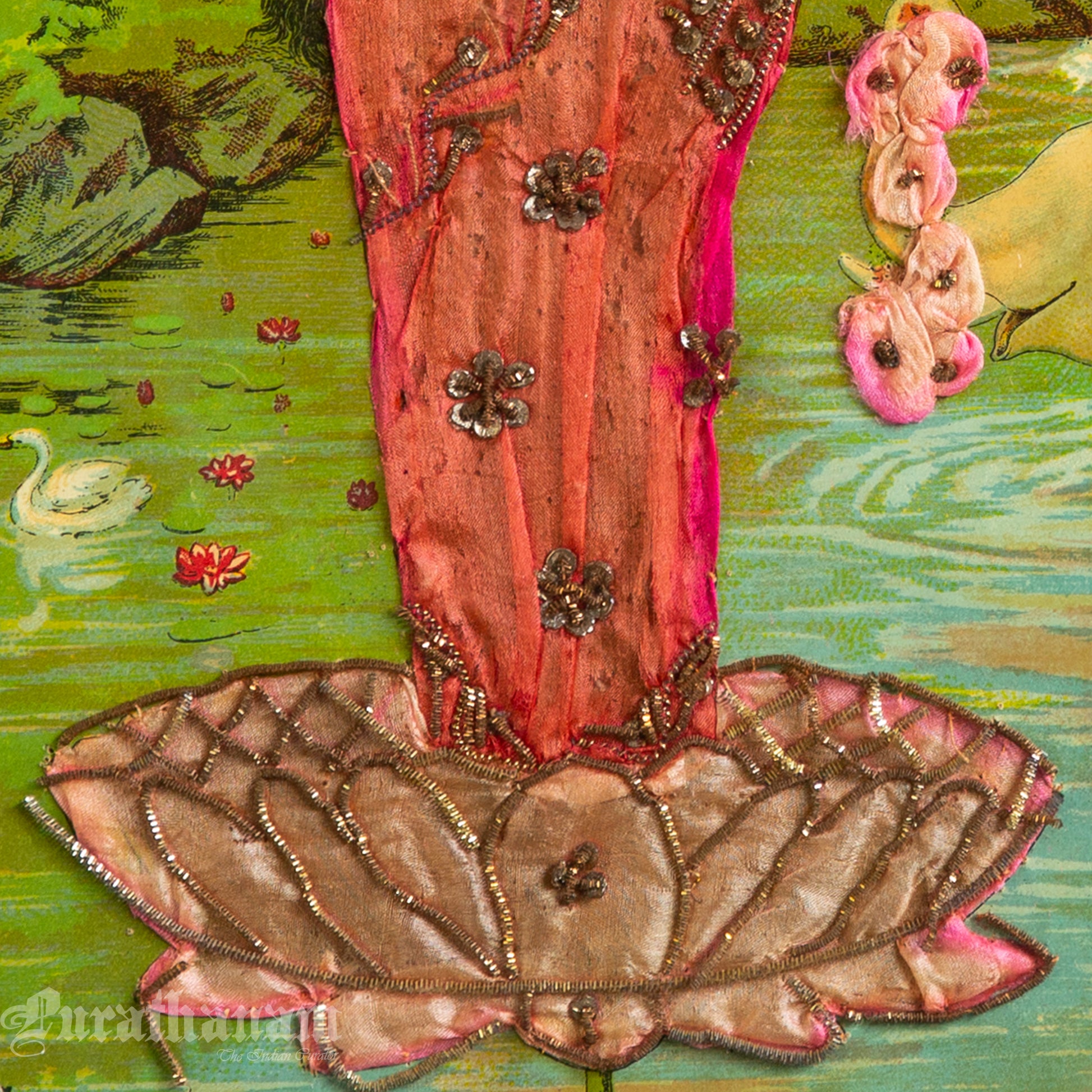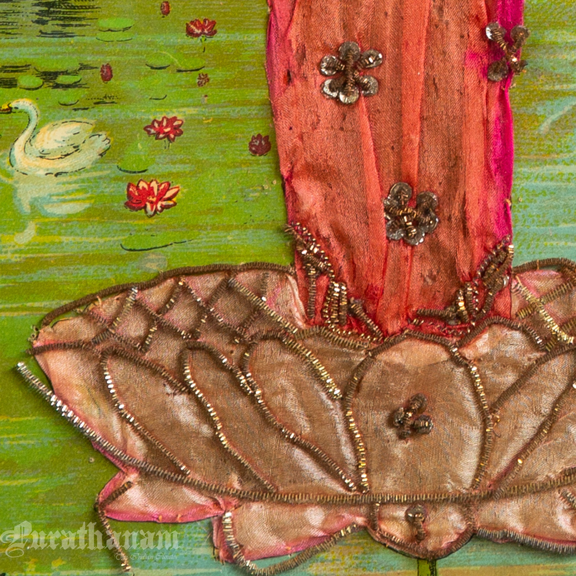 This is an embellished oleograph print from 1920s- 1930s of Lakshmi by Ravi Varma an Indian painter who achieved recognition for his depiction of scenes from the epics of the Mahabharata and Ramayana.
