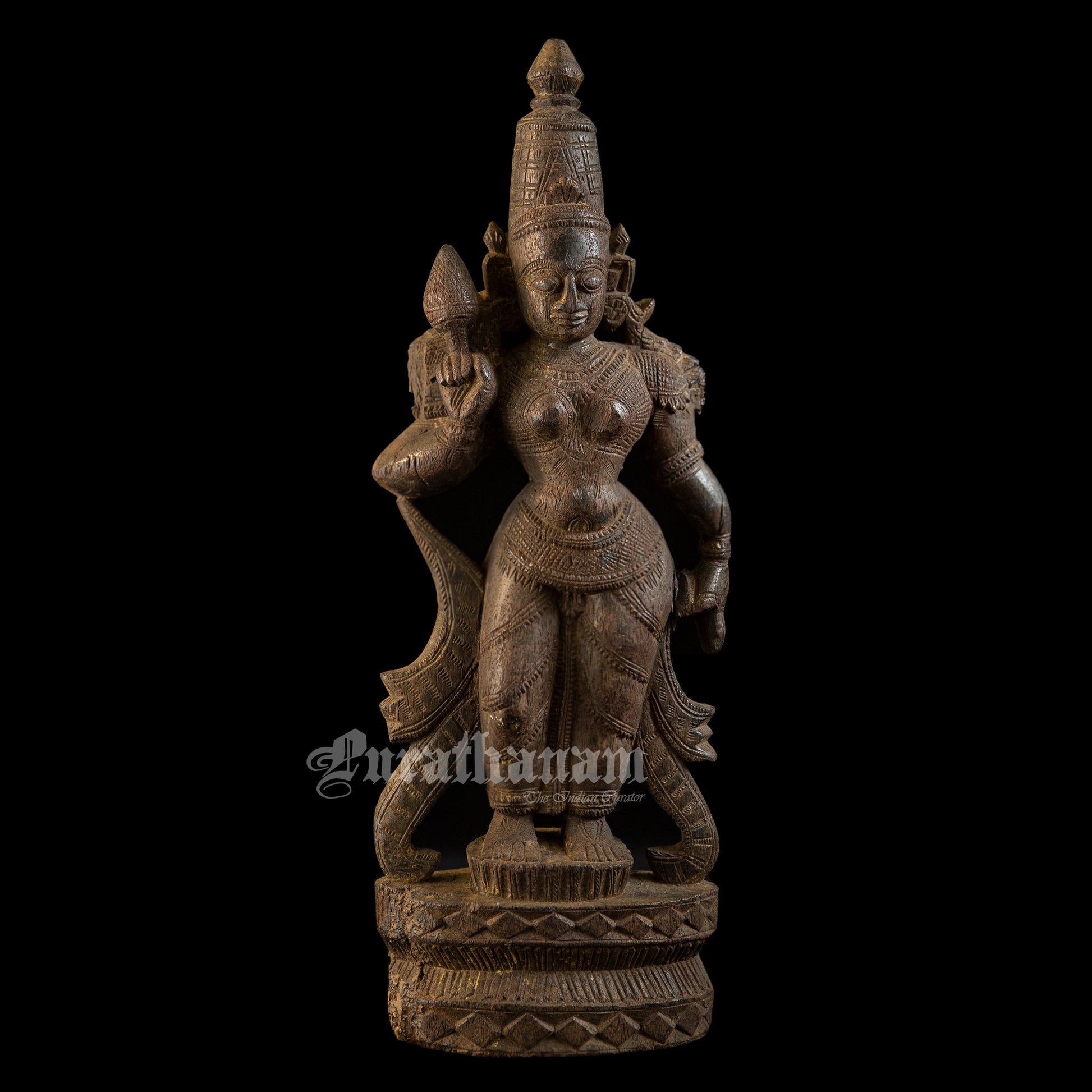 Introducing a meticulously handcrafted wooden sculpture depicting Lakshmi, elegantly carved from a single block of red sanders wood, showcasing exquisite craftsmanship.
