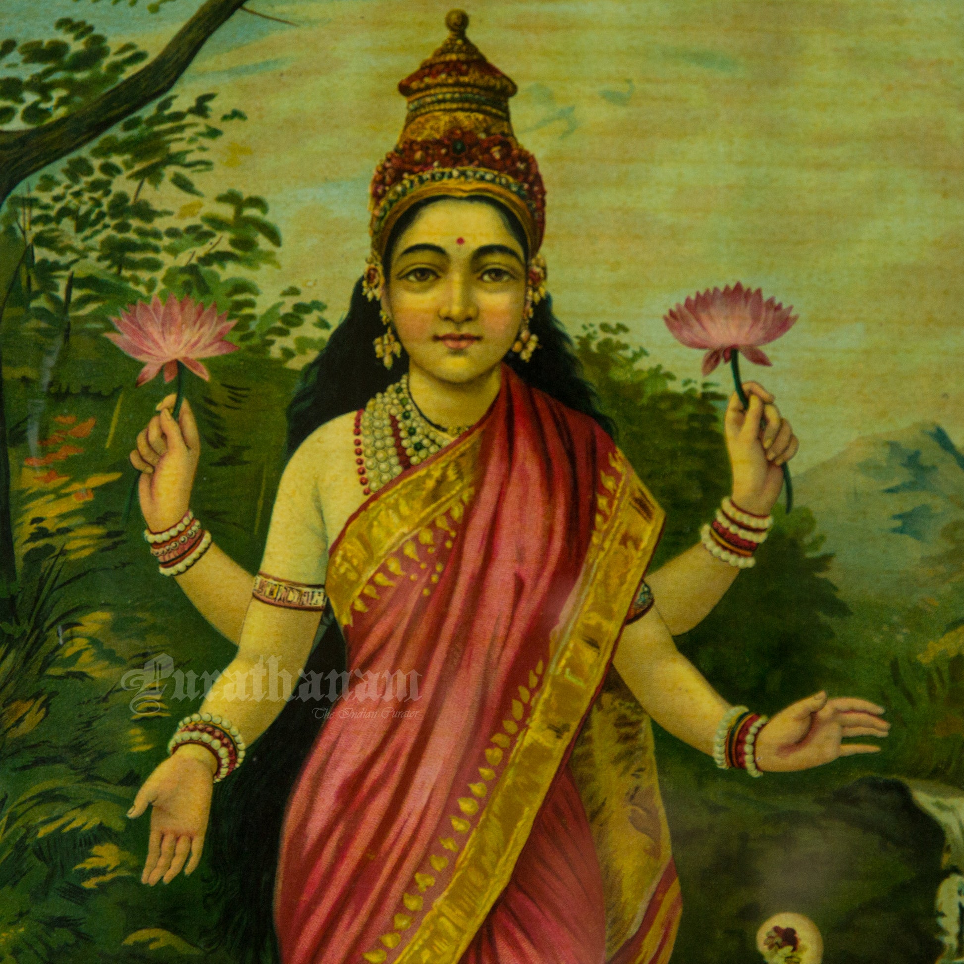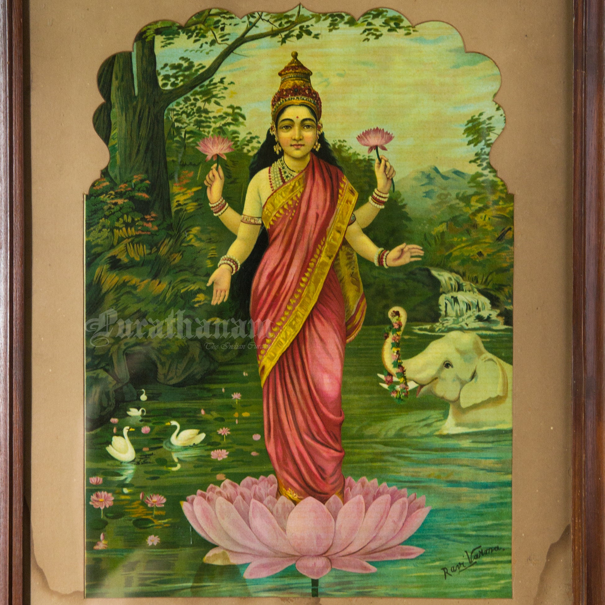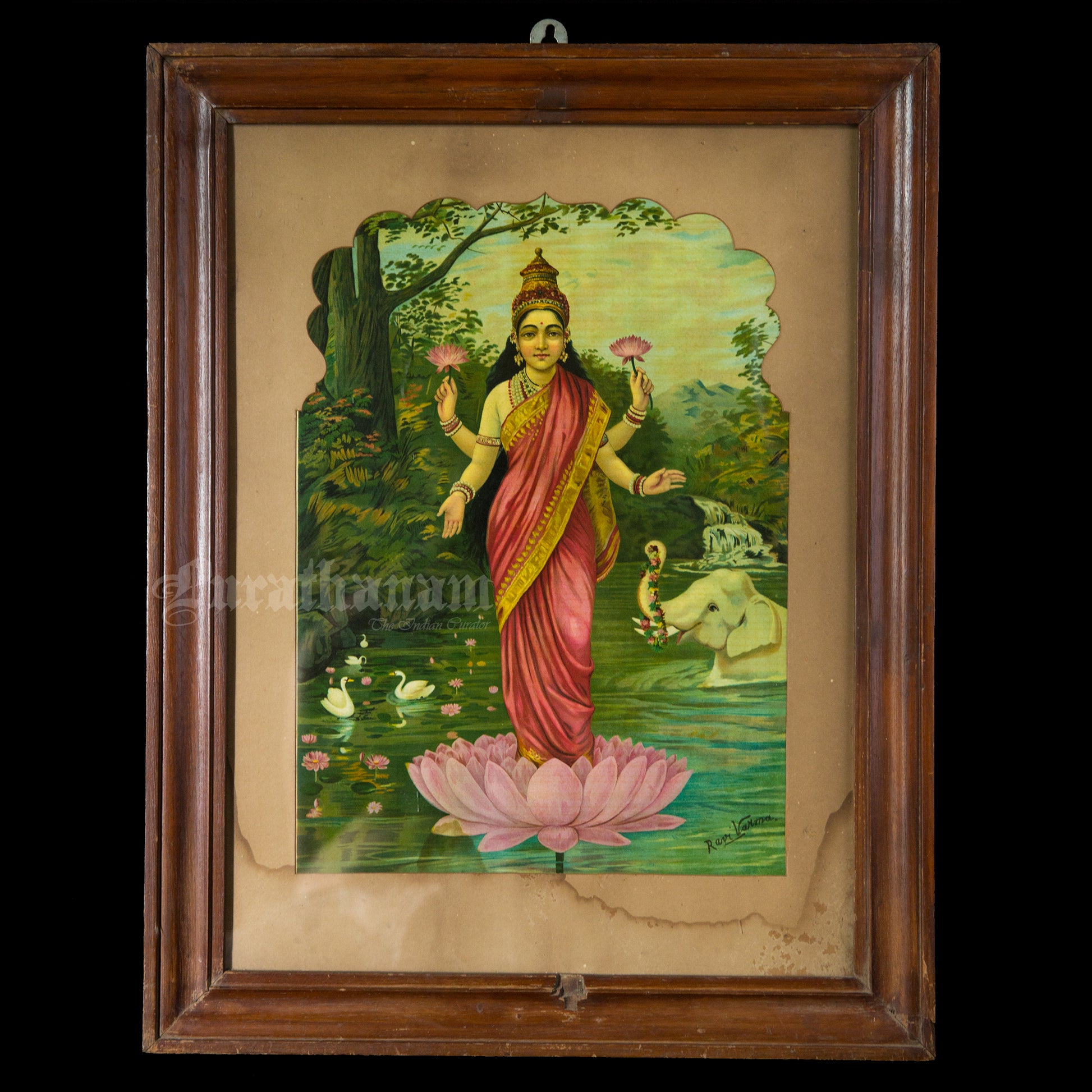 This is an oleograph print from 1920s - 1930s of Lakshmi by Ravi Varma an Indian who achieved recognition for his depiction of scenes from the epics of the Mahabharata and Ramayana.
