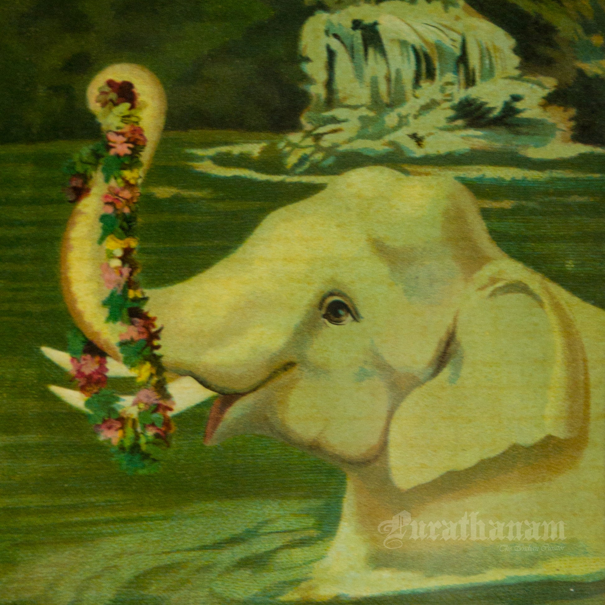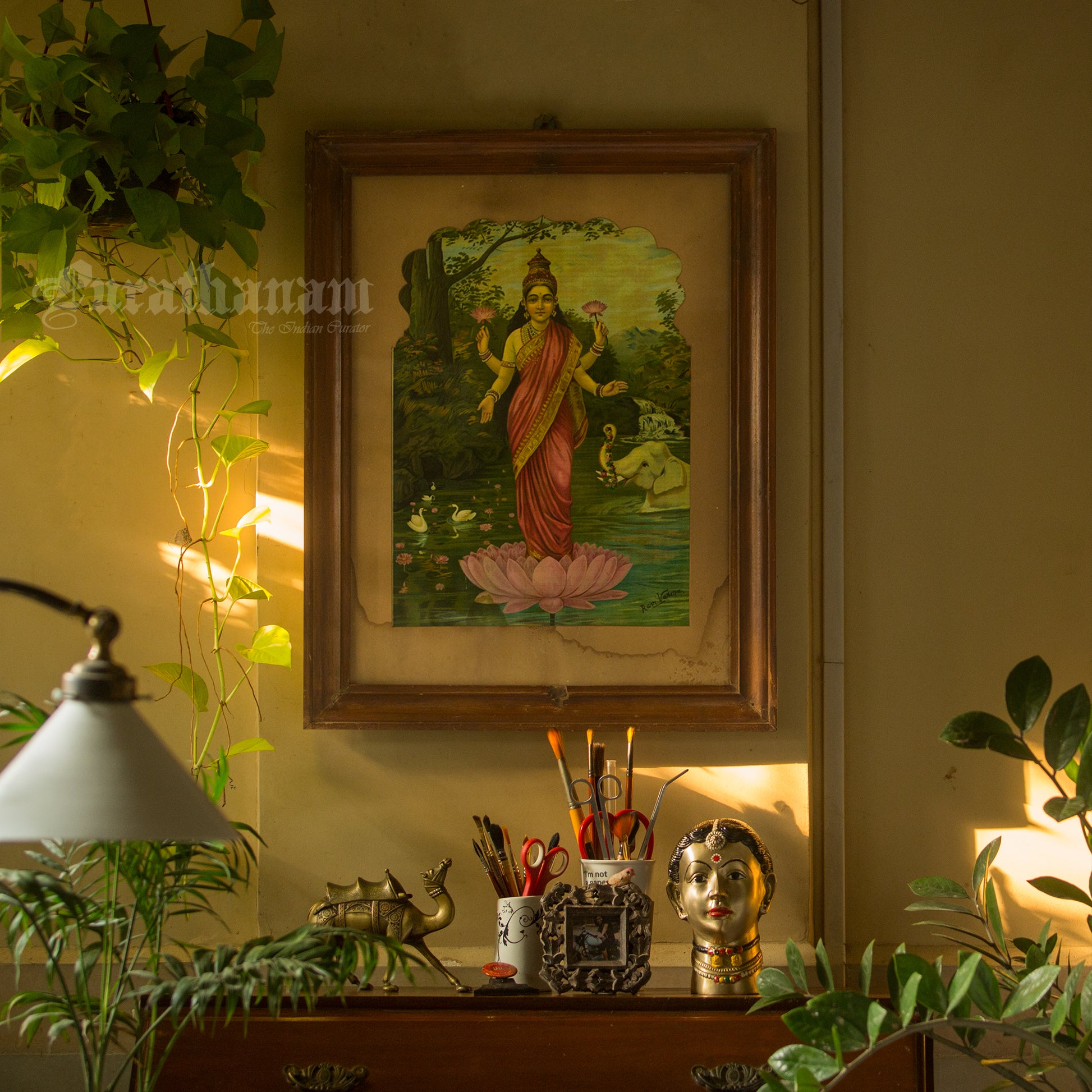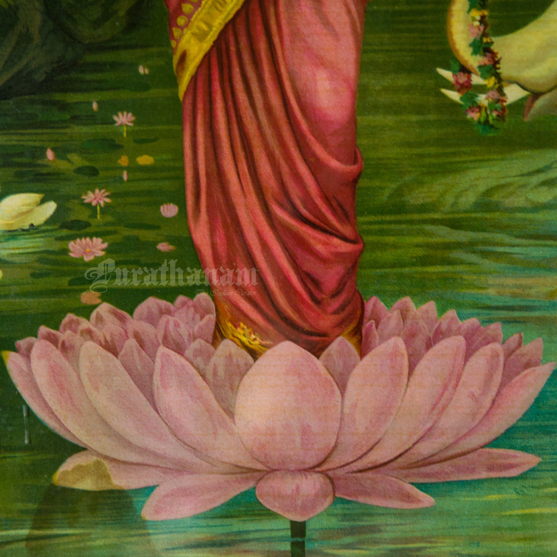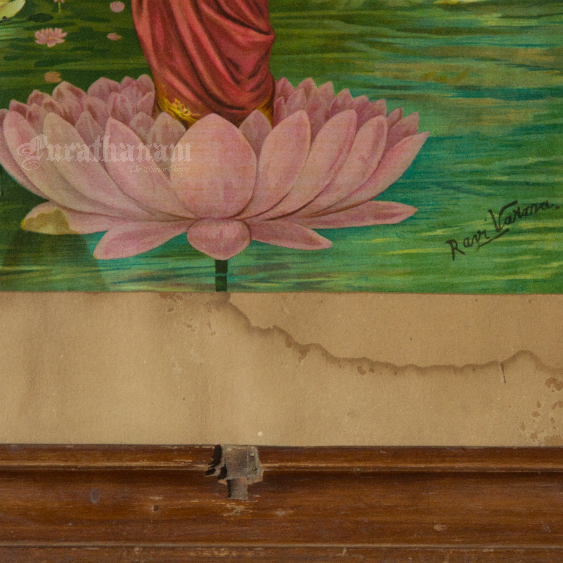 This is an oleograph print from 1920s - 1930s of Lakshmi by Ravi Varma an Indian who achieved recognition for his depiction of scenes from the epics of the Mahabharata and Ramayana.