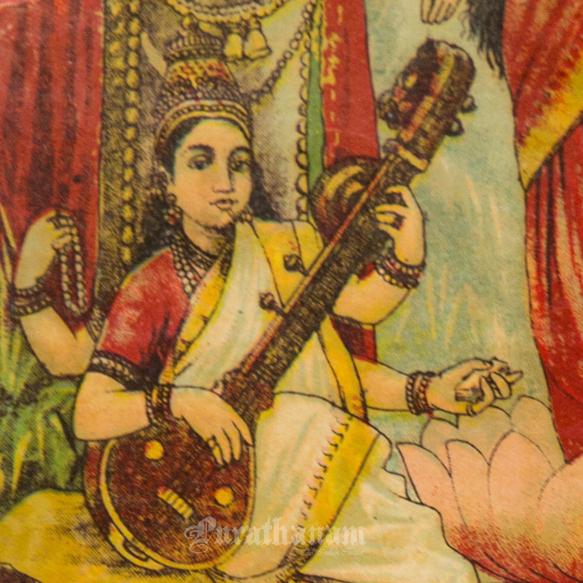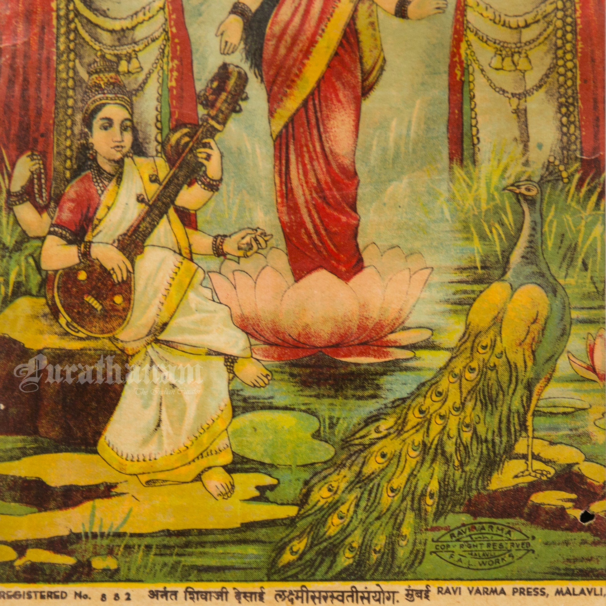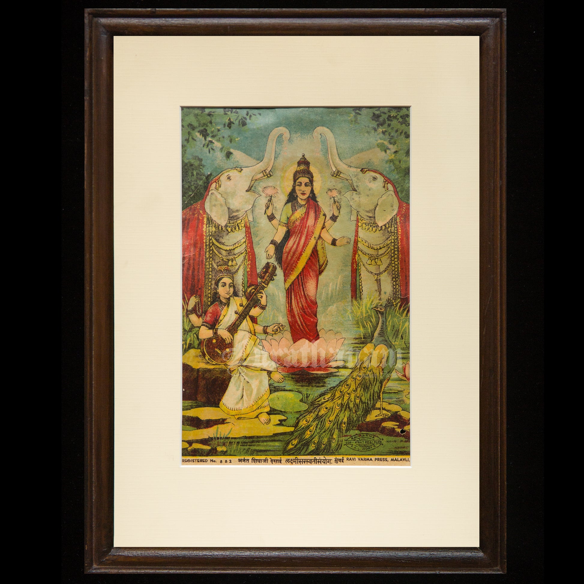 Introducing mini lithograph prints of size 10”x7” from 1920s - 1930s of Lakshmi Saraswati Sangyog by Ravi Varma an Indian who achieved recognition for his depiction of scenes from the epics of the Mahabharata and Ramayana.
