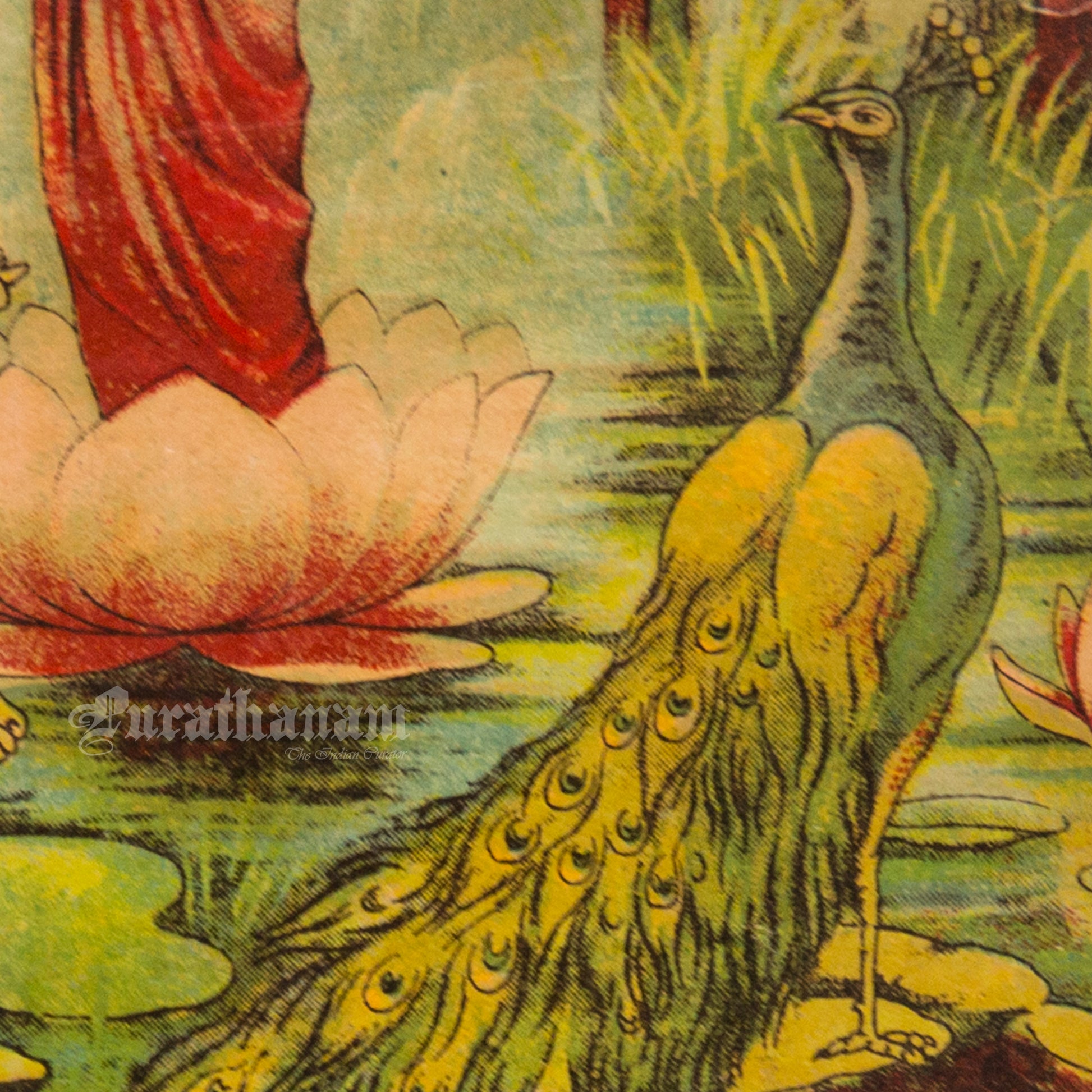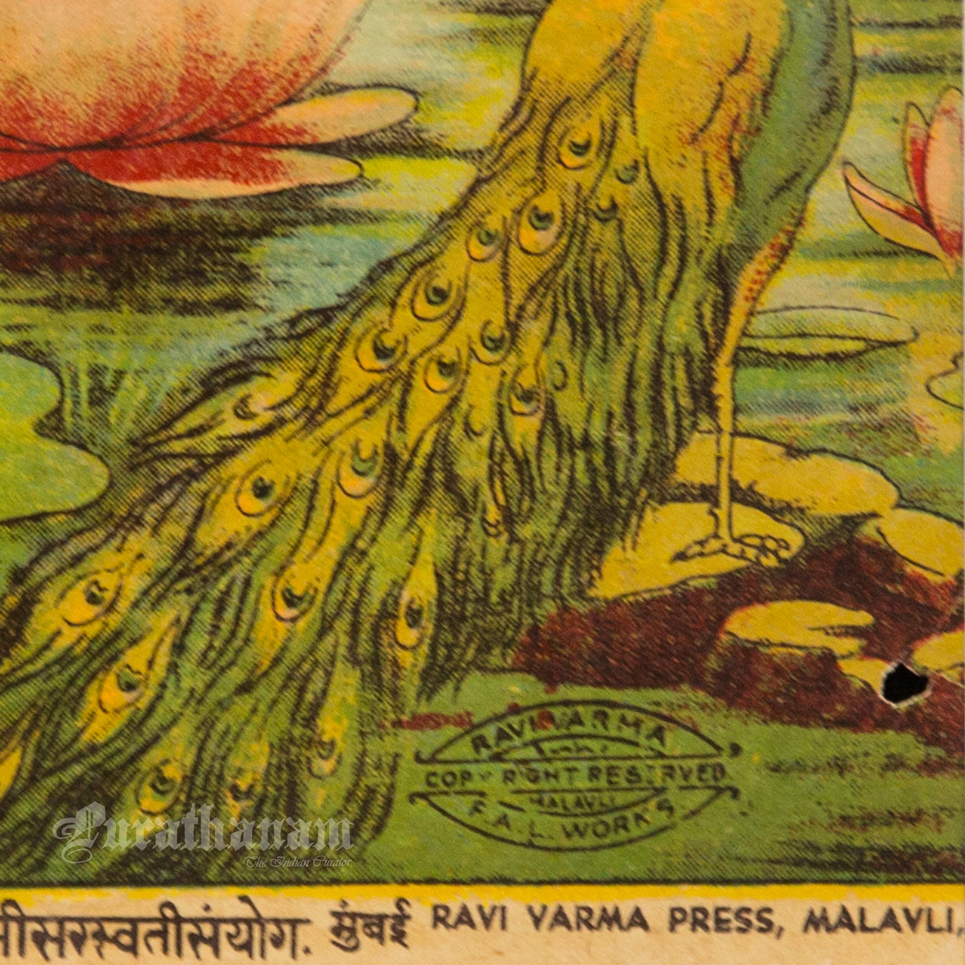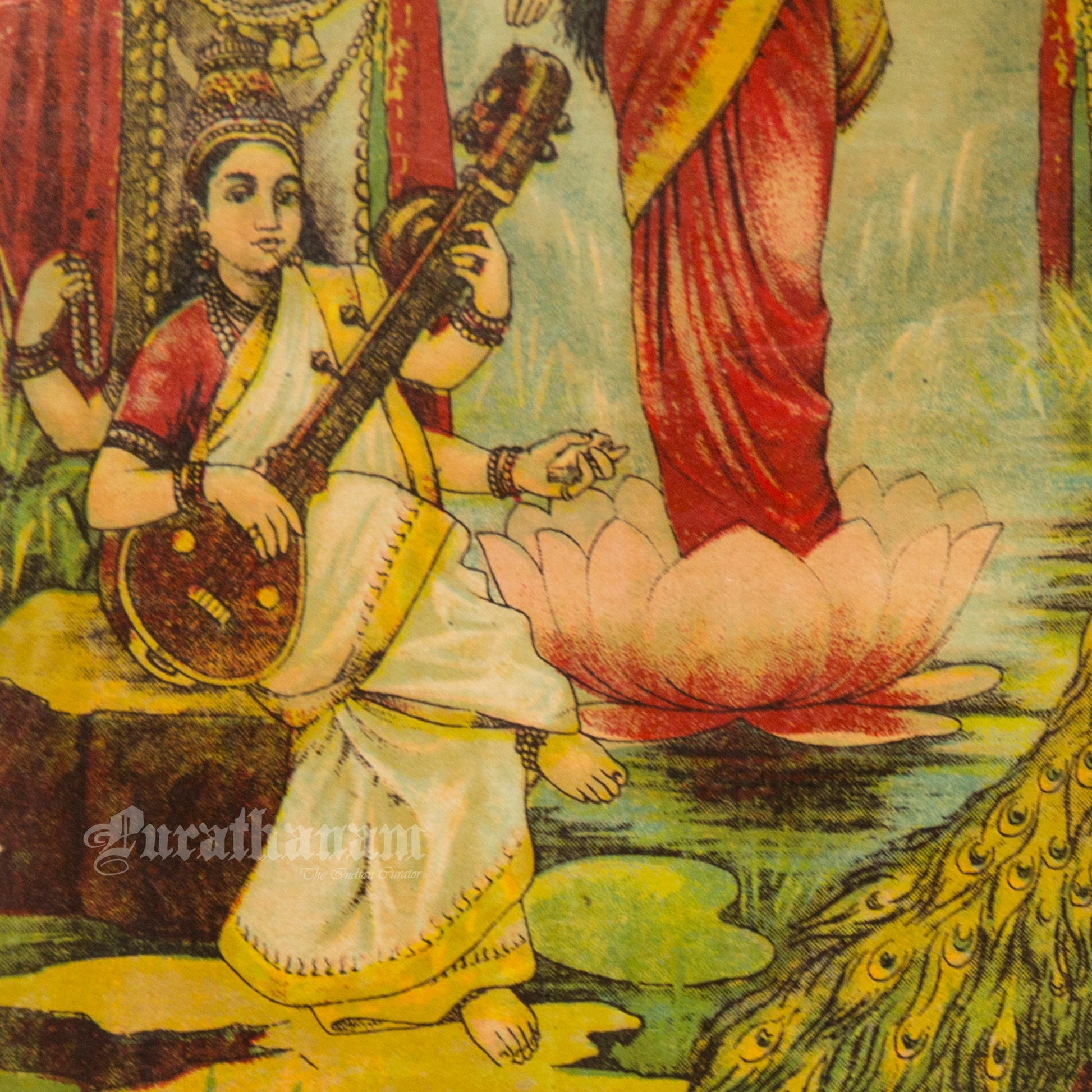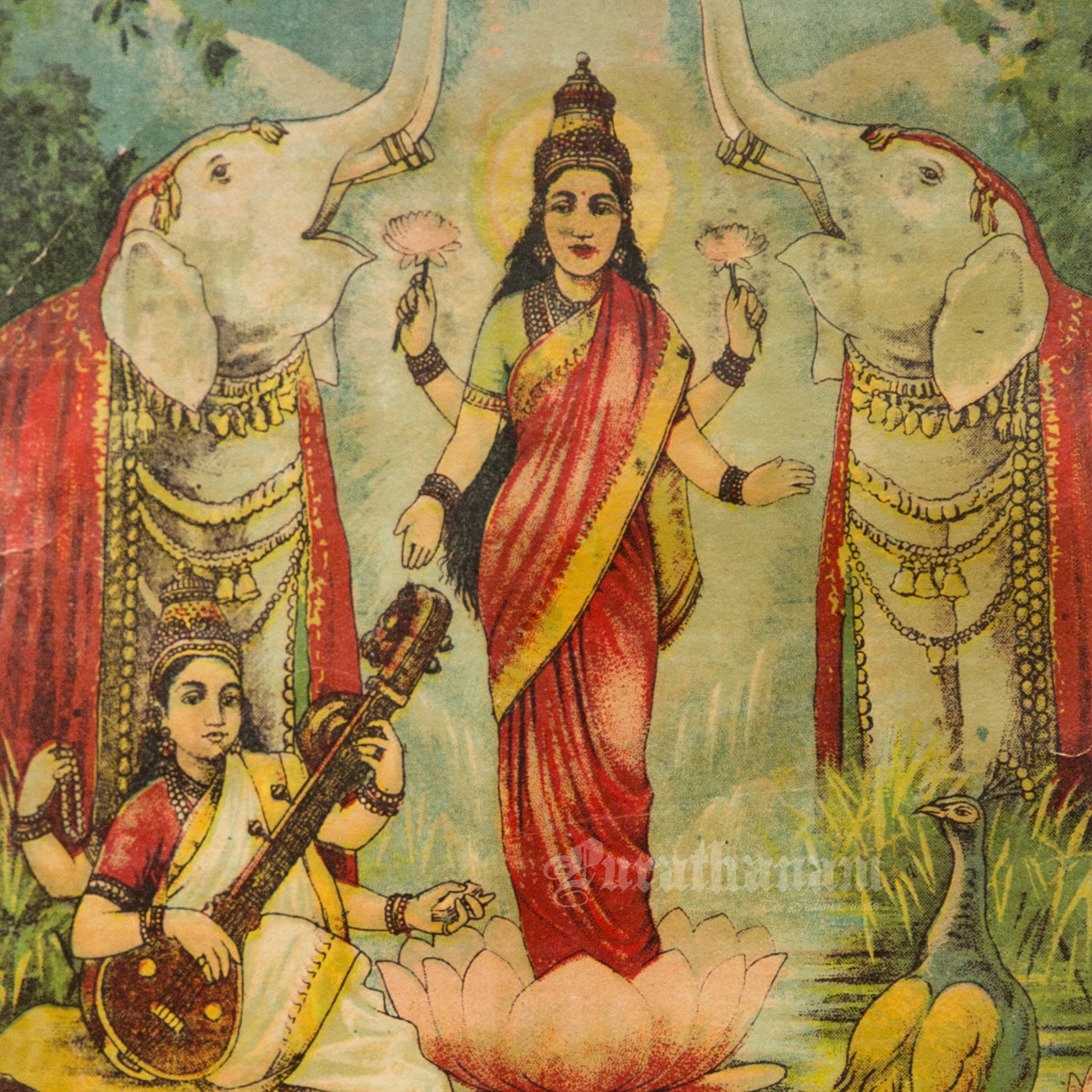 Introducing mini lithograph prints of size 10”x7” from 1920s - 1930s of Lakshmi Saraswati Sangyog by Ravi Varma an Indian who achieved recognition for his depiction of scenes from the epics of the Mahabharata and Ramayana.