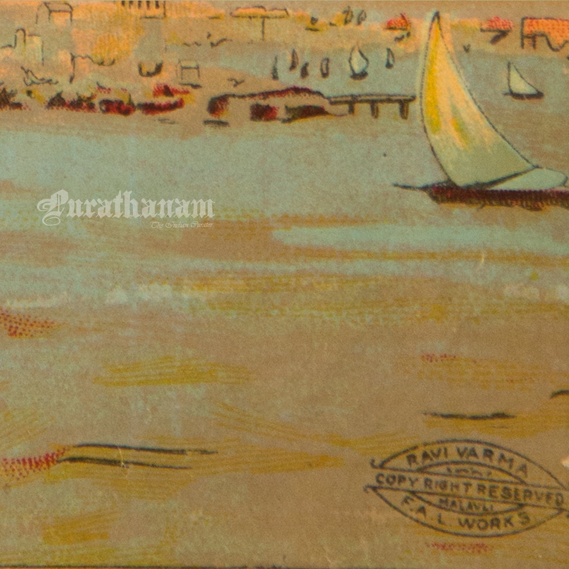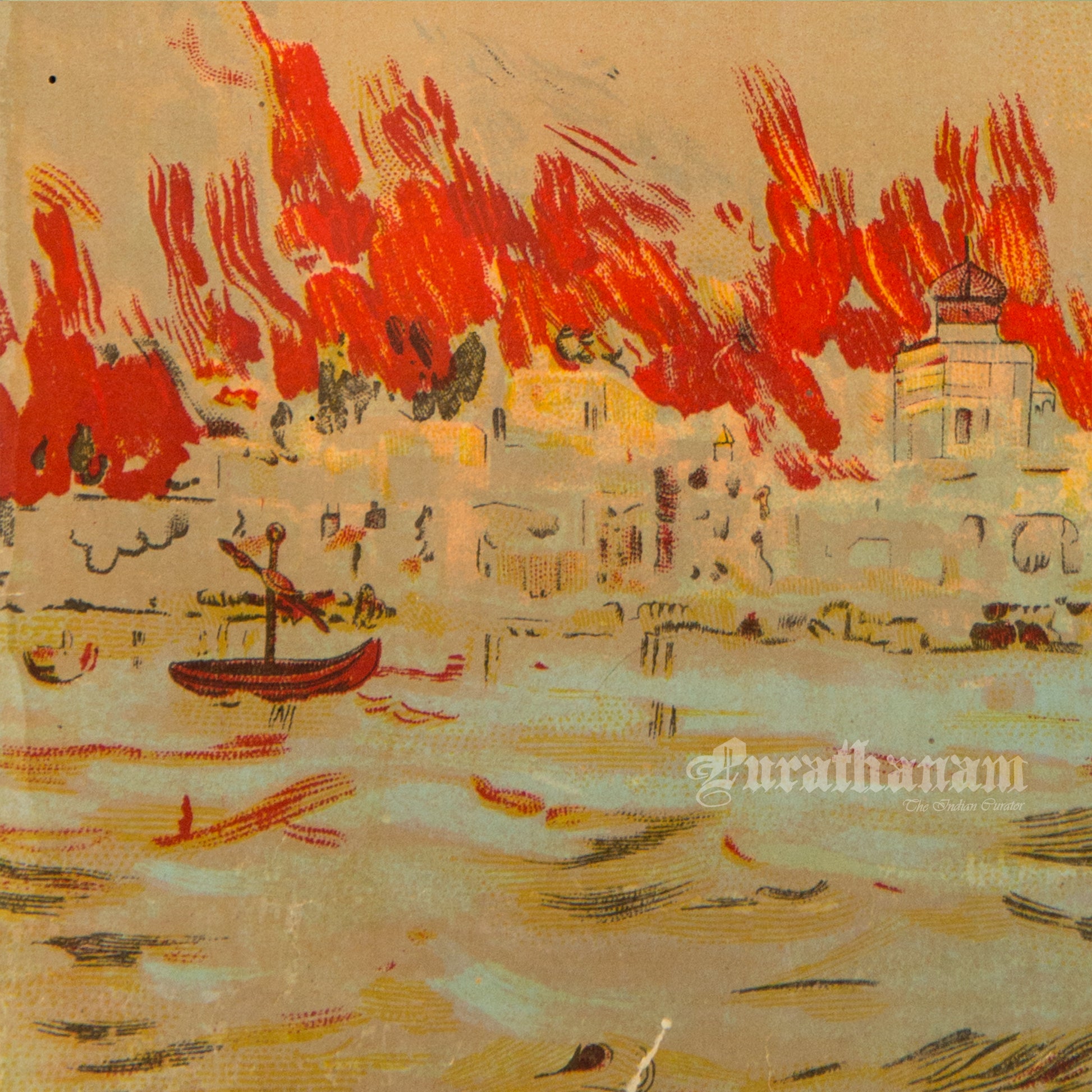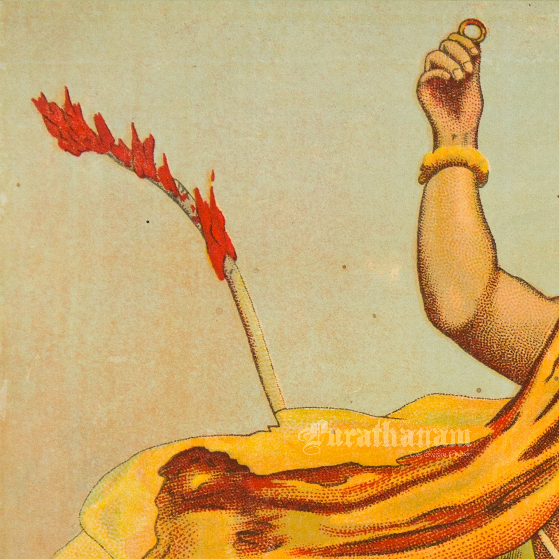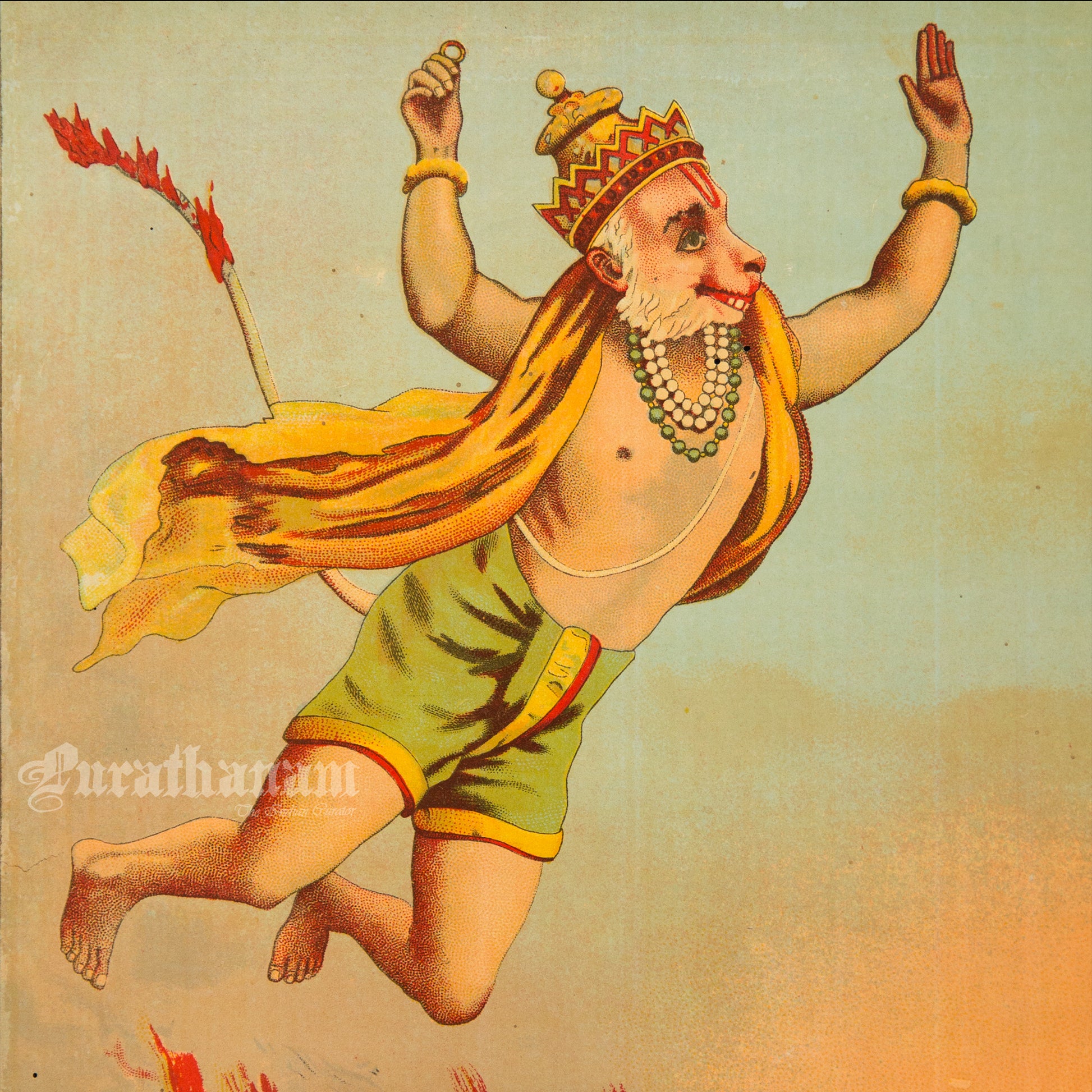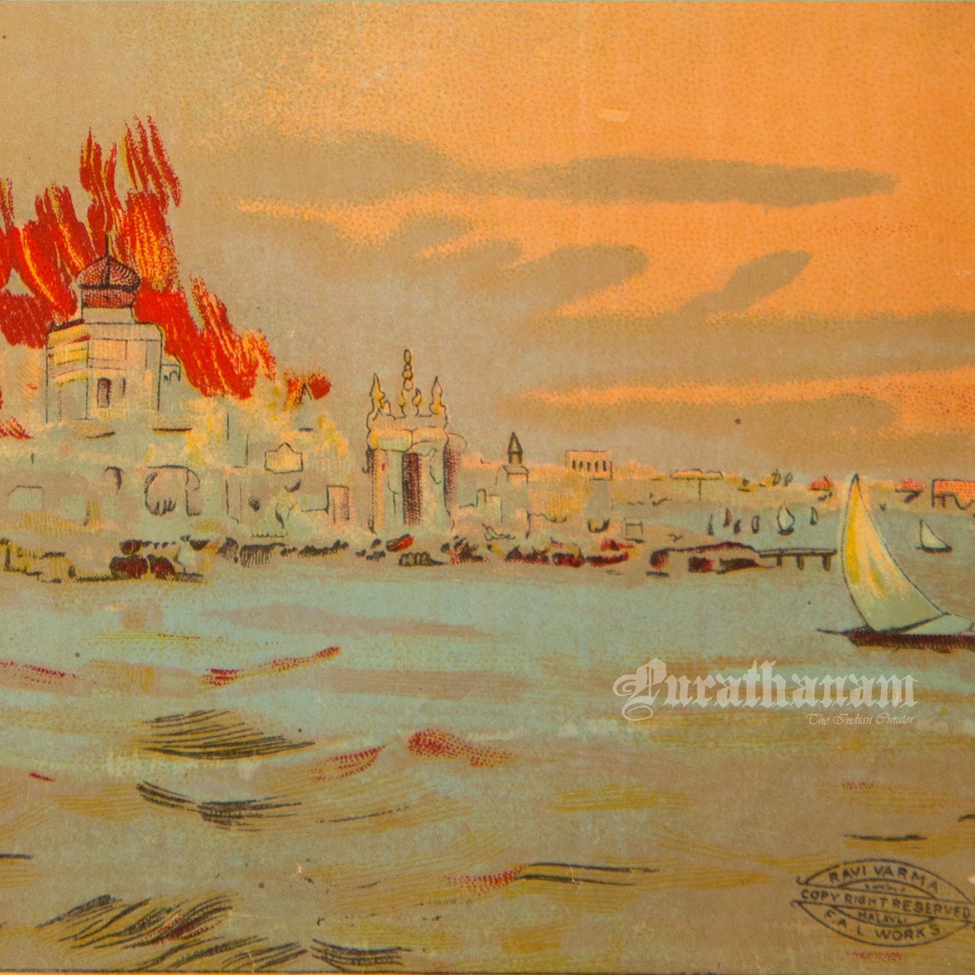 This is an oleograph print from 1920s- 1930s of Lankadahan Hanuman by Ravi Varma by Ravi Varma an Indian painter who achieved recognition for his depiction of scenes from the epics of the Mahabharata and Ramayana.