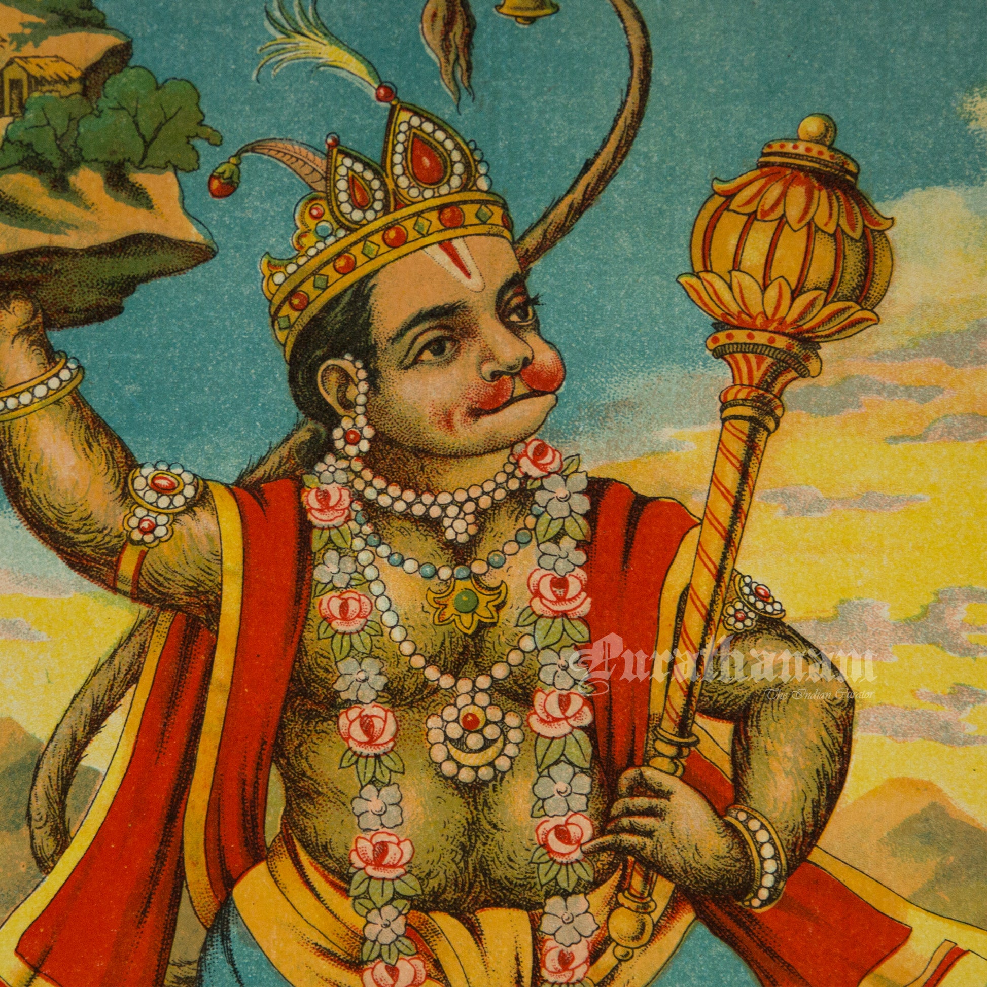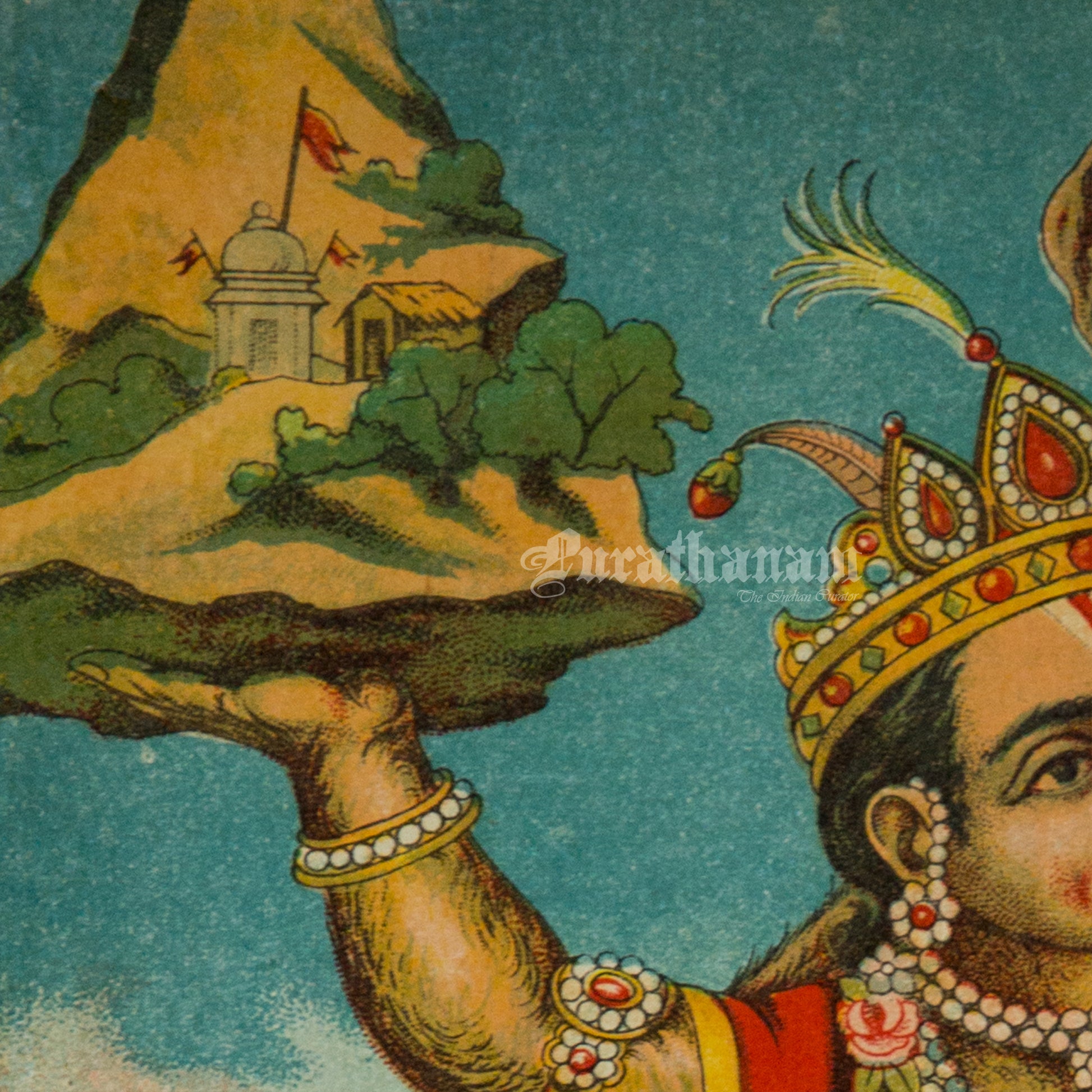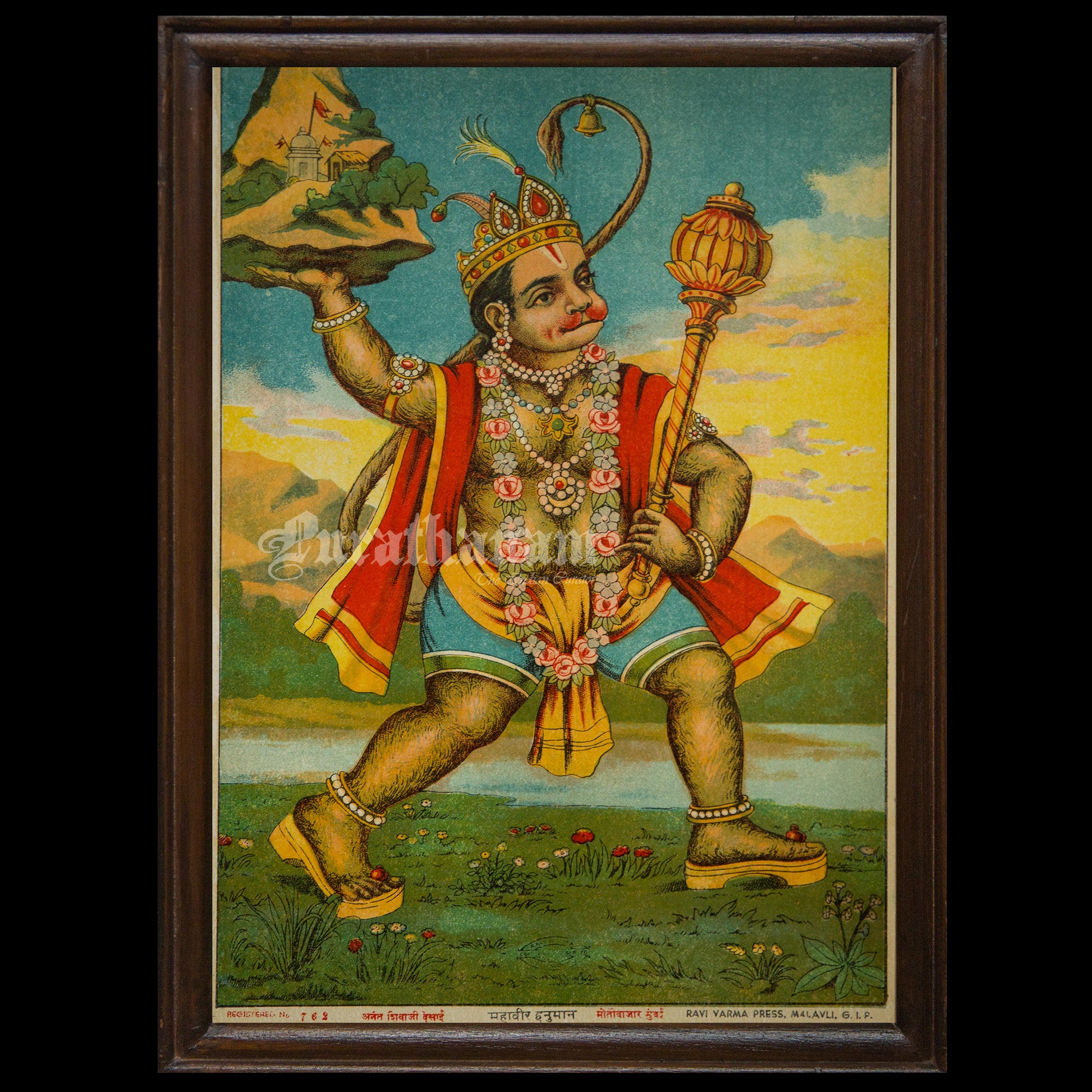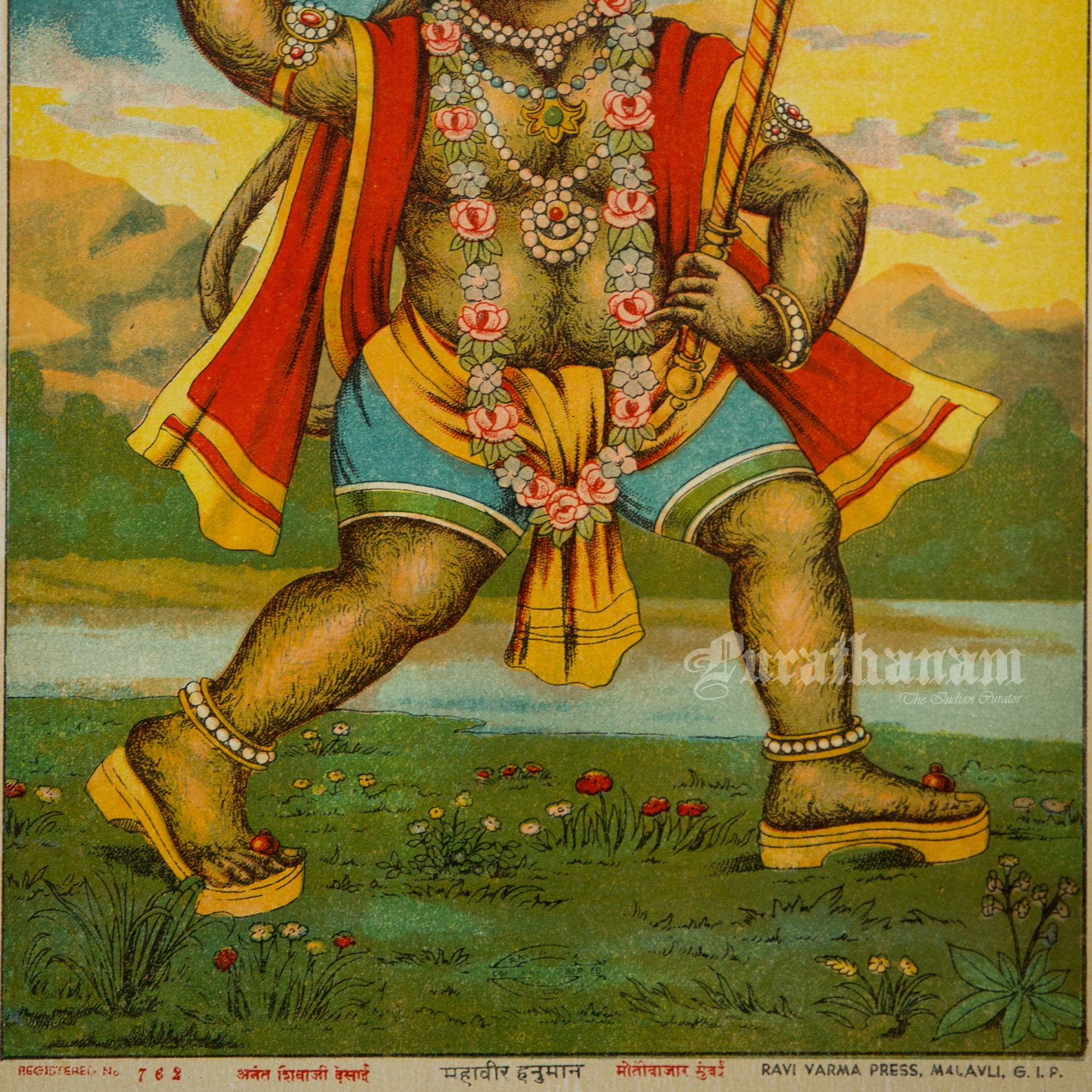 This is an oleograph print from 1920s - 1930s of Mahavir Hanuman by Ravi Varma an Indian who achieved recognition for his depiction of scenes from the epics of the Mahabharata and Ramayana.