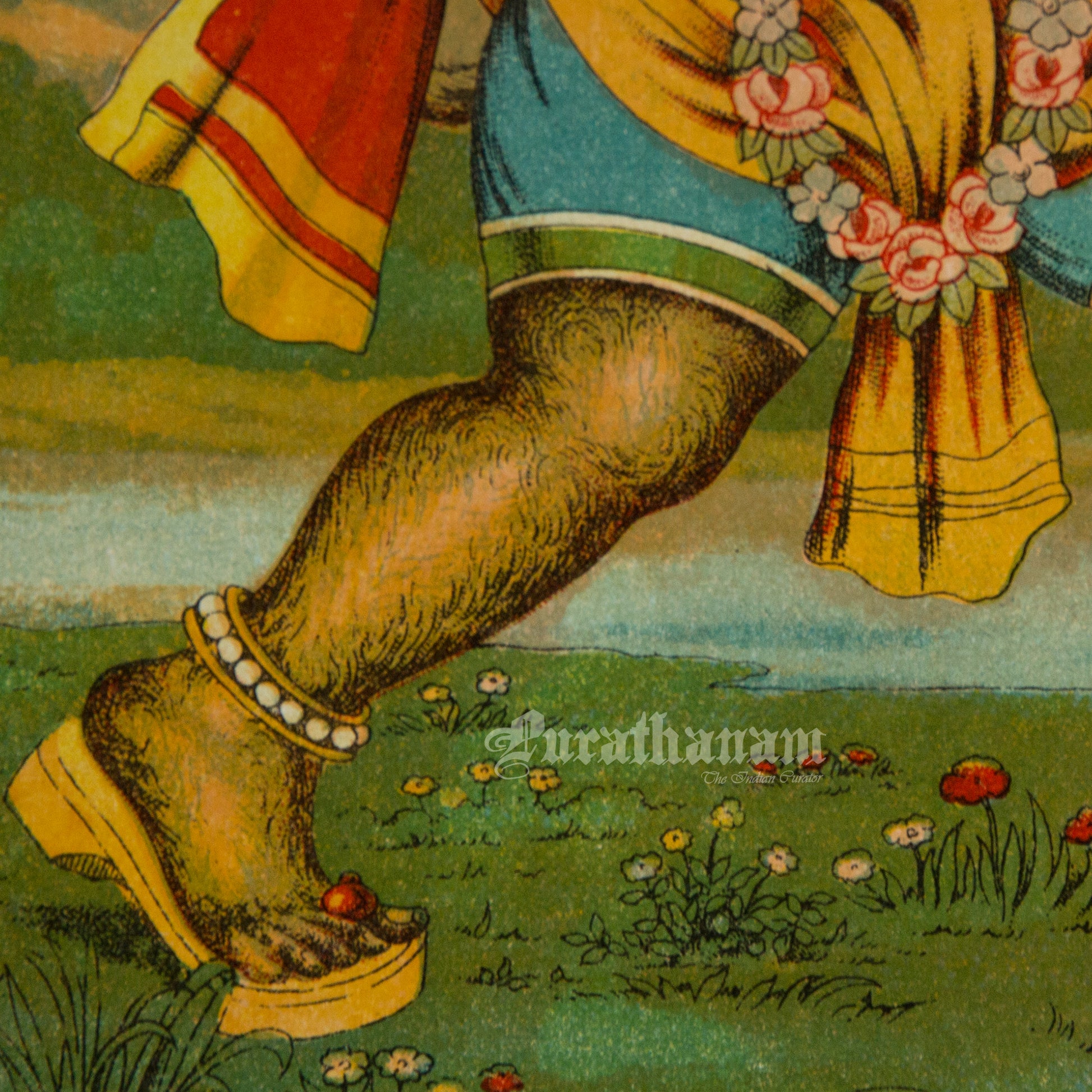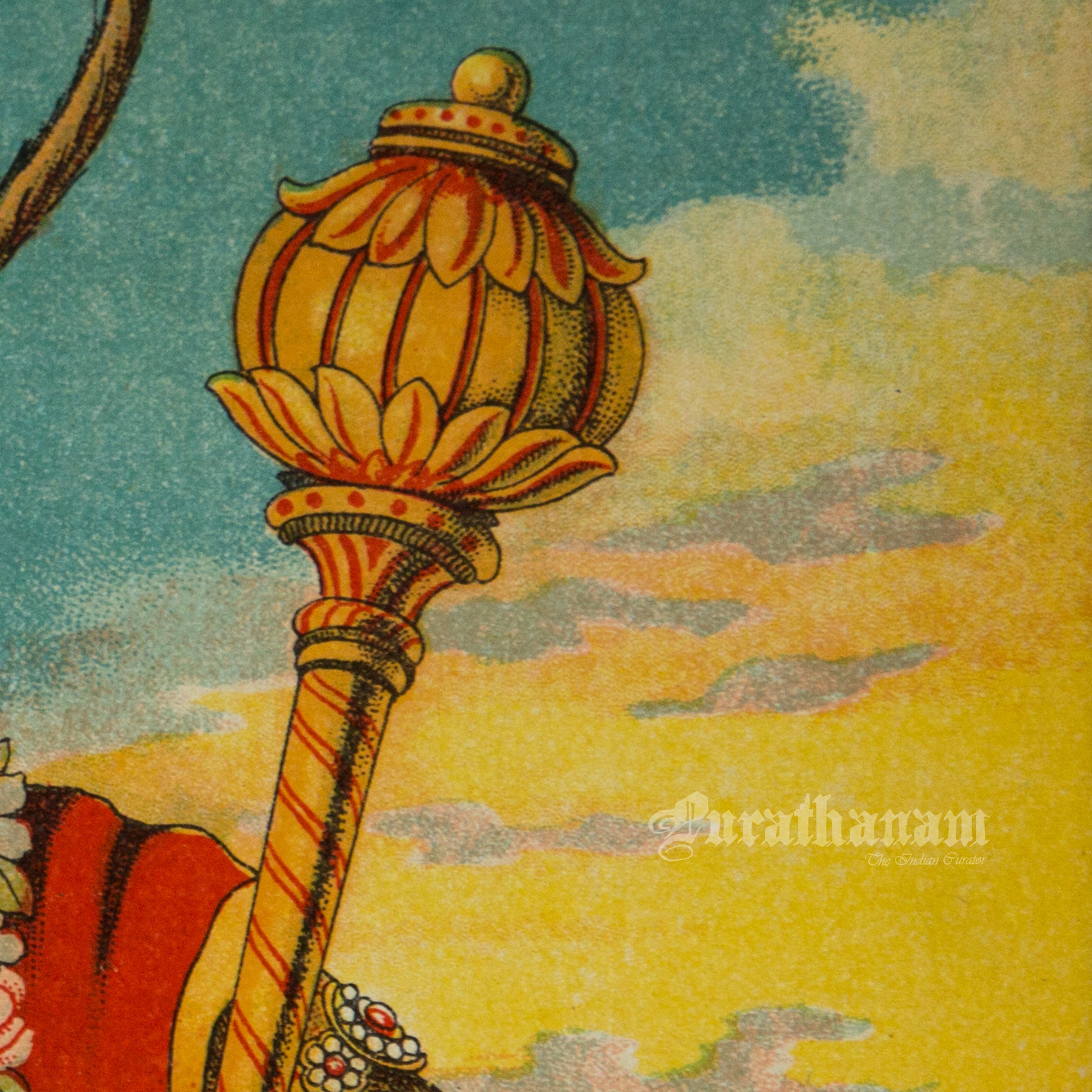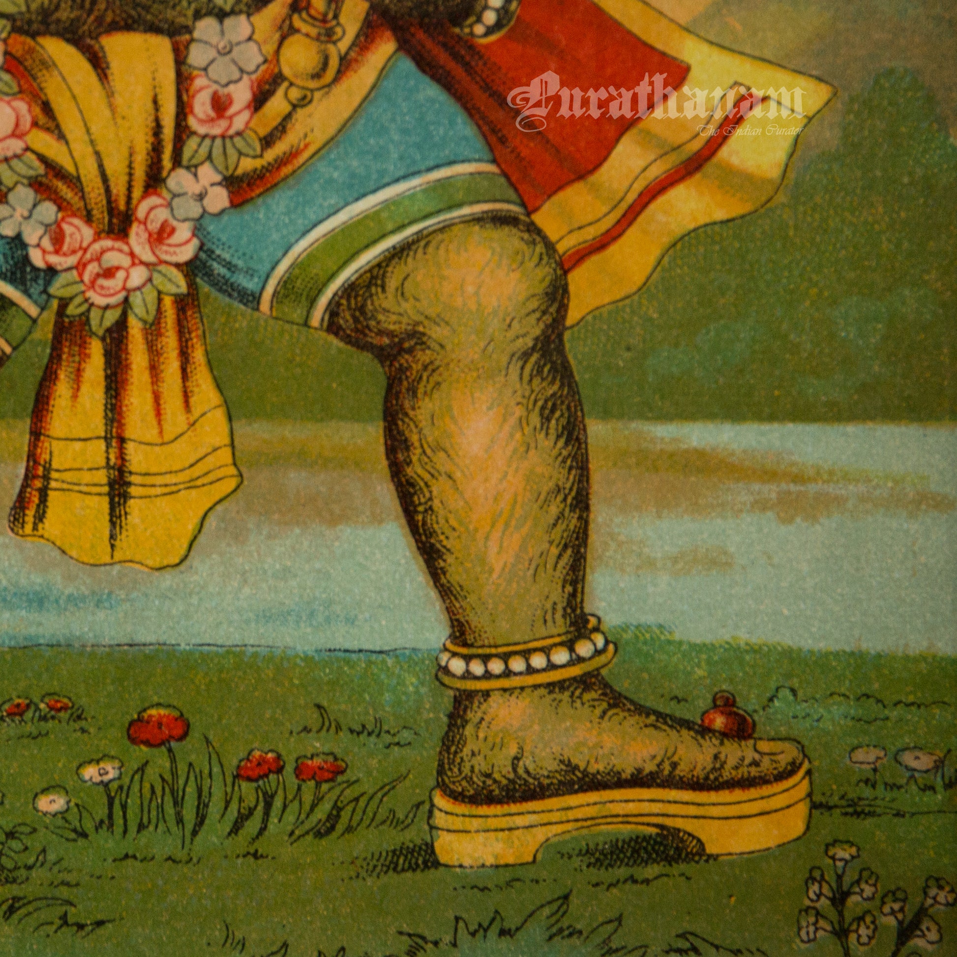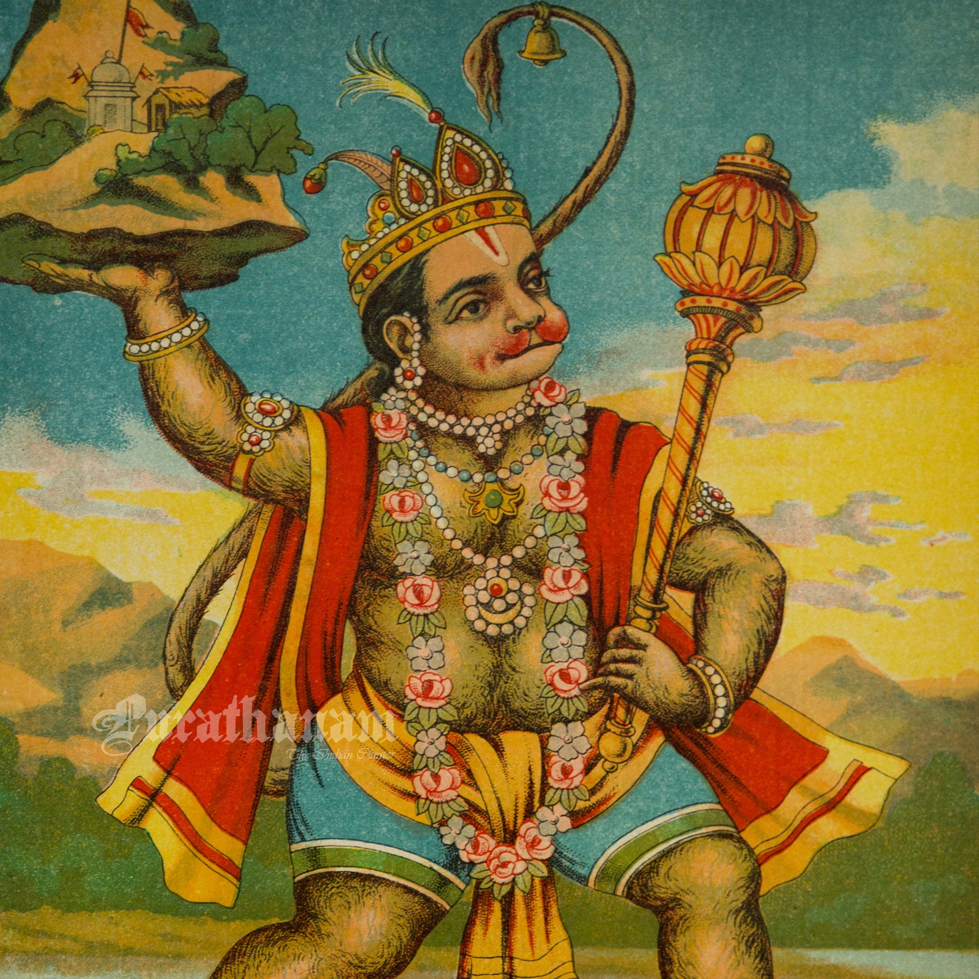 This is an oleograph print from 1920s - 1930s of Mahavir Hanuman by Ravi Varma an Indian who achieved recognition for his depiction of scenes from the epics of the Mahabharata and Ramayana.