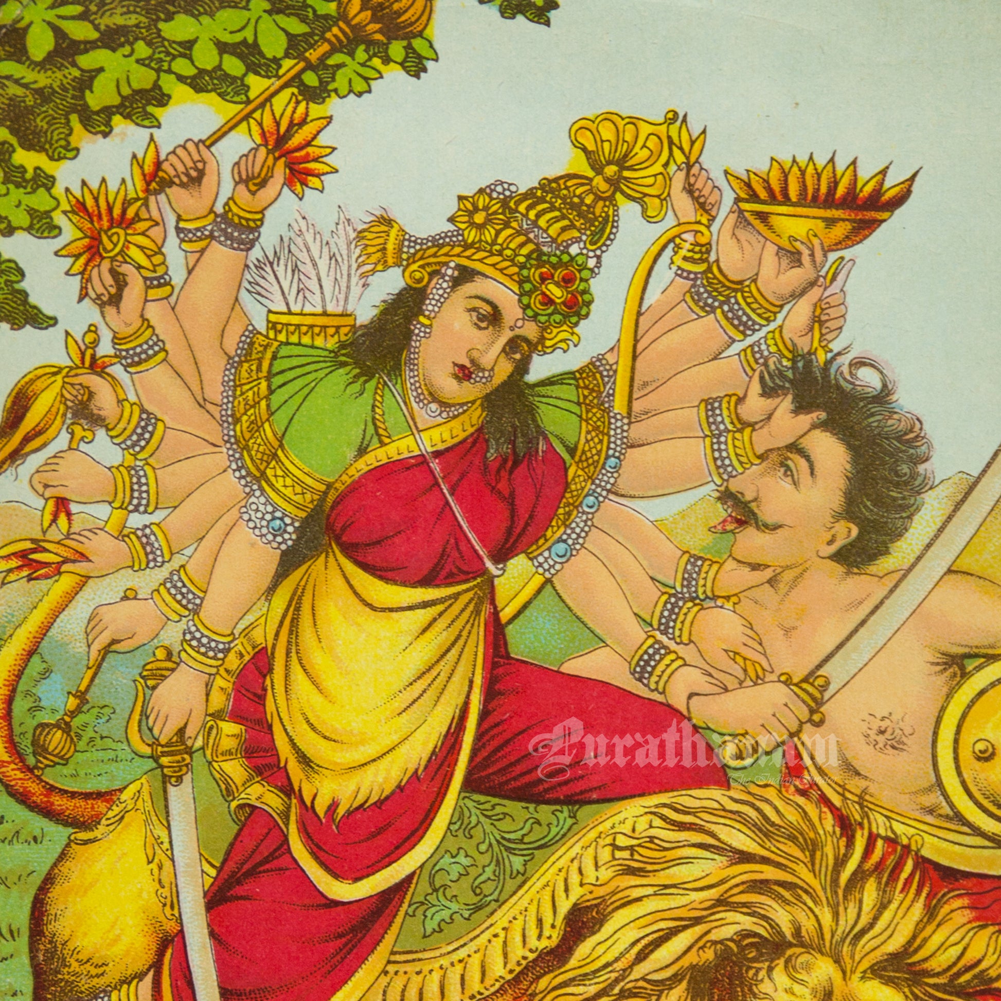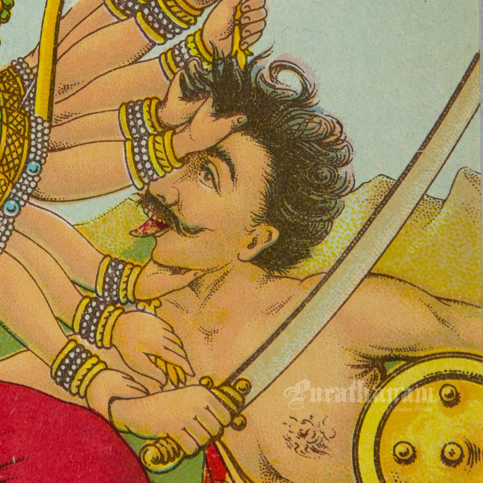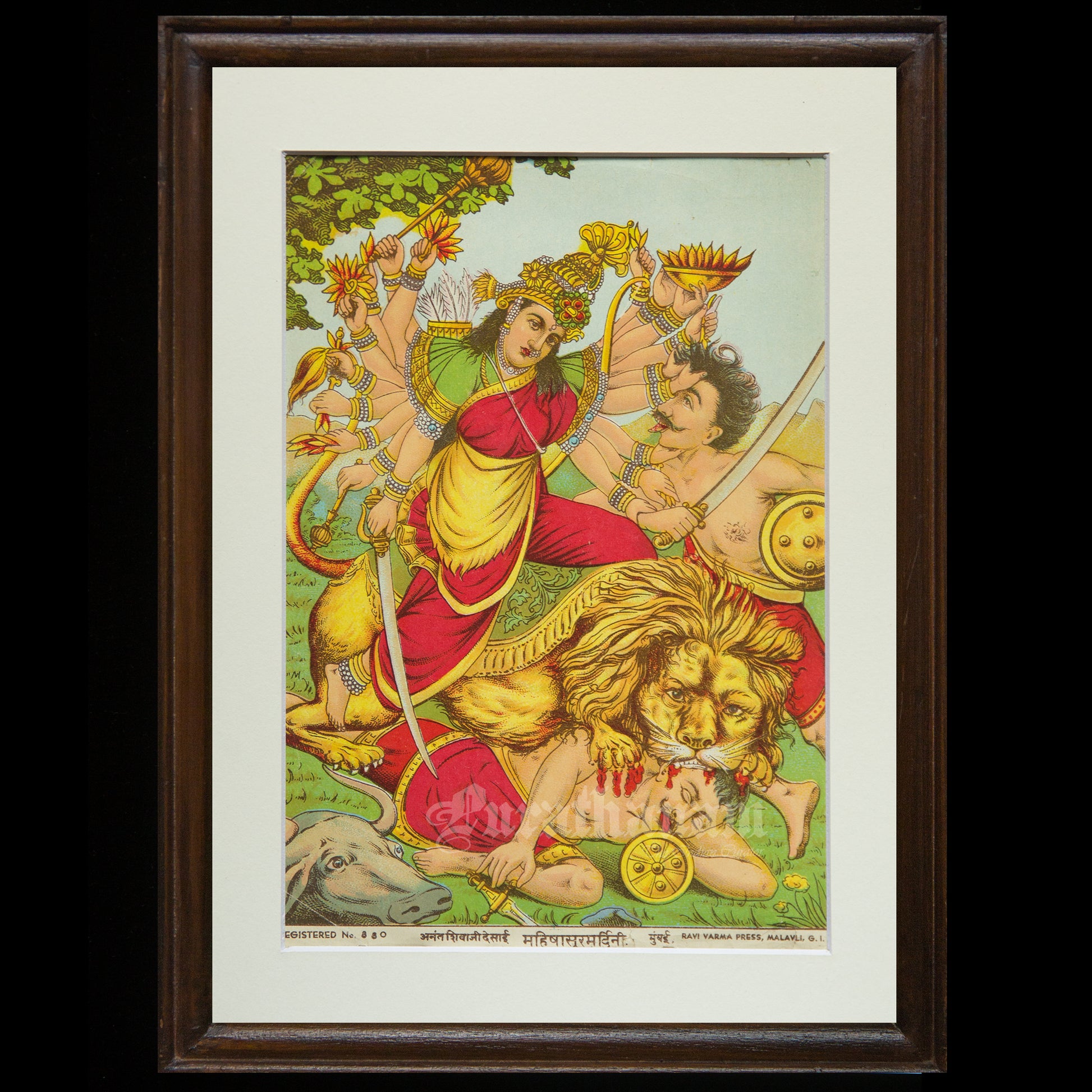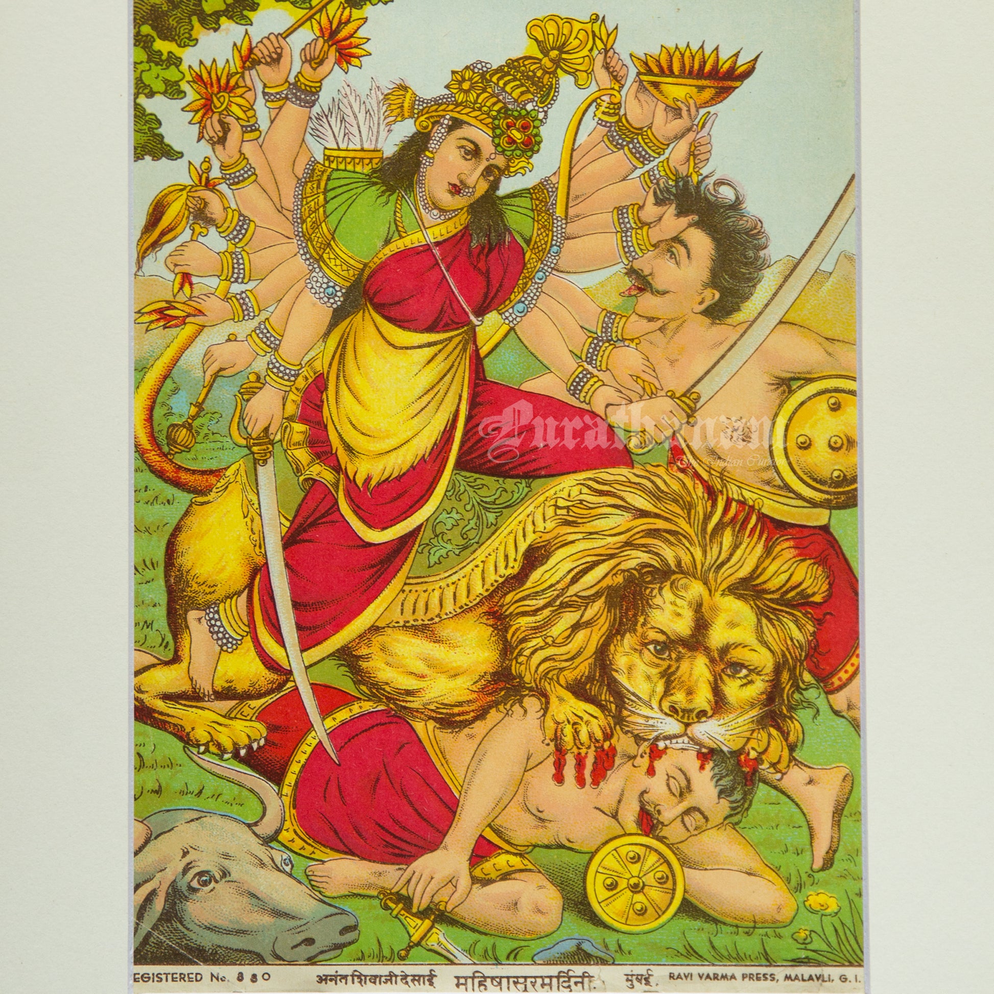 Introducing mini lithograph prints of size 10”x7” from 1920s - 1930s of Mahishasura Mardini by Ravi Varma an Indian who achieved recognition for his depiction of scenes from the epics of the Mahabharata and Ramayana.