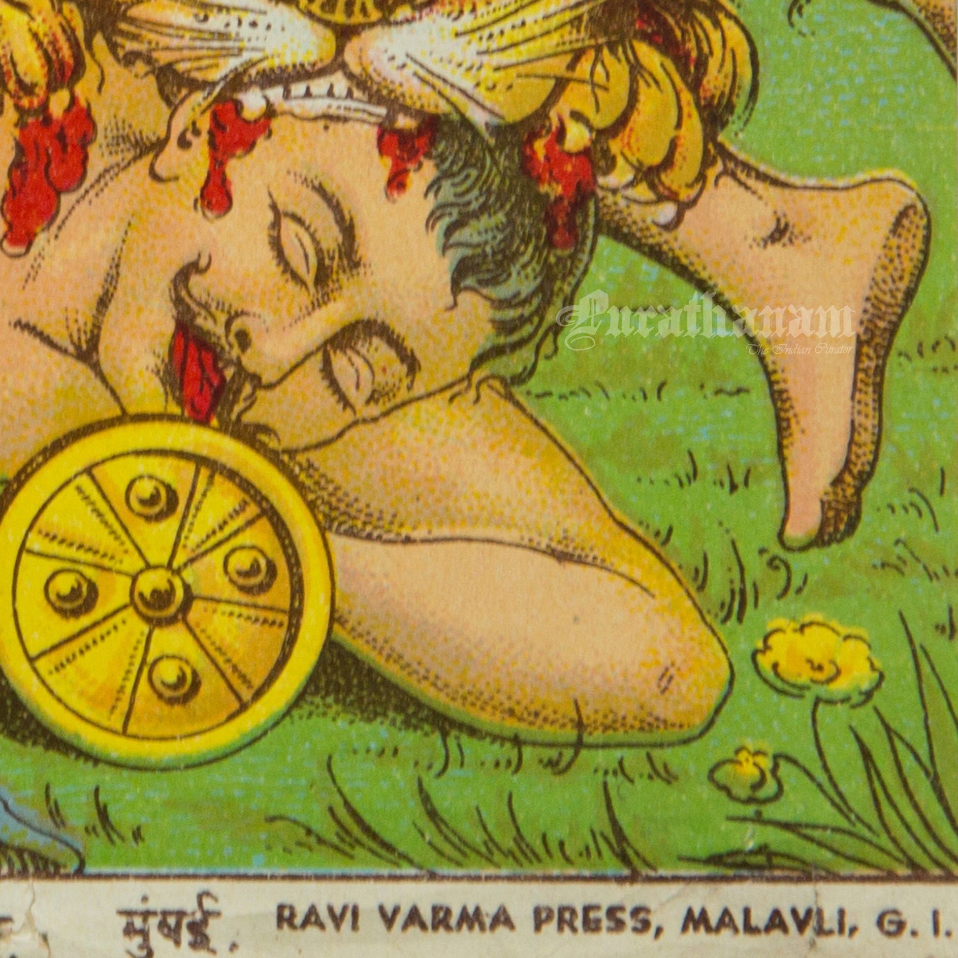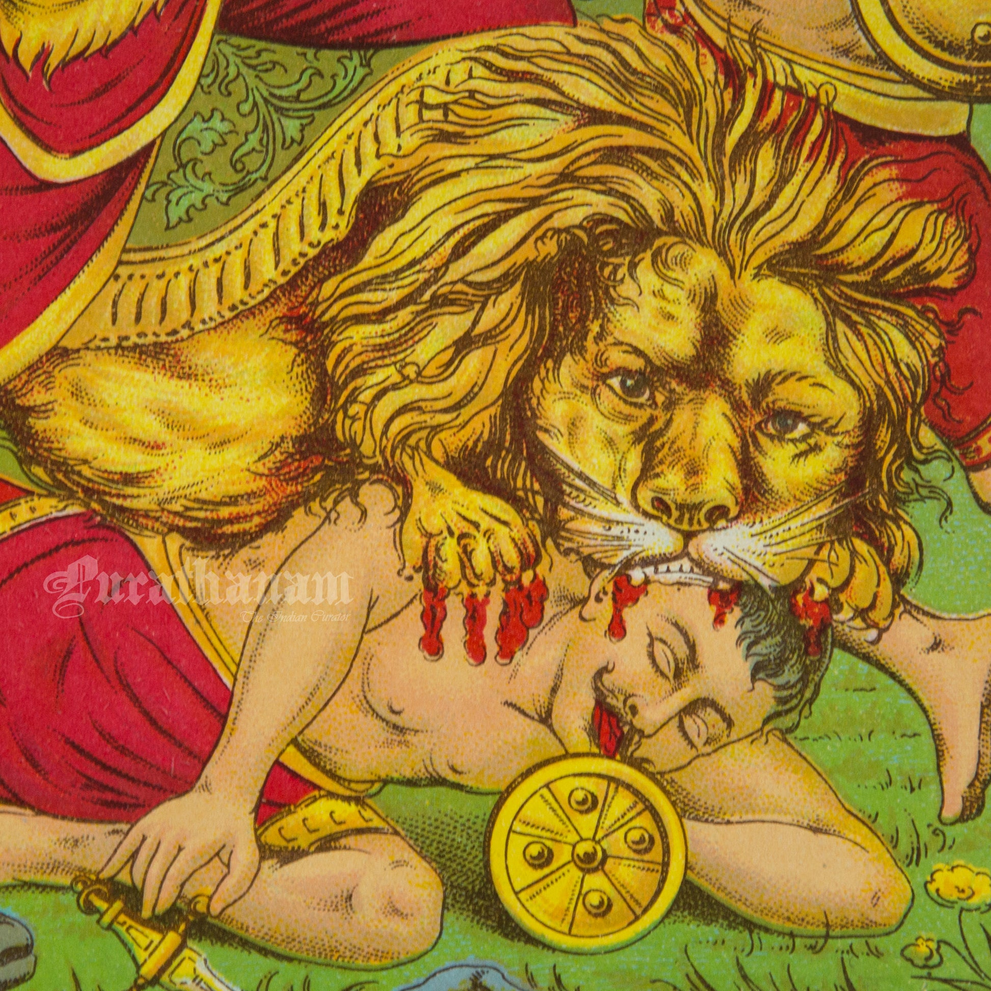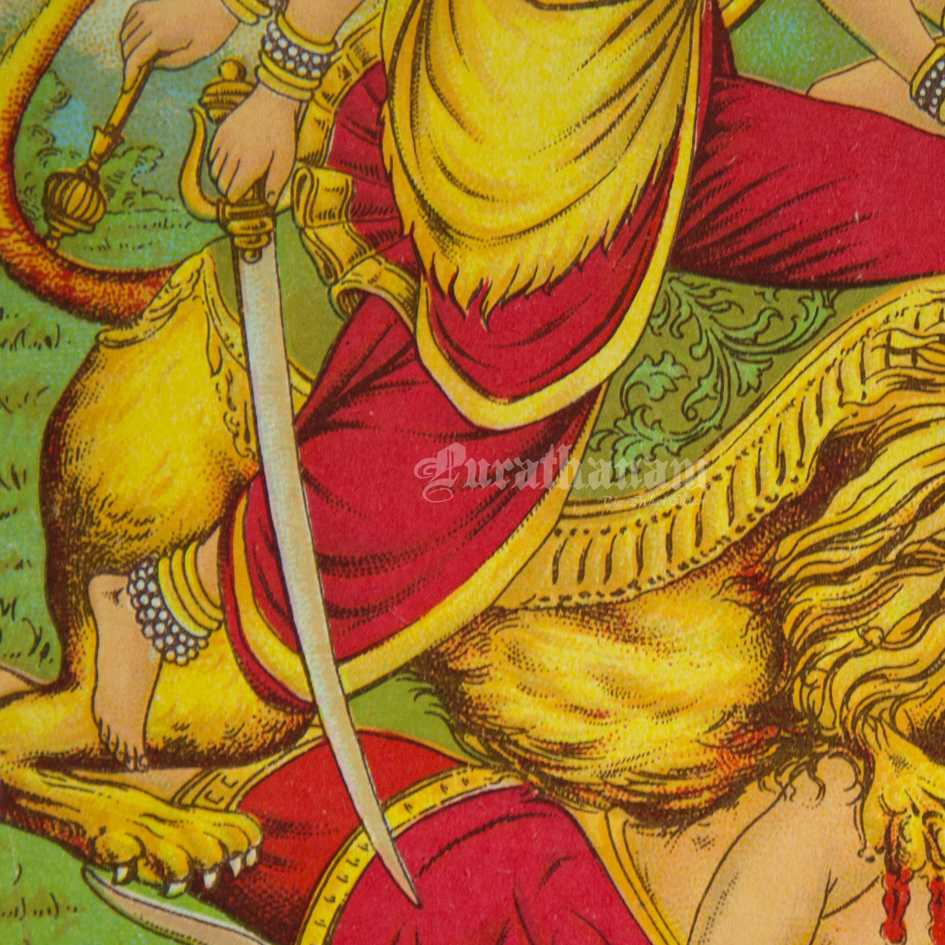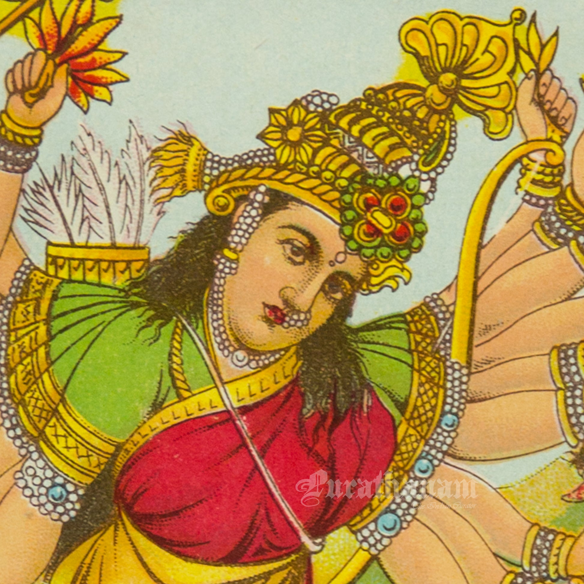Introducing mini lithograph prints of size 10”x7” from 1920s - 1930s of Mahishasura Mardini by Ravi Varma an Indian who achieved recognition for his depiction of scenes from the epics of the Mahabharata and Ramayana.