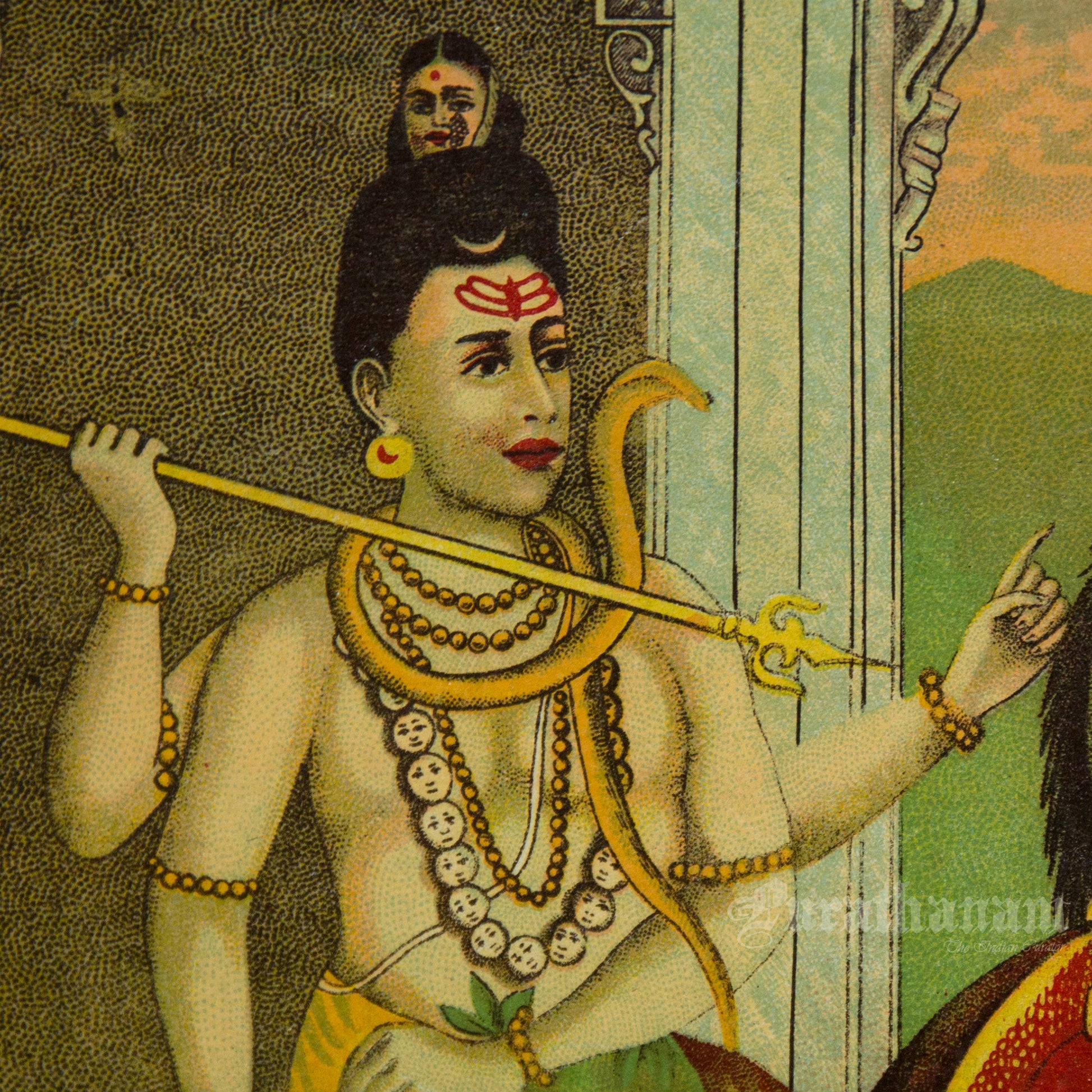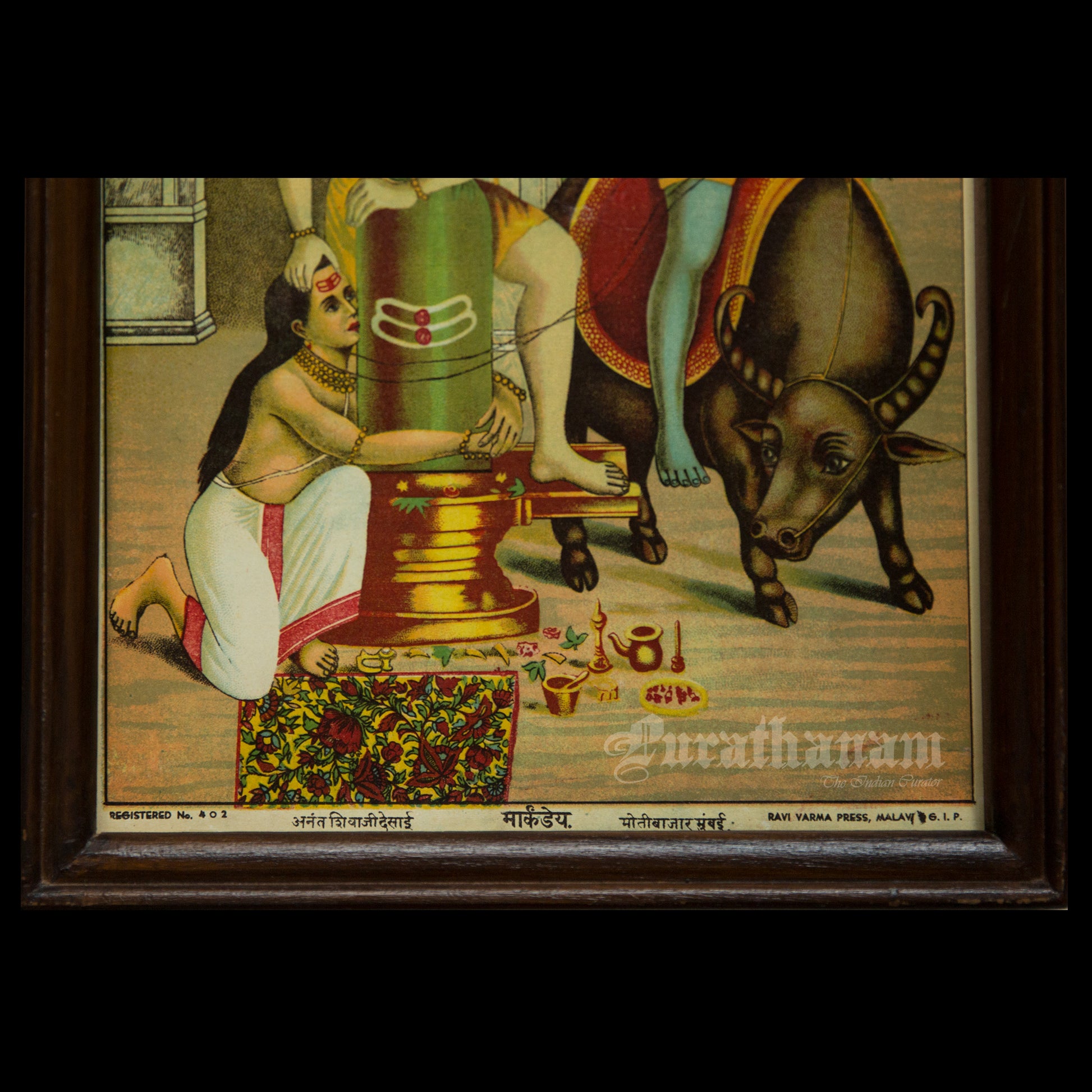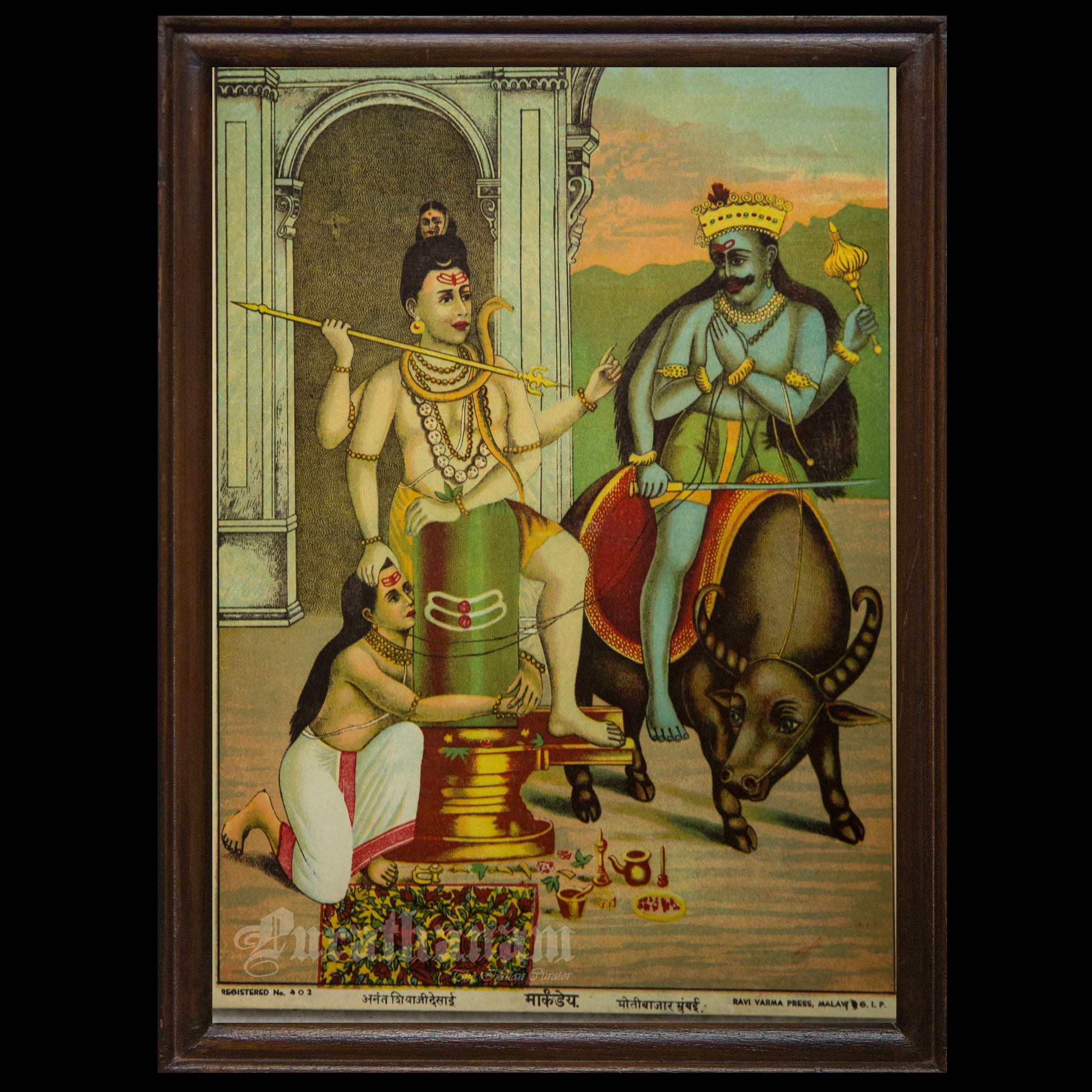 This is an oleograph print from 1920s- 1930s of Markandeya by Ravi Varma an Indian who achieved recognition for his depiction of scenes from the epics of the Mahabharata and Ramayana.