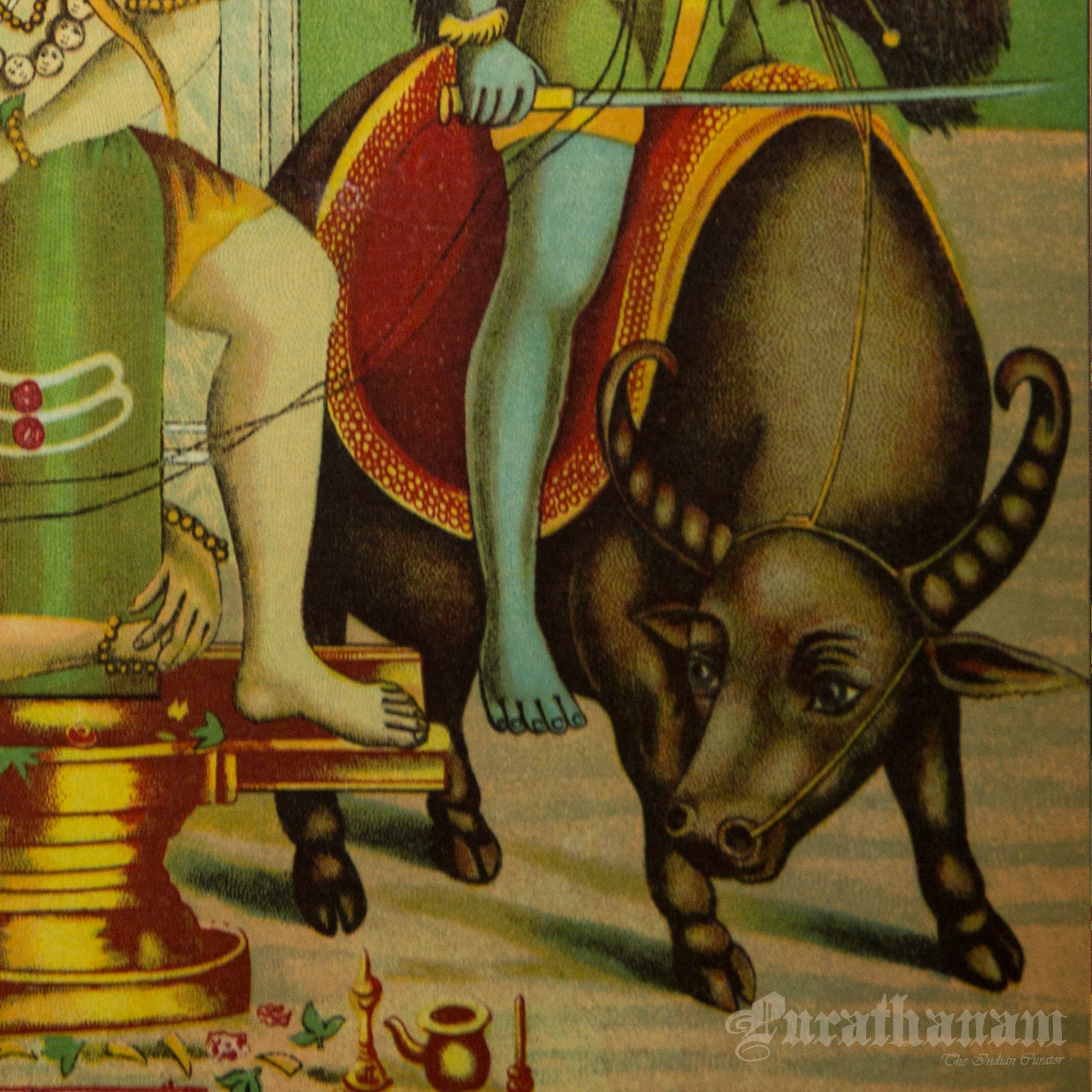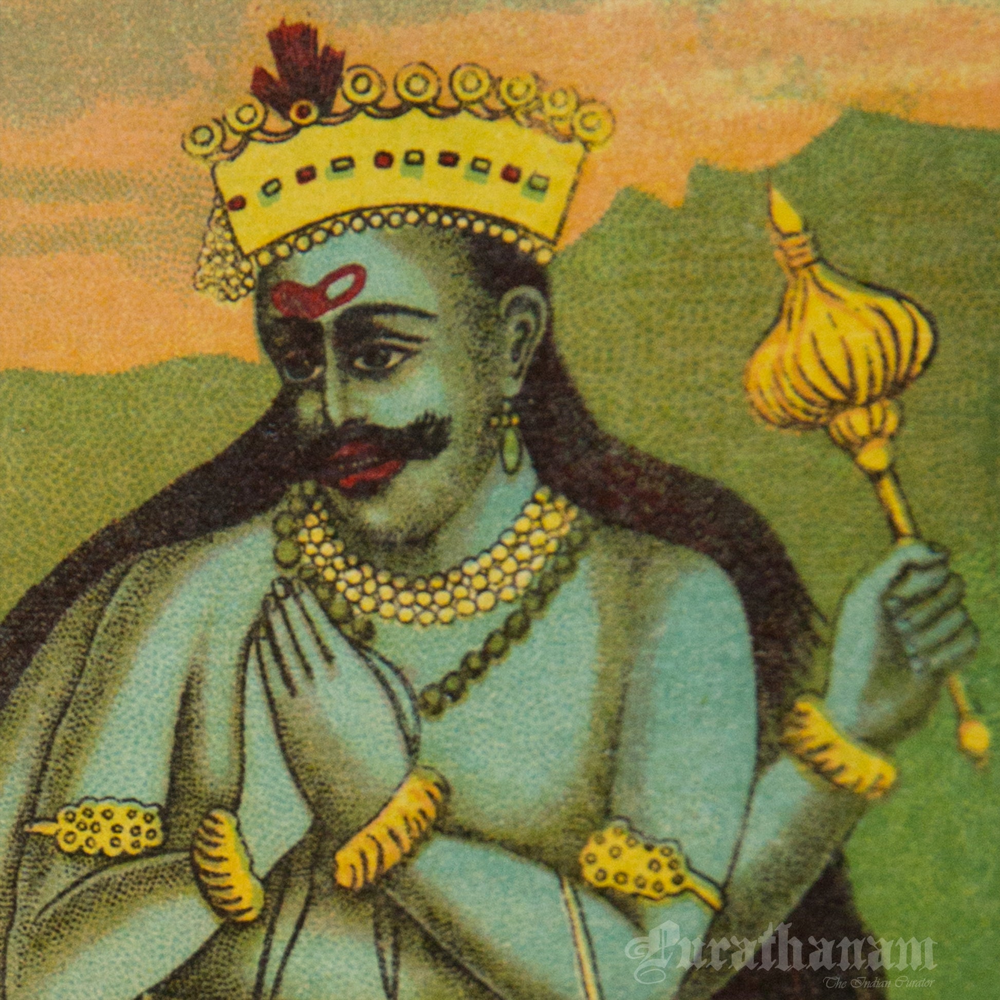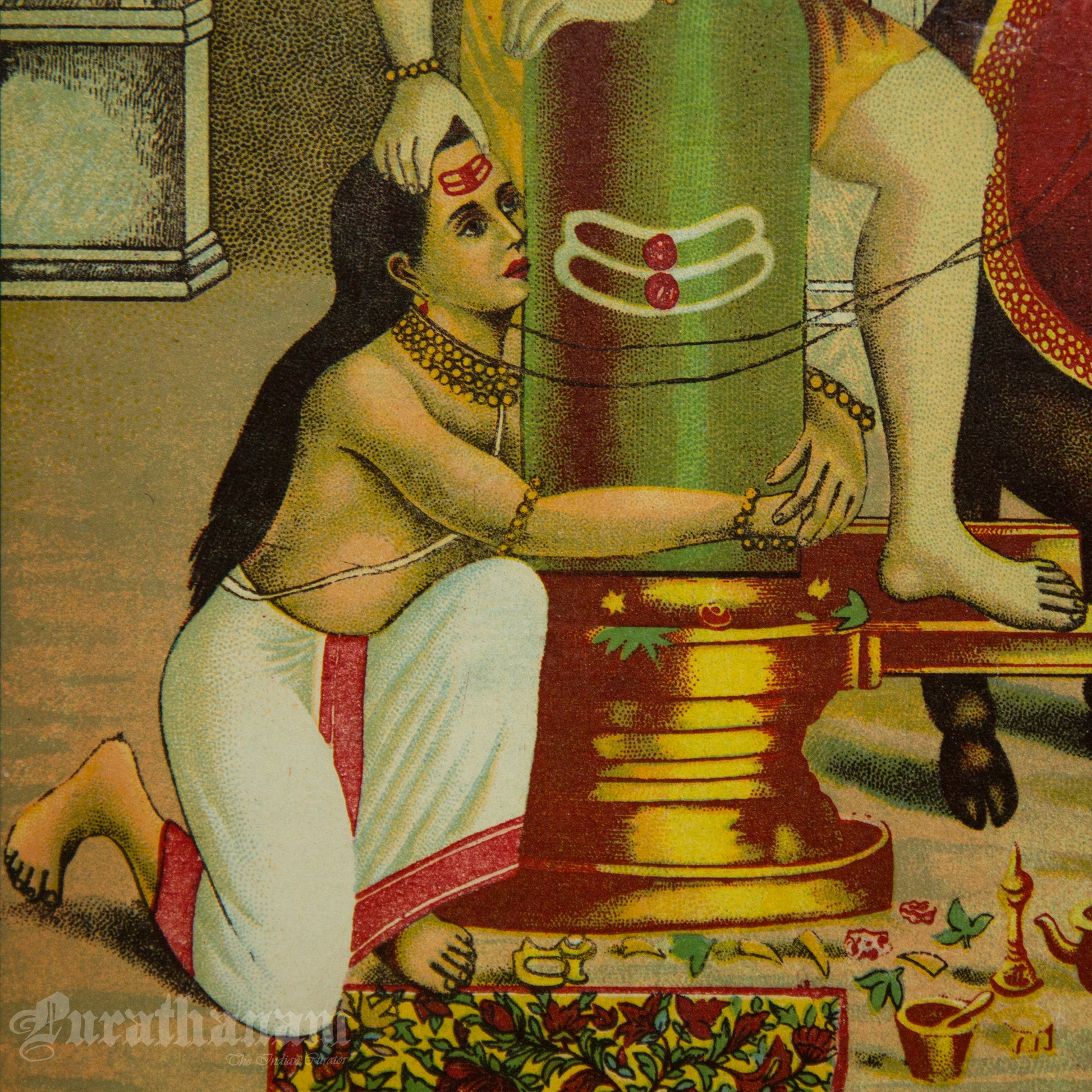 This is an oleograph print from 1920s- 1930s of Markandeya by Ravi Varma an Indian who achieved recognition for his depiction of scenes from the epics of the Mahabharata and Ramayana.