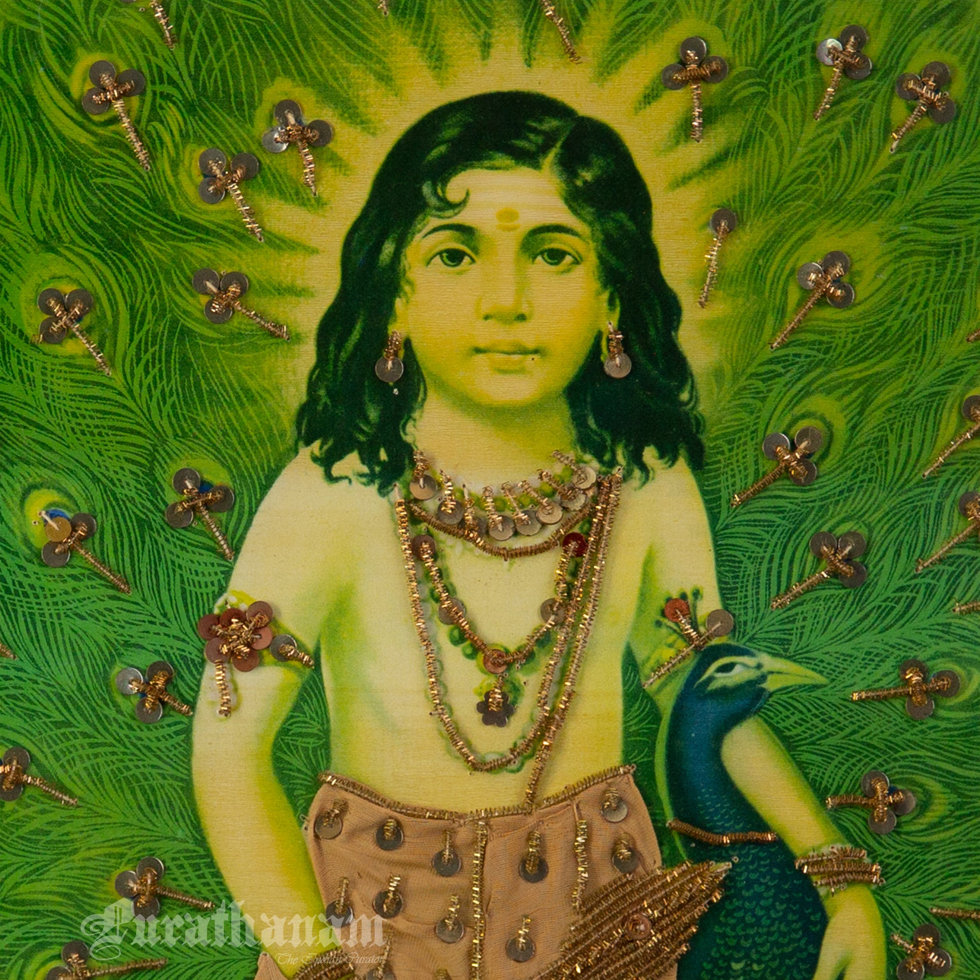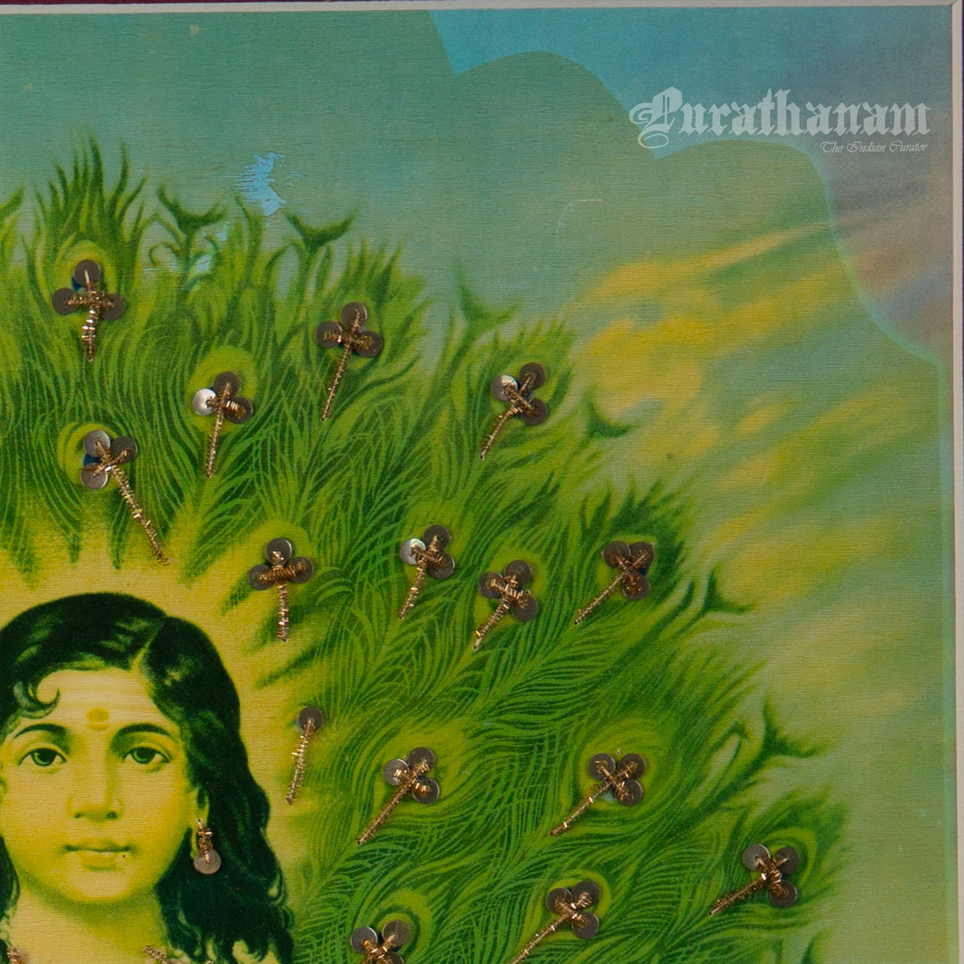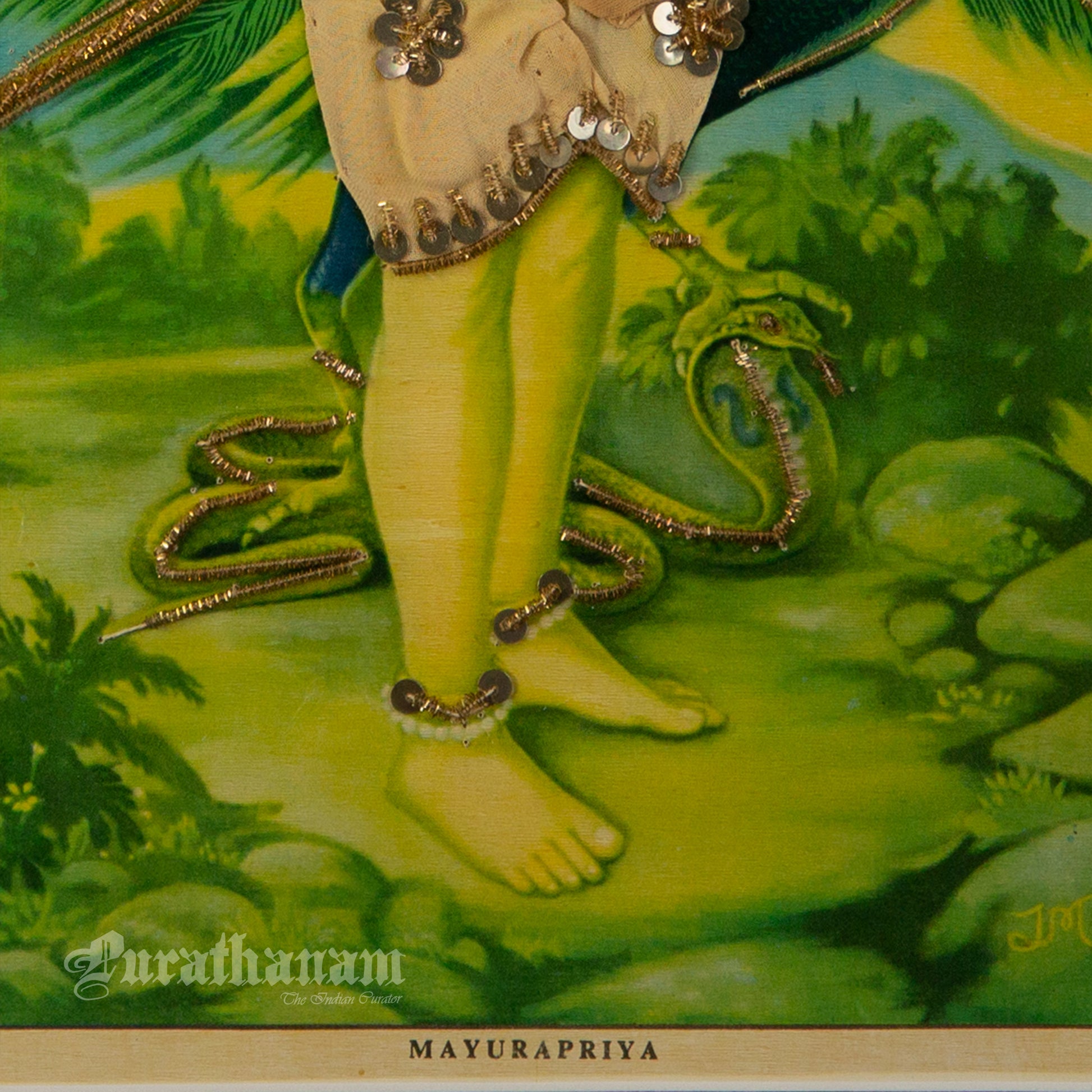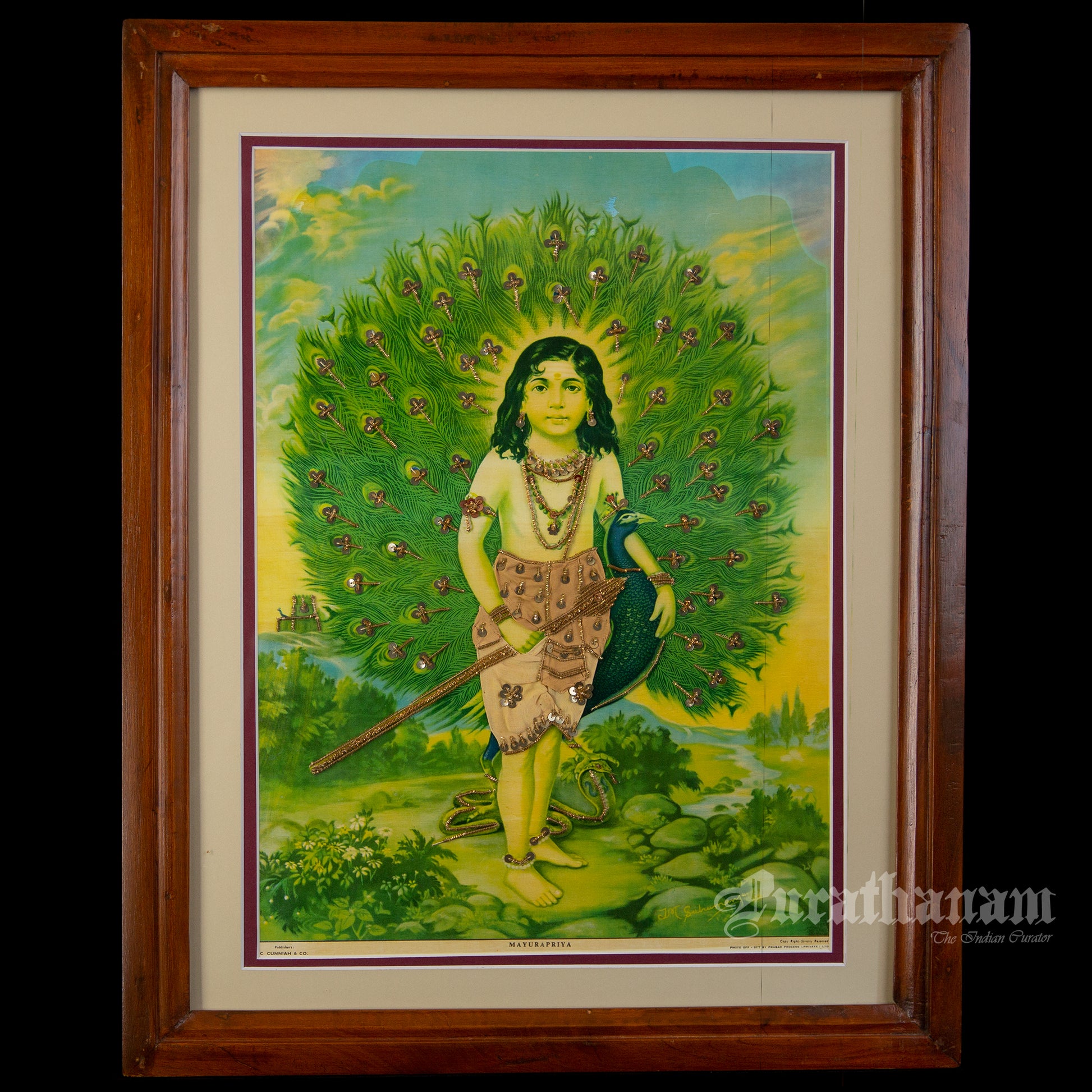 Here is a beautiful embellished Offset print of Mayurapriya by an Indian artist, J.M. Subramanya. The print has been beautifully embellished by its previous owner using fabric, Zardosi and sequins to enhance the beauty of this Mayurapriya a.k.a. Murugan. This is from early 1900s hence may have some signs of fading due to its age which adds to its beauty.