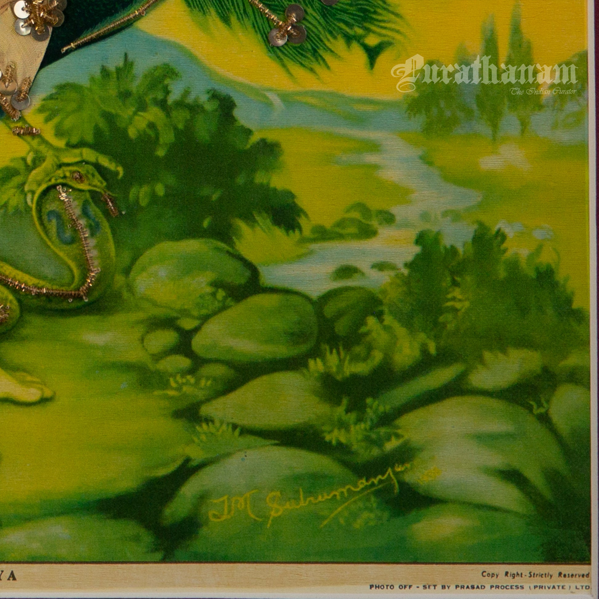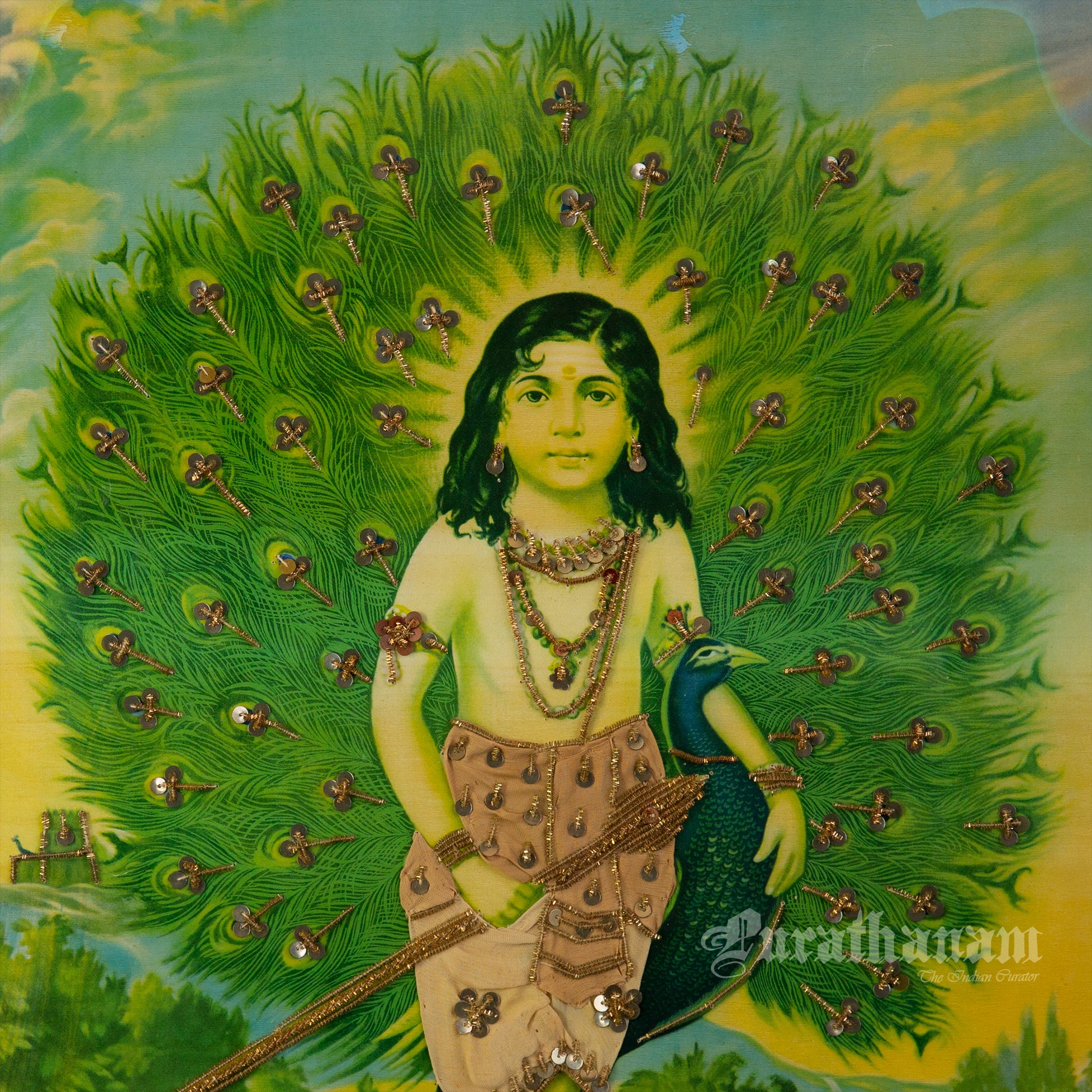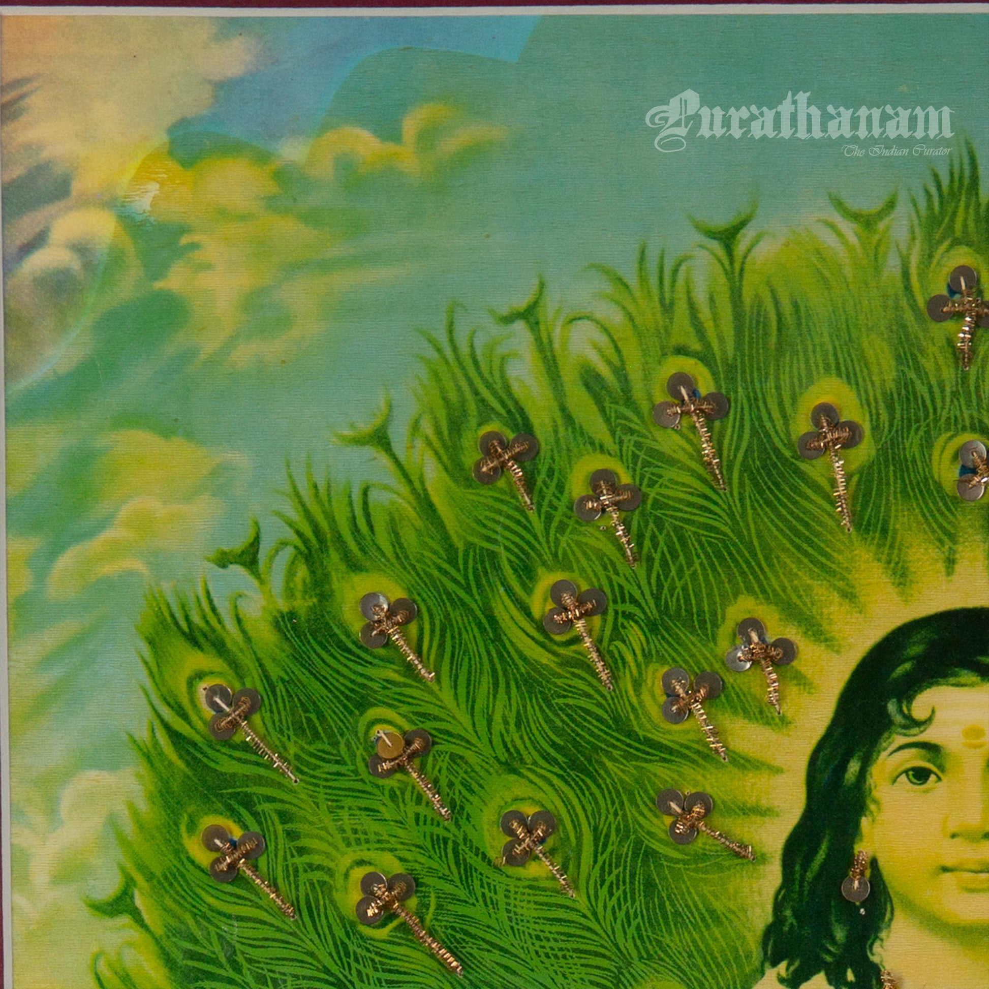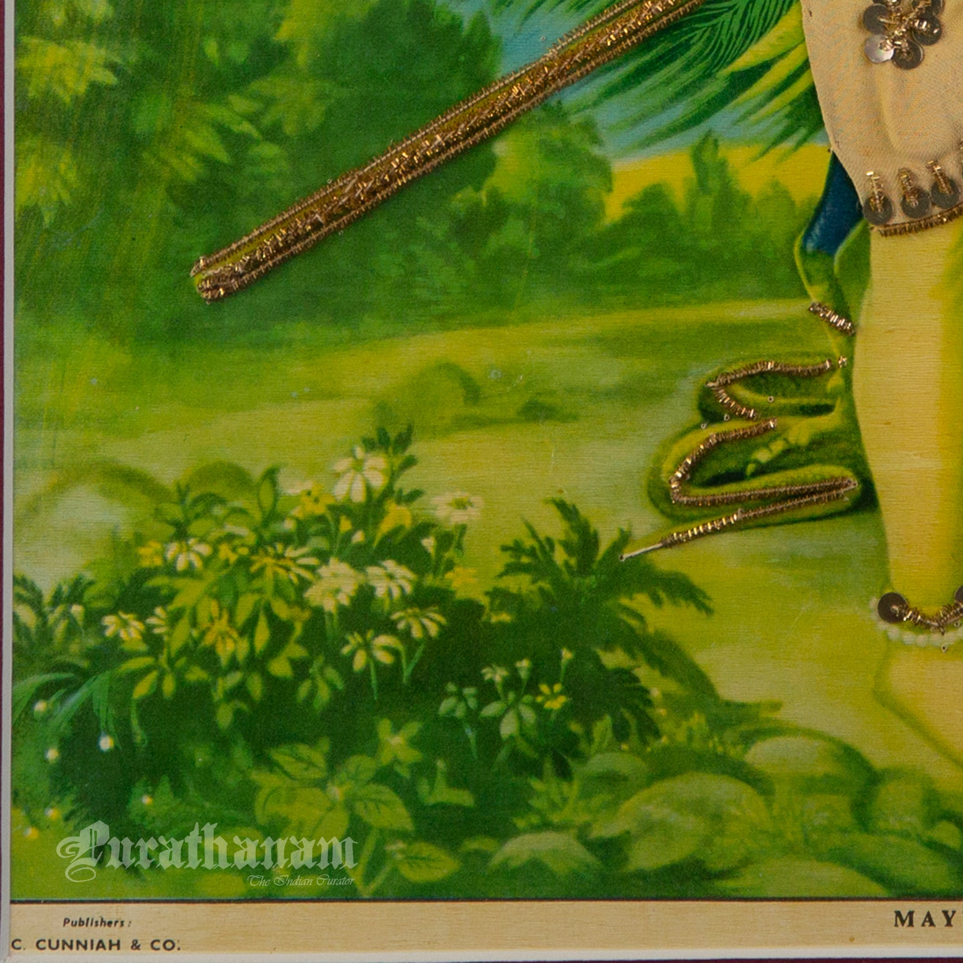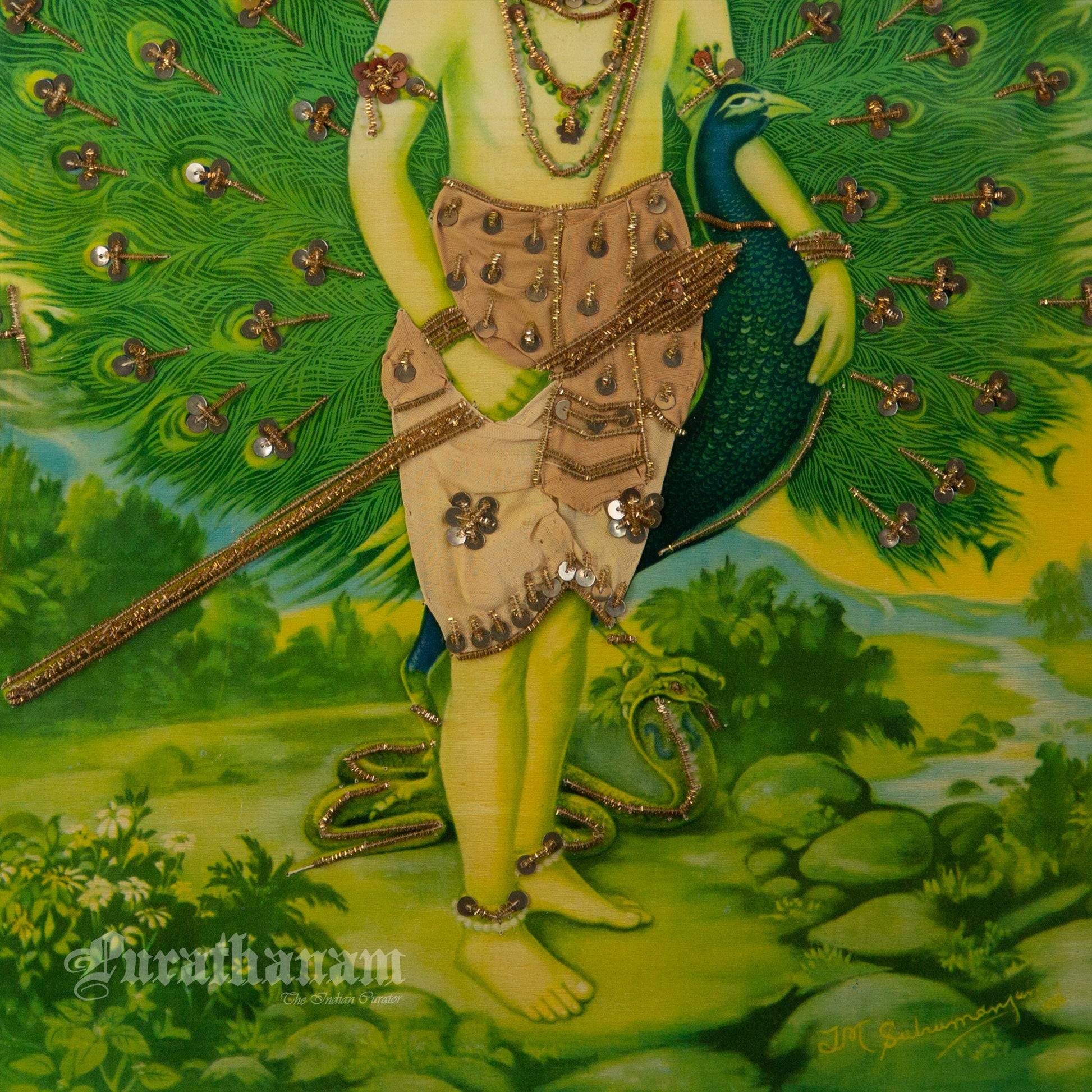 Here is a beautiful embellished Offset print of Mayurapriya by an Indian artist, J.M. Subramanya. The print has been beautifully embellished by its previous owner using fabric, Zardosi and sequins to enhance the beauty of this Mayurapriya a.k.a. Murugan. This is from early 1900s hence may have some signs of fading due to its age which adds to its beauty.