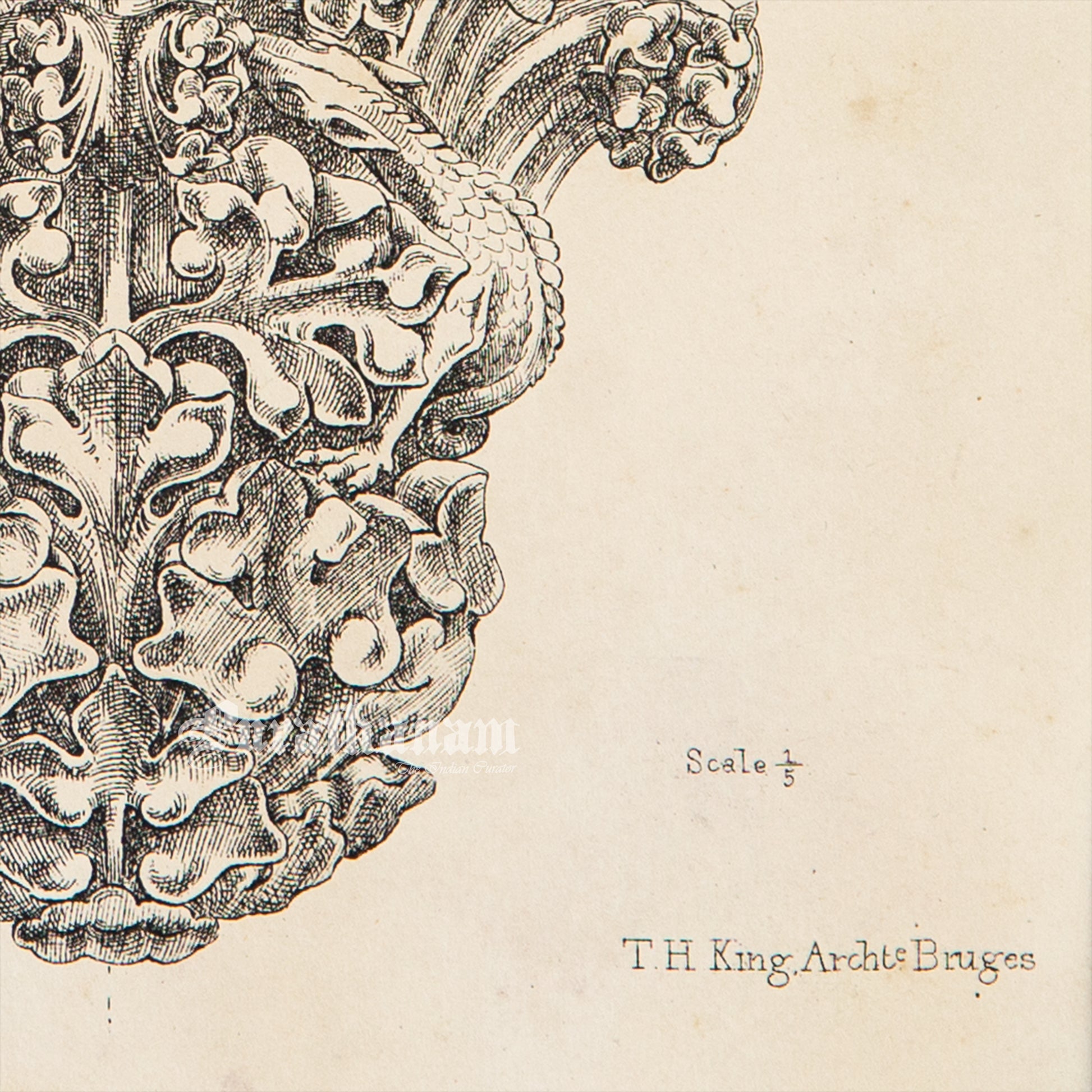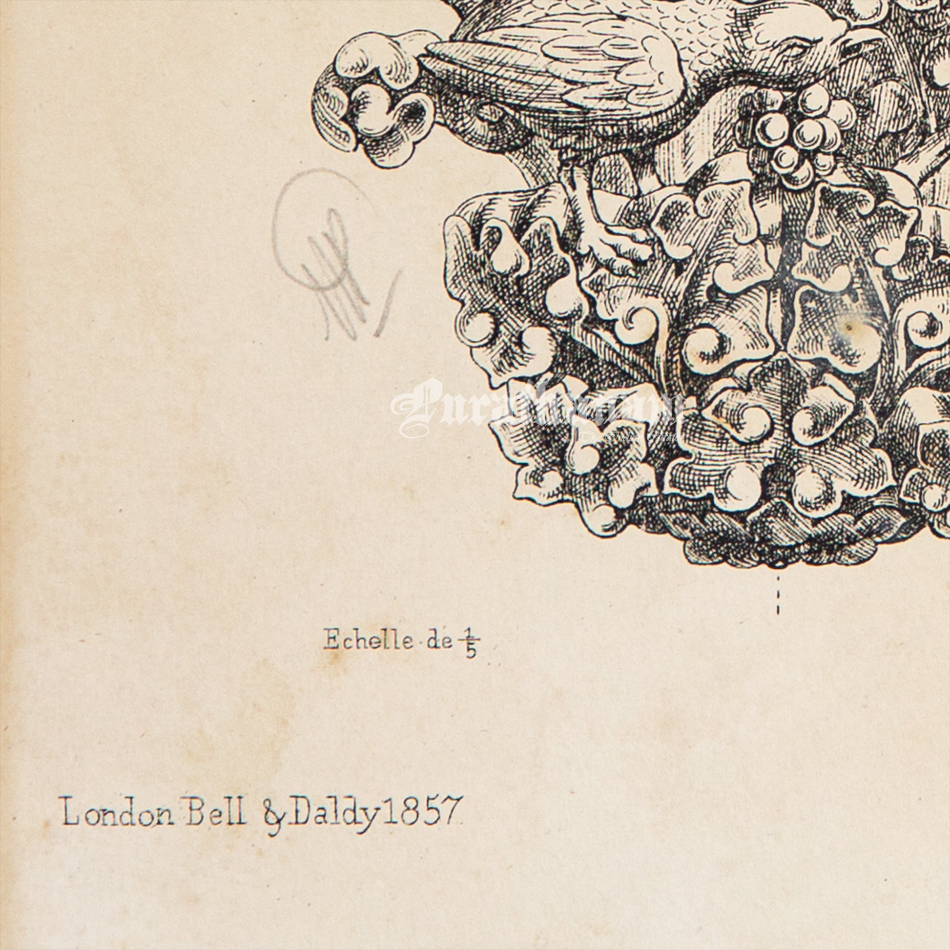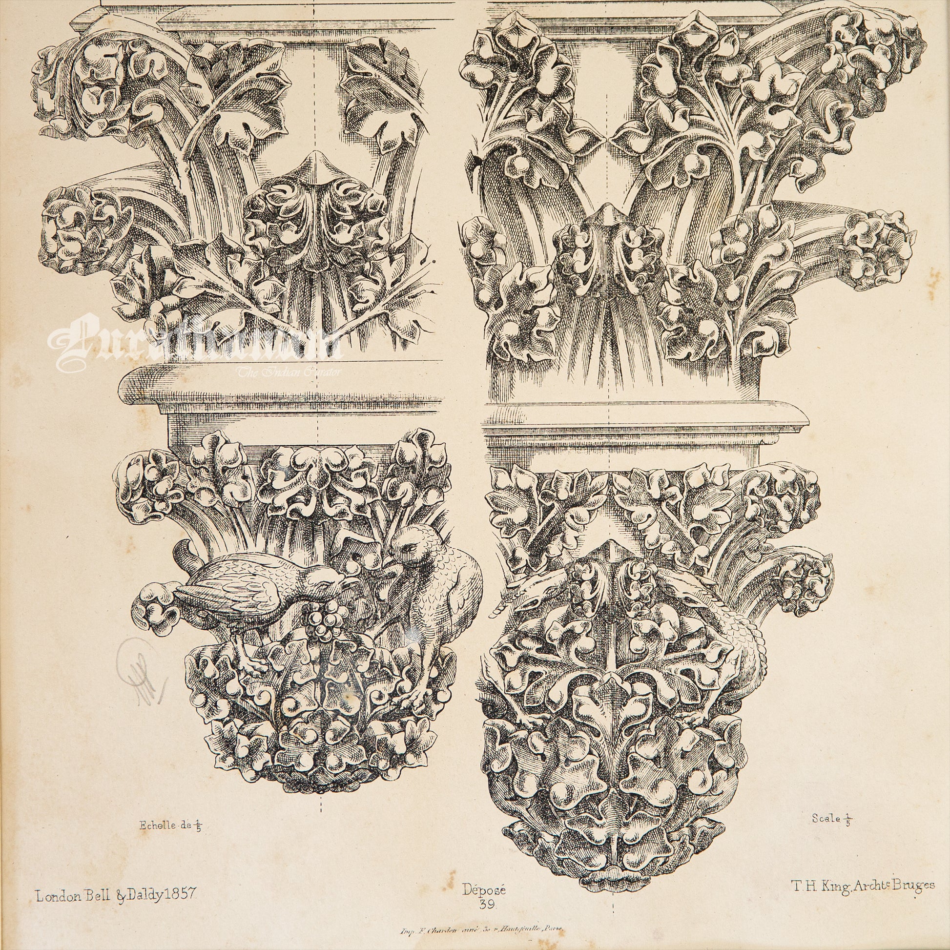 This antique black and white print is part of the study book of Medieval Architecture and Art - Volume I. It features one of the 100 plates from Volume I, containing work drawings of principal monuments of the Middle Ages by Thomas H. King, Bruges for London Bell Daldy in 1857. The purpose of these architectural plates is to provide insights into the architectural styles, techniques, and artistic influences of the medieval period. Specifically, this drawing depicts the designs of the capitals of arcading Lady chapel and choir Aisle of St. Stephen's Church, built in Auxerre, France, in the 12th century CE.