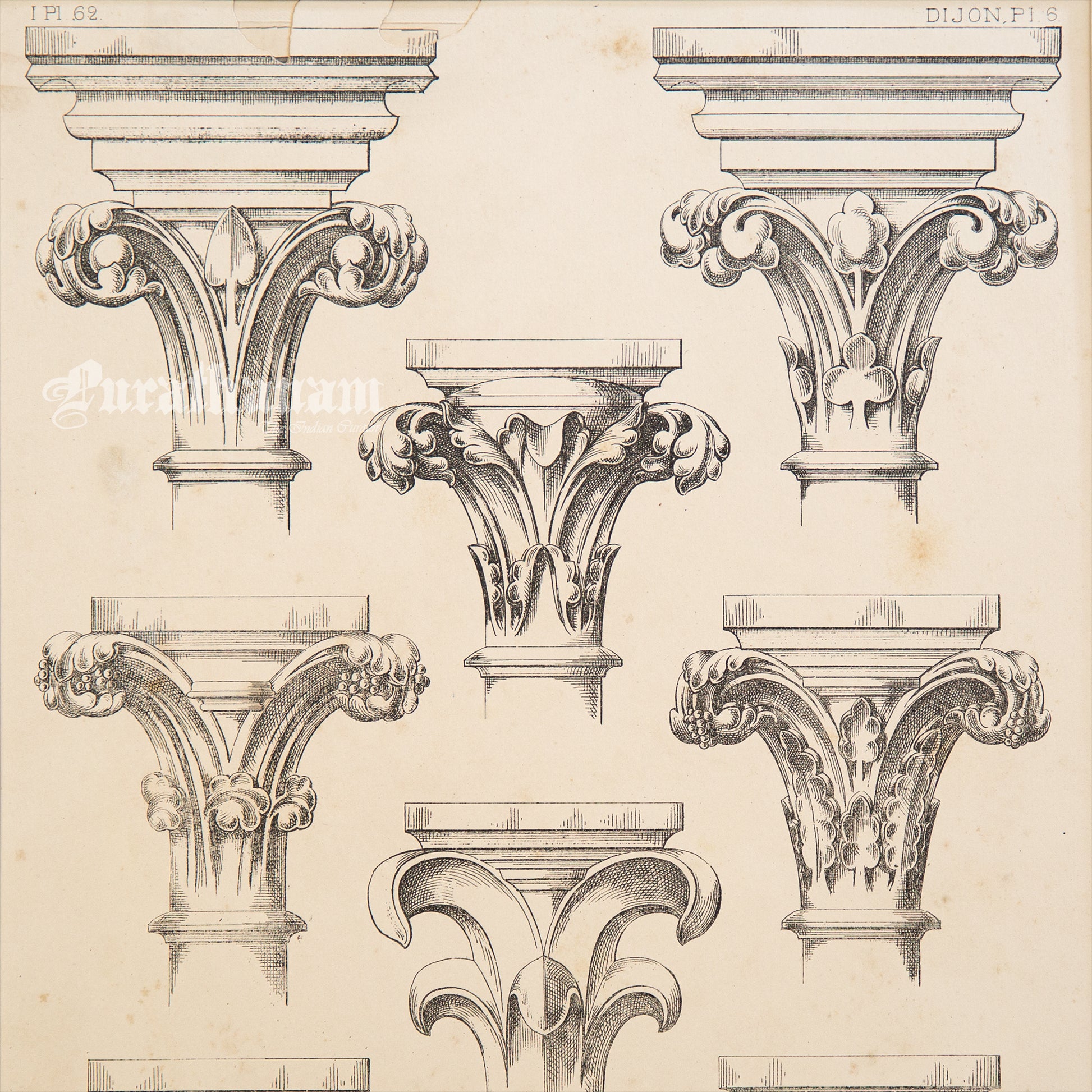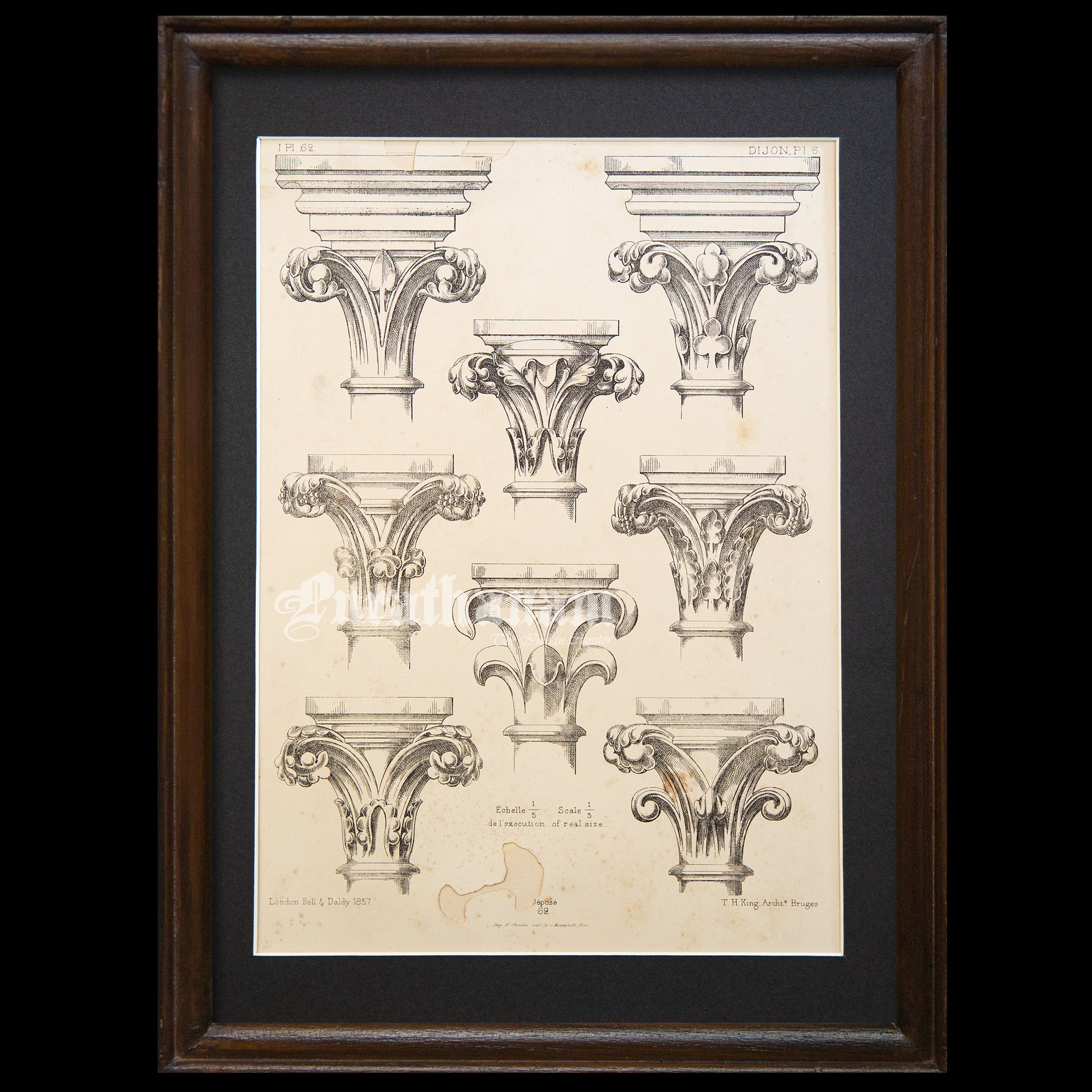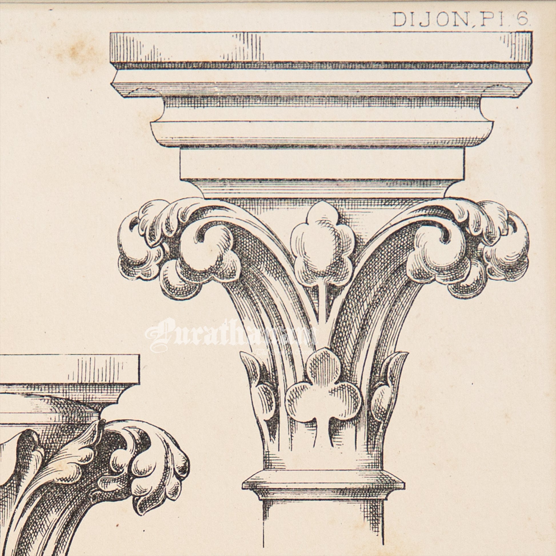 This antique black and white print is part of the study book of Medieval Architecture and Art - Volume I. It features one of the 100 plates from Volume I, containing work drawings of principal monuments of the Middle Ages by Thomas H. King, Bruges for London Bell Daldy in 1857. The purpose of these architectural plates is to provide insights into the architectural styles, techniques, and artistic influences of the medieval period. Specifically, this drawing depicts the capitals selected from the lower arcading of choir of Notre-Dame cathedral in Dijon, France, in the 12th century CE.