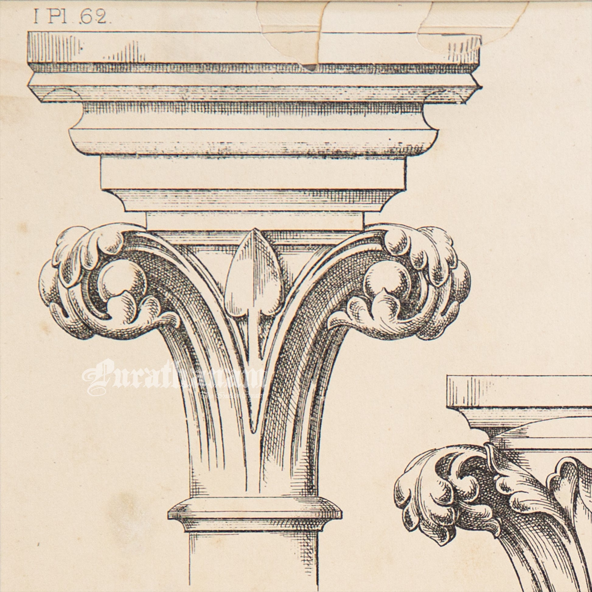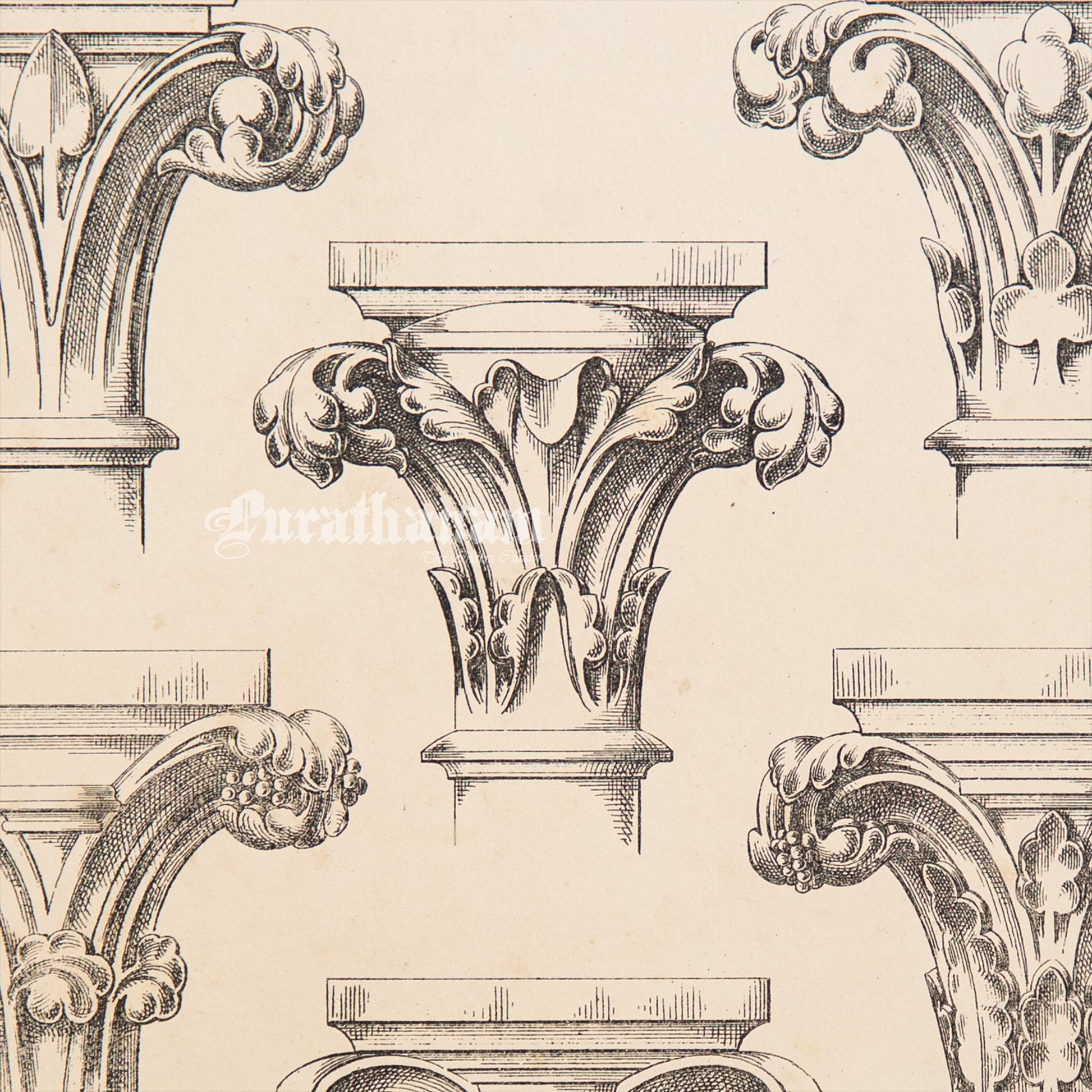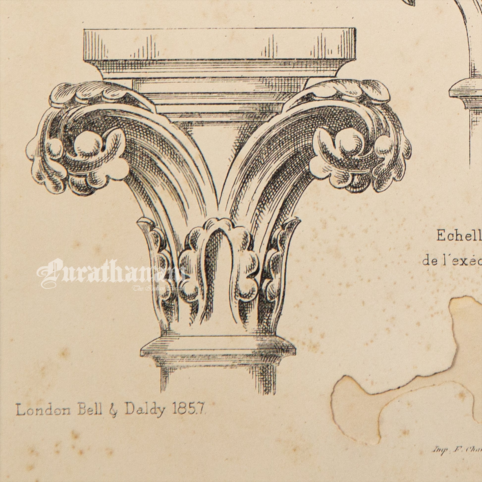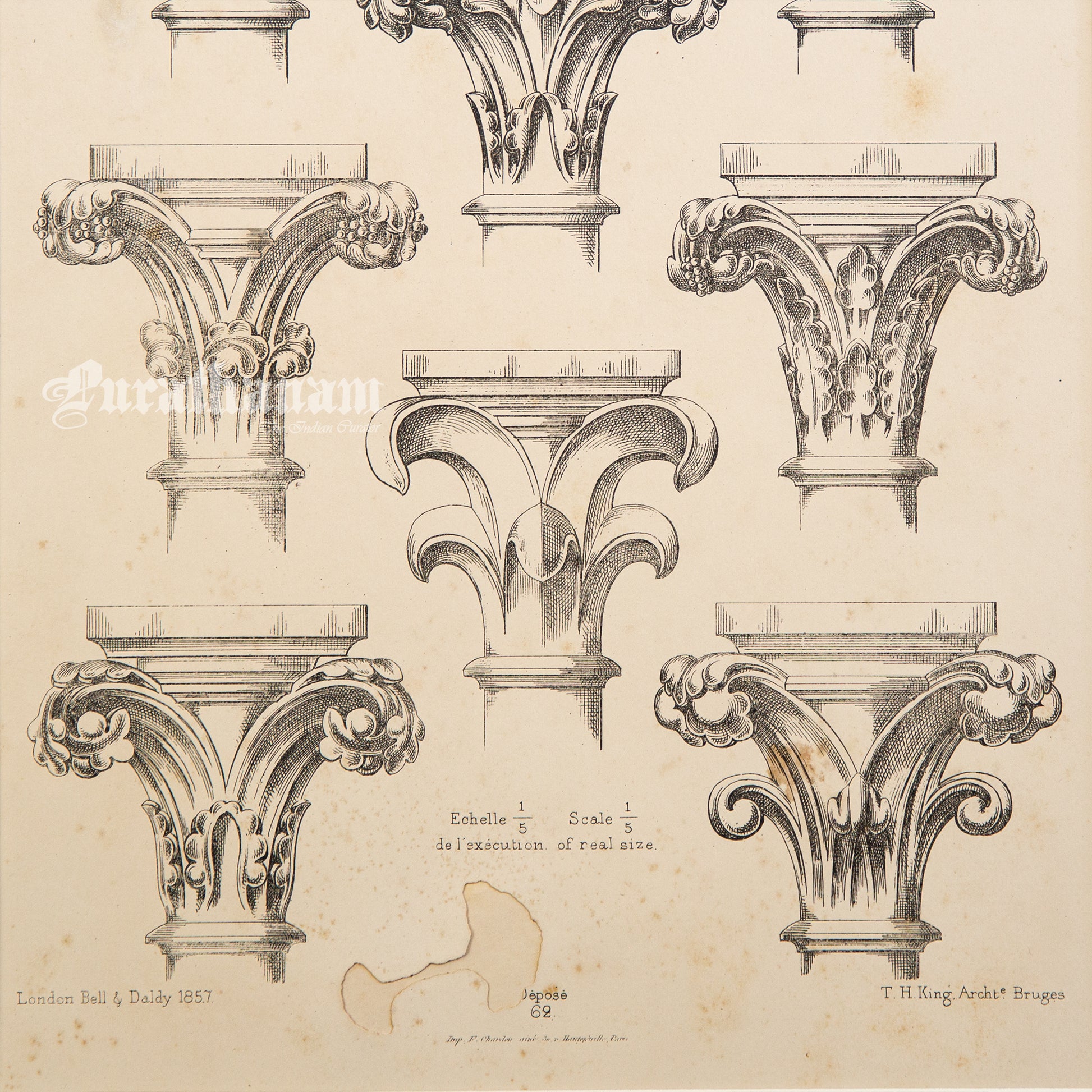 This antique black and white print is part of the study book of Medieval Architecture and Art - Volume I. It features one of the 100 plates from Volume I, containing work drawings of principal monuments of the Middle Ages by Thomas H. King, Bruges for London Bell Daldy in 1857. The purpose of these architectural plates is to provide insights into the architectural styles, techniques, and artistic influences of the medieval period. Specifically, this drawing depicts the capitals selected from the lower arcading of choir of Notre-Dame cathedral in Dijon, France, in the 12th century CE.