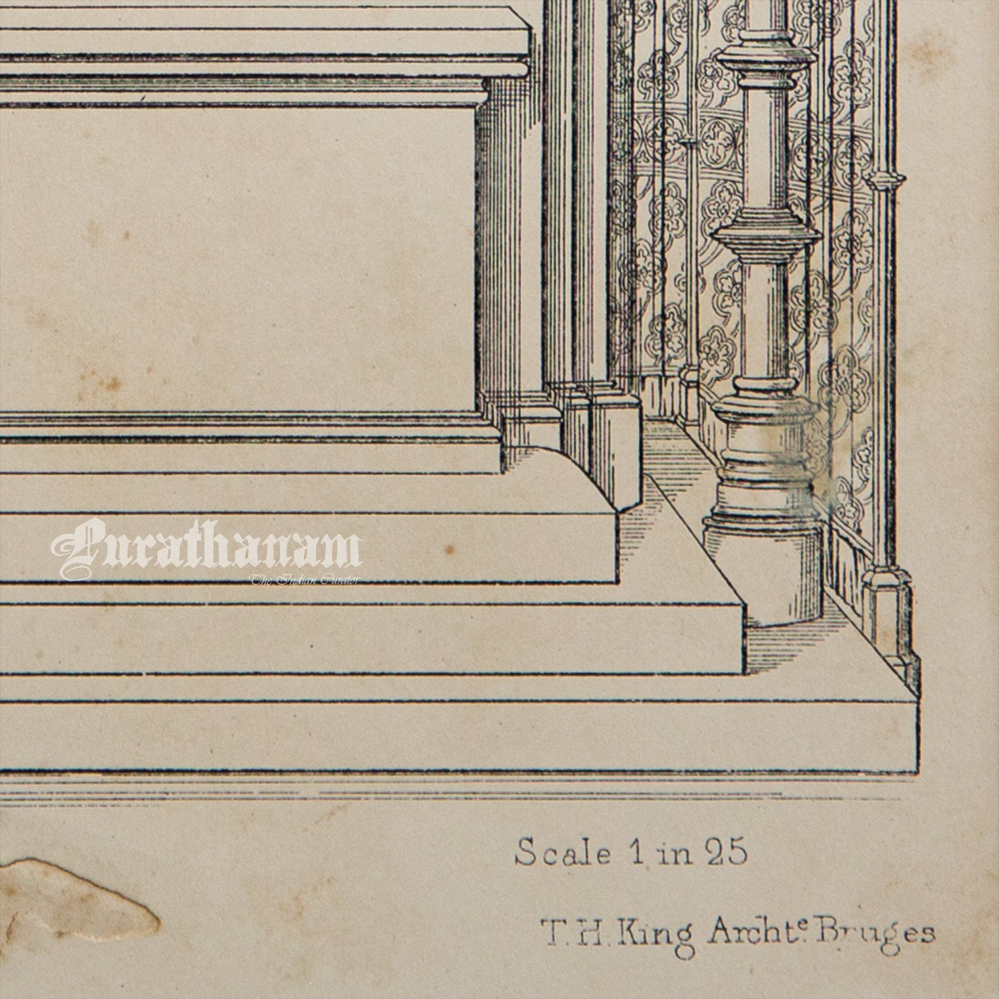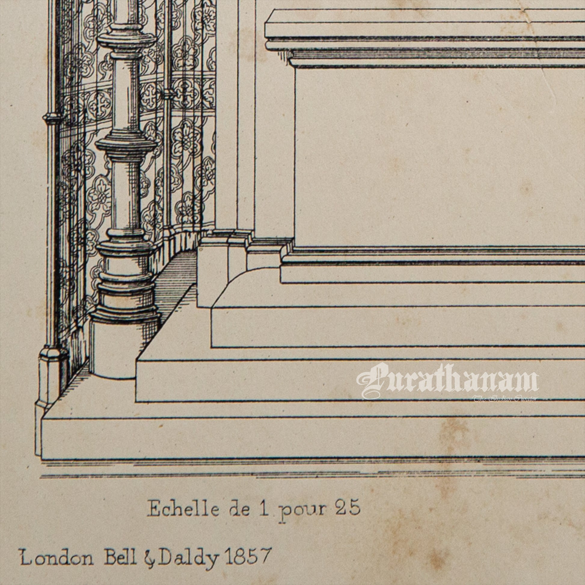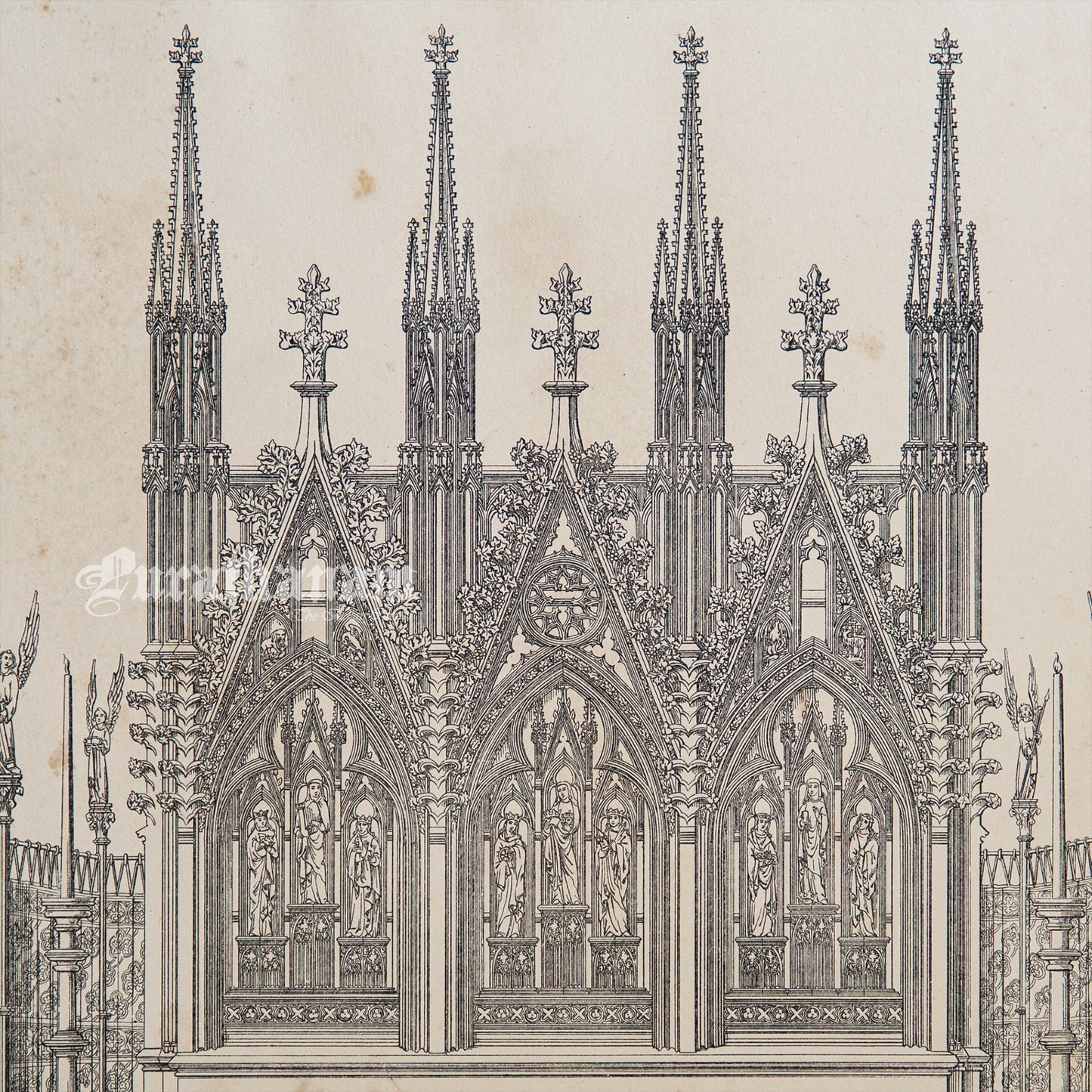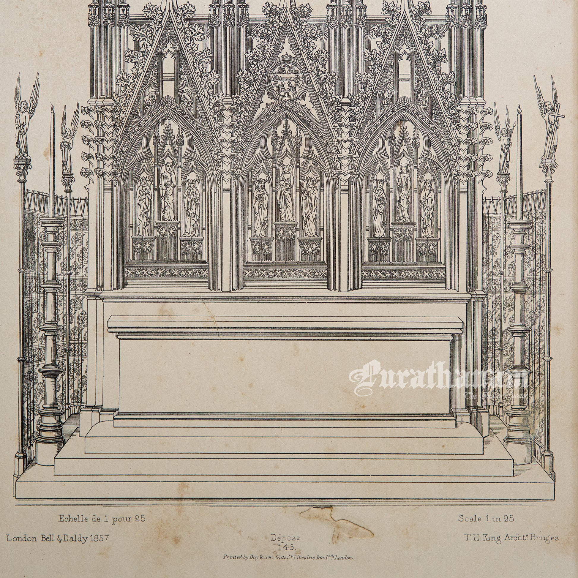 This antique black and white print is part of the study book of Medieval Architecture and Art - Volume II. It features one of the 100 plates from Volume II, containing work drawings of principal monuments of the Middle Ages by Thomas H. King, Bruges for London Bell Daldy in 1857. The purpose of these architectural plates is to provide insights into the architectural styles, techniques, and artistic influences of the medieval period. Specifically, this drawing depicts the perspective elevation of high alter of a 13th century church of St. Elizabeth of Hungary built in Germany.