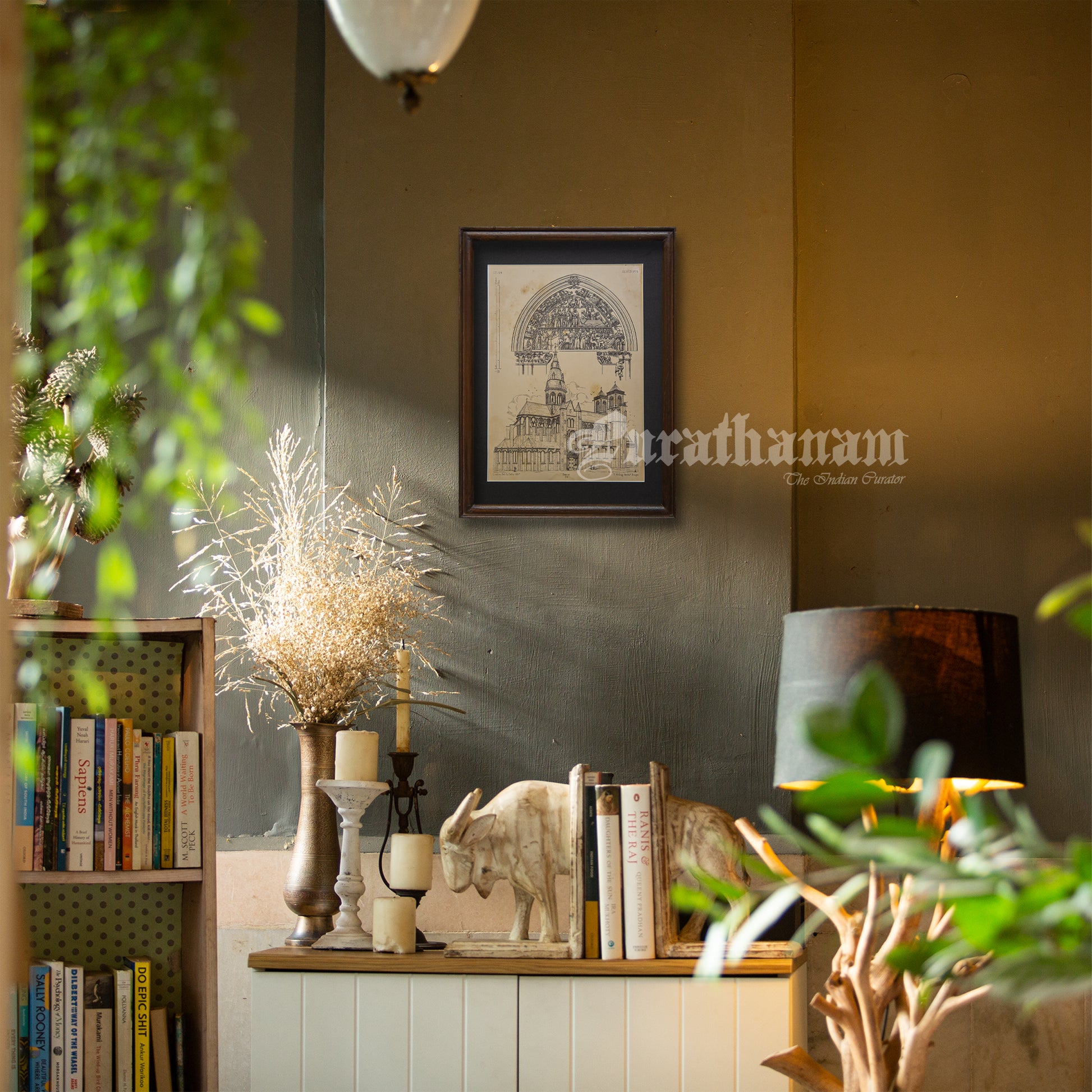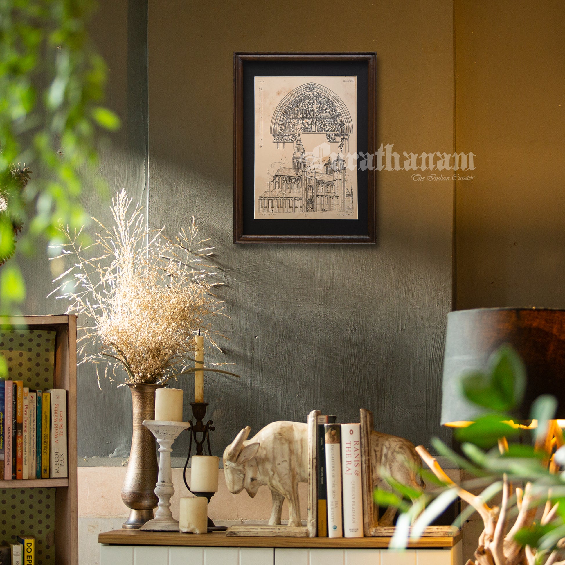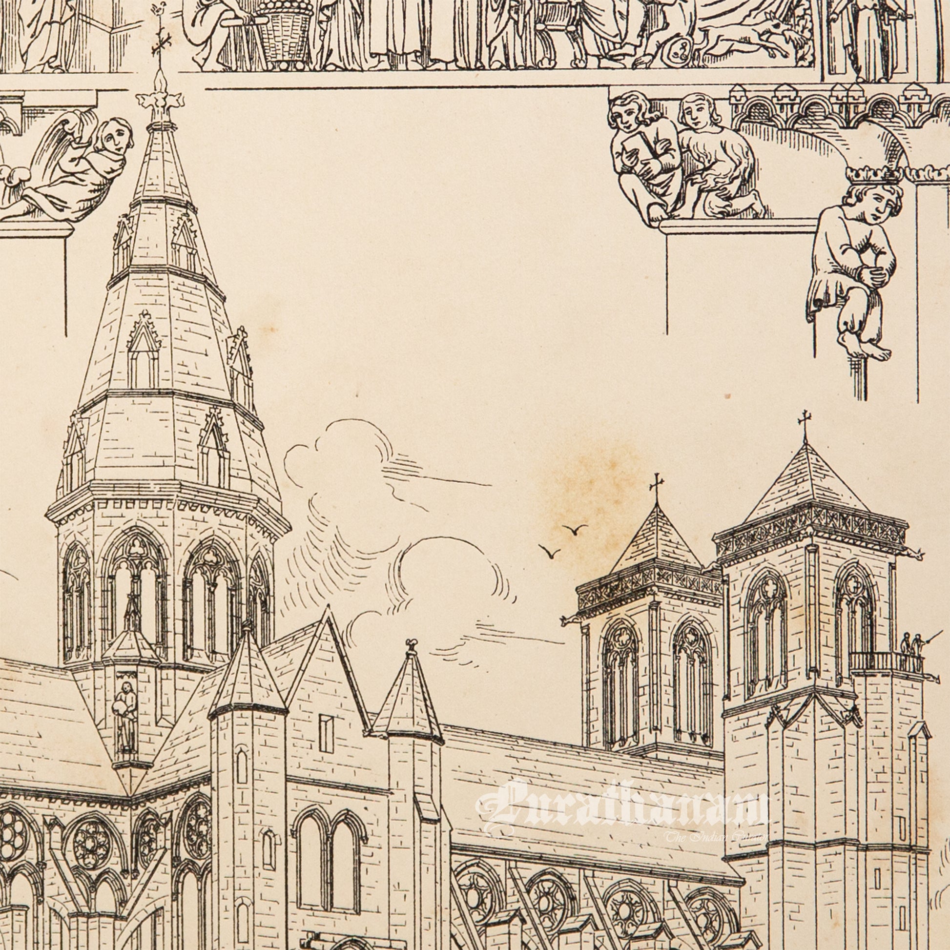 This church was built by Robert I. He did it to say sorry for a murder he did. The full story of Robert’s murder and his redemption is depicted in the tympanum shown on the first half of the print. The original church was repaired and rebuilt in 13th century. The stories about why it was built were preserved through sculptures, pillars and tympanum of the north transept door of the new structure of the church.