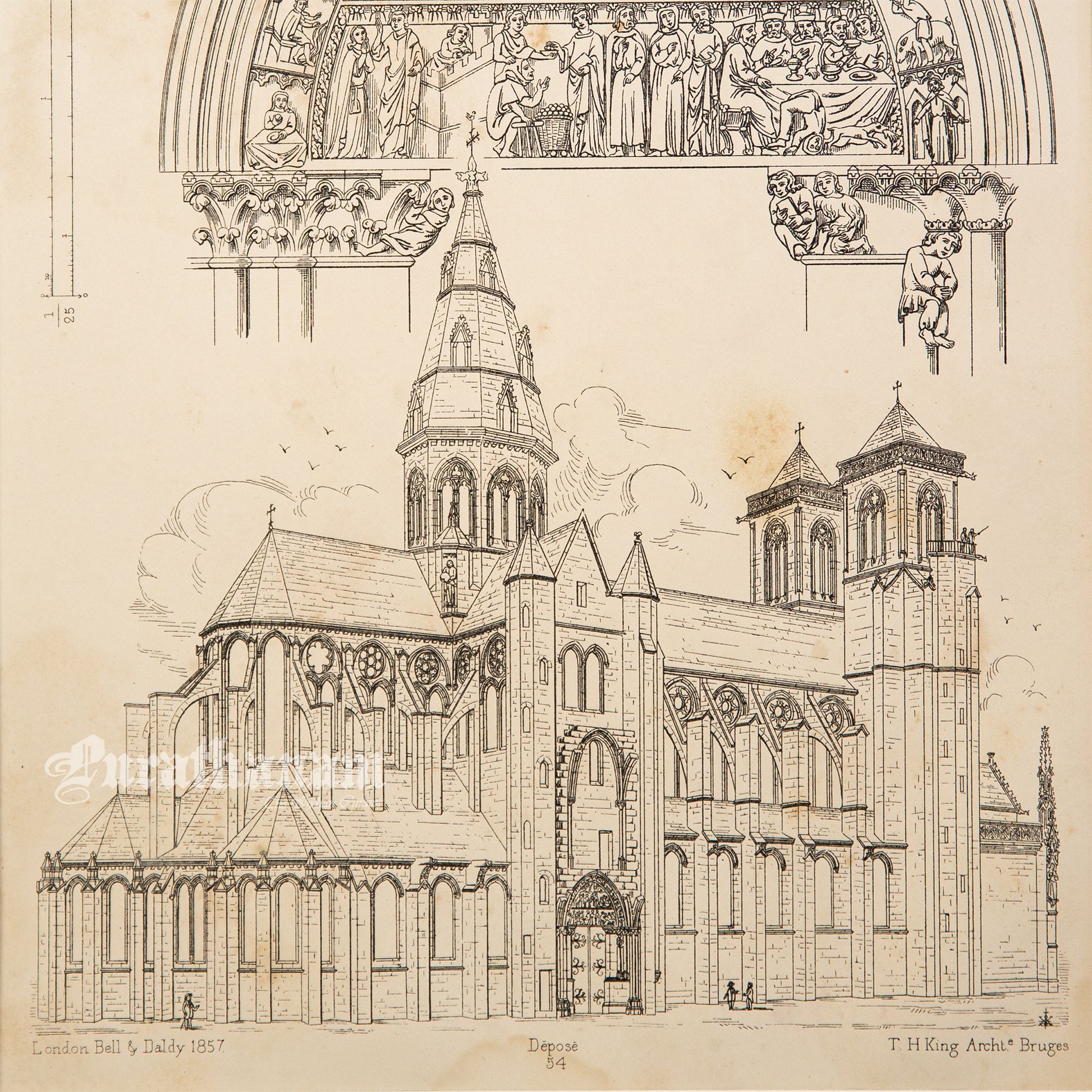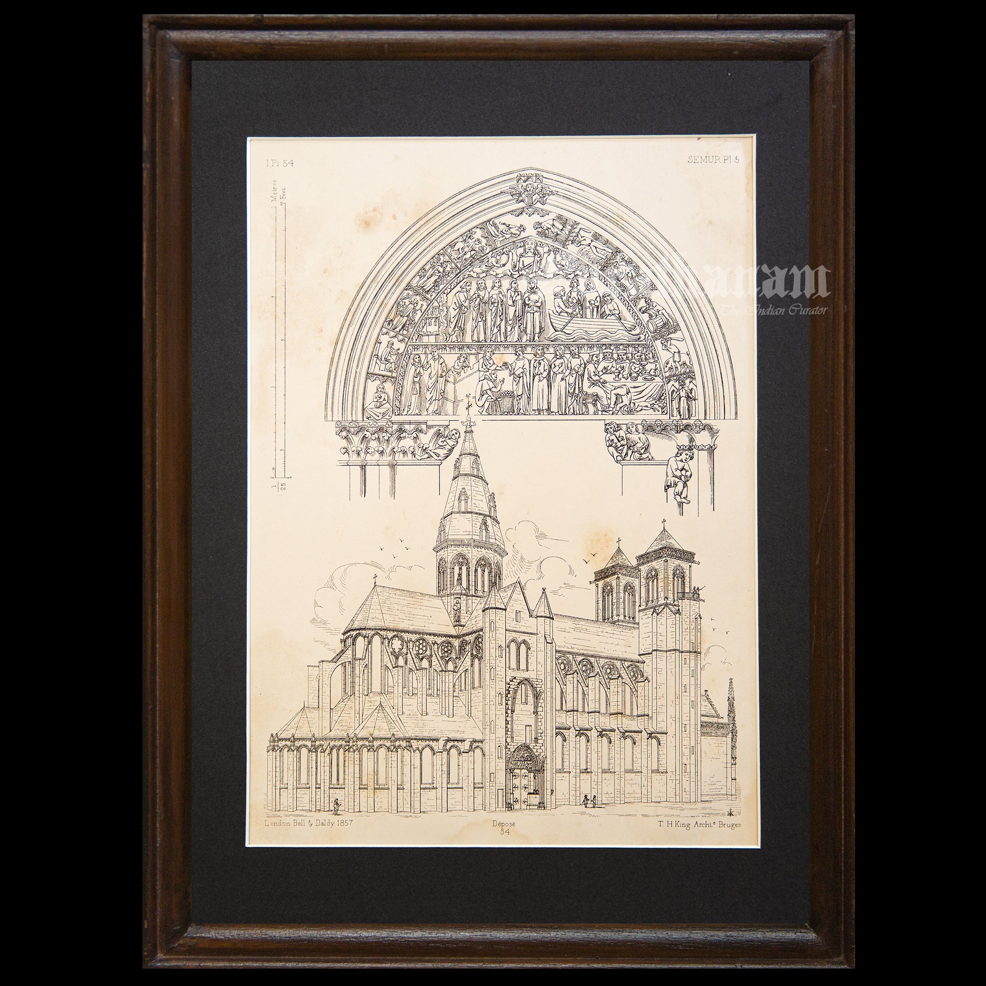 This antique black and white print is part of the study book of Medieval Architecture and Art - Volume I. It features one of the 100 plates from Volume I, containing work drawings of principal monuments of the Middle Ages by Thomas H. King, Bruges for London Bell Daldy in 1857. The purpose of these architectural plates is to provide insights into the architectural styles, techniques, and artistic influences of the medieval period. Specifically, this drawing depicts the north transept door way of a church built in 1065 in Semur, France, by Robert I, a leader from Burgundy.