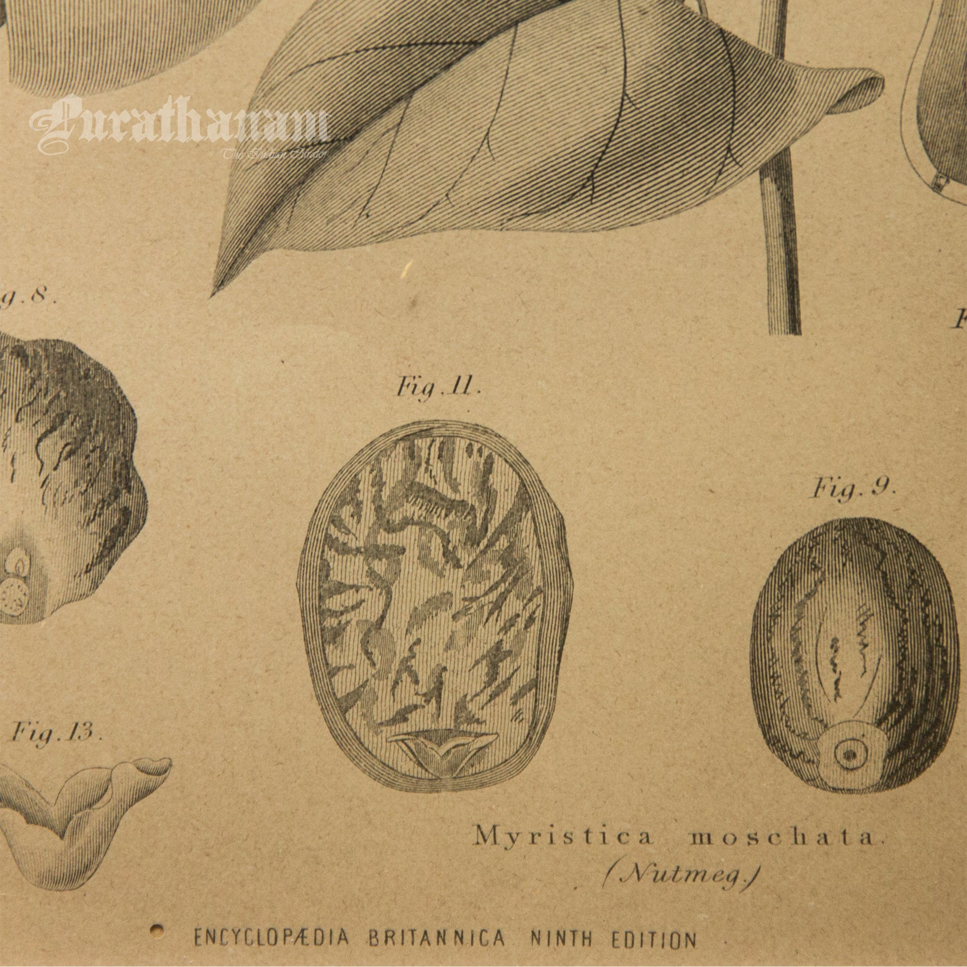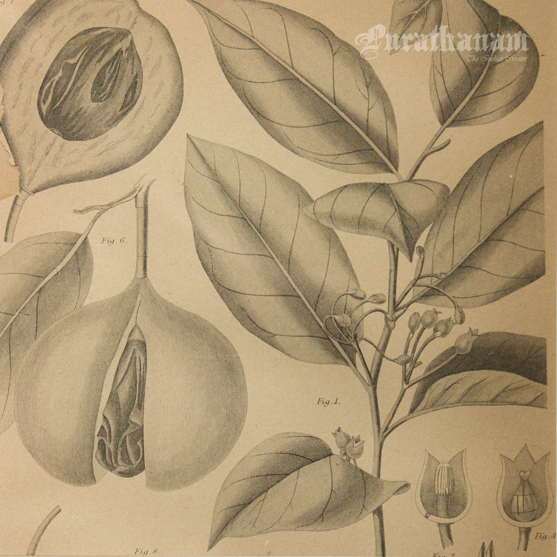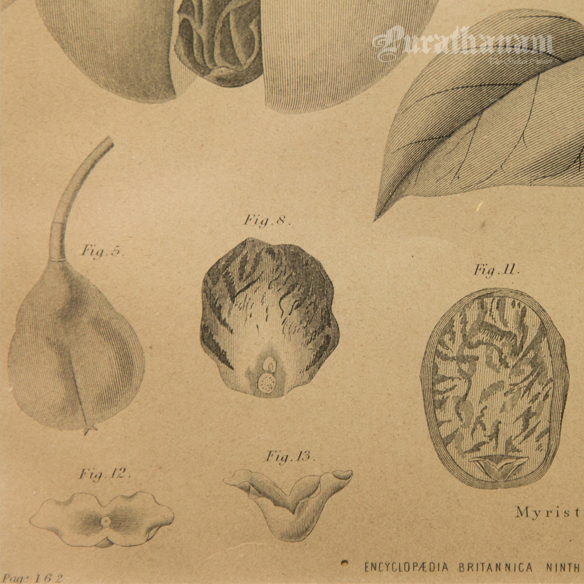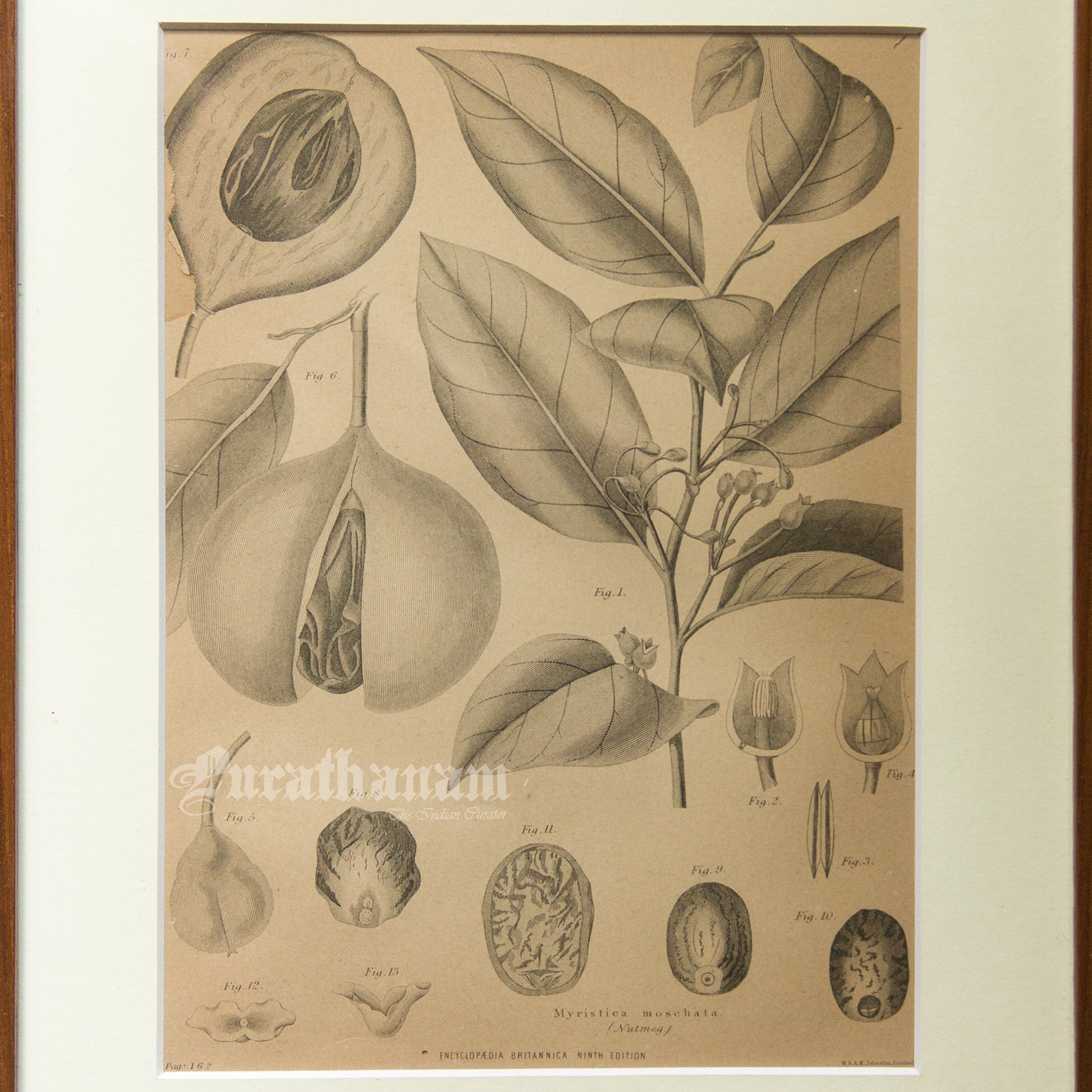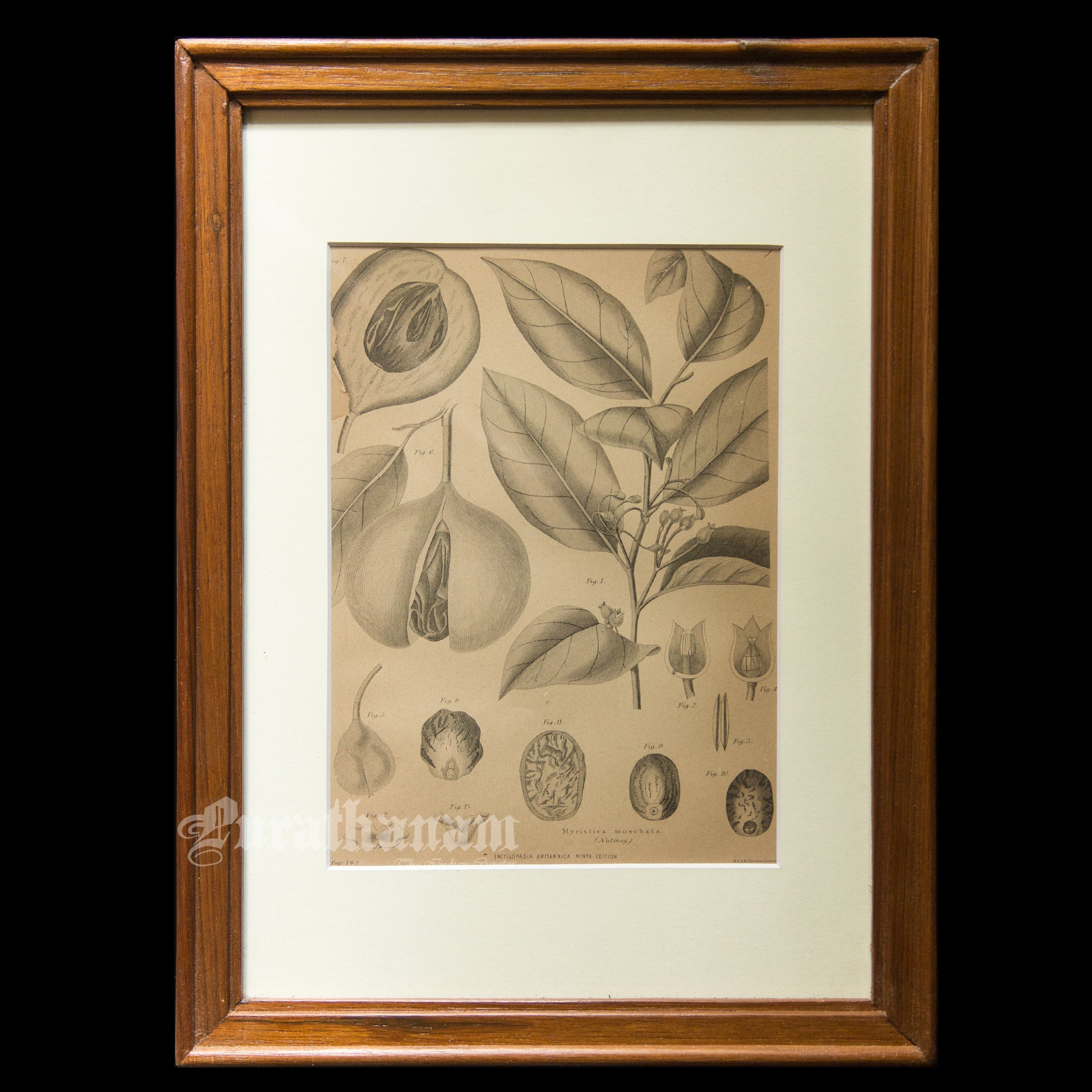 Here is an antique steel engraved black and white botanical print of Myristica Moschata (Nutmeg) by G. Aikman, Edinr for Encyclopedia Britannica 9th Edition. George Aikman (1830–1905) was a Scottish painter and engraver.