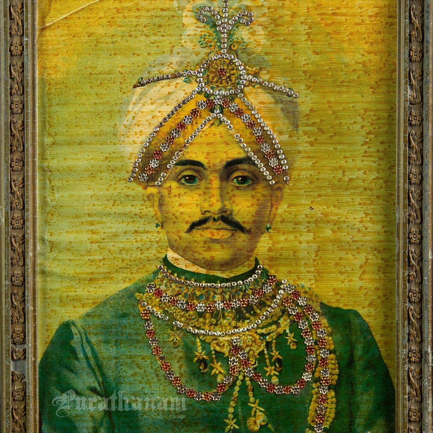 This is an oleograph print from 1920s of Mysore Maharaja by Ravi Varma an Indian who achieved recognition for his depiction of scenes from the epics of the Mahabharata and Ramayana.