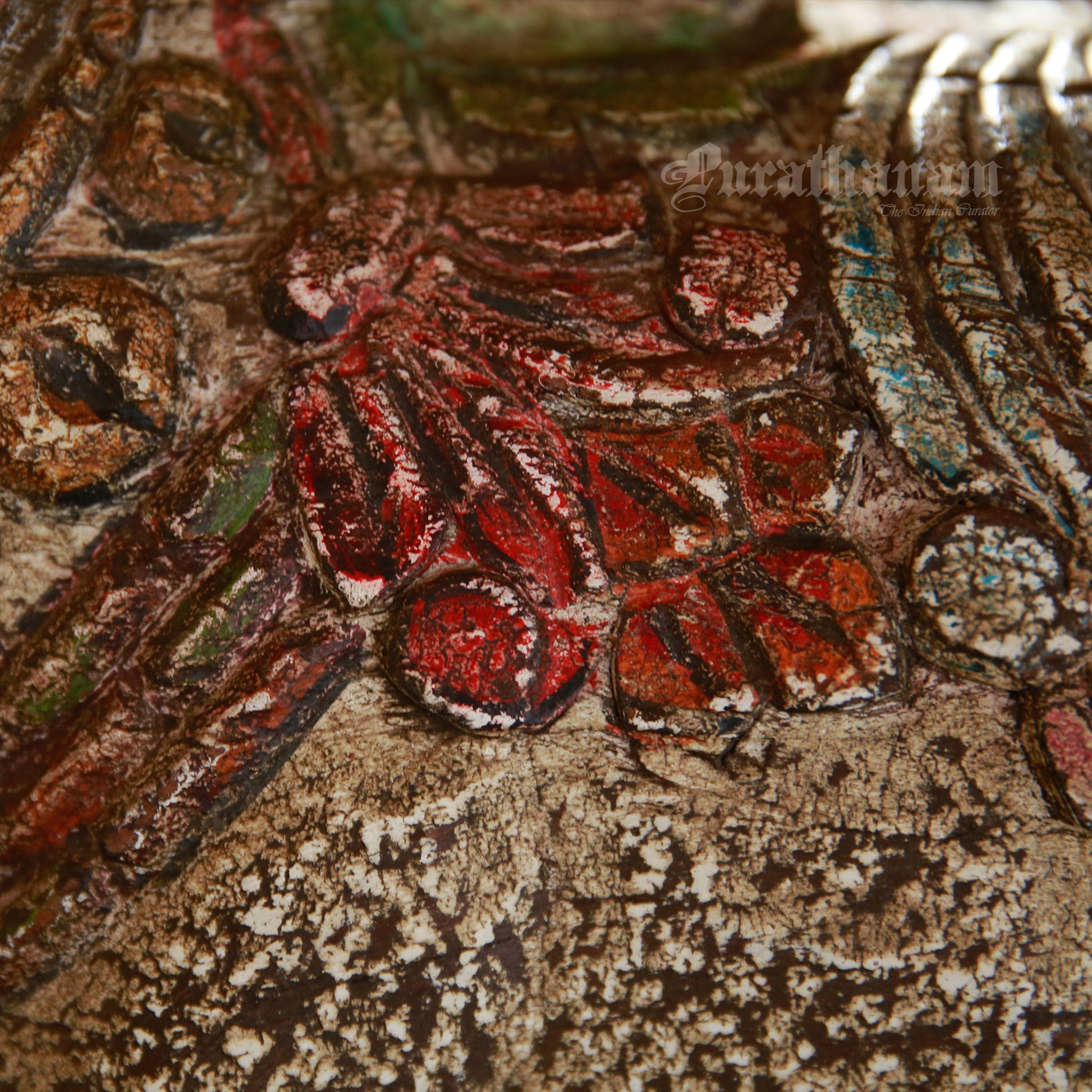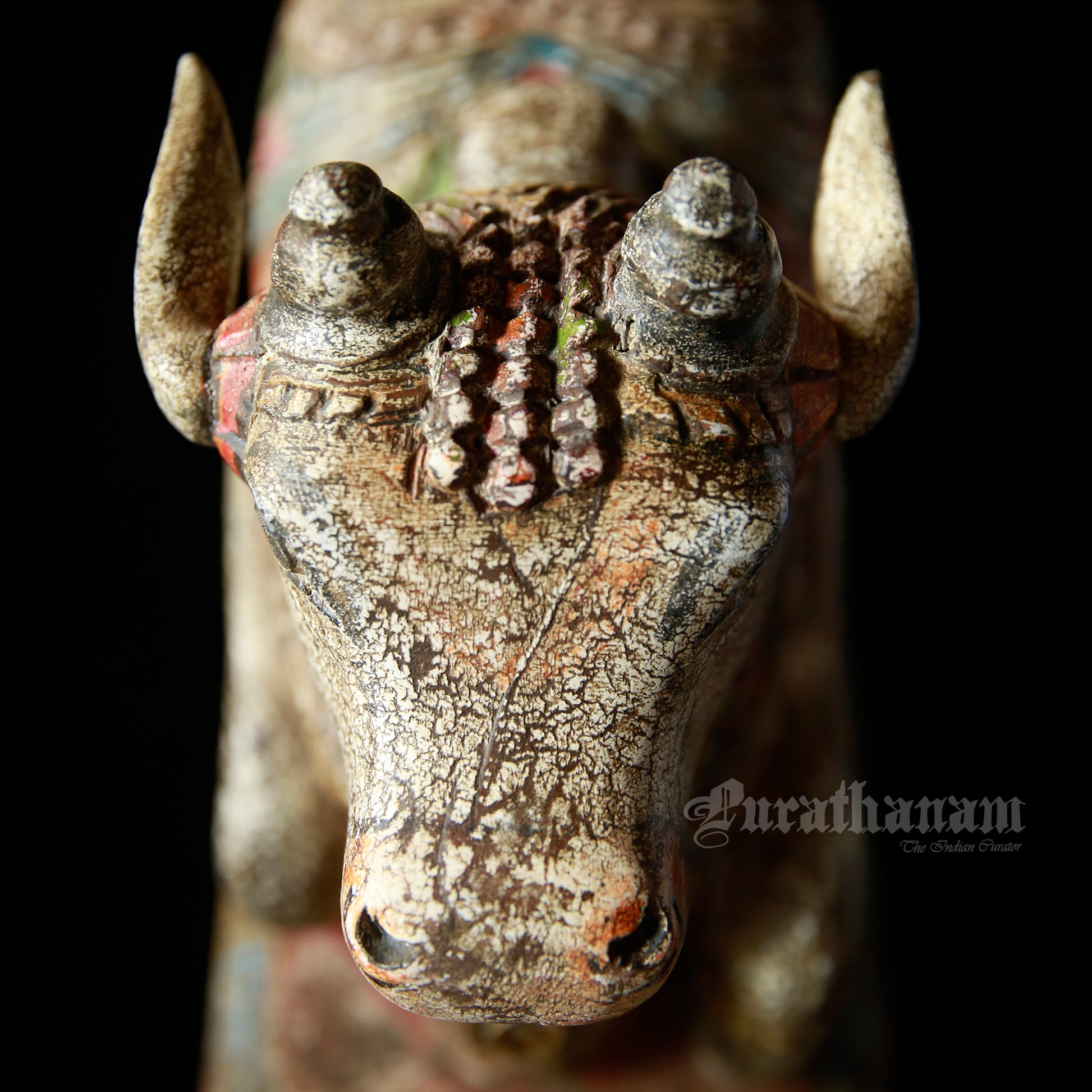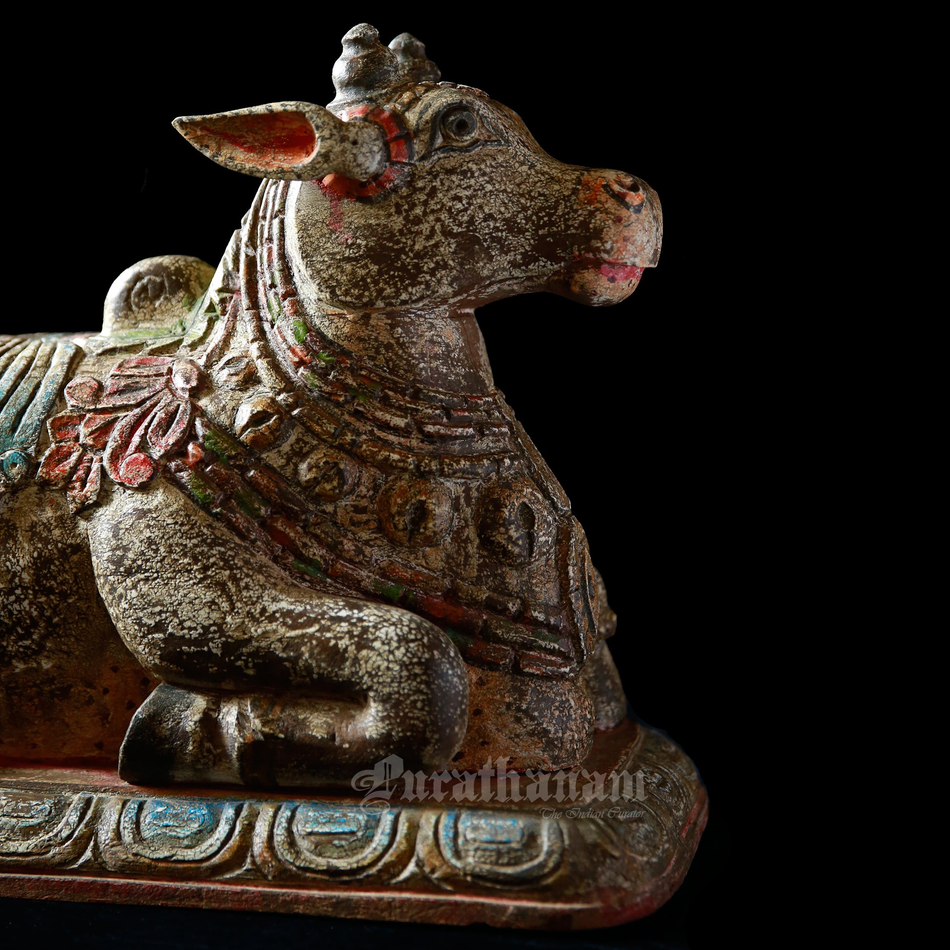 Here we have a brilliant piece with not just immaculate detail in the wood carvings but also boasts a wood polychrome style on it. Such pieces make for the symbol of tradition and art of this land. Nandhi is the guardian deity of Kailasa where the deity Shiva lives. It is believed that those wishes that reach Nandhi reach Shiva. Hence worshipers in the temples of South India whisper their wishes in the ear of Nandhi. Imagine all the wishes this Nandhi has heard. The Nandhi we have here is a solid piece made of teakwood. Get this one for an scintillating traditional ambiance.