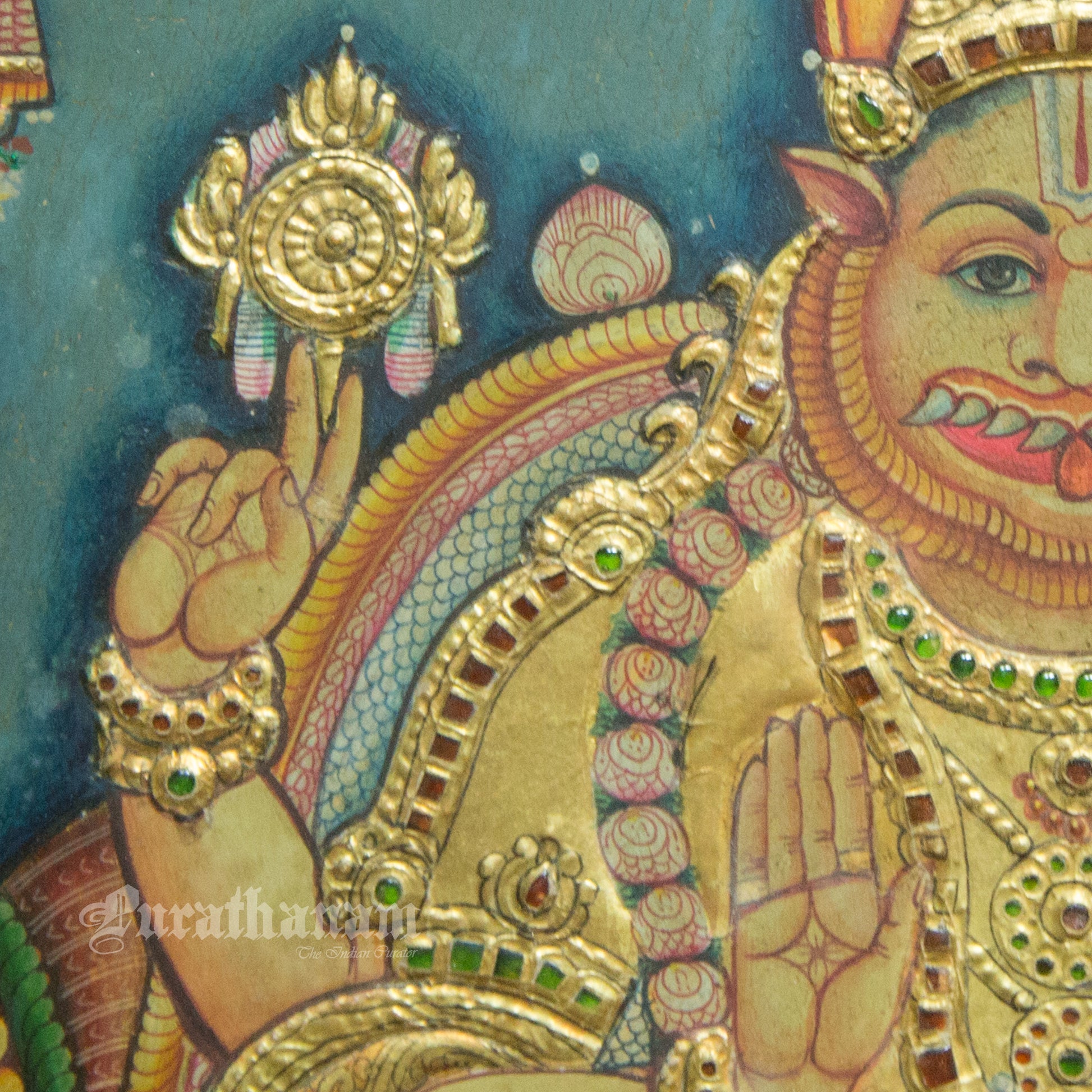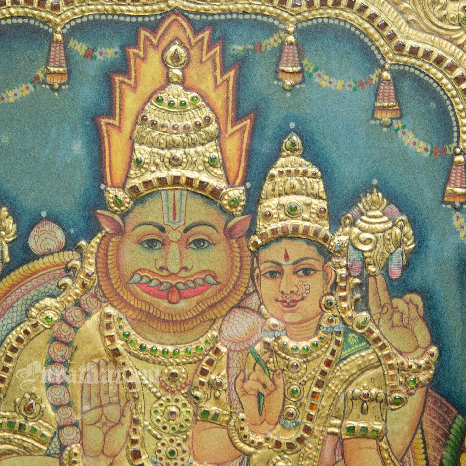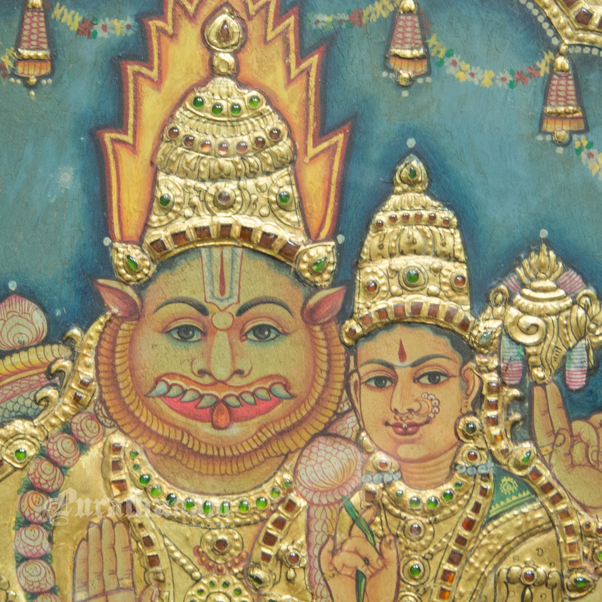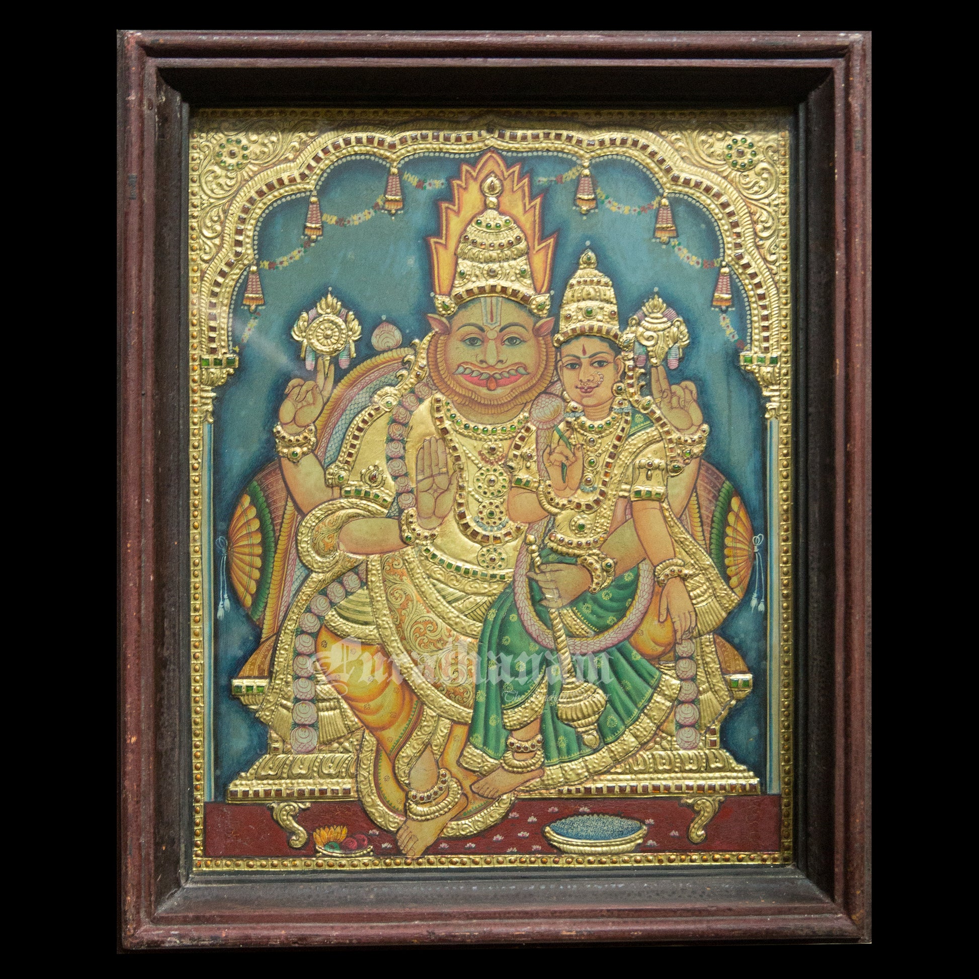 Here is a beautiful Tanjore painting of Narasimha and his wife Lakshmi. Narasimha ( 'man-lion' ) is a fierce avatar of the Hindu god Vishnu.