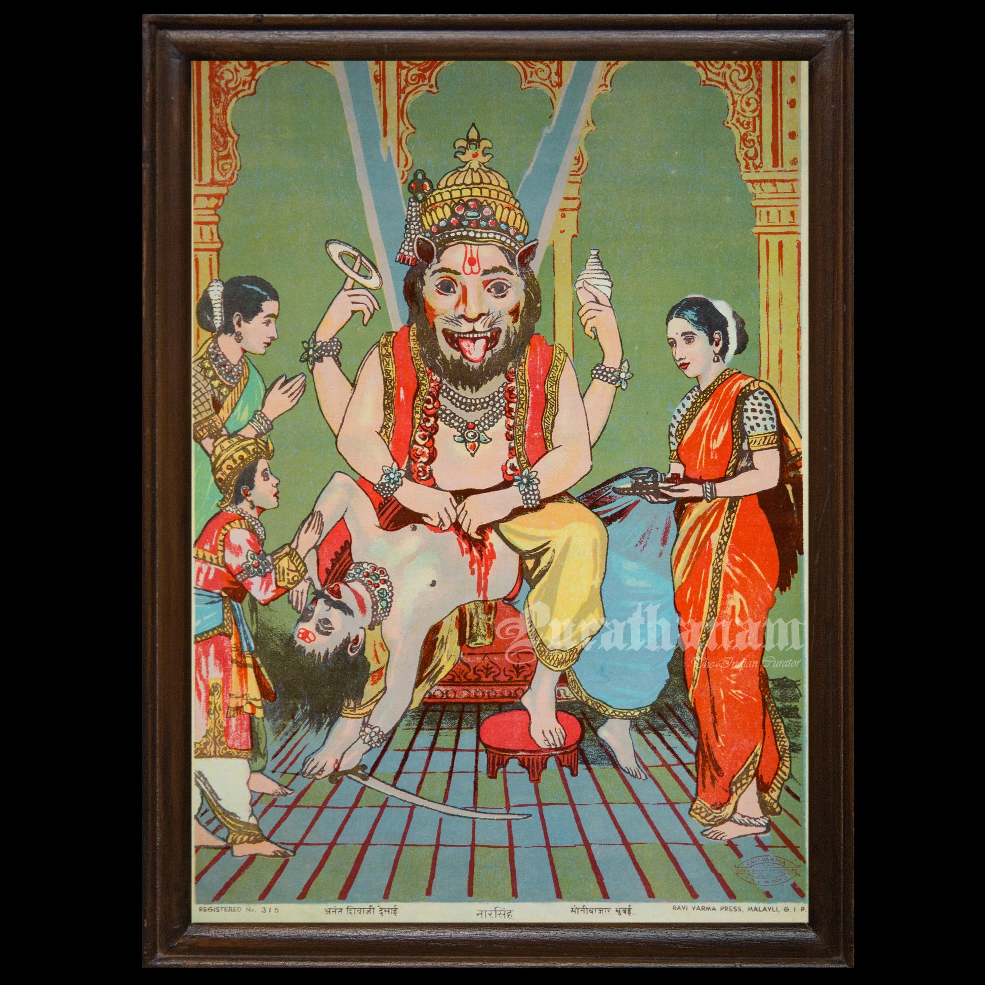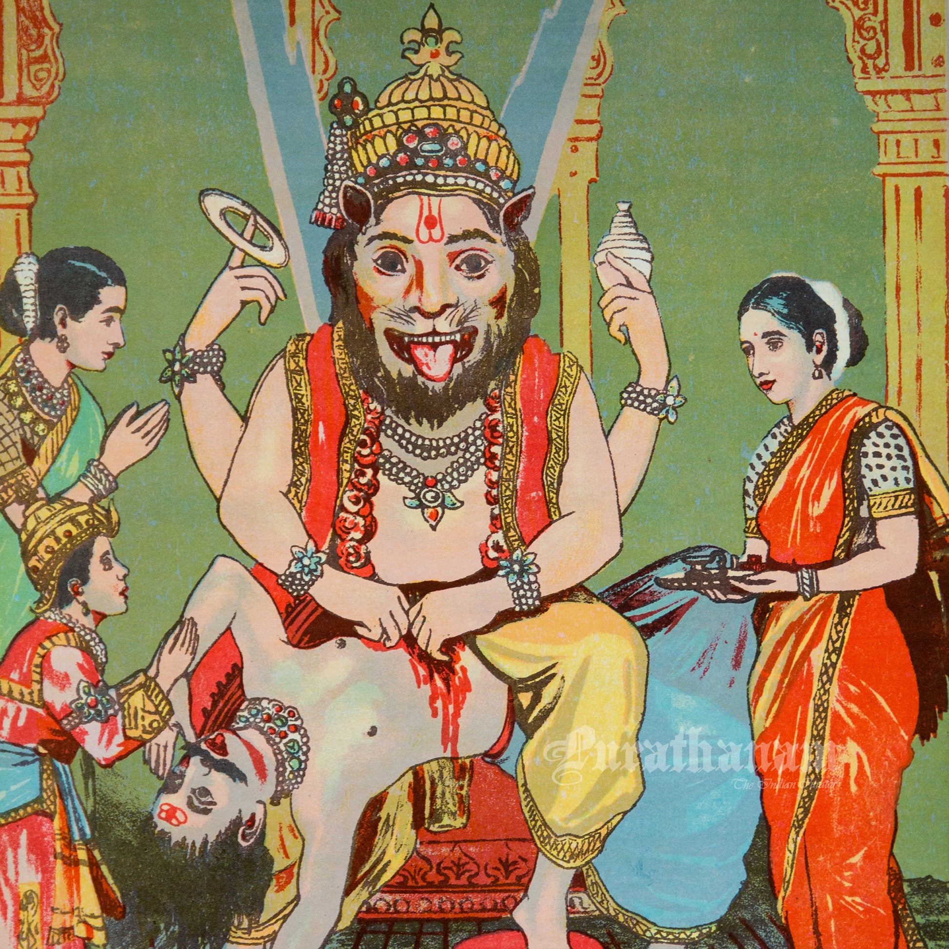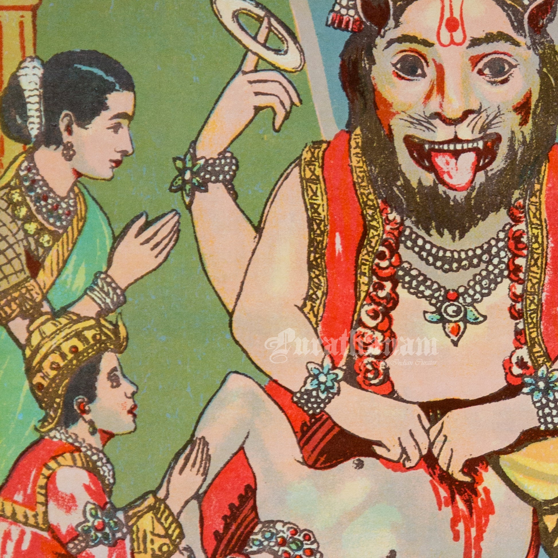 This is an oleograph print from 1920s - 1930s of Narasimha by Ravi Varma an Indian who achieved recognition for his depiction of scenes from the epics of the Mahabharata and Ramayana.