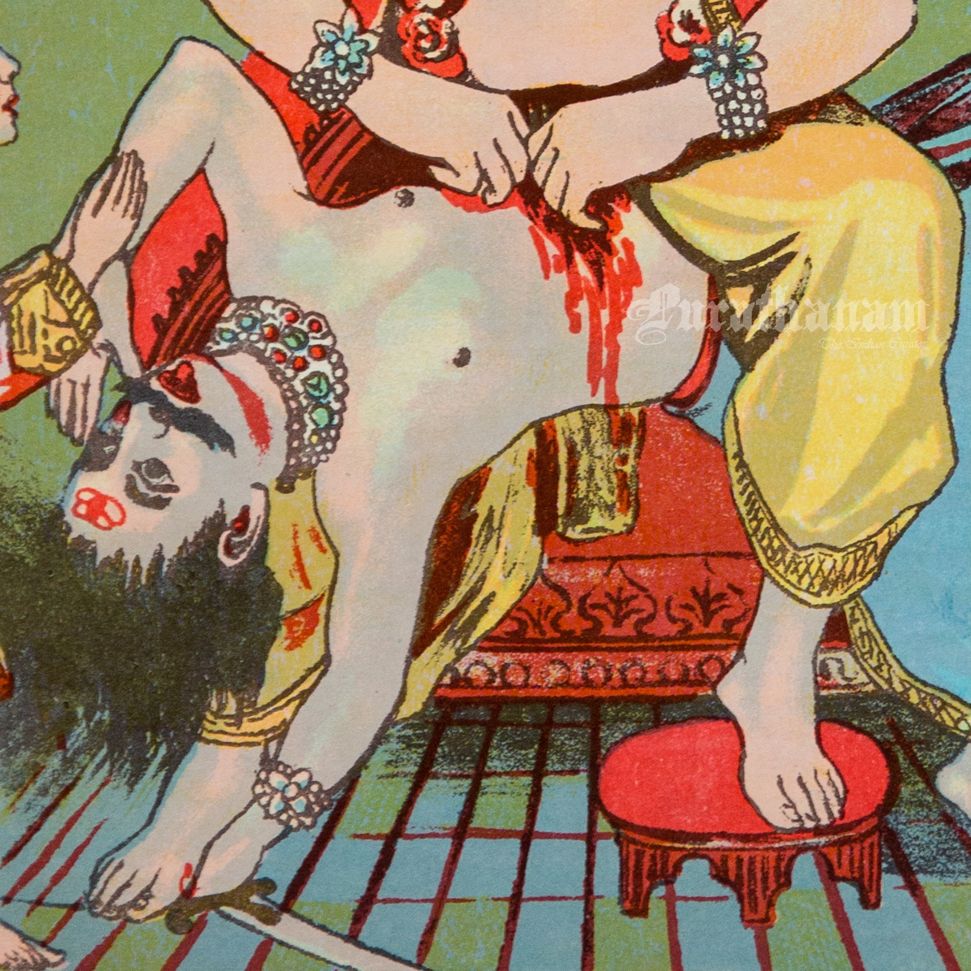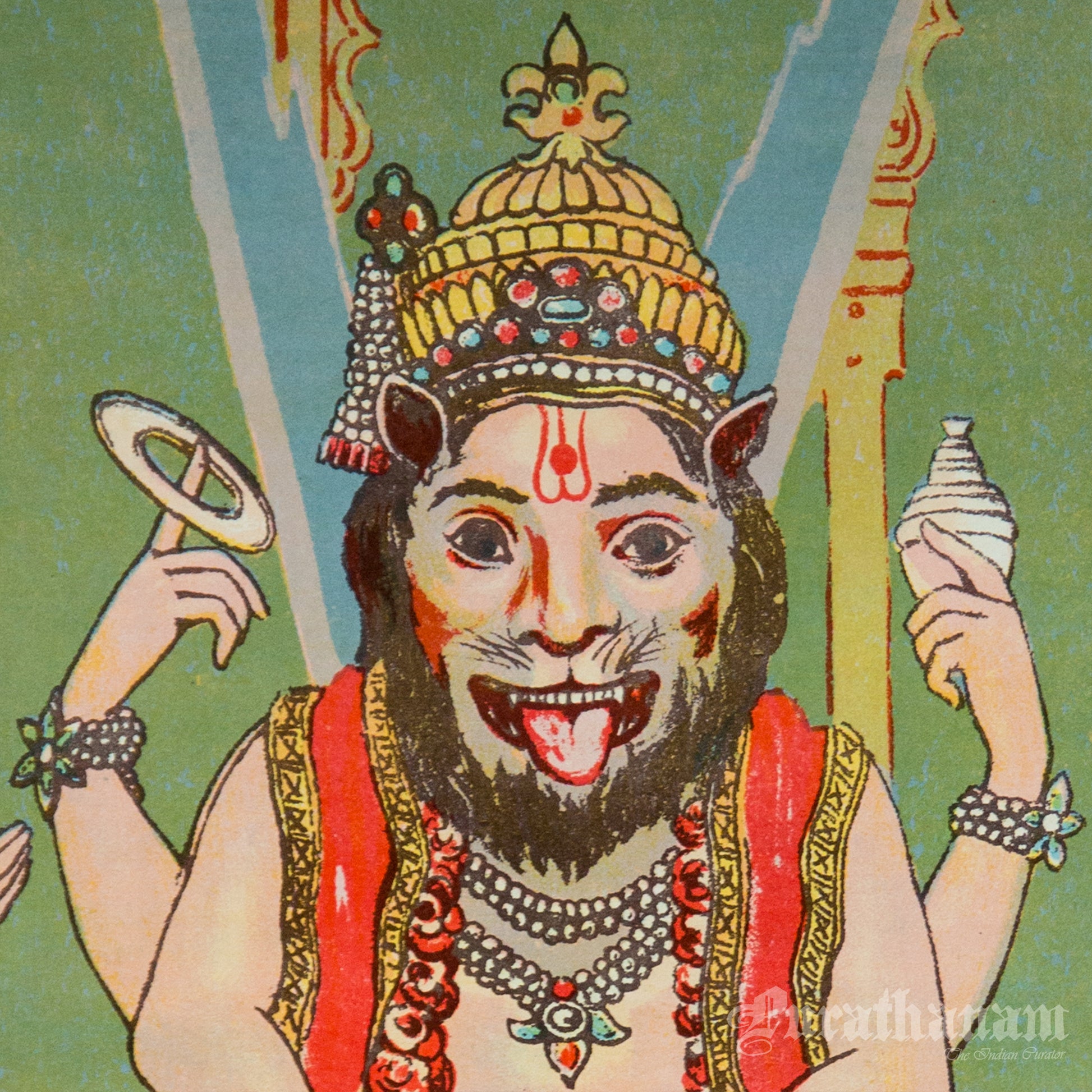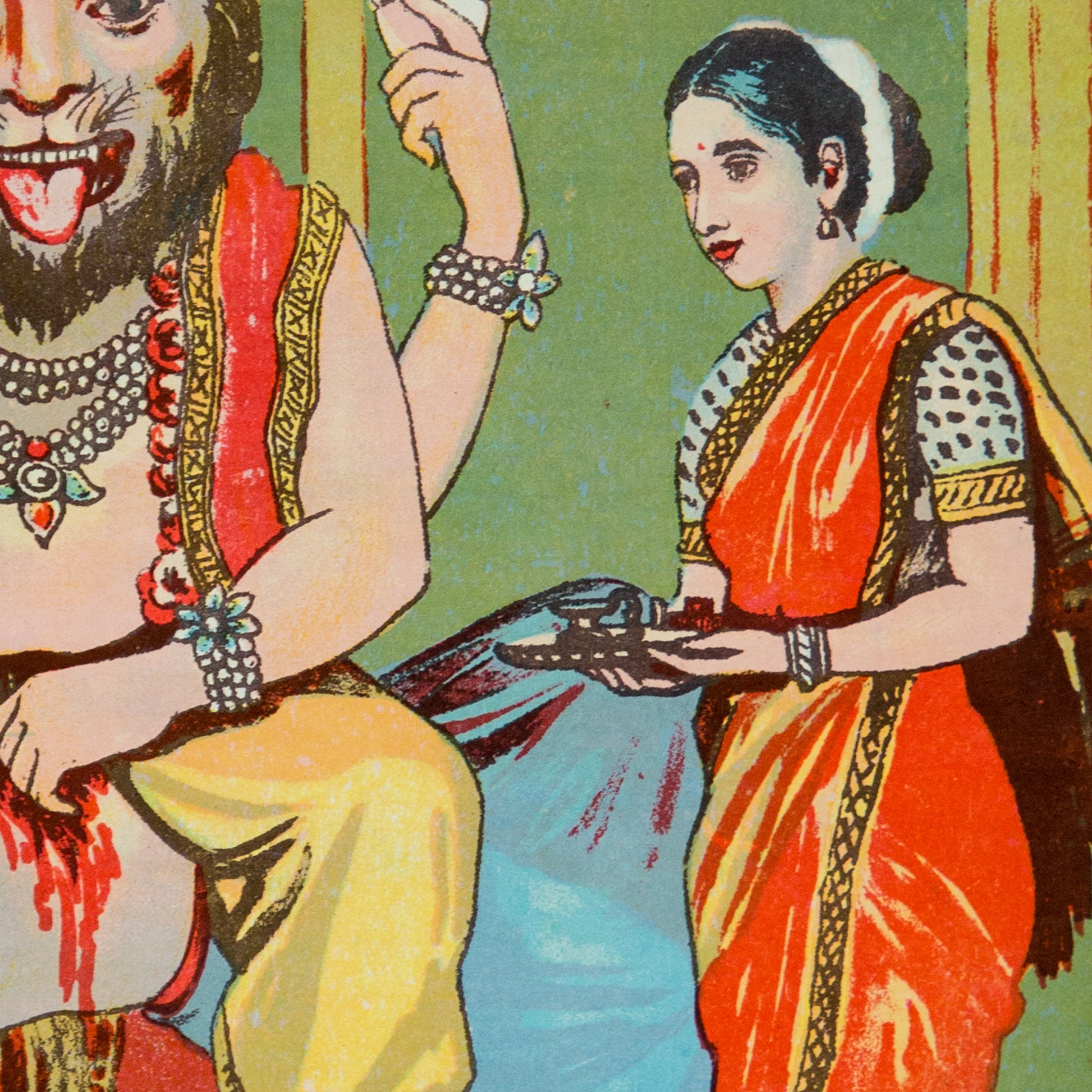This is an oleograph print from 1920s - 1930s of Narasimha by Ravi Varma an Indian who achieved recognition for his depiction of scenes from the epics of the Mahabharata and Ramayana.