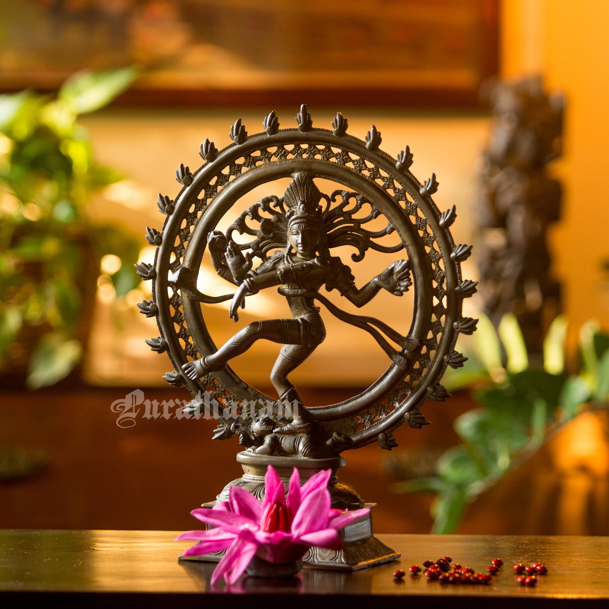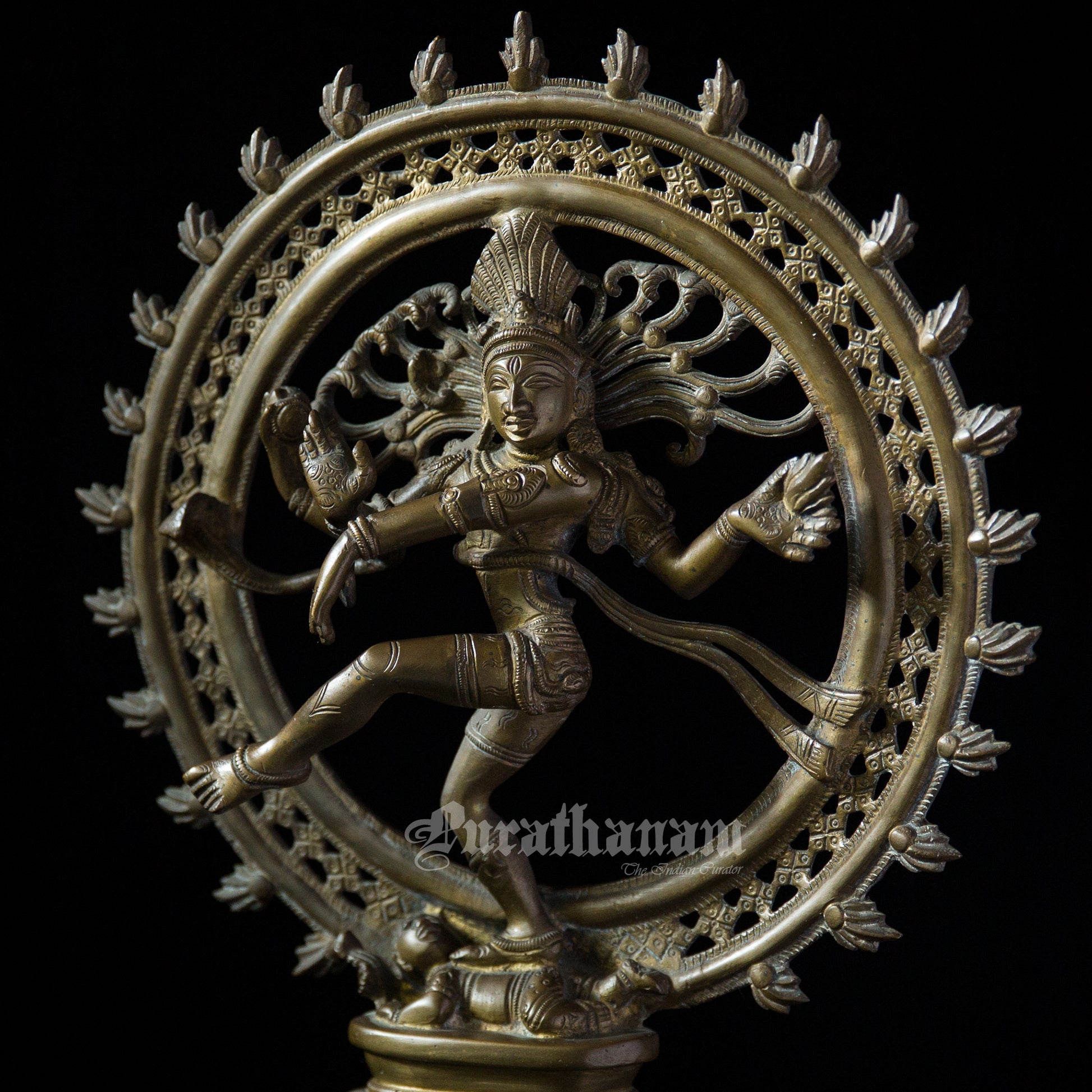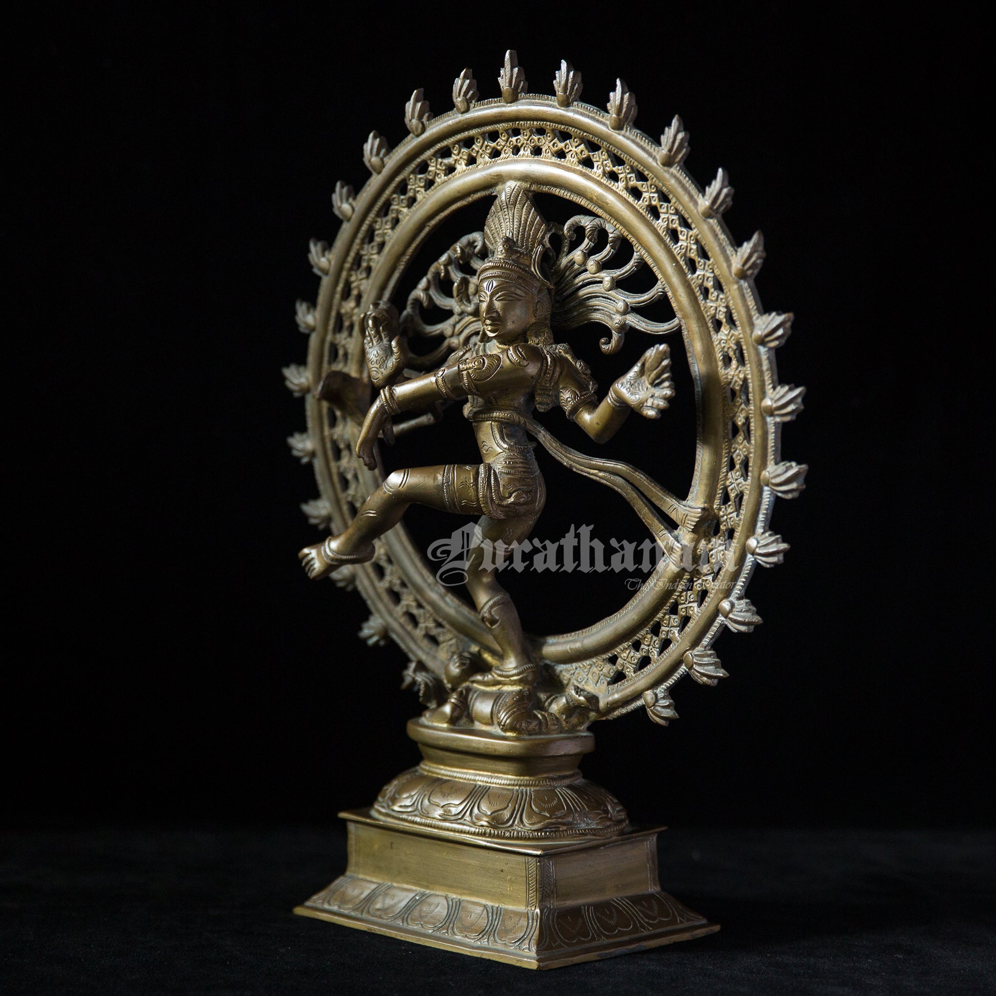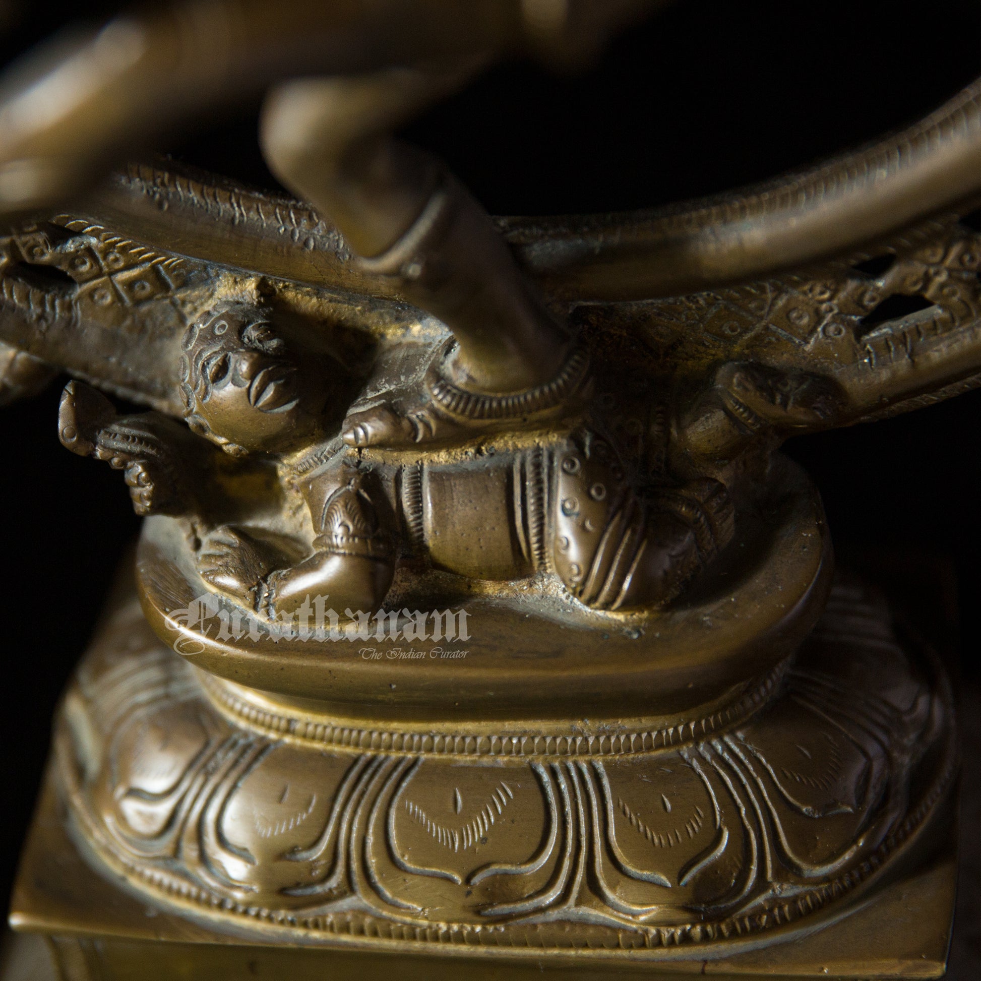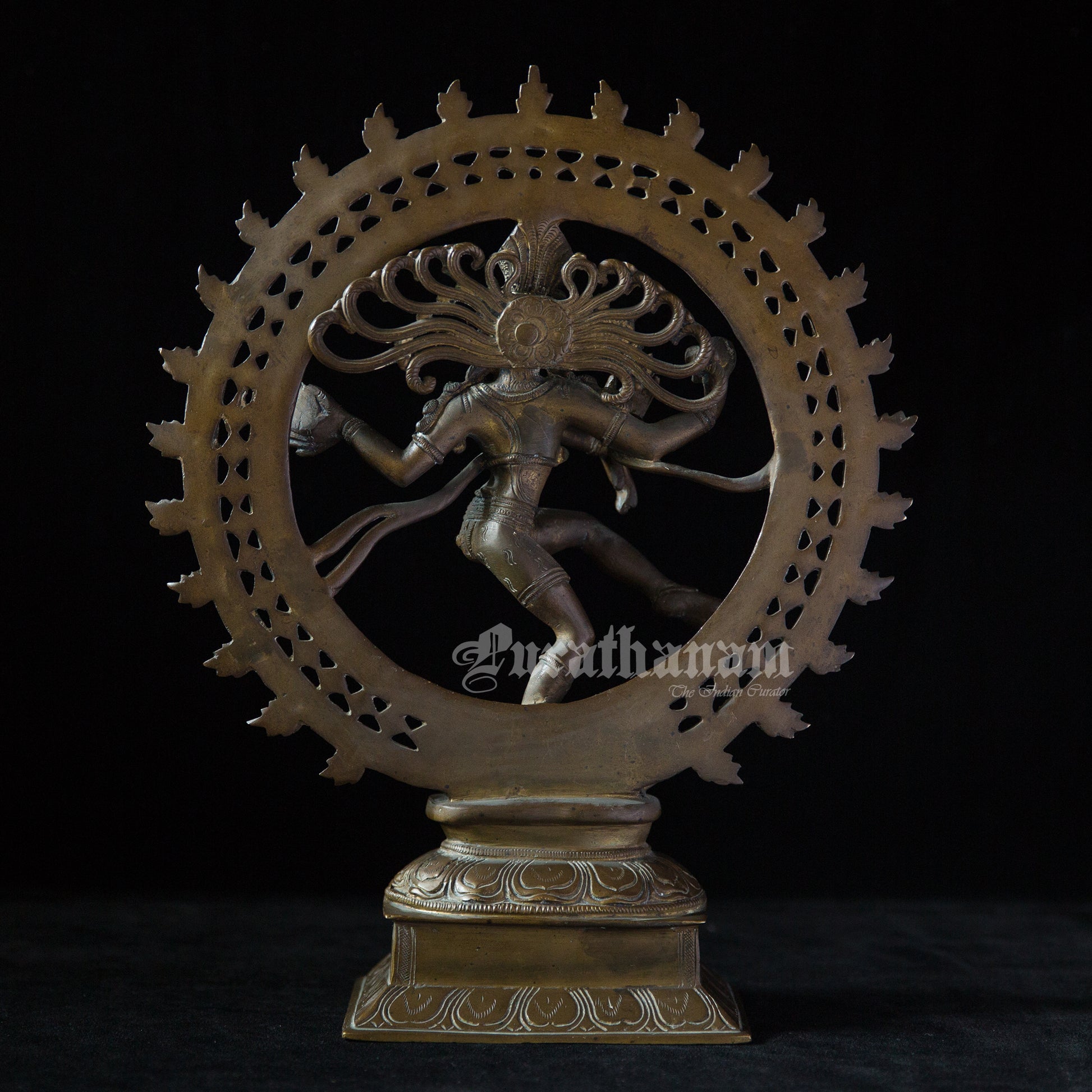 This beautiful Natarajar is made of solid brass using a cast. This method was first used in the 70's but very prevalent in the 80's. It is 30 years old and all the way from Tamil Nadu