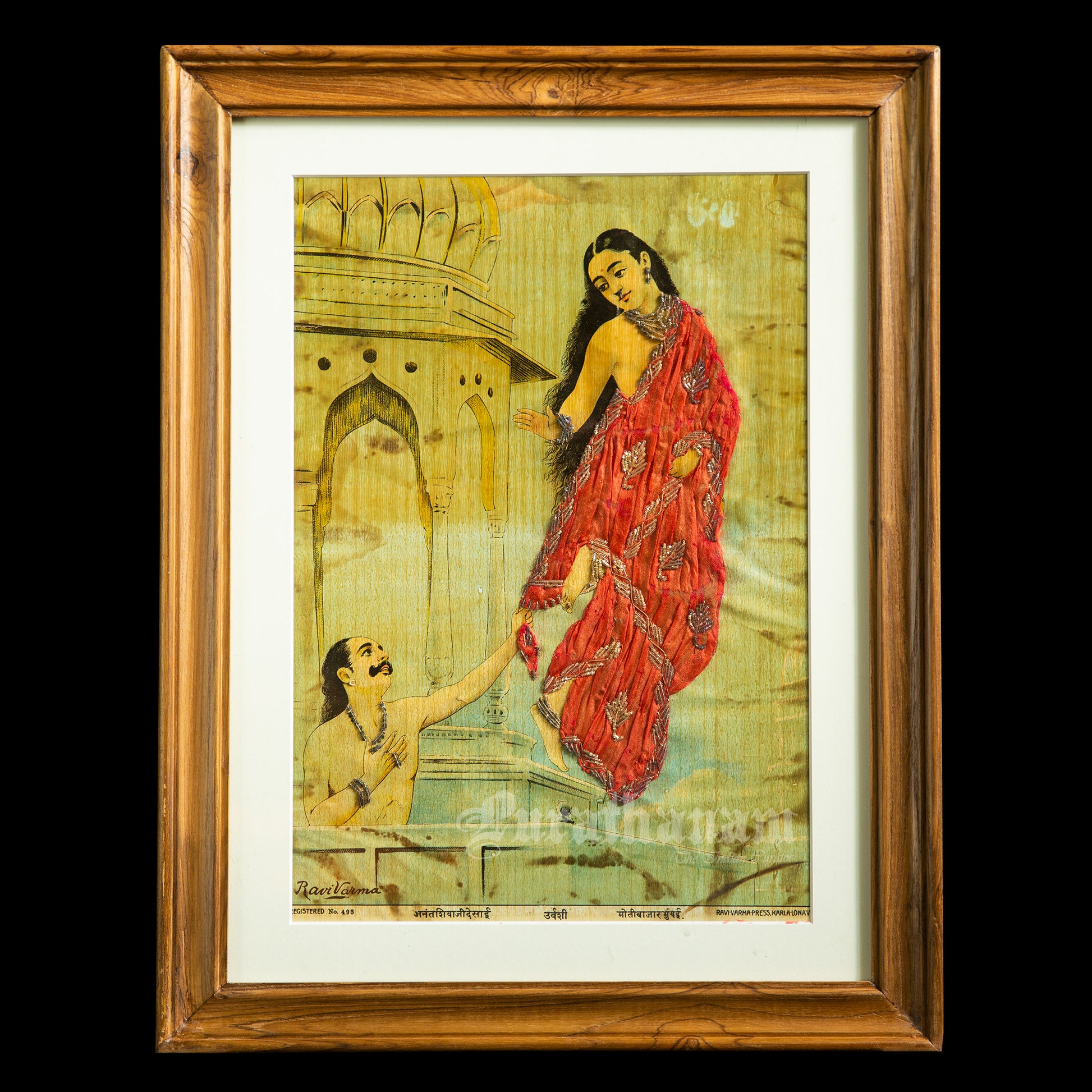 This is an oleograph print from 1920s of Oorvasi and Pururavas by Ravi Varma an Indian who achieved recognition for his depiction of scenes from the epics of the Mahabharata and Ramayana.
