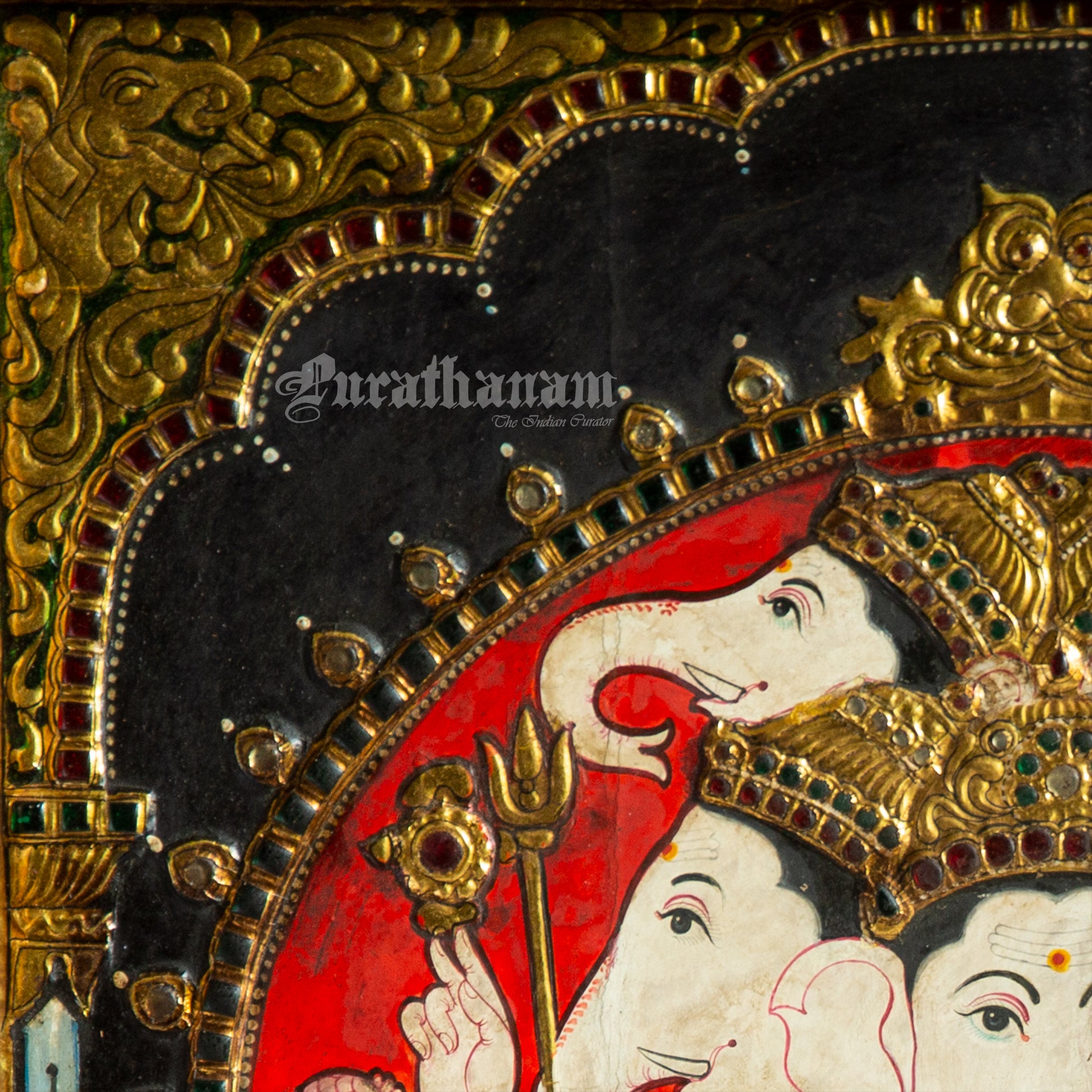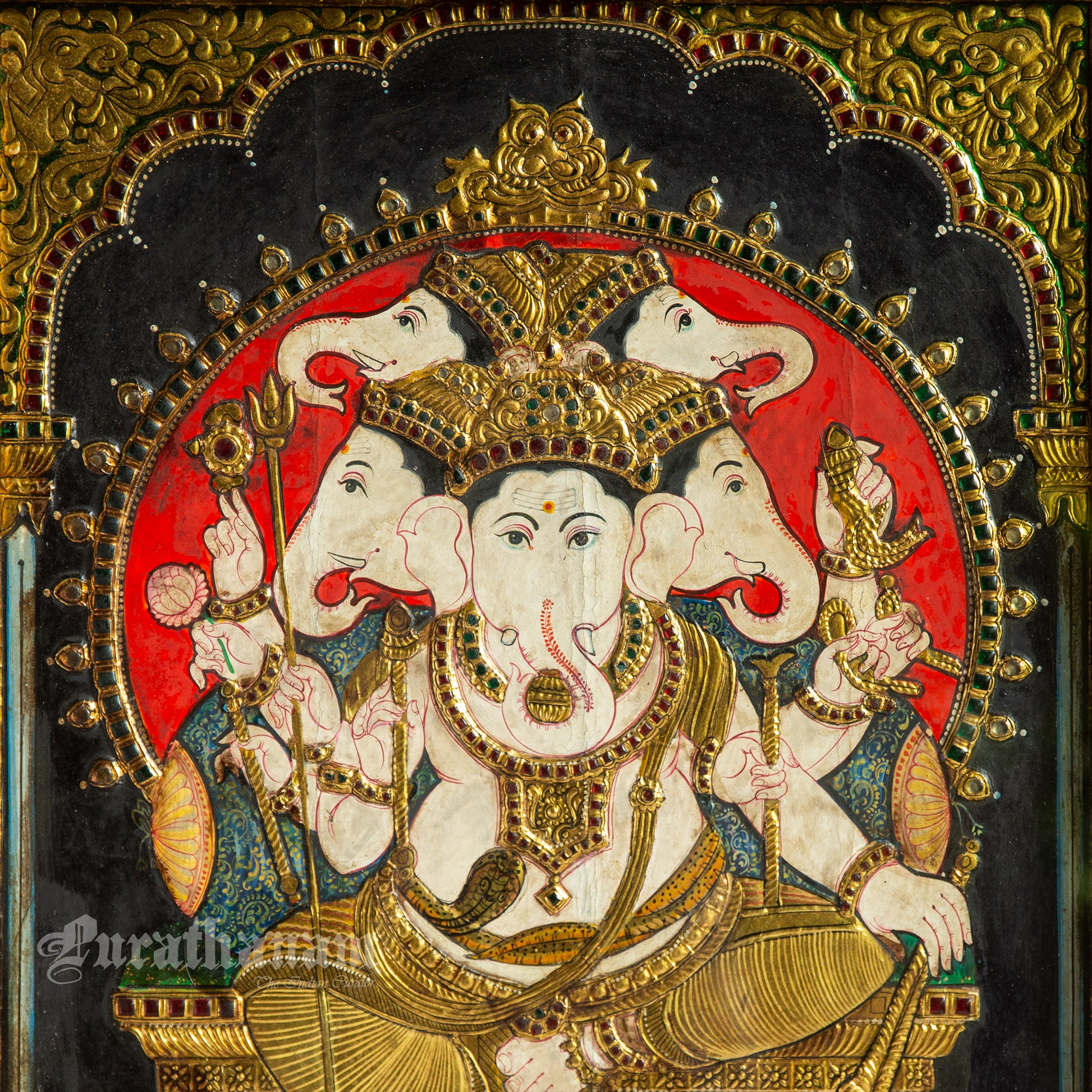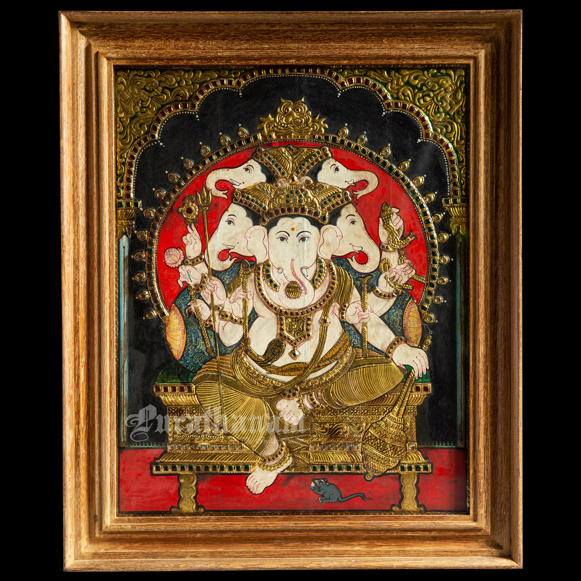 Here is a vintage Tanjore painting featuring Panchamukhi Ganesha accompanied by his Vahana, Dinka the rat (Mushika). Panchamukhi Vinayaga or Ganesha holds great popularity in Southern India, particularly in Thiruvarur, Tamizhnadu, where the 'Thiyagaraja Swamy Temple' houses a dedicated shrine for this deity.