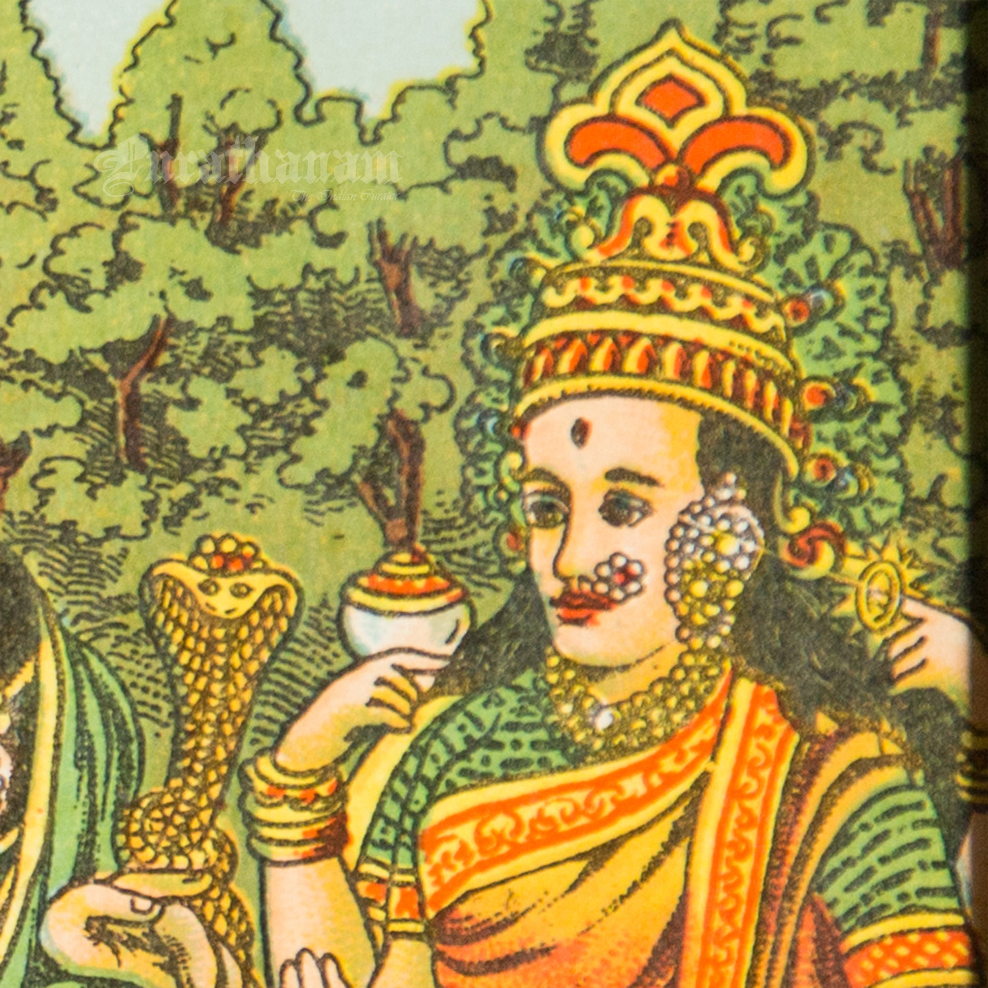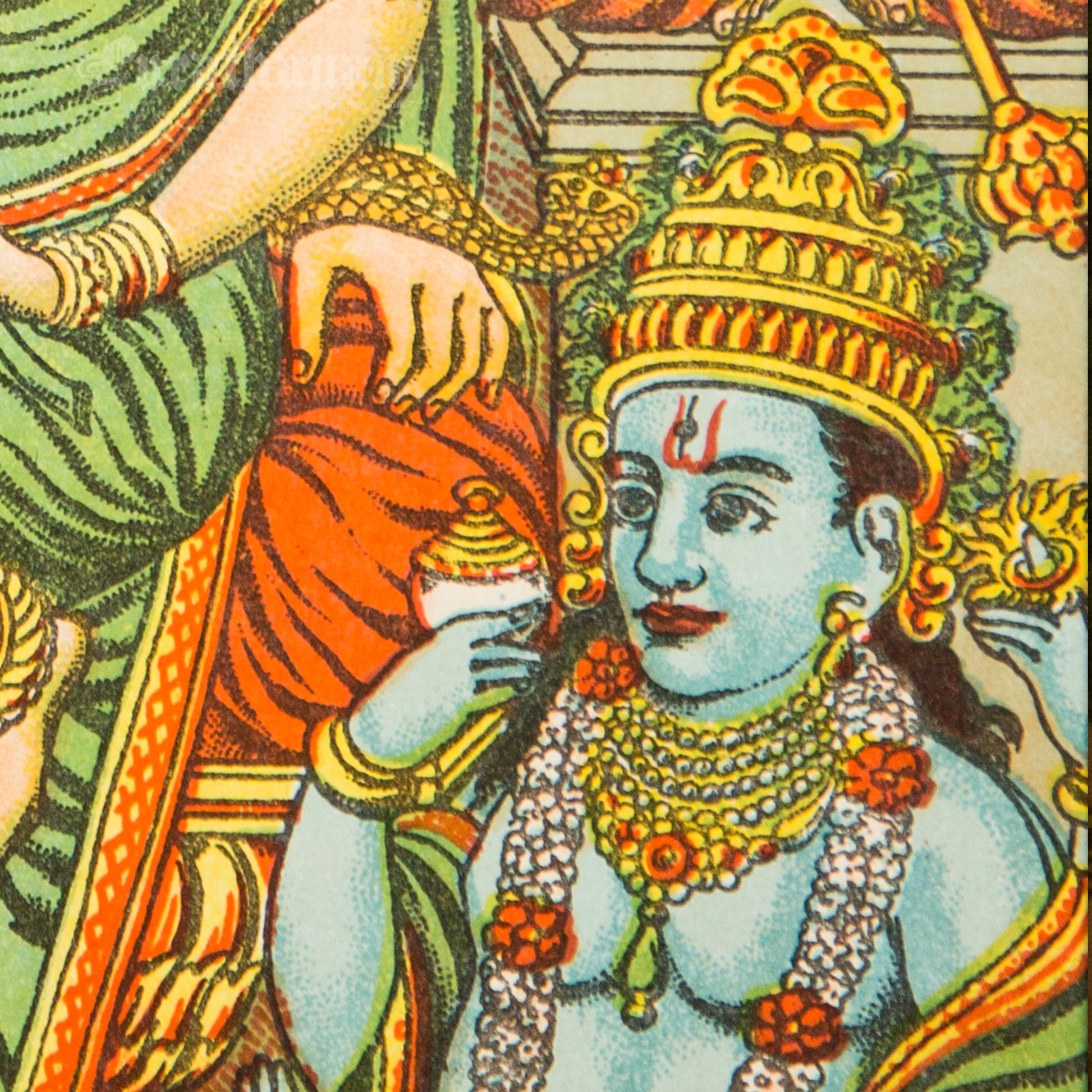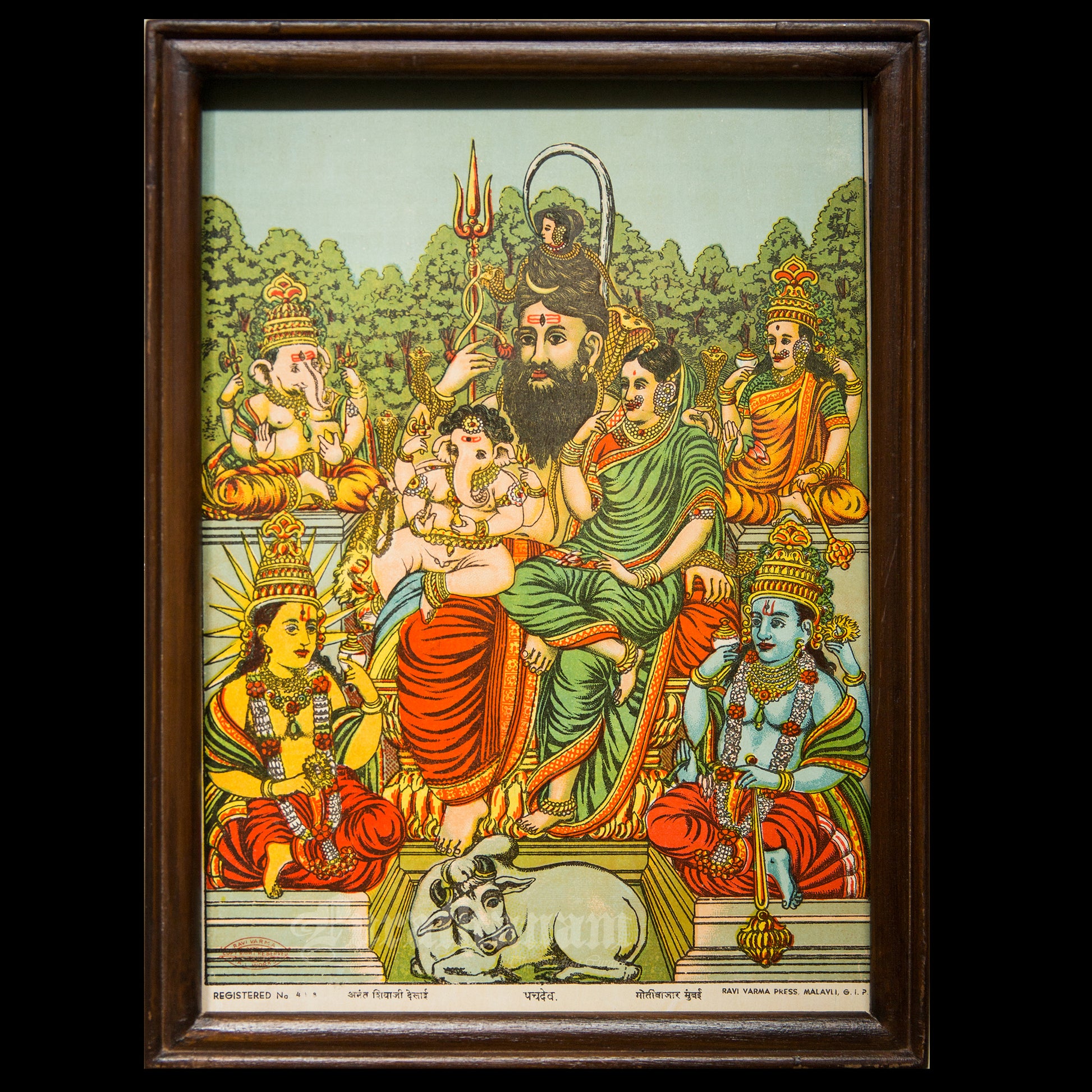 This is an oleograph print from 1920s- 1930s of Panchdev by Ravi Varma an Indian painter who achieved recognition for his depiction of scenes from the epics of the Mahabharata and Ramayana.