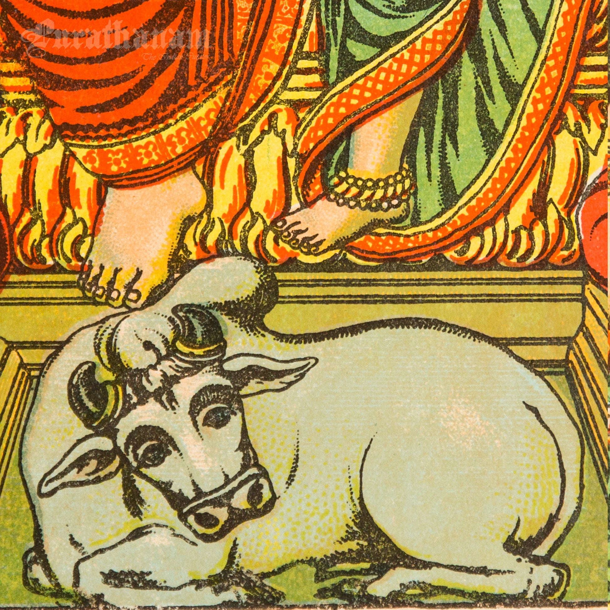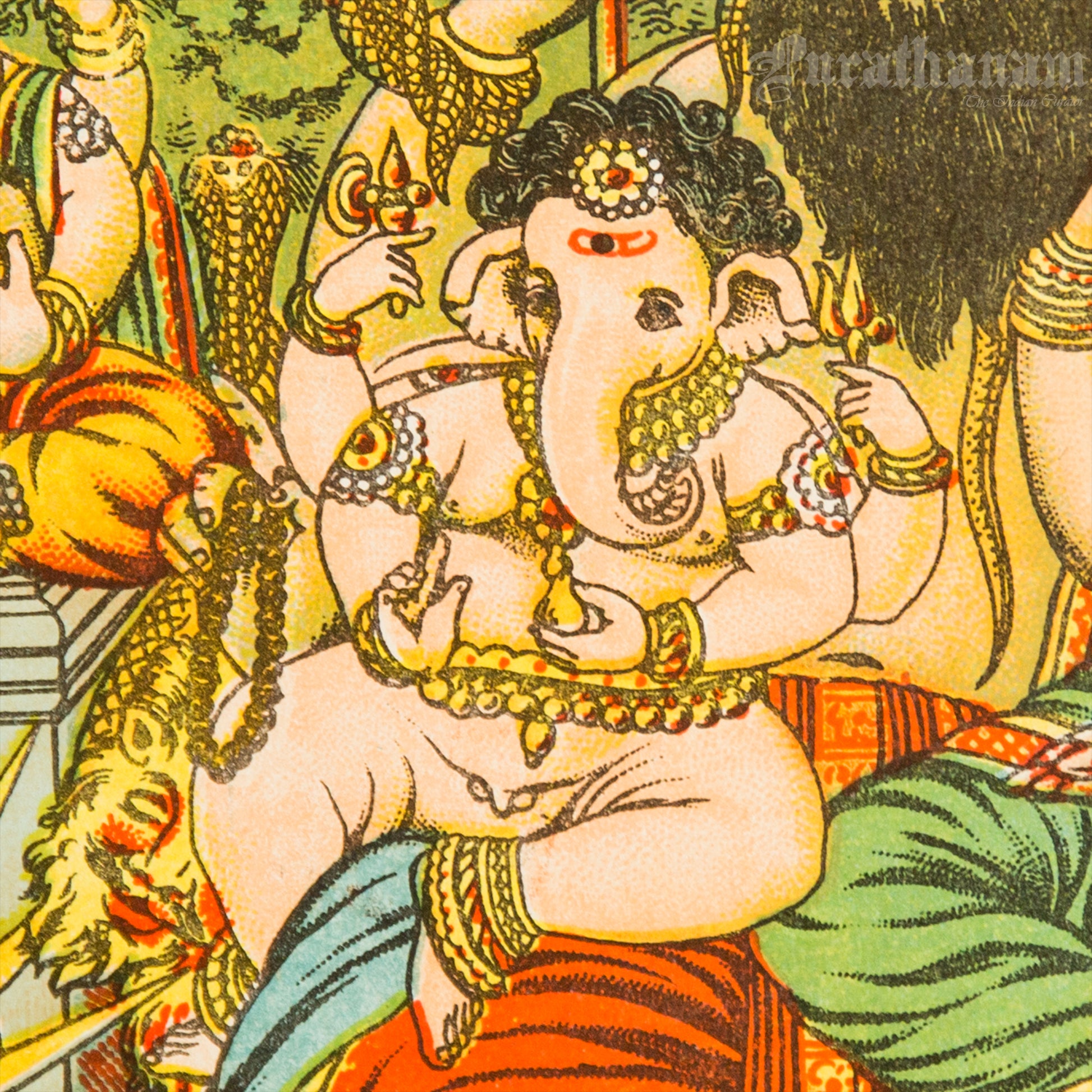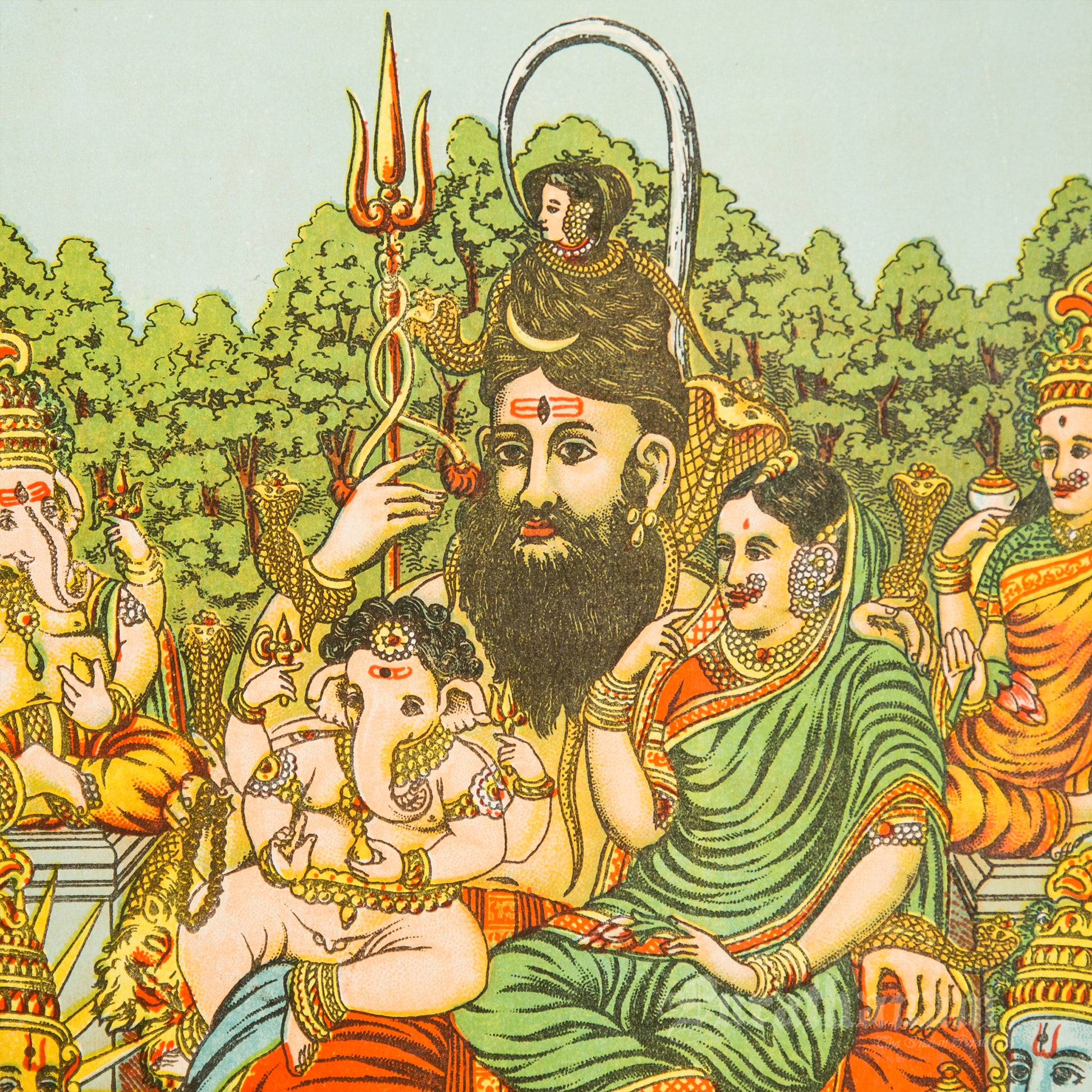 This is an oleograph print from 1920s- 1930s of Panchdev by Ravi Varma an Indian painter who achieved recognition for his depiction of scenes from the epics of the Mahabharata and Ramayana.