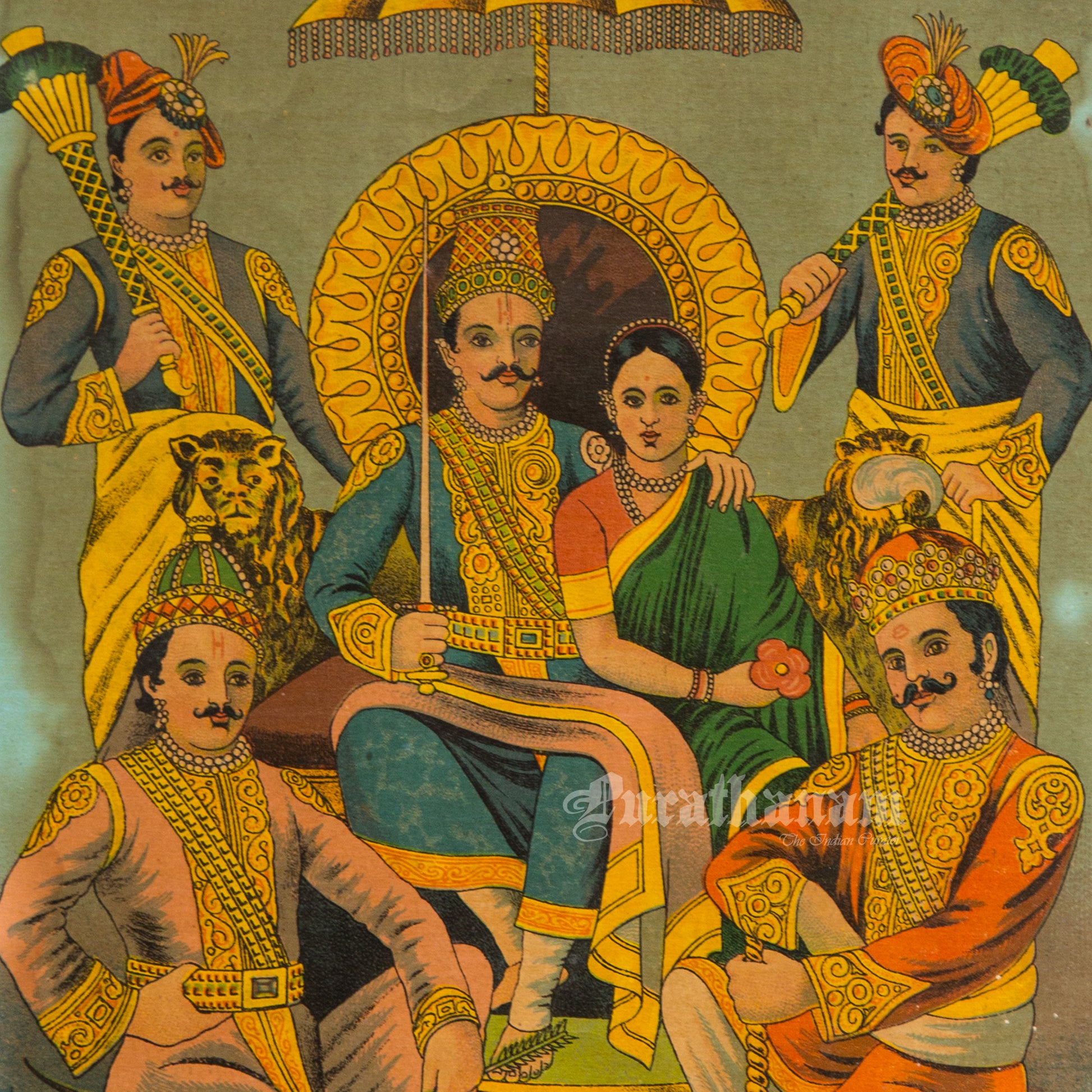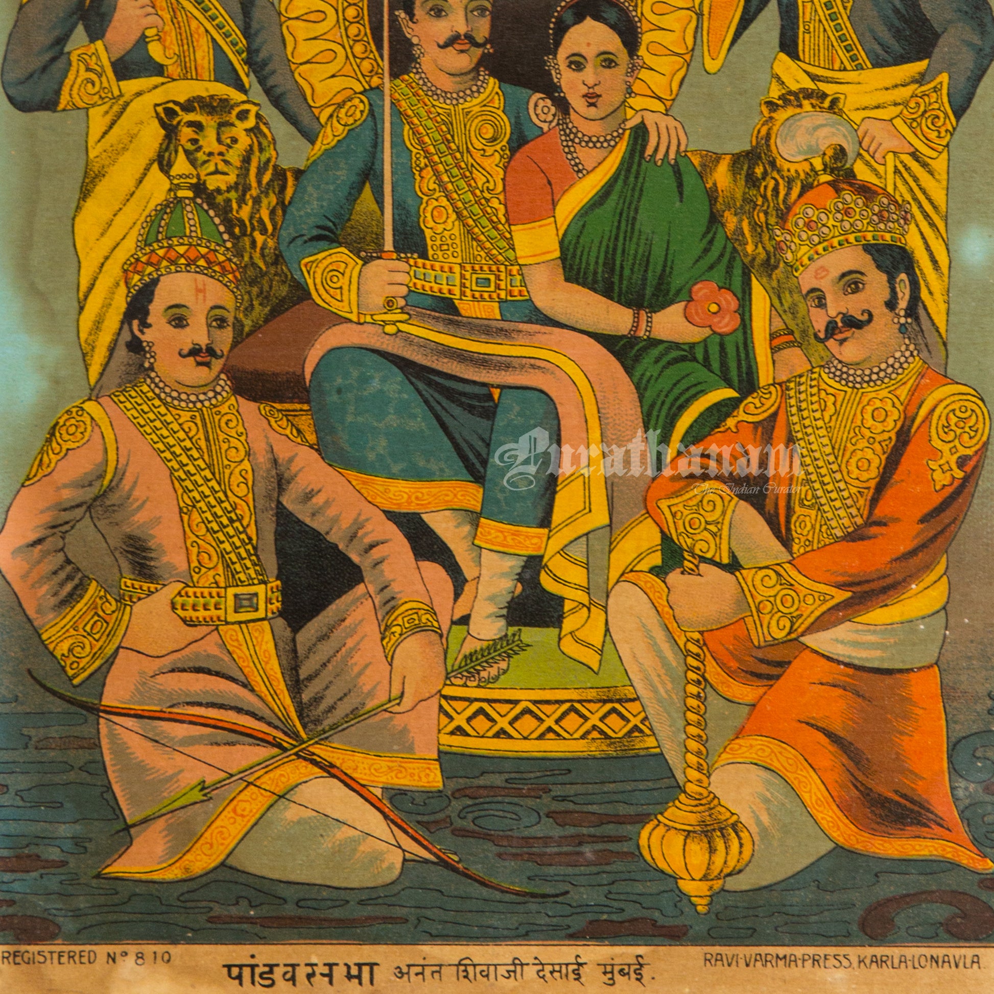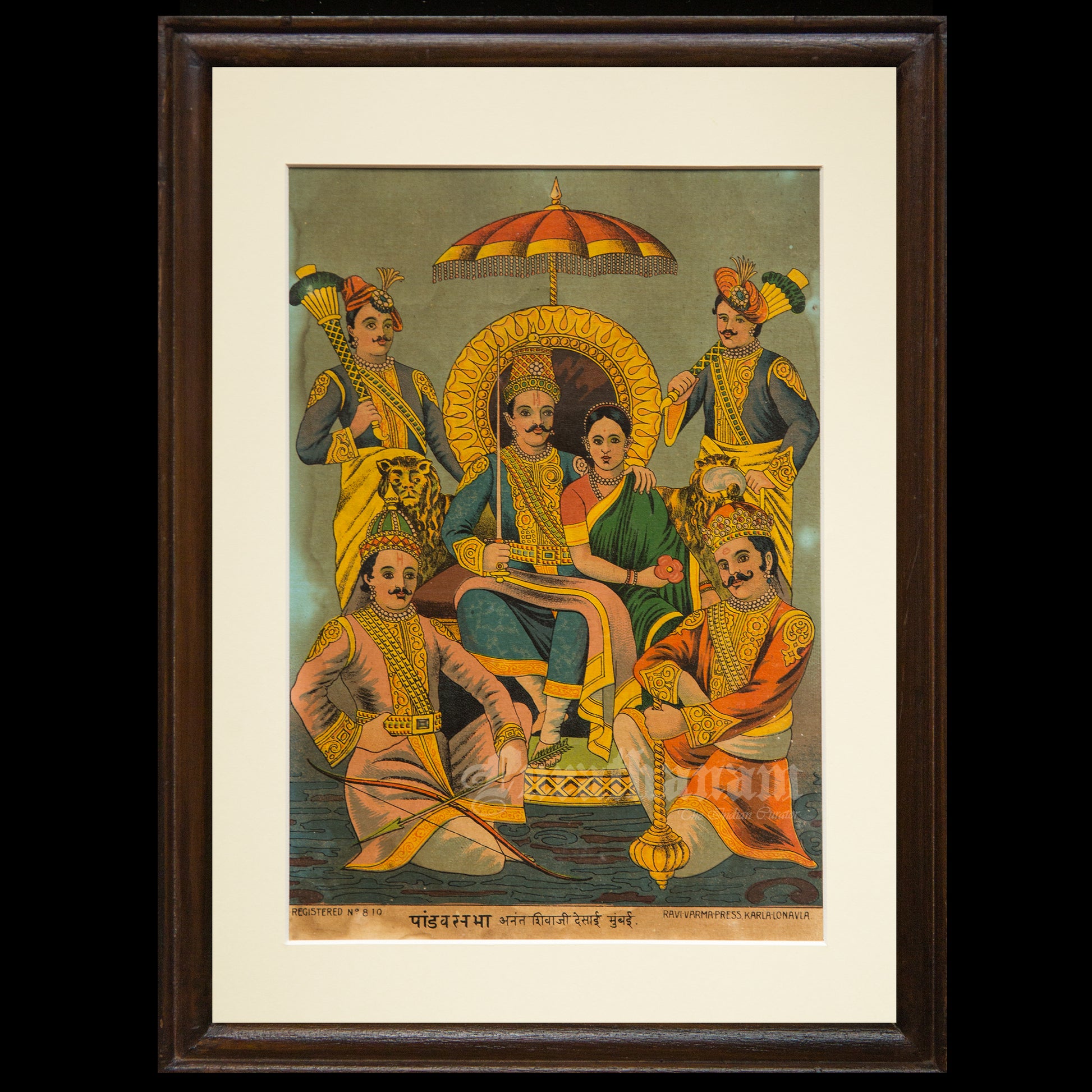 Introducing mini lithograph prints of size 10”x7” from 1920s - 1930s of Pandava Sabha by Ravi Varma an Indian who achieved recognition for his depiction of scenes from the epics of the Mahabharata and Ramayana.