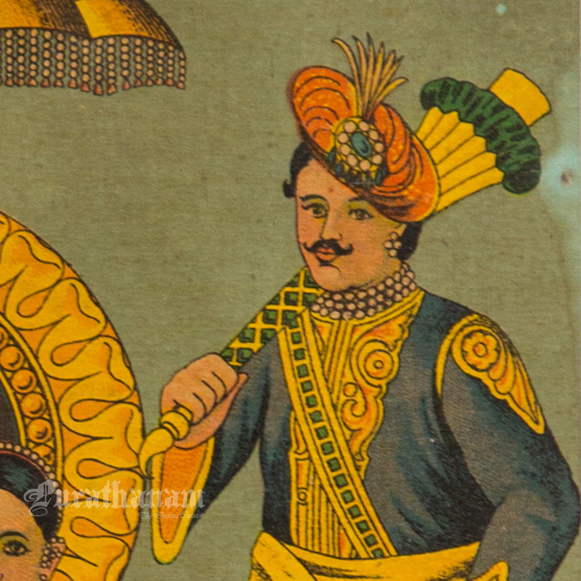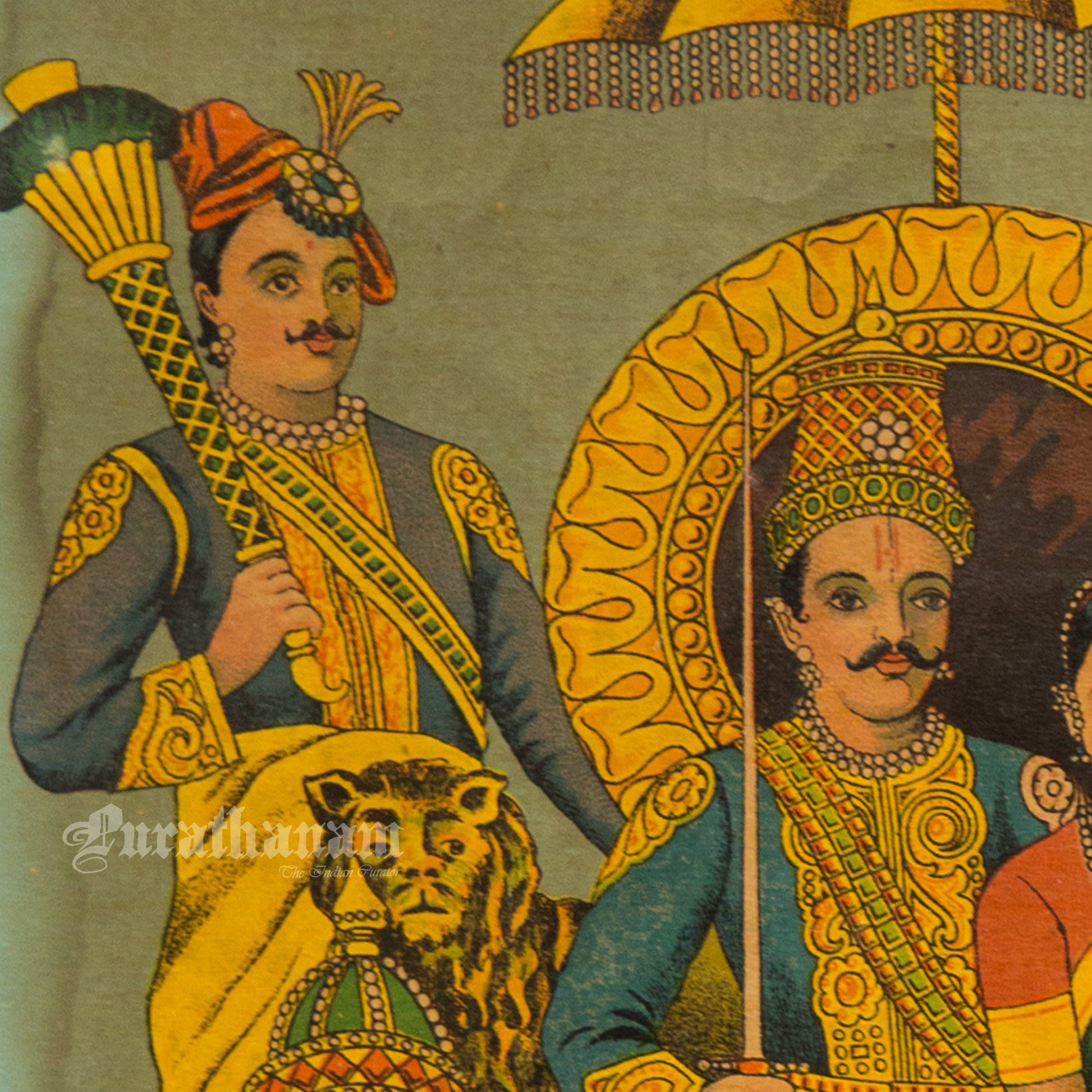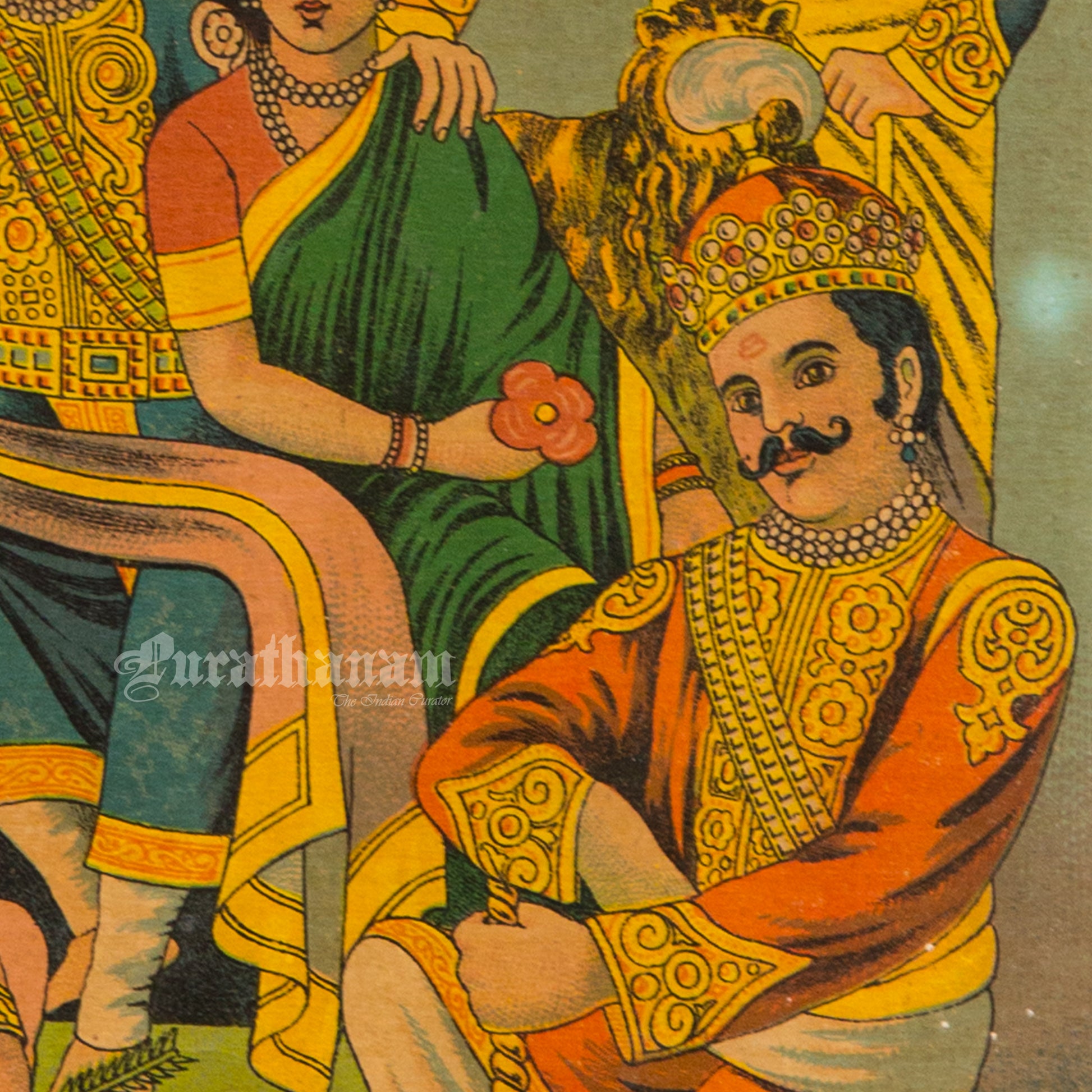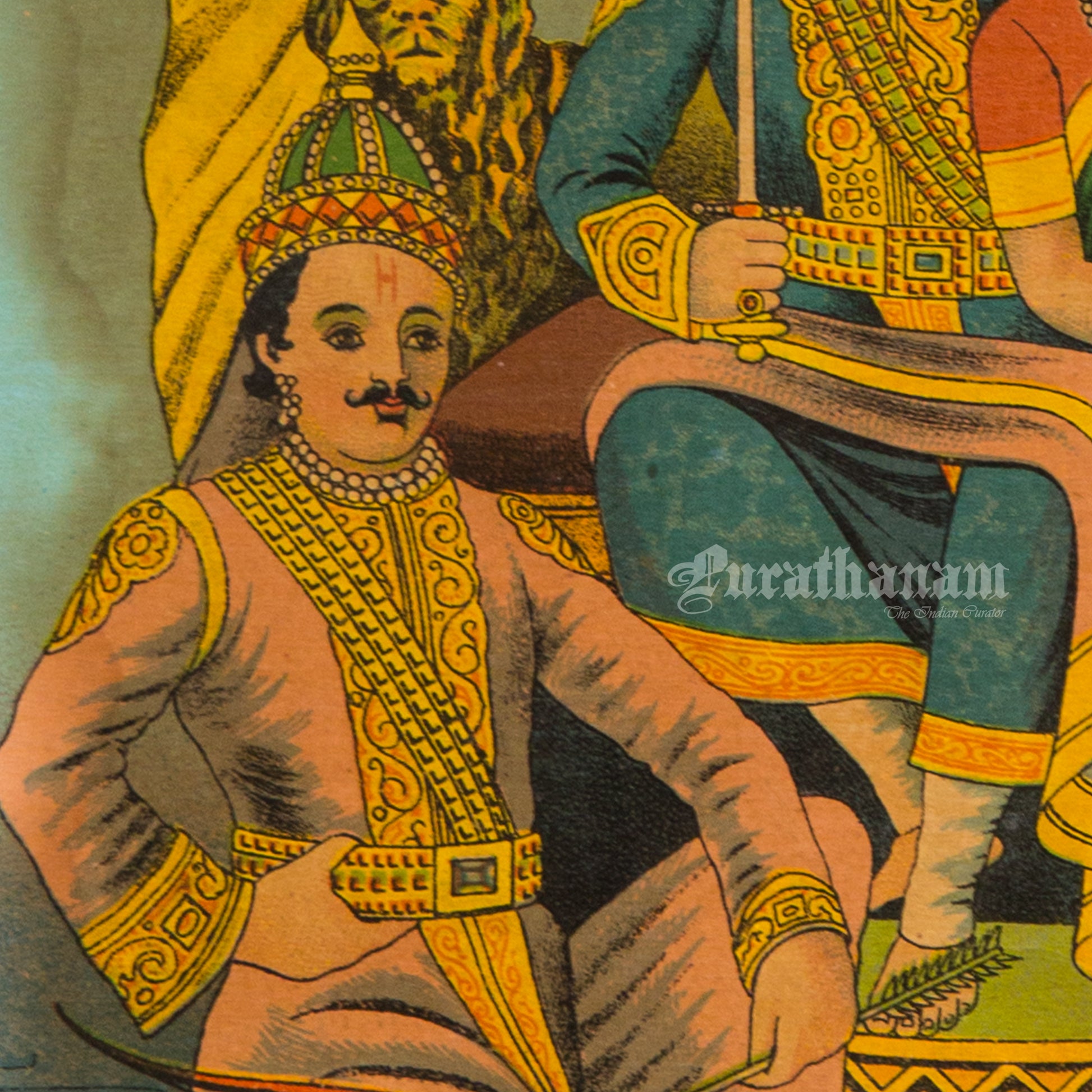 Introducing mini lithograph prints of size 10”x7” from 1920s - 1930s of Pandava Sabha by Ravi Varma an Indian who achieved recognition for his depiction of scenes from the epics of the Mahabharata and Ramayana.