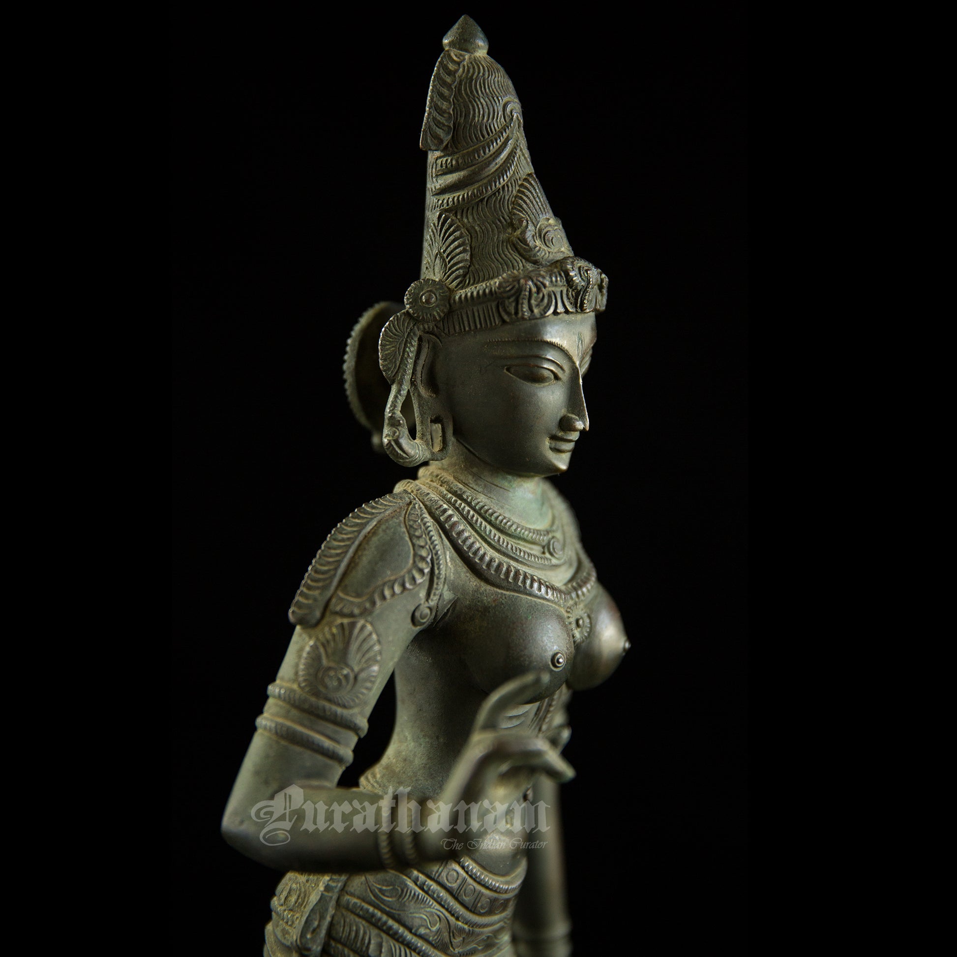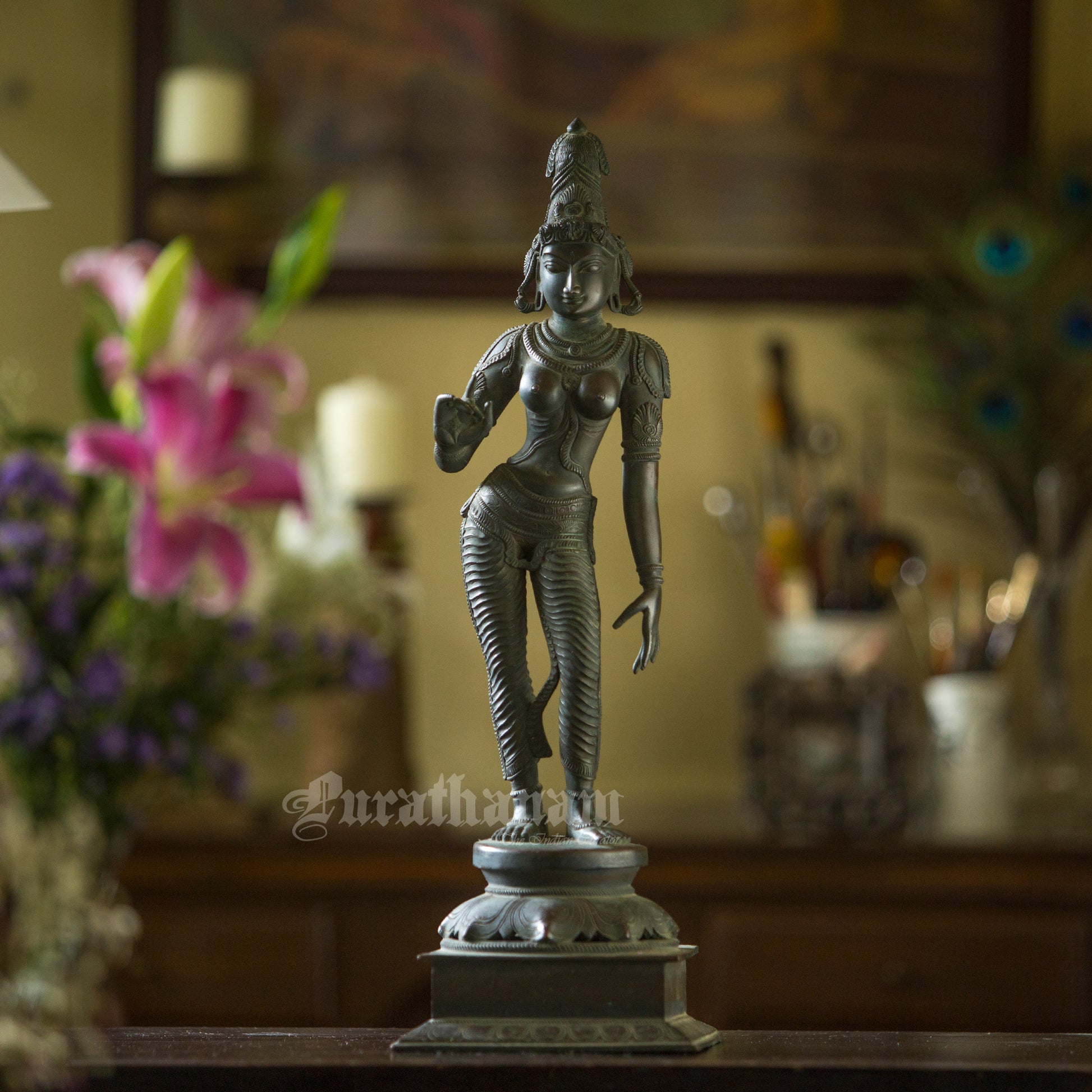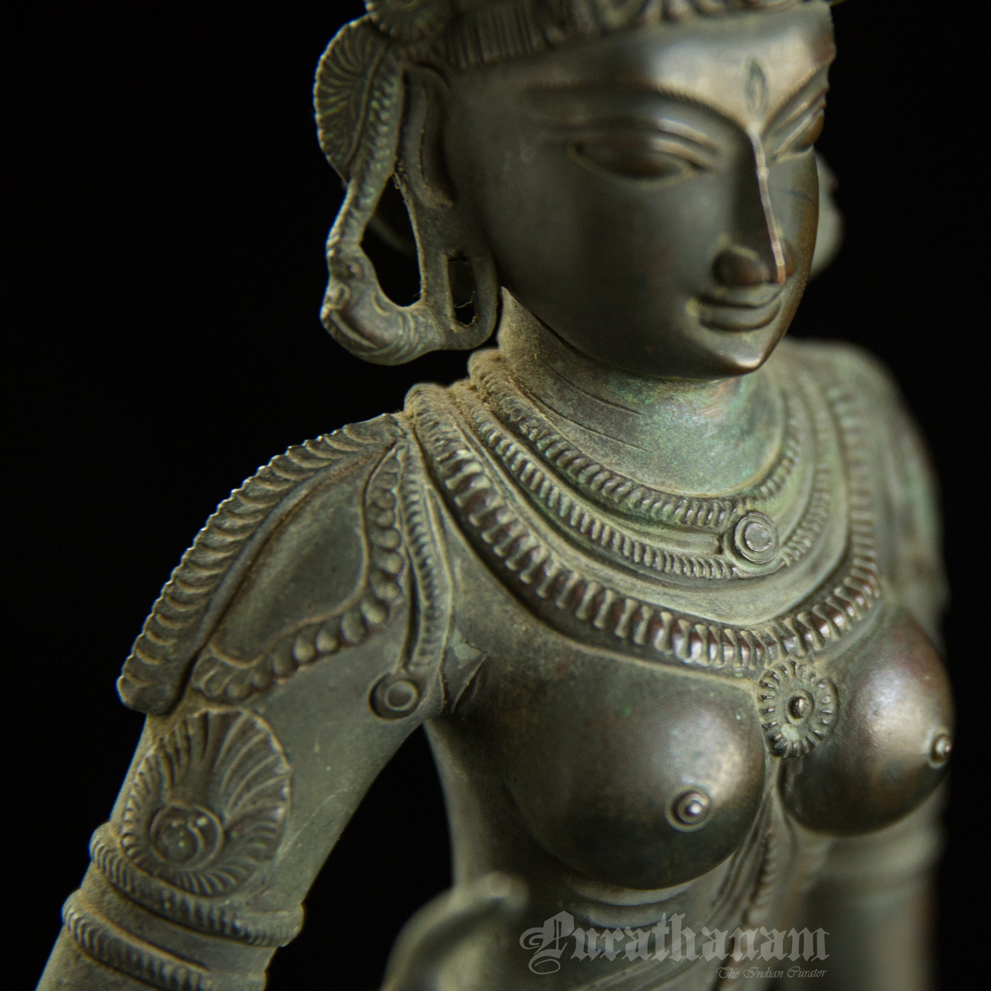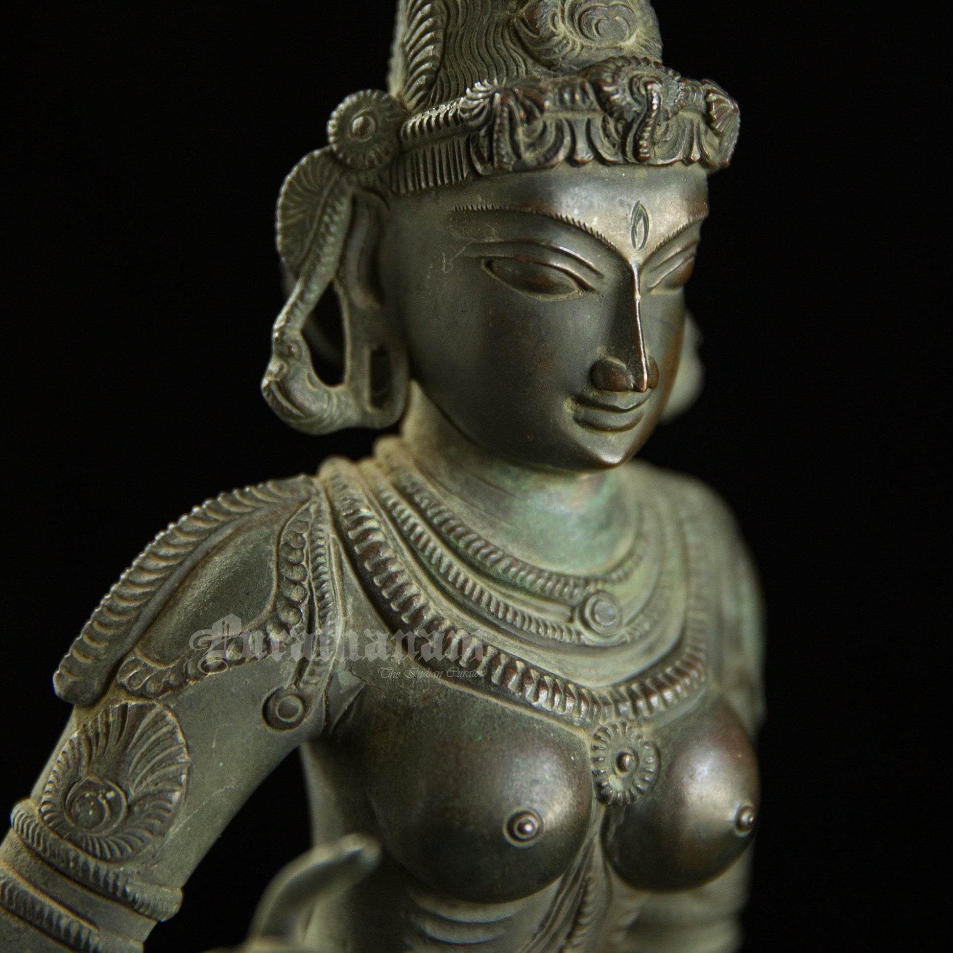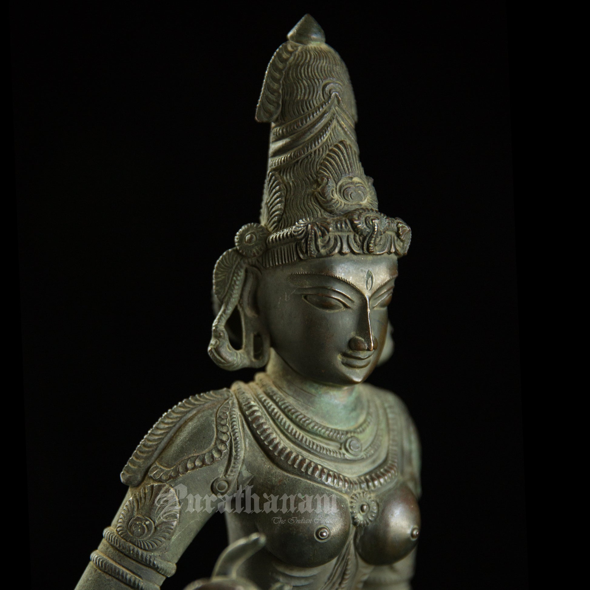 Here we have an elegant looking figurine of the Hindu deity Parvati. Made of bronze, this piece has immaculate details of ornaments and garments along with decorative designs on the pedestal she stands on. It is believed that Parvati is the daughter of Himavan the mountain and Mena. In Sanskrit a mountain is called a Parvat. Parvati is the symbol of Shakti or power in a woman and her strength. With a North Eastern style of structure, this Parvati has an elegance that can't be described in words. With each detail adding to the beauty, the figurine could be the zing that you need for your space.