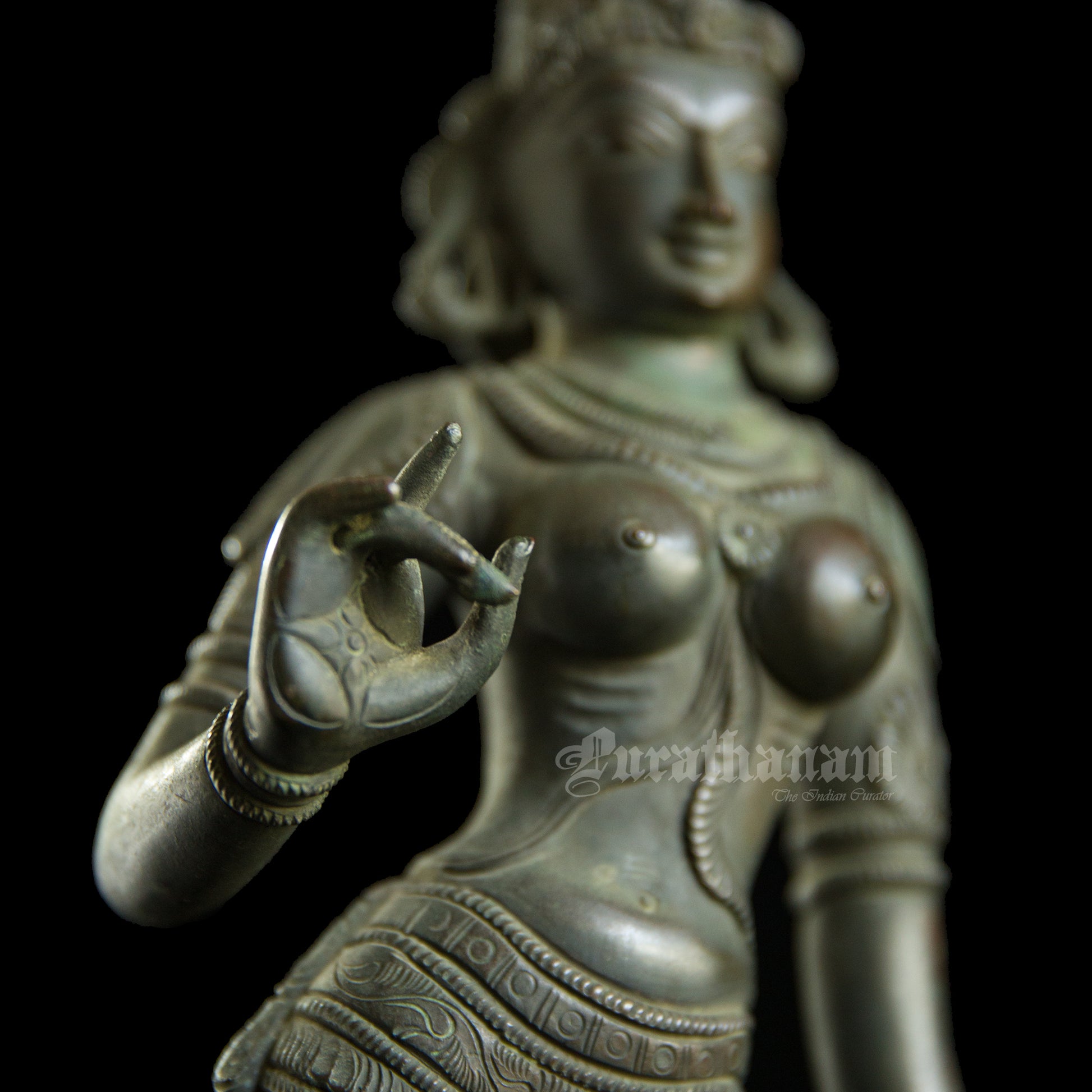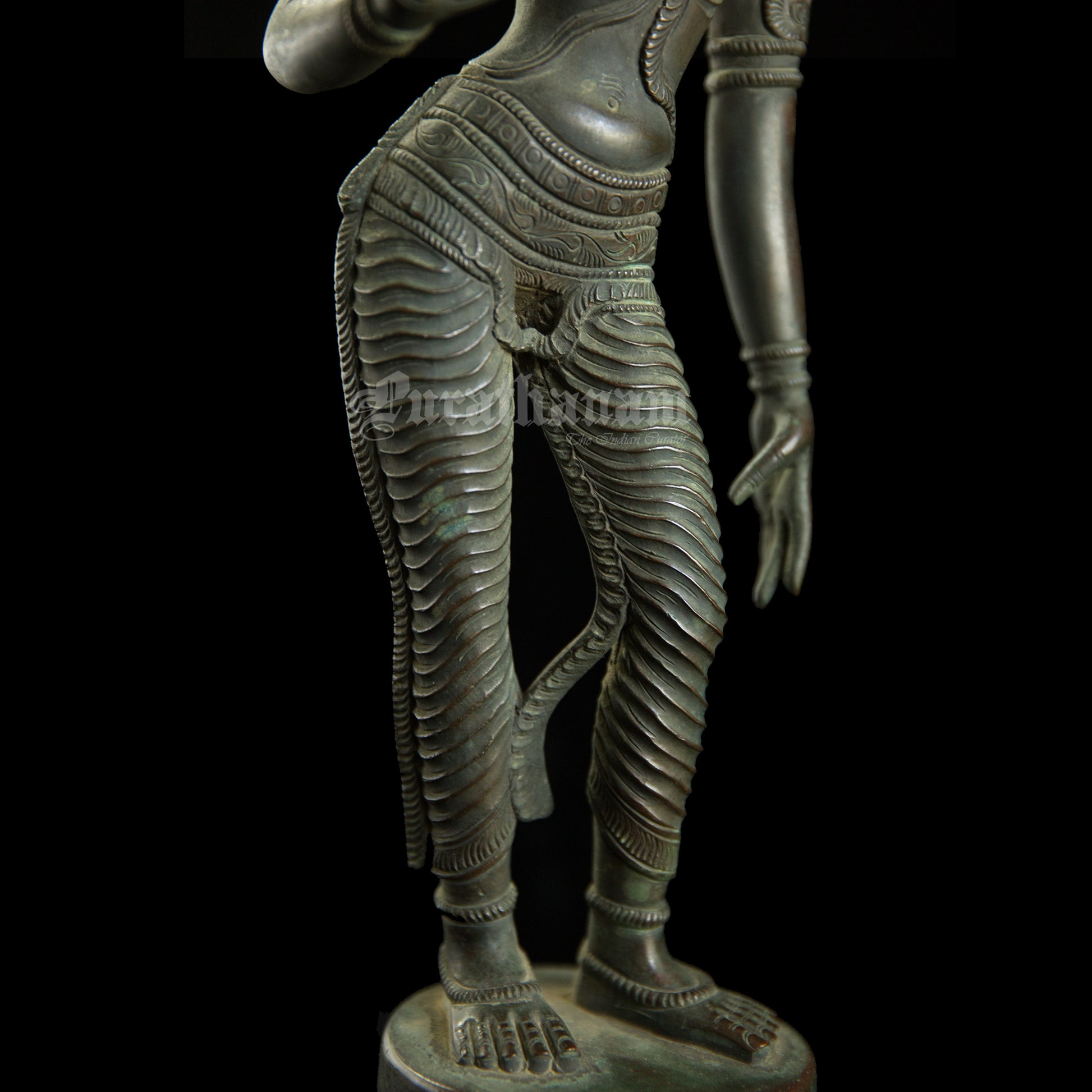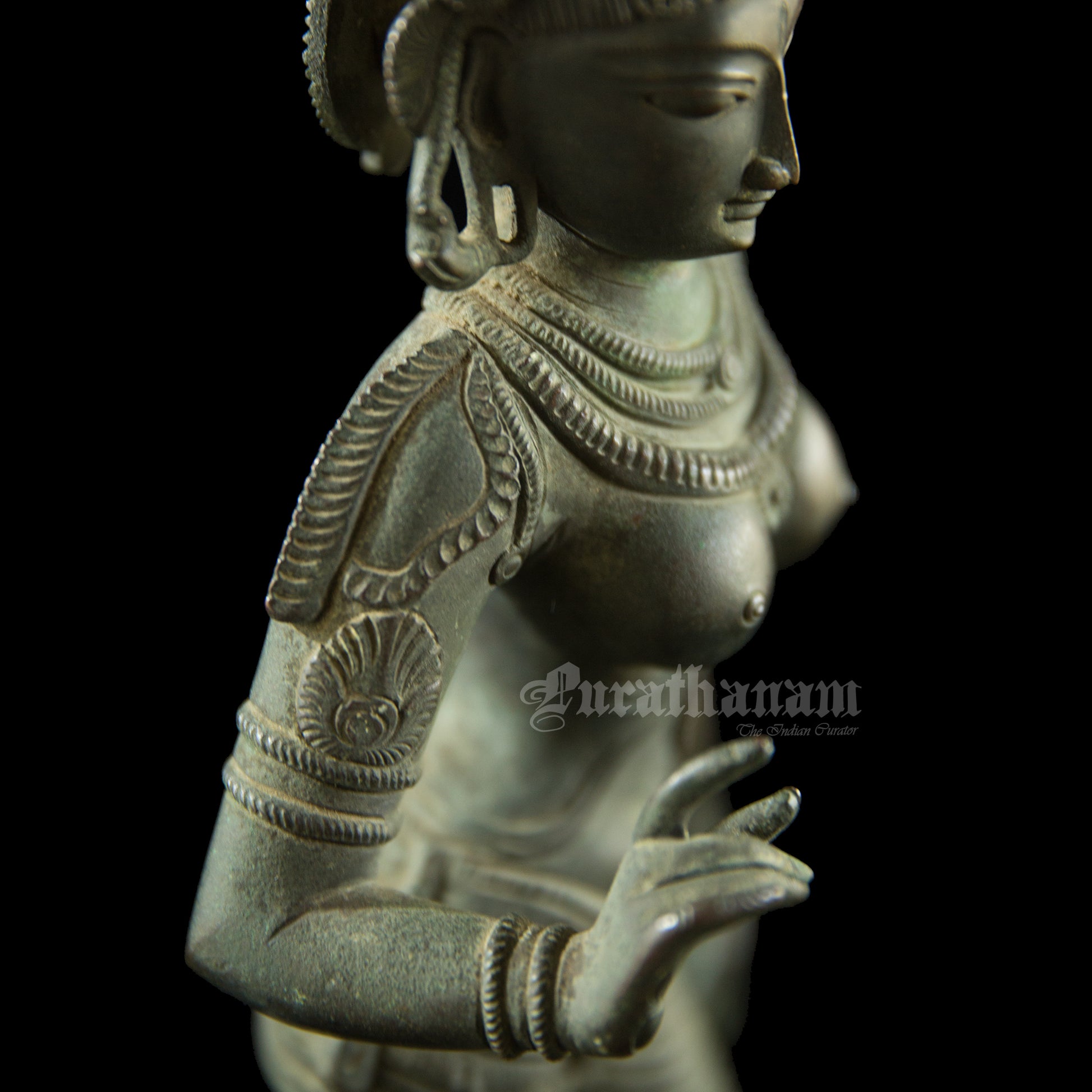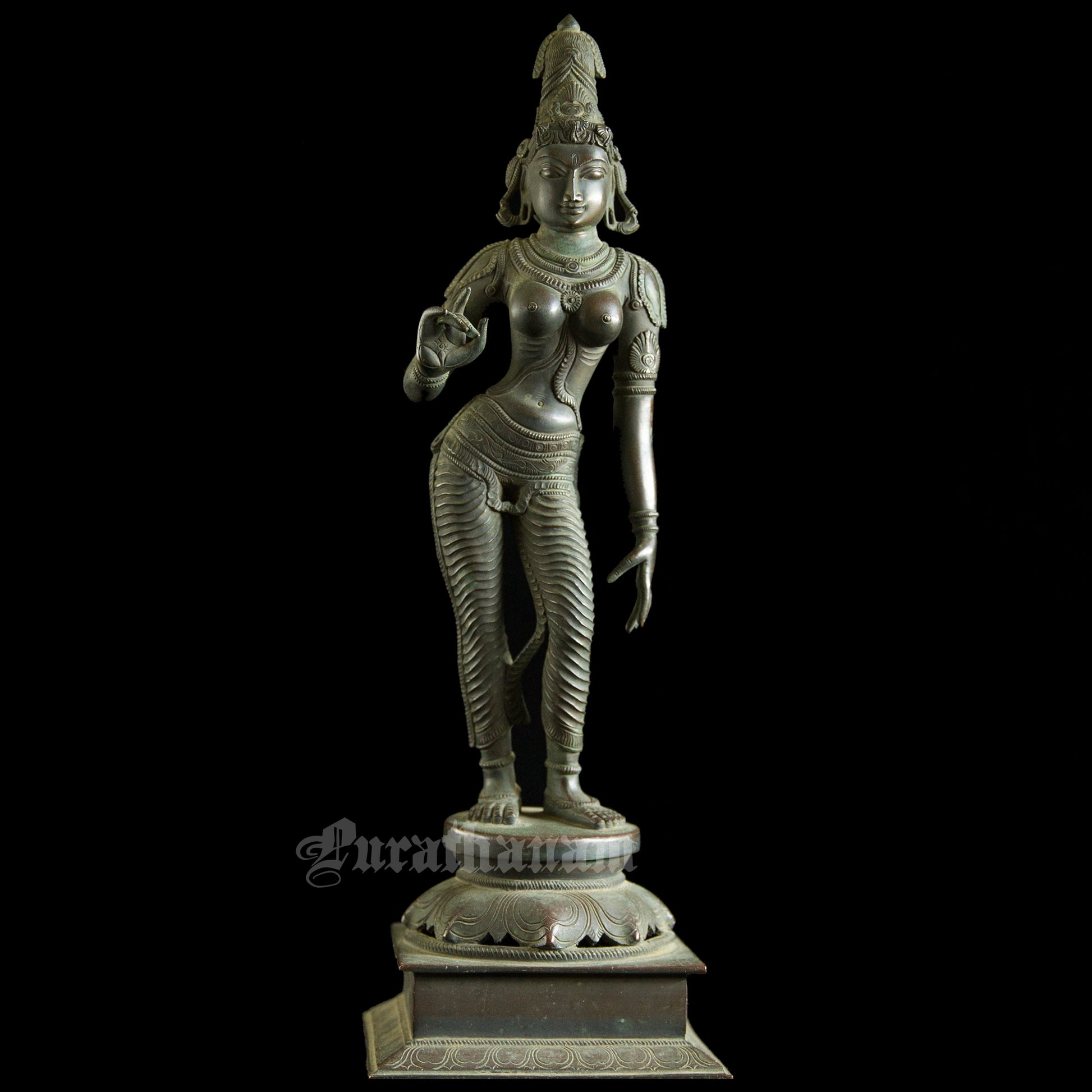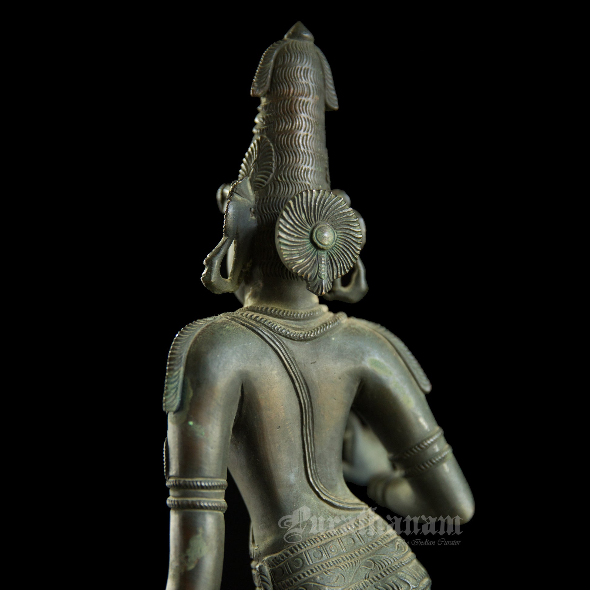 Here we have an elegant looking figurine of the Hindu deity Parvati. Made of bronze, this piece has immaculate details of ornaments and garments along with decorative designs on the pedestal she stands on. It is believed that Parvati is the daughter of Himavan the mountain and Mena. In Sanskrit a mountain is called a Parvat. Parvati is the symbol of Shakti or power in a woman and her strength. With a North Eastern style of structure, this Parvati has an elegance that can't be described in words. With each detail adding to the beauty, the figurine could be the zing that you need for your space.
